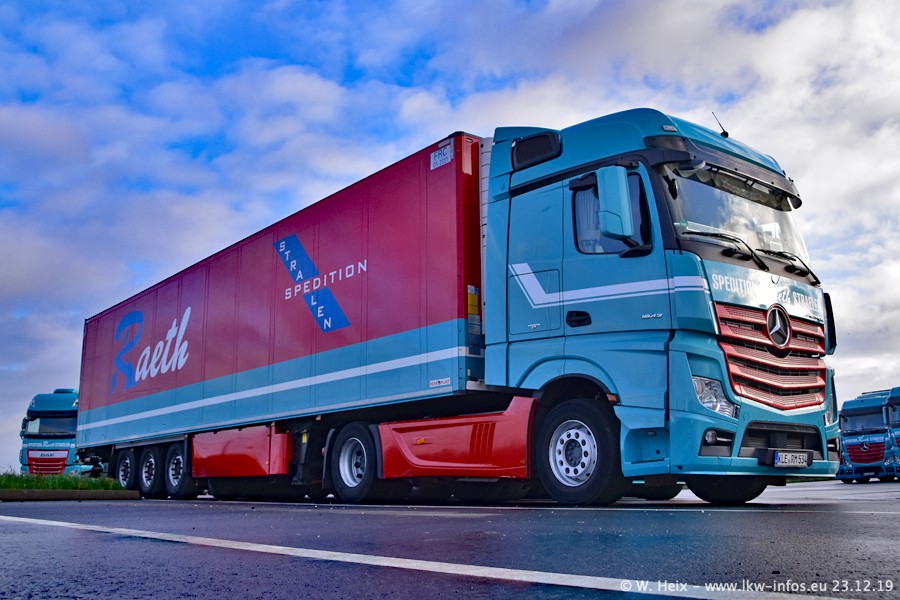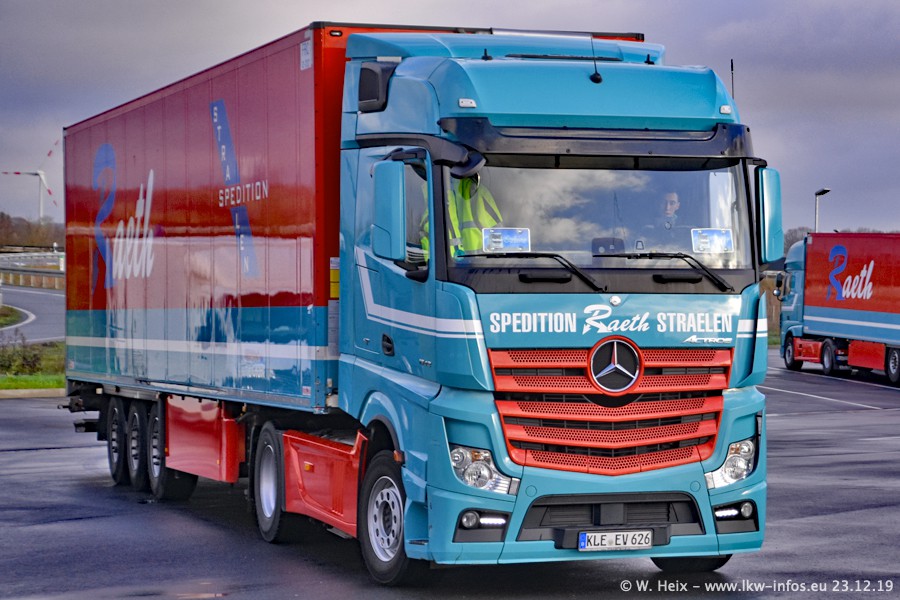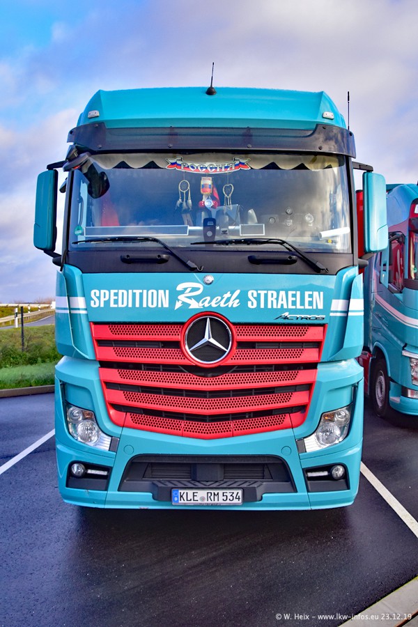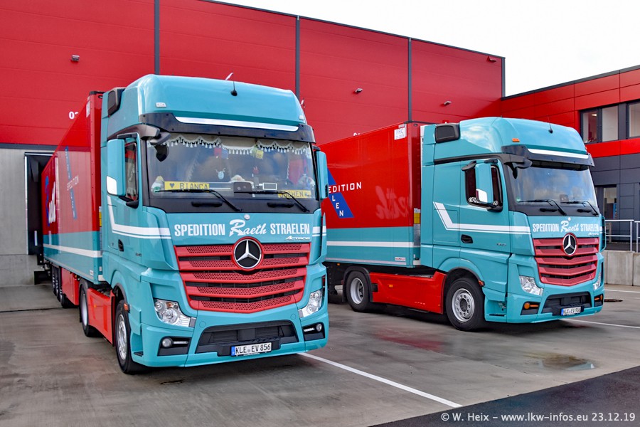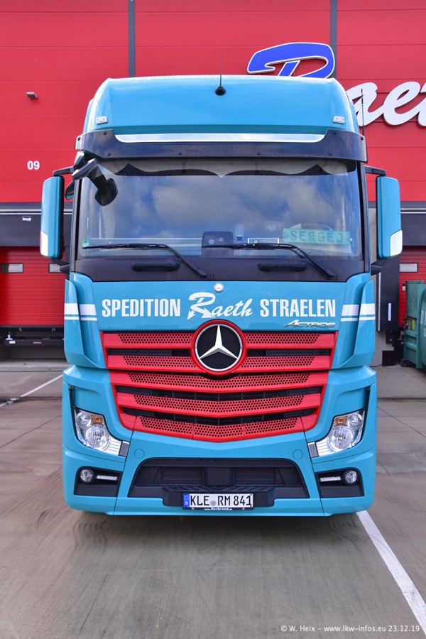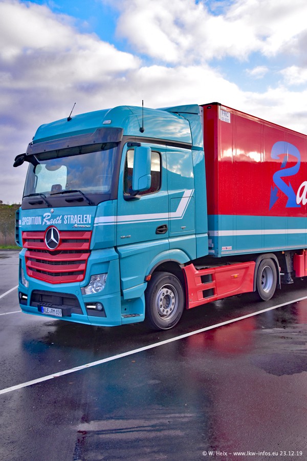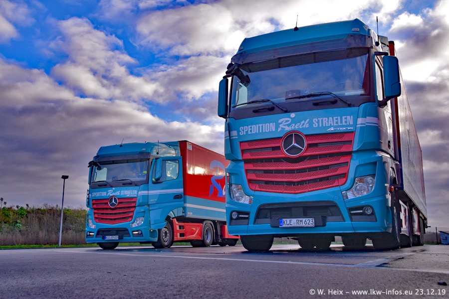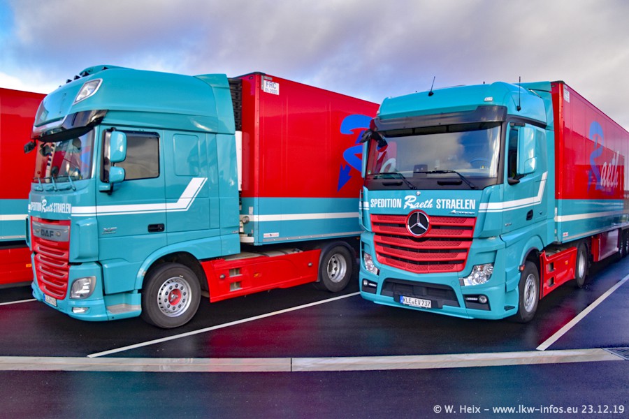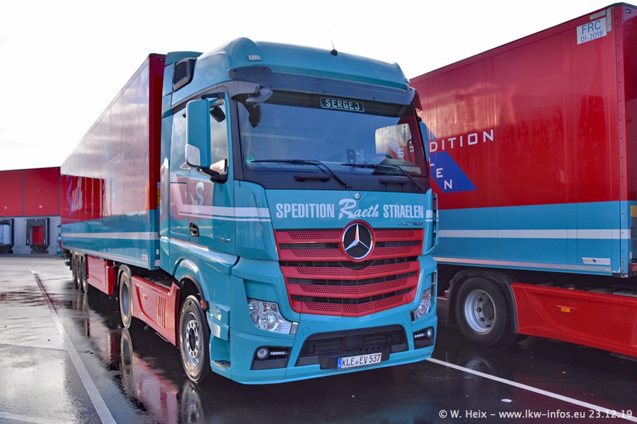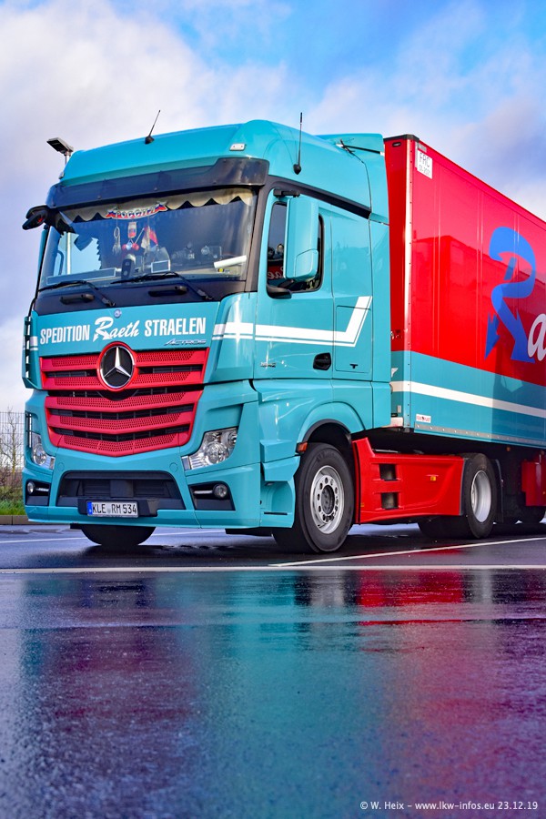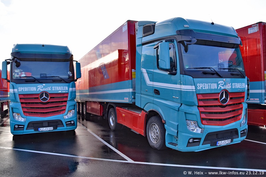 In diesem Jahr istr der Weihnachtsbesuch zugleich der erste Besuch auf dem neuen Firmengelände. Im Juli ist Raeth vom alten, viel zu klein gewordenen Gelände in Straelen, umgezogen nach Straelen-Herongen. Das neue Frimengelände liegt jetzt direkt an der A40 an der Abfahrt Herongen. Auf dem weitläufigen Gelände wurde ein kompletter Neubau mit Lagerhalle, Bürokomplex, Werkstatt und Waschstraße gebaut. Es gibt Platz für rund 40 LKW. Der Fuhrpark besteht aktuell aus rund 80 LKW. Viele Fahrzeuge stehen an den Wochenenden bei den Fahrern zuhause. Die "klassische Weihnachtsaufstellung " der LKW gibt es nicht. Aber gibt mir die Gelegenheit, viele Fahrzeuge einzeln zu fotografieren. Daher ist dieser Besuch mit 375 Fotos auch der größte bisher. Vielen Dank an Florian Brimmers für den freundlichen Empfang und für die Infos über die Firma.