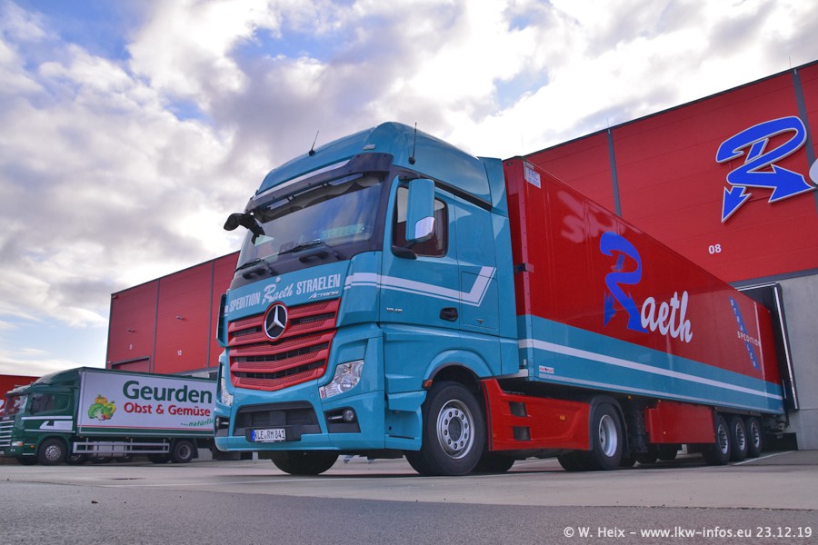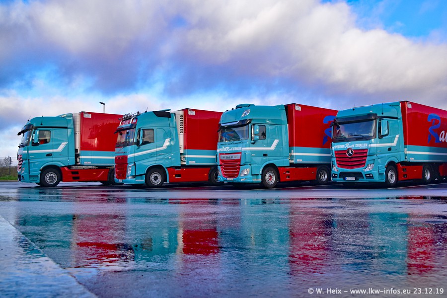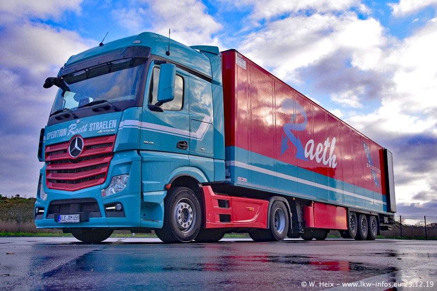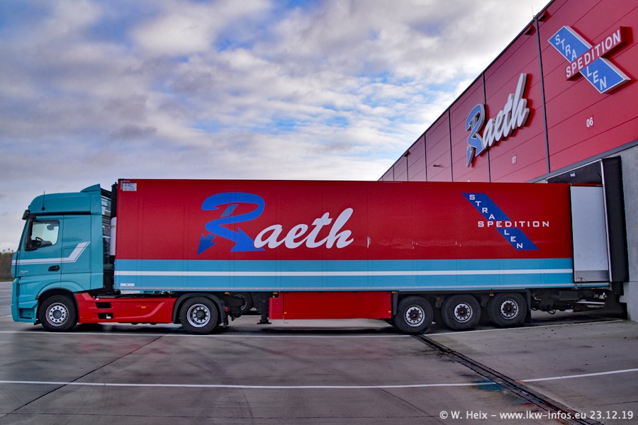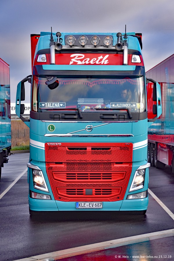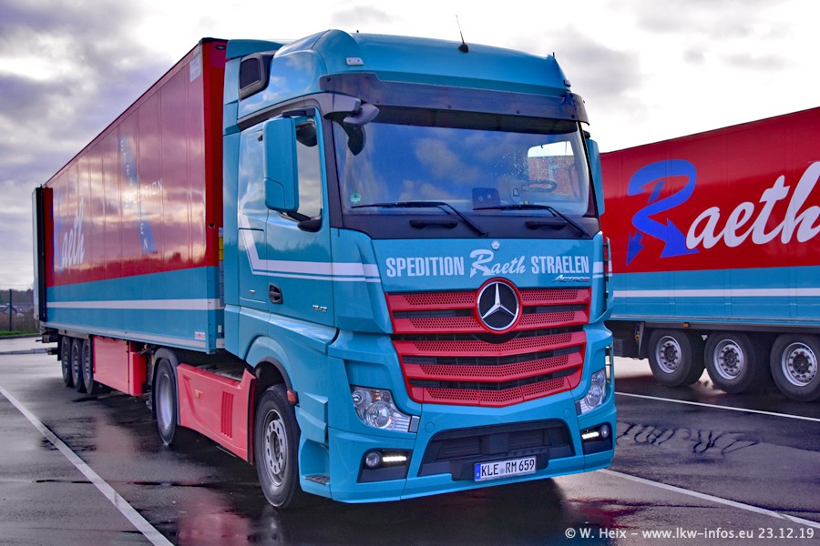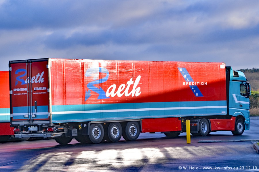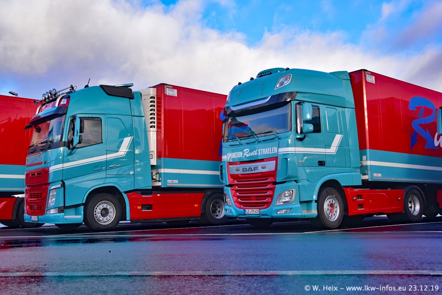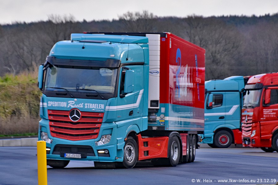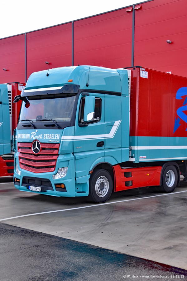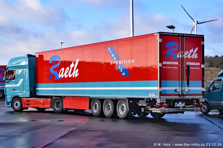 In diesem Jahr istr der Weihnachtsbesuch zugleich der erste Besuch auf dem neuen Firmengelände. Im Juli ist Raeth vom alten, viel zu klein gewordenen Gelände in Straelen, umgezogen nach Straelen-Herongen. Das neue Frimengelände liegt jetzt direkt an der A40 an der Abfahrt Herongen. Auf dem weitläufigen Gelände wurde ein kompletter Neubau mit Lagerhalle, Bürokomplex, Werkstatt und Waschstraße gebaut. Es gibt Platz für rund 40 LKW. Der Fuhrpark besteht aktuell aus rund 80 LKW. Viele Fahrzeuge stehen an den Wochenenden bei den Fahrern zuhause. Die "klassische Weihnachtsaufstellung " der LKW gibt es nicht. Aber gibt mir die Gelegenheit, viele Fahrzeuge einzeln zu fotografieren. Daher ist dieser Besuch mit 375 Fotos auch der größte bisher. Vielen Dank an Florian Brimmers für den freundlichen Empfang und für die Infos über die Firma.