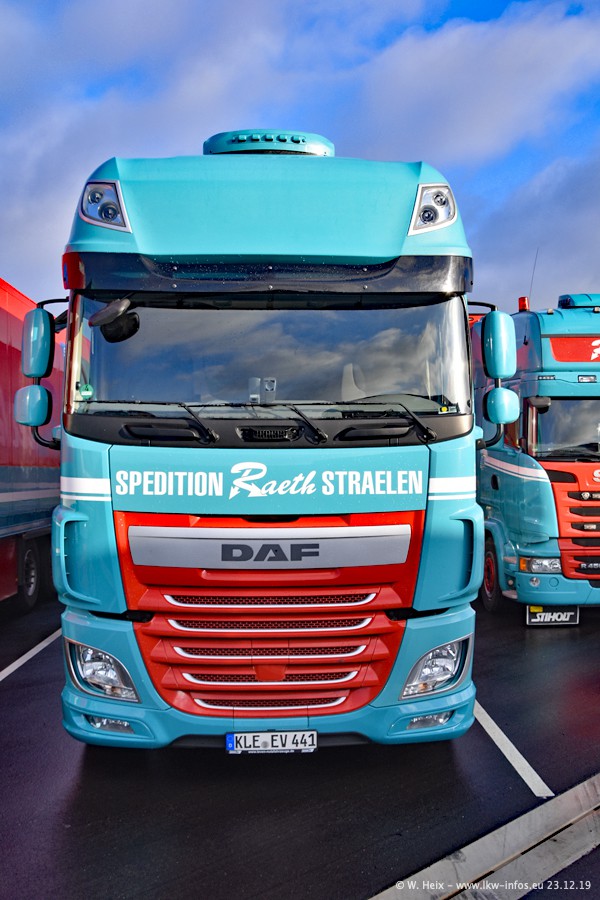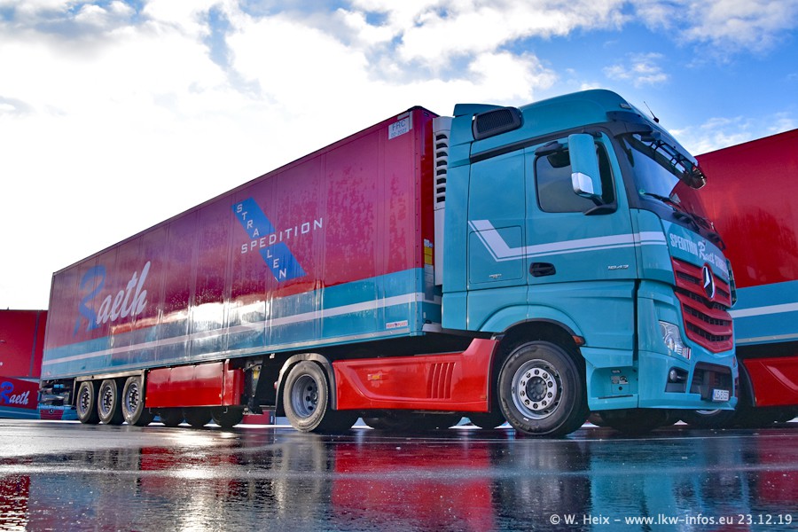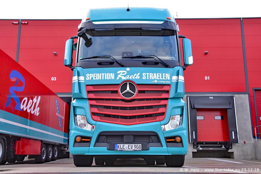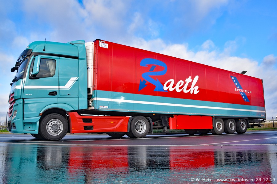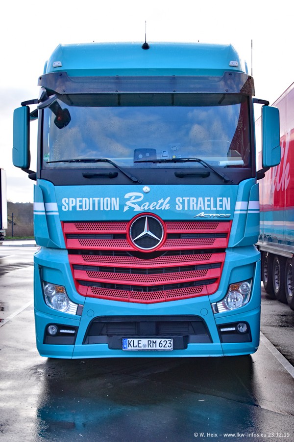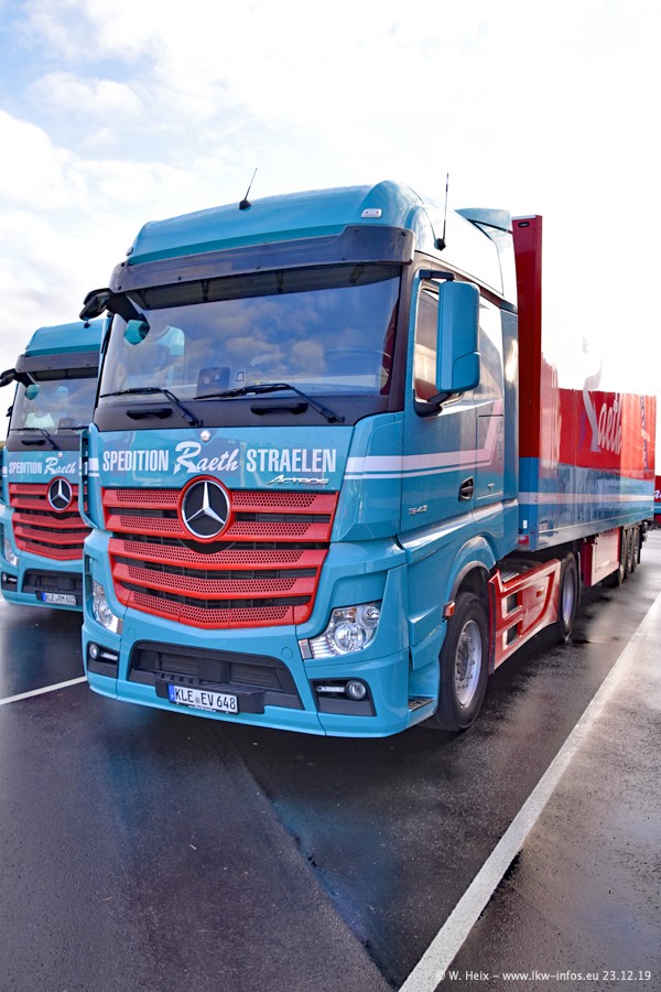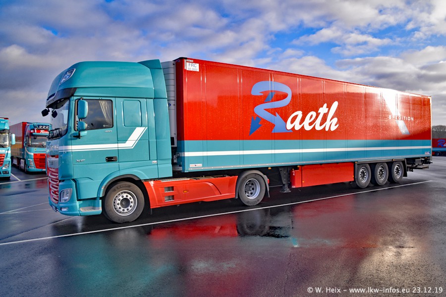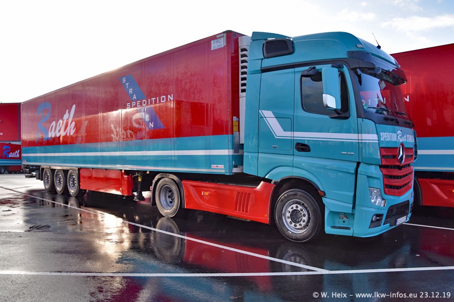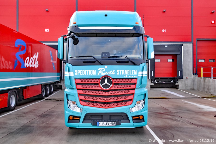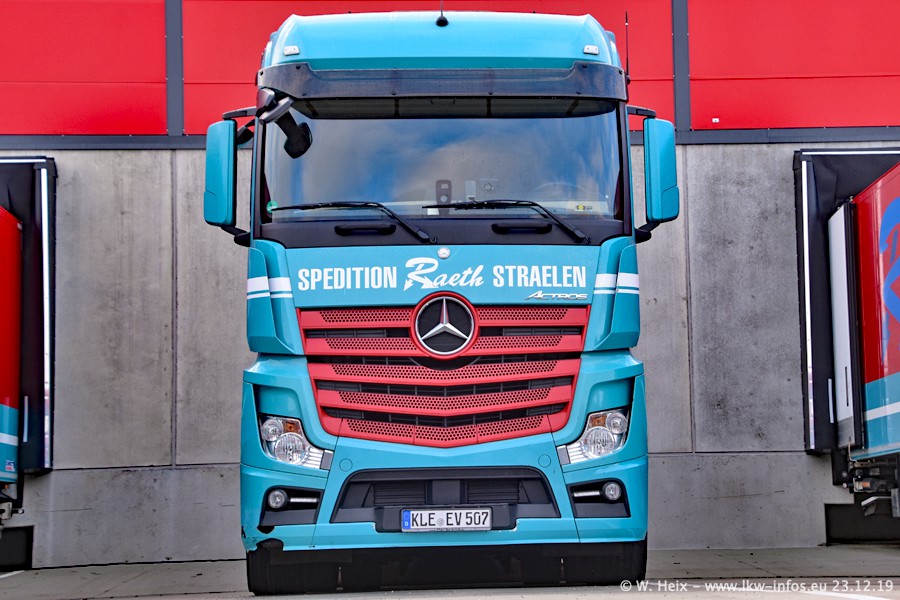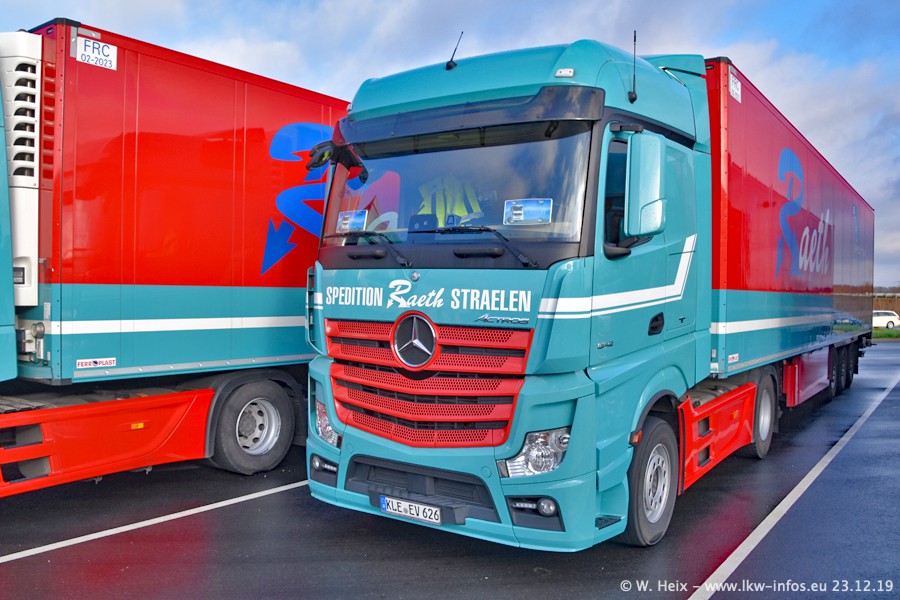 In diesem Jahr istr der Weihnachtsbesuch zugleich der erste Besuch auf dem neuen Firmengelände. Im Juli ist Raeth vom alten, viel zu klein gewordenen Gelände in Straelen, umgezogen nach Straelen-Herongen. Das neue Frimengelände liegt jetzt direkt an der A40 an der Abfahrt Herongen. Auf dem weitläufigen Gelände wurde ein kompletter Neubau mit Lagerhalle, Bürokomplex, Werkstatt und Waschstraße gebaut. Es gibt Platz für rund 40 LKW. Der Fuhrpark besteht aktuell aus rund 80 LKW. Viele Fahrzeuge stehen an den Wochenenden bei den Fahrern zuhause. Die "klassische Weihnachtsaufstellung " der LKW gibt es nicht. Aber gibt mir die Gelegenheit, viele Fahrzeuge einzeln zu fotografieren. Daher ist dieser Besuch mit 375 Fotos auch der größte bisher. Vielen Dank an Florian Brimmers für den freundlichen Empfang und für die Infos über die Firma.