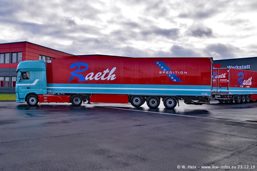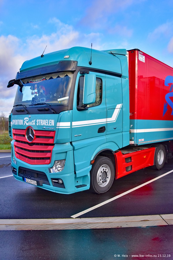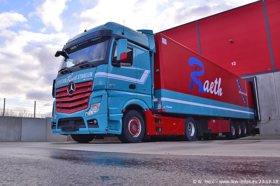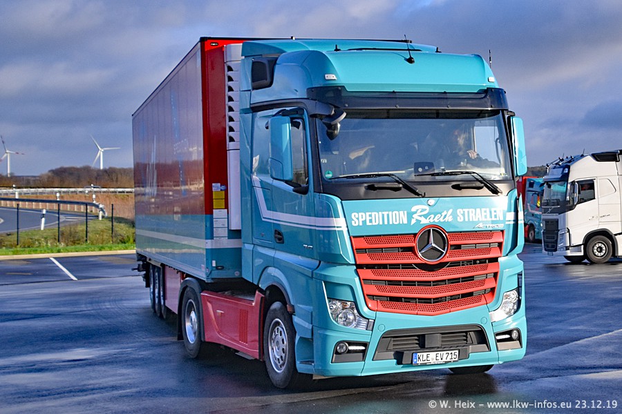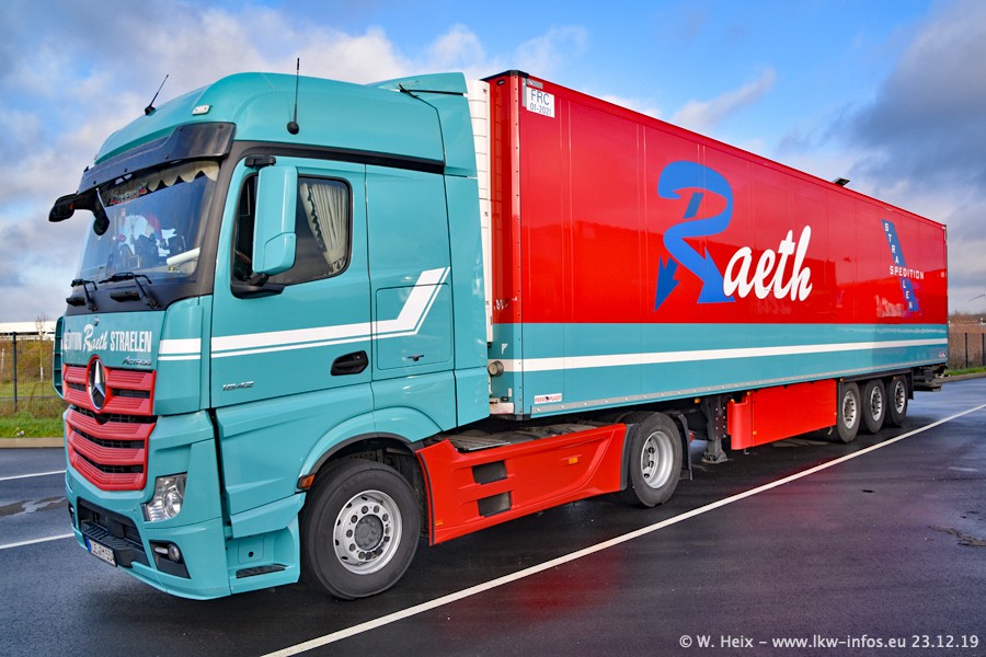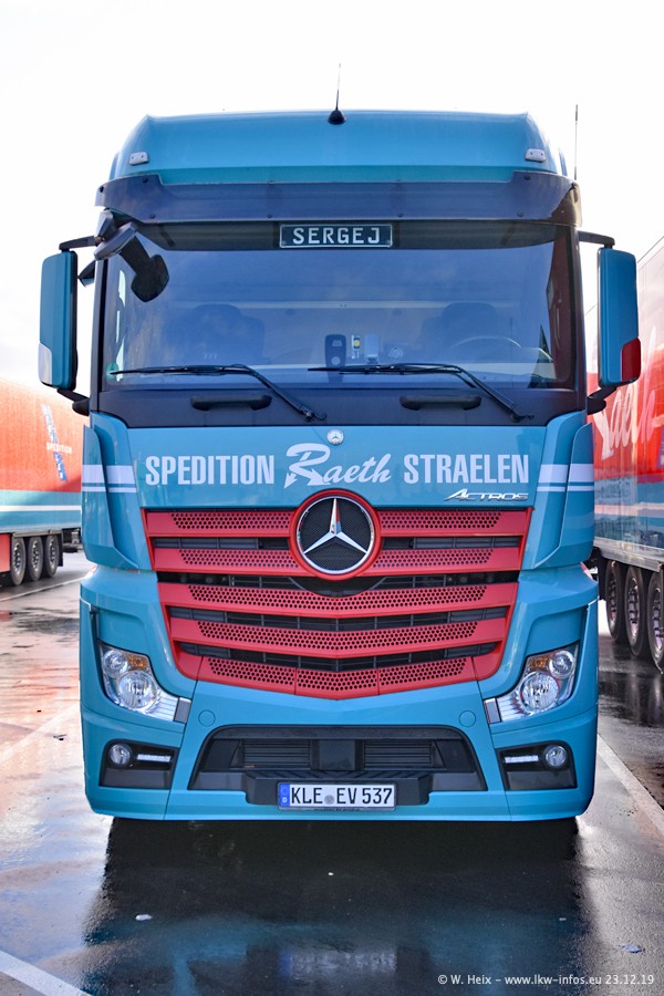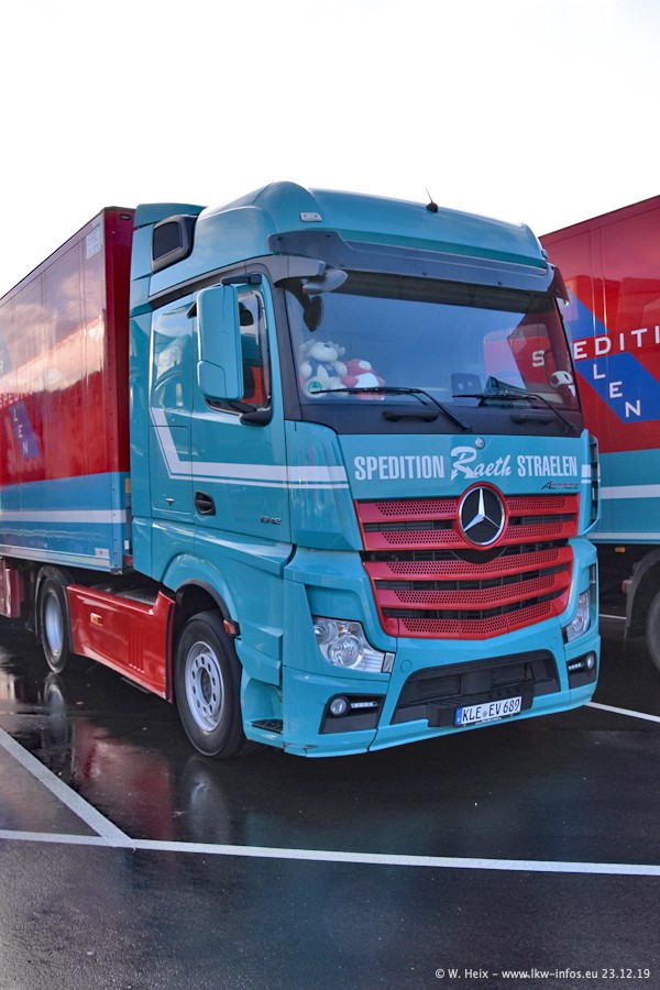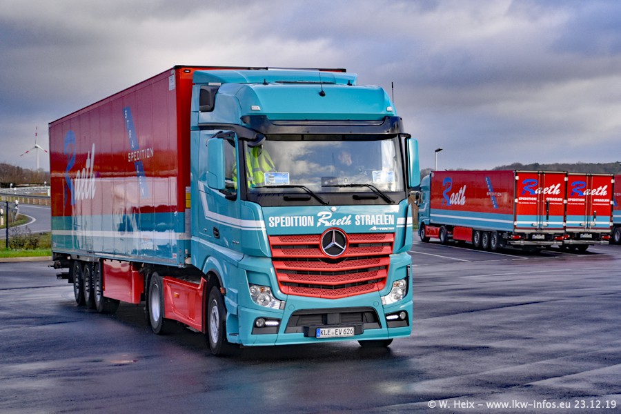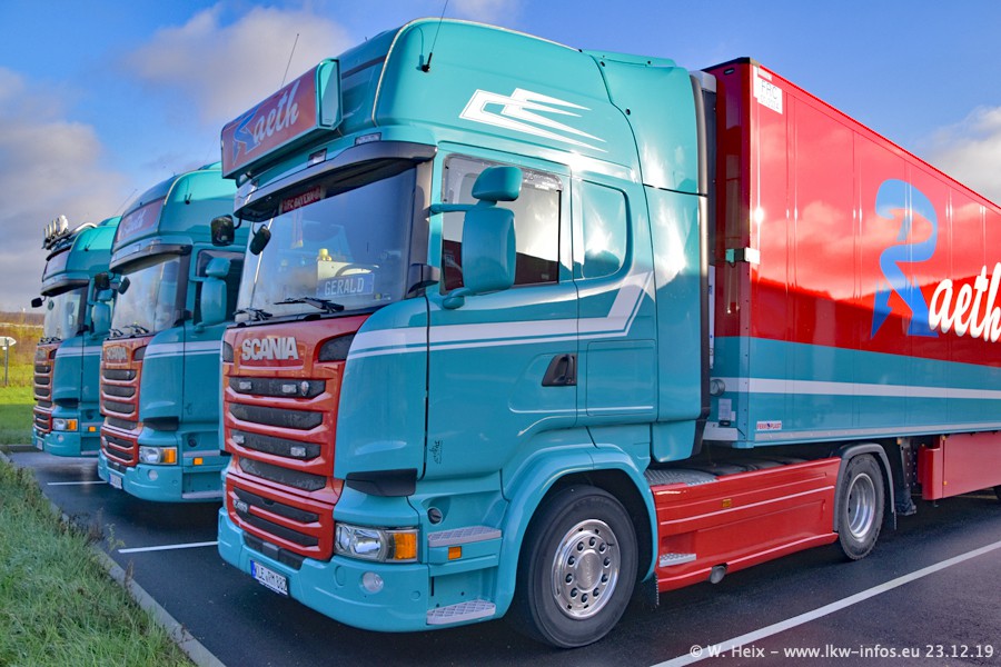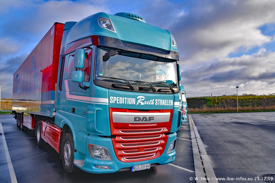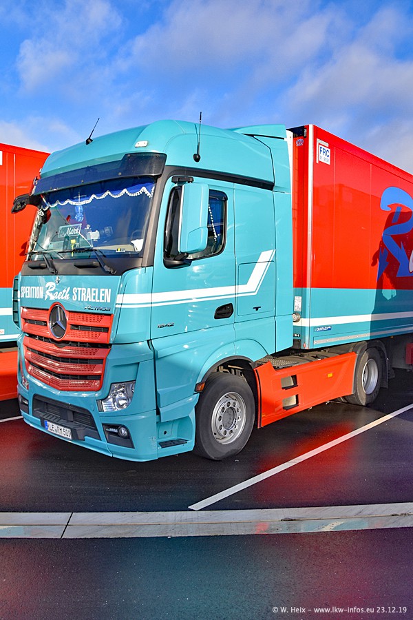 In diesem Jahr istr der Weihnachtsbesuch zugleich der erste Besuch auf dem neuen Firmengelände. Im Juli ist Raeth vom alten, viel zu klein gewordenen Gelände in Straelen, umgezogen nach Straelen-Herongen. Das neue Frimengelände liegt jetzt direkt an der A40 an der Abfahrt Herongen. Auf dem weitläufigen Gelände wurde ein kompletter Neubau mit Lagerhalle, Bürokomplex, Werkstatt und Waschstraße gebaut. Es gibt Platz für rund 40 LKW. Der Fuhrpark besteht aktuell aus rund 80 LKW. Viele Fahrzeuge stehen an den Wochenenden bei den Fahrern zuhause. Die "klassische Weihnachtsaufstellung " der LKW gibt es nicht. Aber gibt mir die Gelegenheit, viele Fahrzeuge einzeln zu fotografieren. Daher ist dieser Besuch mit 375 Fotos auch der größte bisher. Vielen Dank an Florian Brimmers für den freundlichen Empfang und für die Infos über die Firma.