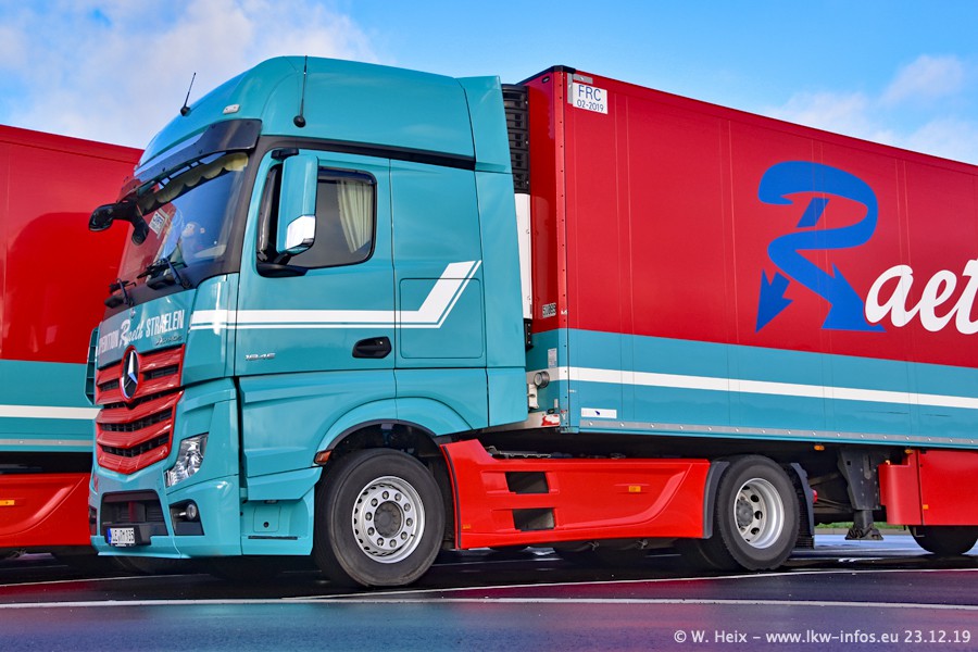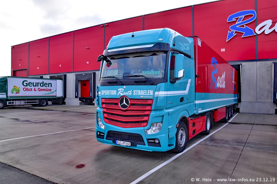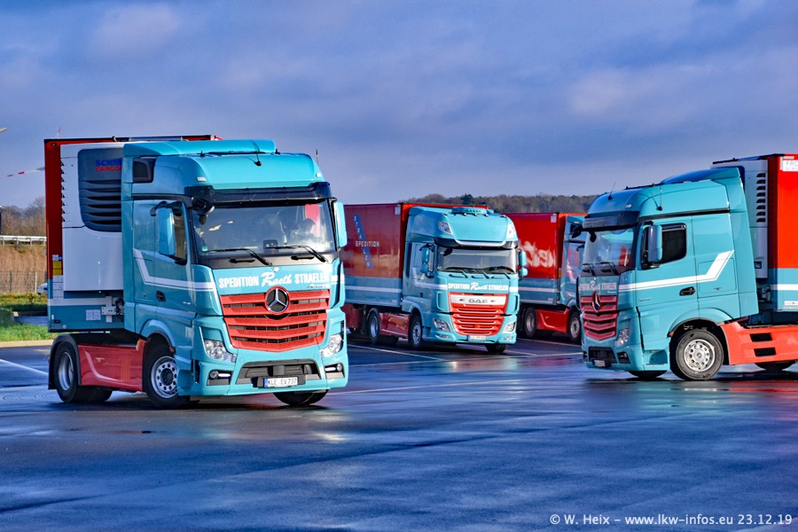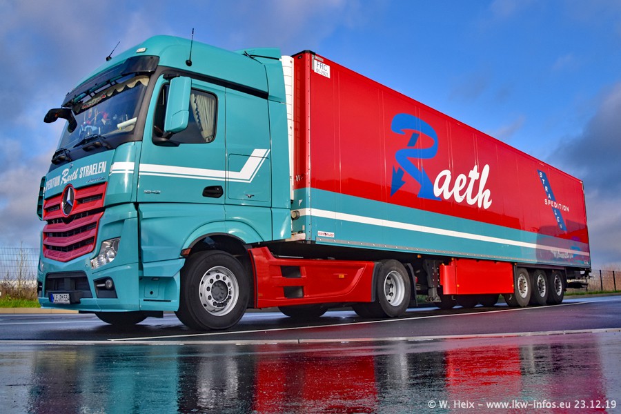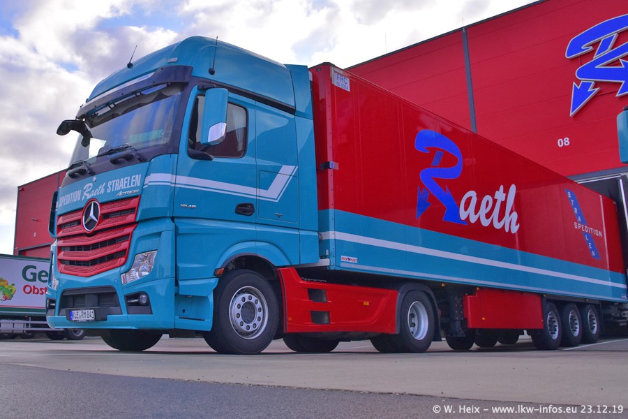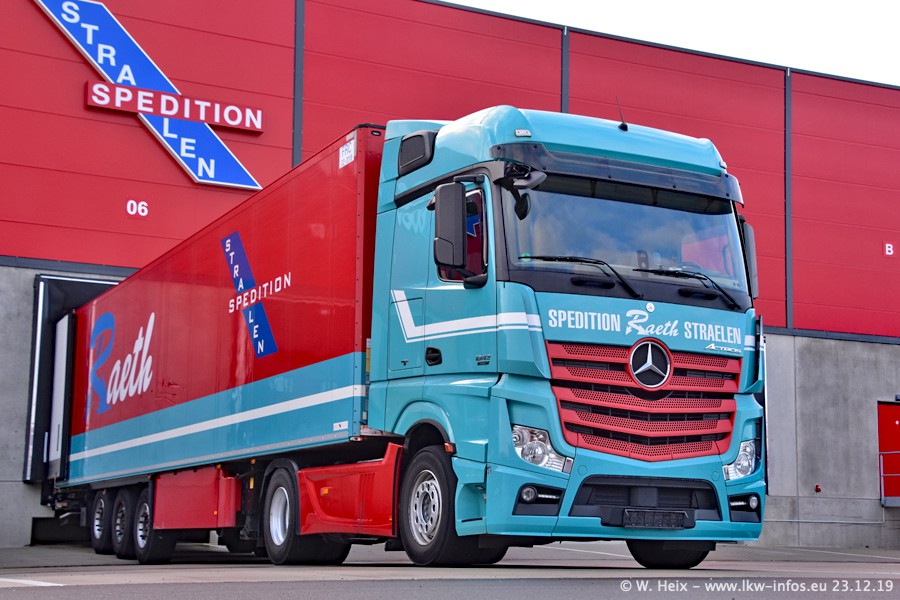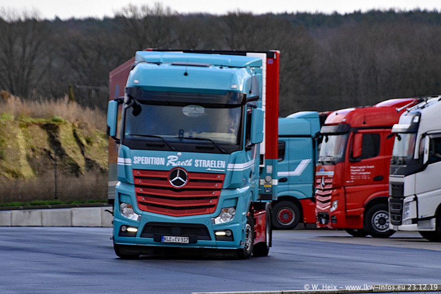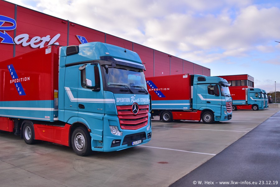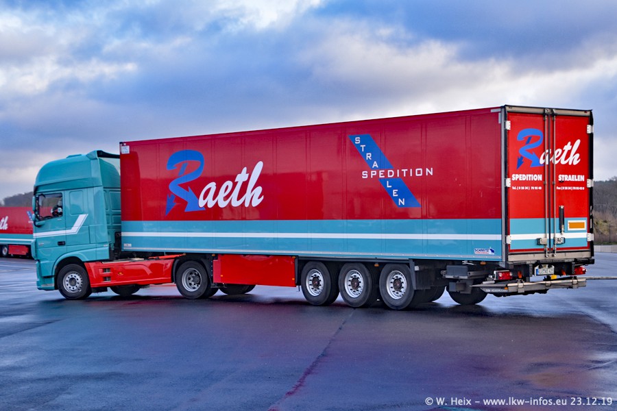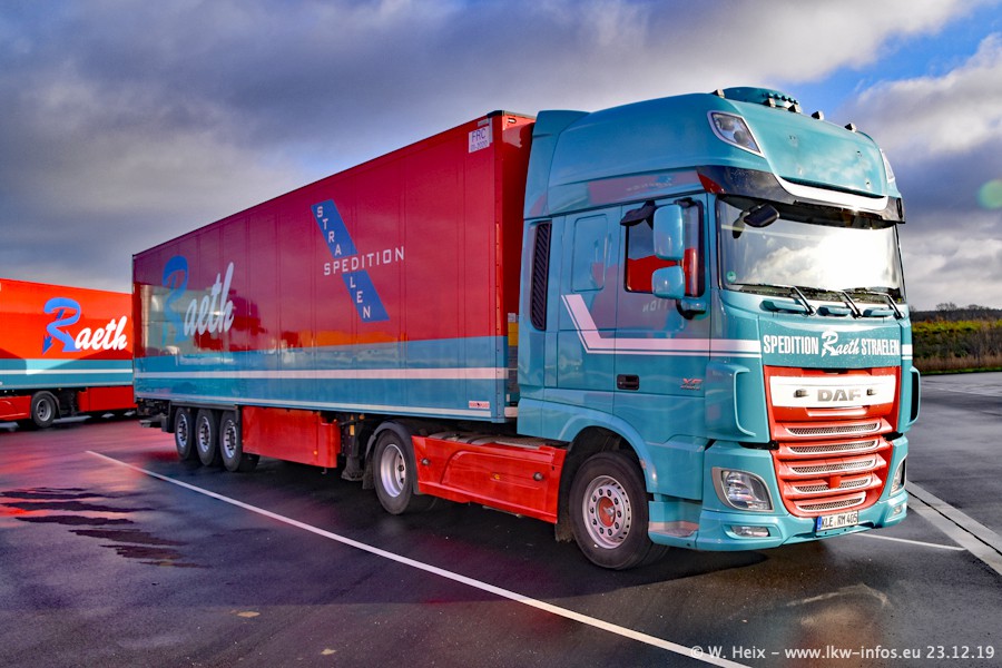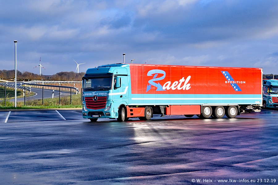 In diesem Jahr istr der Weihnachtsbesuch zugleich der erste Besuch auf dem neuen Firmengelände. Im Juli ist Raeth vom alten, viel zu klein gewordenen Gelände in Straelen, umgezogen nach Straelen-Herongen. Das neue Frimengelände liegt jetzt direkt an der A40 an der Abfahrt Herongen. Auf dem weitläufigen Gelände wurde ein kompletter Neubau mit Lagerhalle, Bürokomplex, Werkstatt und Waschstraße gebaut. Es gibt Platz für rund 40 LKW. Der Fuhrpark besteht aktuell aus rund 80 LKW. Viele Fahrzeuge stehen an den Wochenenden bei den Fahrern zuhause. Die "klassische Weihnachtsaufstellung " der LKW gibt es nicht. Aber gibt mir die Gelegenheit, viele Fahrzeuge einzeln zu fotografieren. Daher ist dieser Besuch mit 375 Fotos auch der größte bisher. Vielen Dank an Florian Brimmers für den freundlichen Empfang und für die Infos über die Firma.