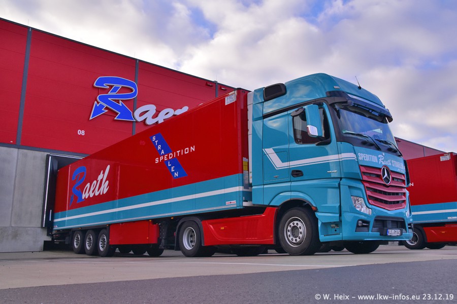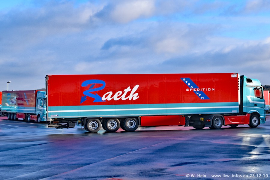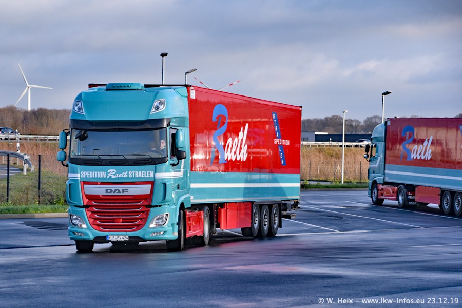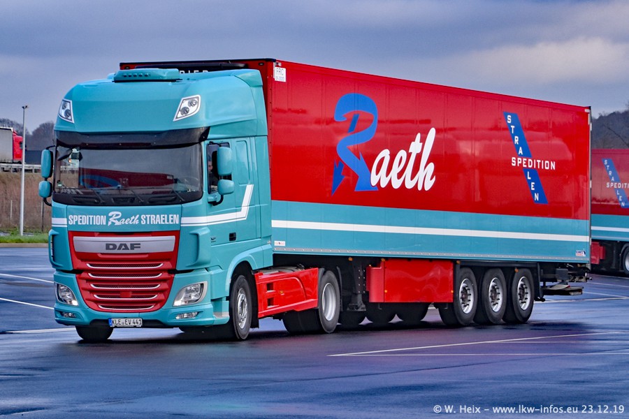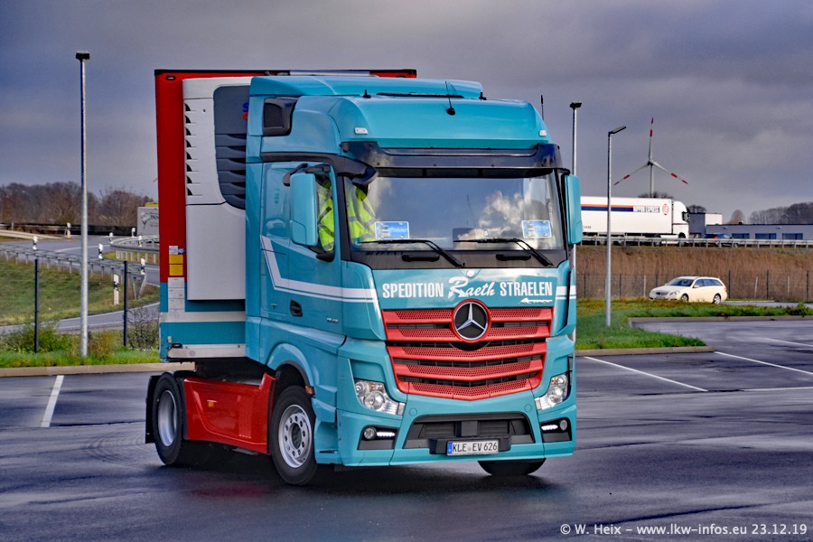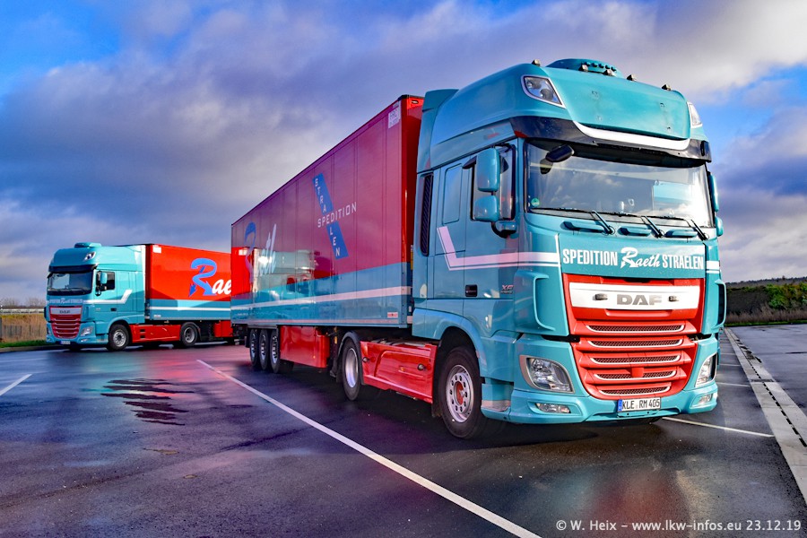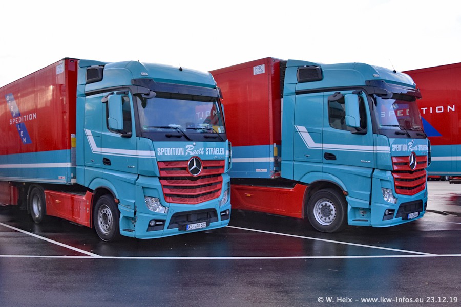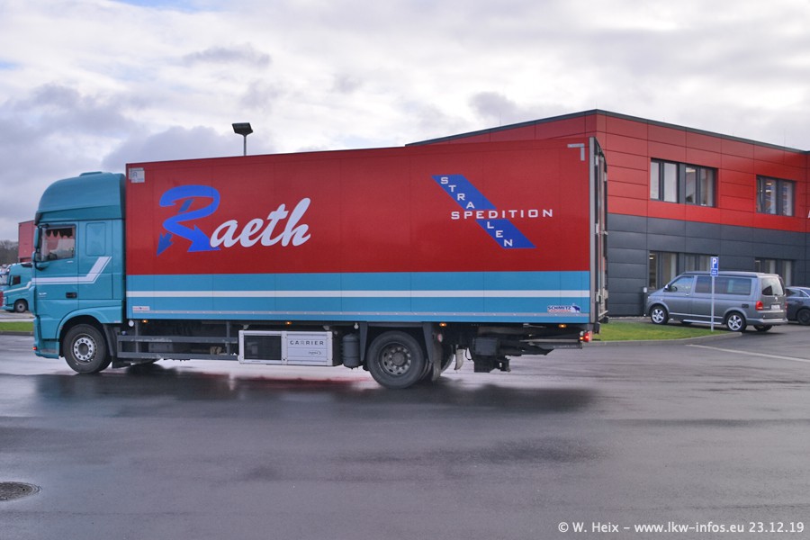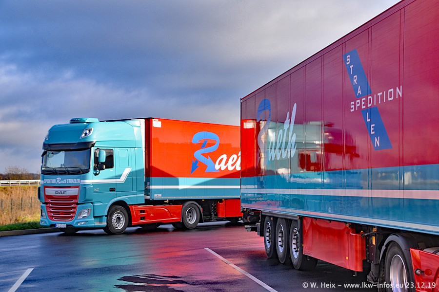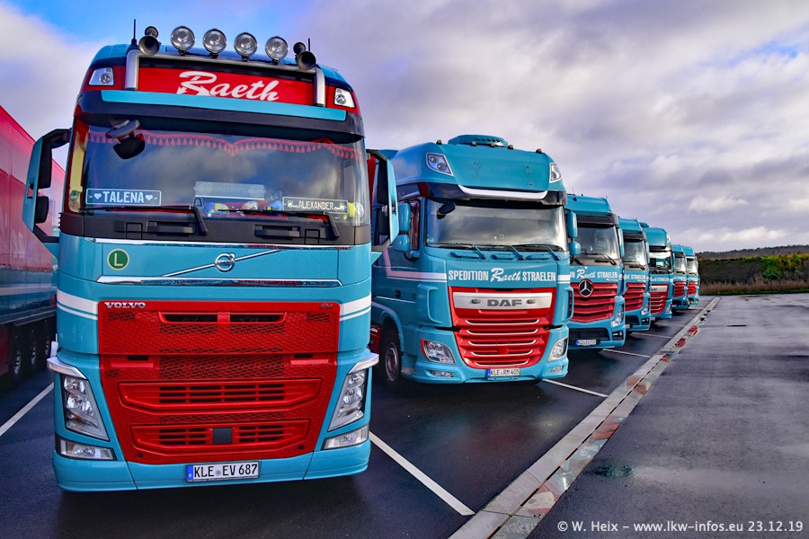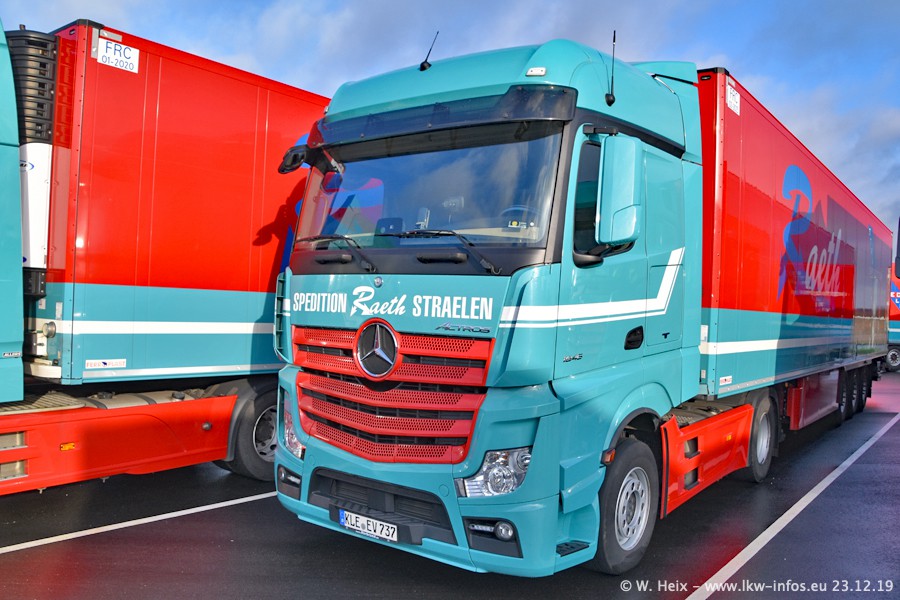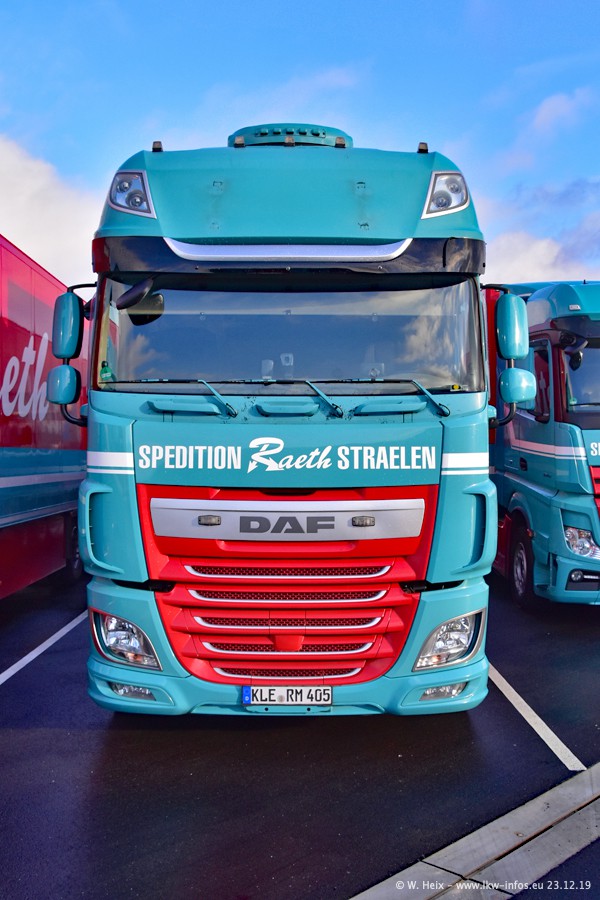 In diesem Jahr istr der Weihnachtsbesuch zugleich der erste Besuch auf dem neuen Firmengelände. Im Juli ist Raeth vom alten, viel zu klein gewordenen Gelände in Straelen, umgezogen nach Straelen-Herongen. Das neue Frimengelände liegt jetzt direkt an der A40 an der Abfahrt Herongen. Auf dem weitläufigen Gelände wurde ein kompletter Neubau mit Lagerhalle, Bürokomplex, Werkstatt und Waschstraße gebaut. Es gibt Platz für rund 40 LKW. Der Fuhrpark besteht aktuell aus rund 80 LKW. Viele Fahrzeuge stehen an den Wochenenden bei den Fahrern zuhause. Die "klassische Weihnachtsaufstellung " der LKW gibt es nicht. Aber gibt mir die Gelegenheit, viele Fahrzeuge einzeln zu fotografieren. Daher ist dieser Besuch mit 375 Fotos auch der größte bisher. Vielen Dank an Florian Brimmers für den freundlichen Empfang und für die Infos über die Firma.
