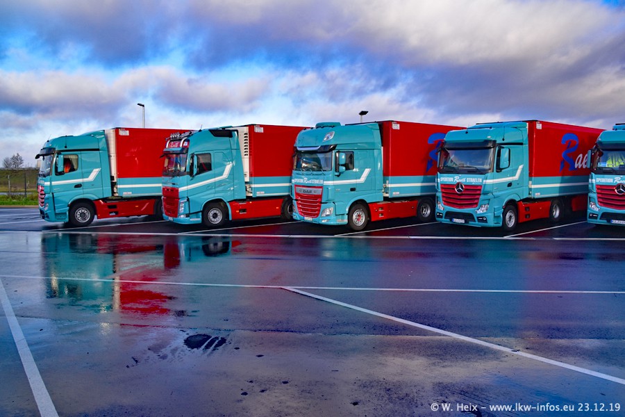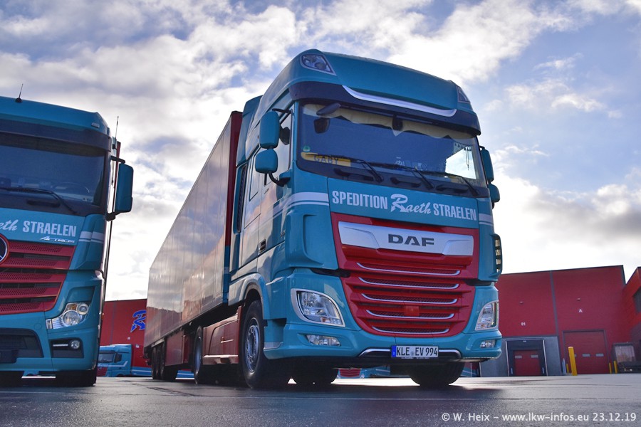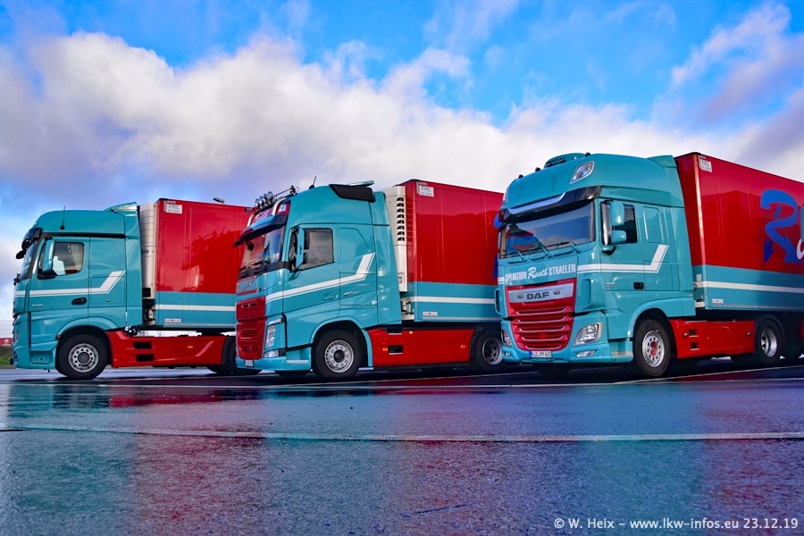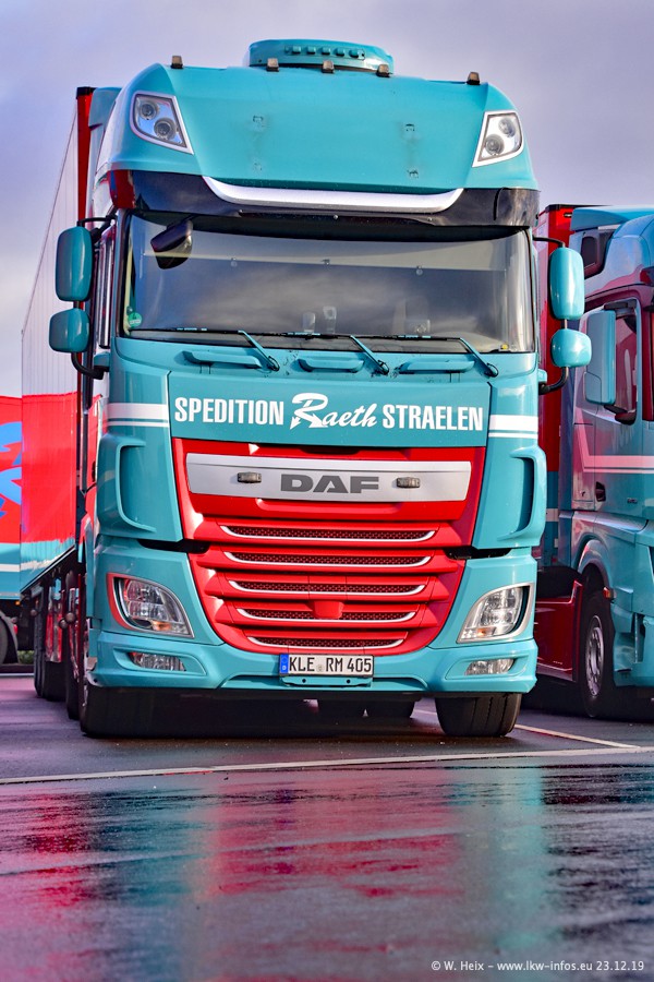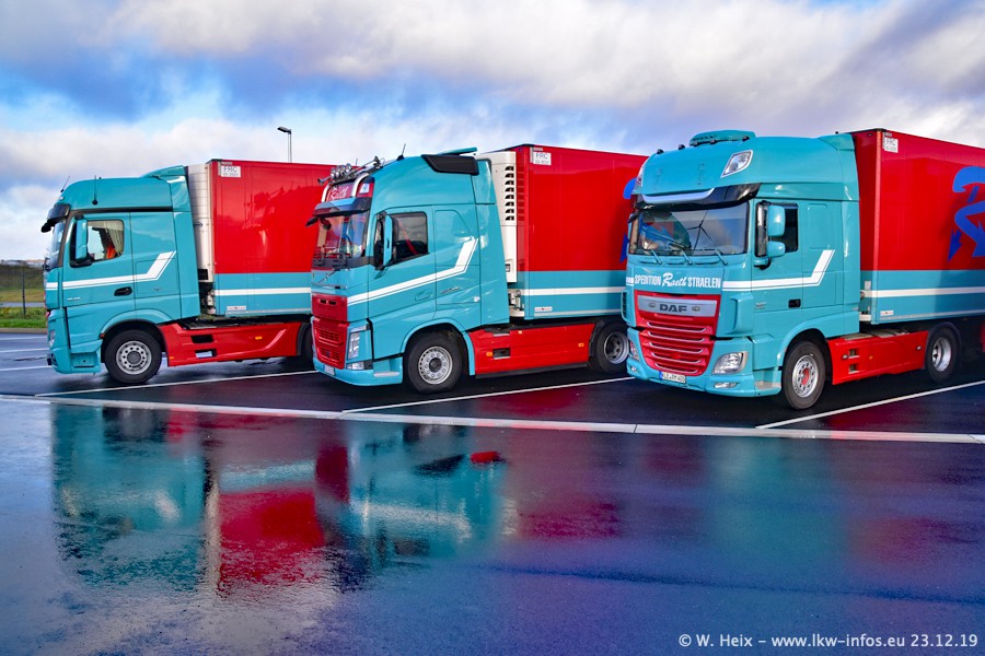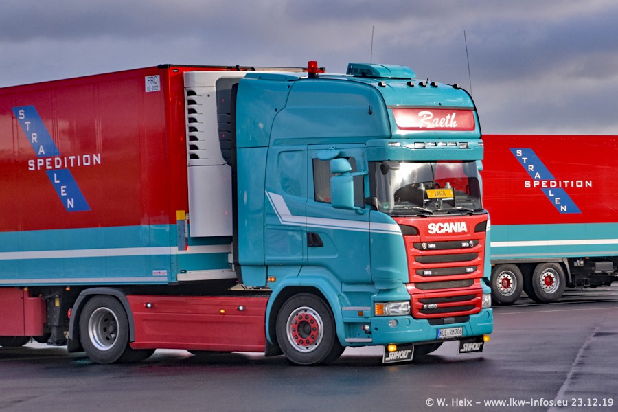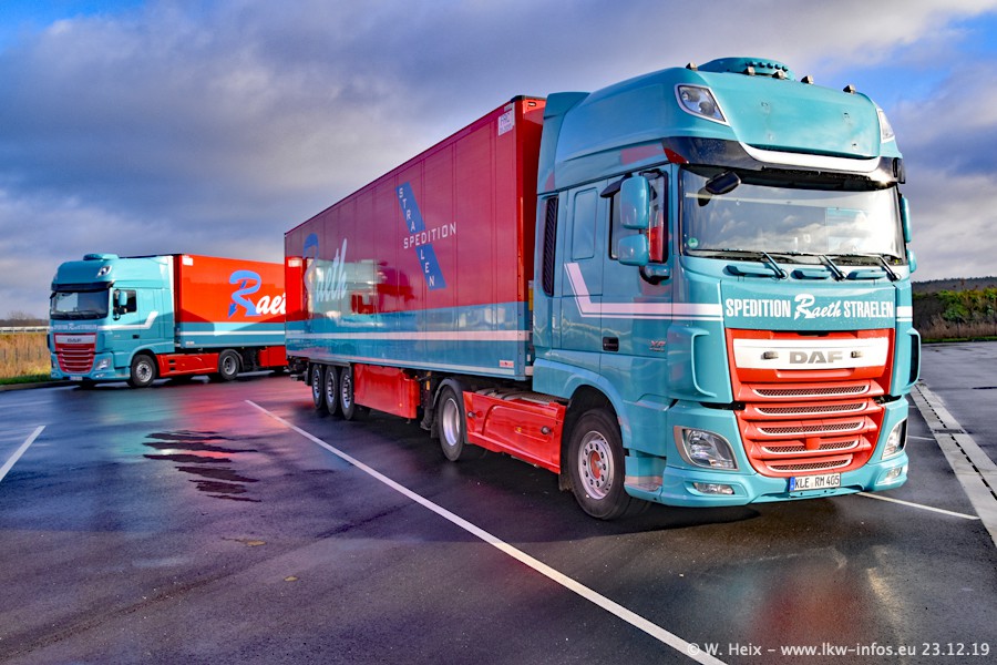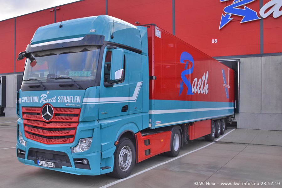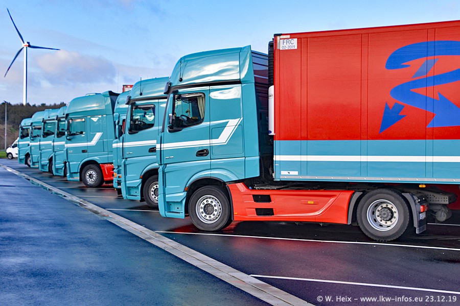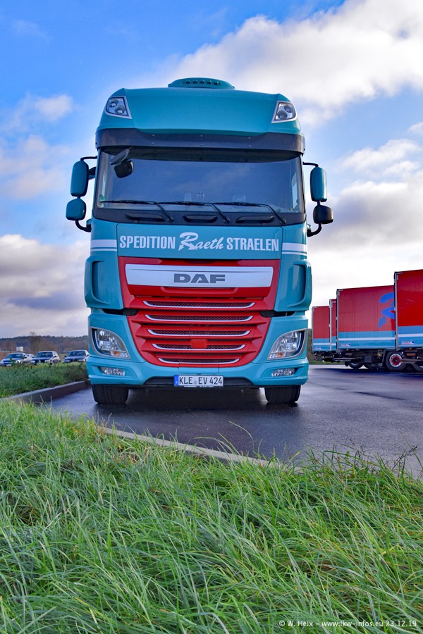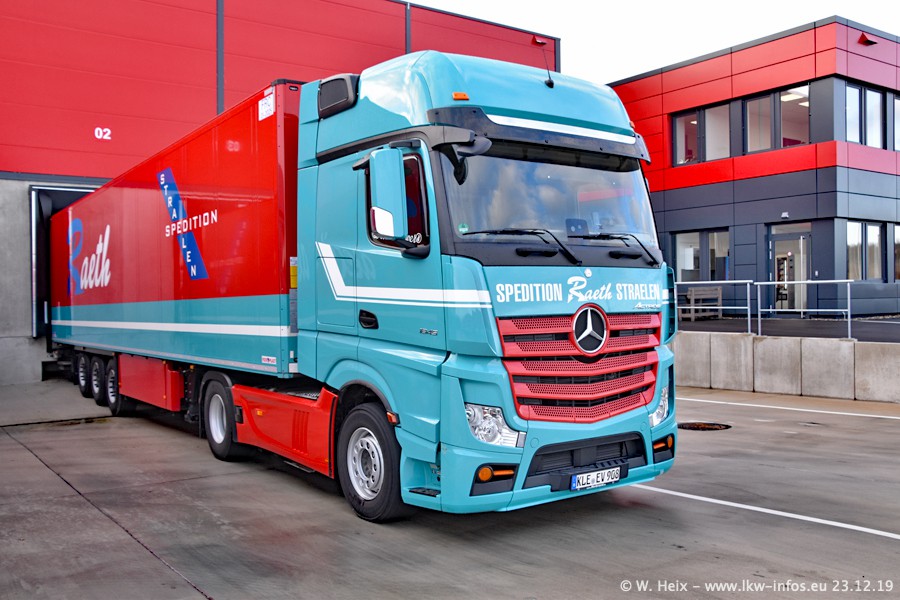 In diesem Jahr istr der Weihnachtsbesuch zugleich der erste Besuch auf dem neuen Firmengelände. Im Juli ist Raeth vom alten, viel zu klein gewordenen Gelände in Straelen, umgezogen nach Straelen-Herongen. Das neue Frimengelände liegt jetzt direkt an der A40 an der Abfahrt Herongen. Auf dem weitläufigen Gelände wurde ein kompletter Neubau mit Lagerhalle, Bürokomplex, Werkstatt und Waschstraße gebaut. Es gibt Platz für rund 40 LKW. Der Fuhrpark besteht aktuell aus rund 80 LKW. Viele Fahrzeuge stehen an den Wochenenden bei den Fahrern zuhause. Die "klassische Weihnachtsaufstellung " der LKW gibt es nicht. Aber gibt mir die Gelegenheit, viele Fahrzeuge einzeln zu fotografieren. Daher ist dieser Besuch mit 375 Fotos auch der größte bisher. Vielen Dank an Florian Brimmers für den freundlichen Empfang und für die Infos über die Firma.