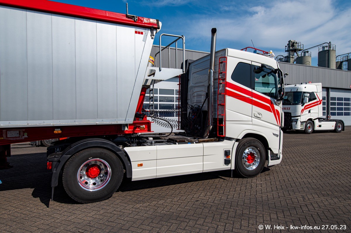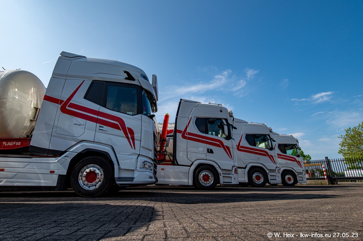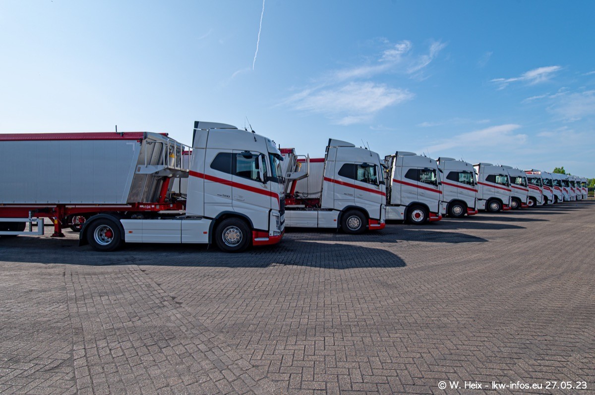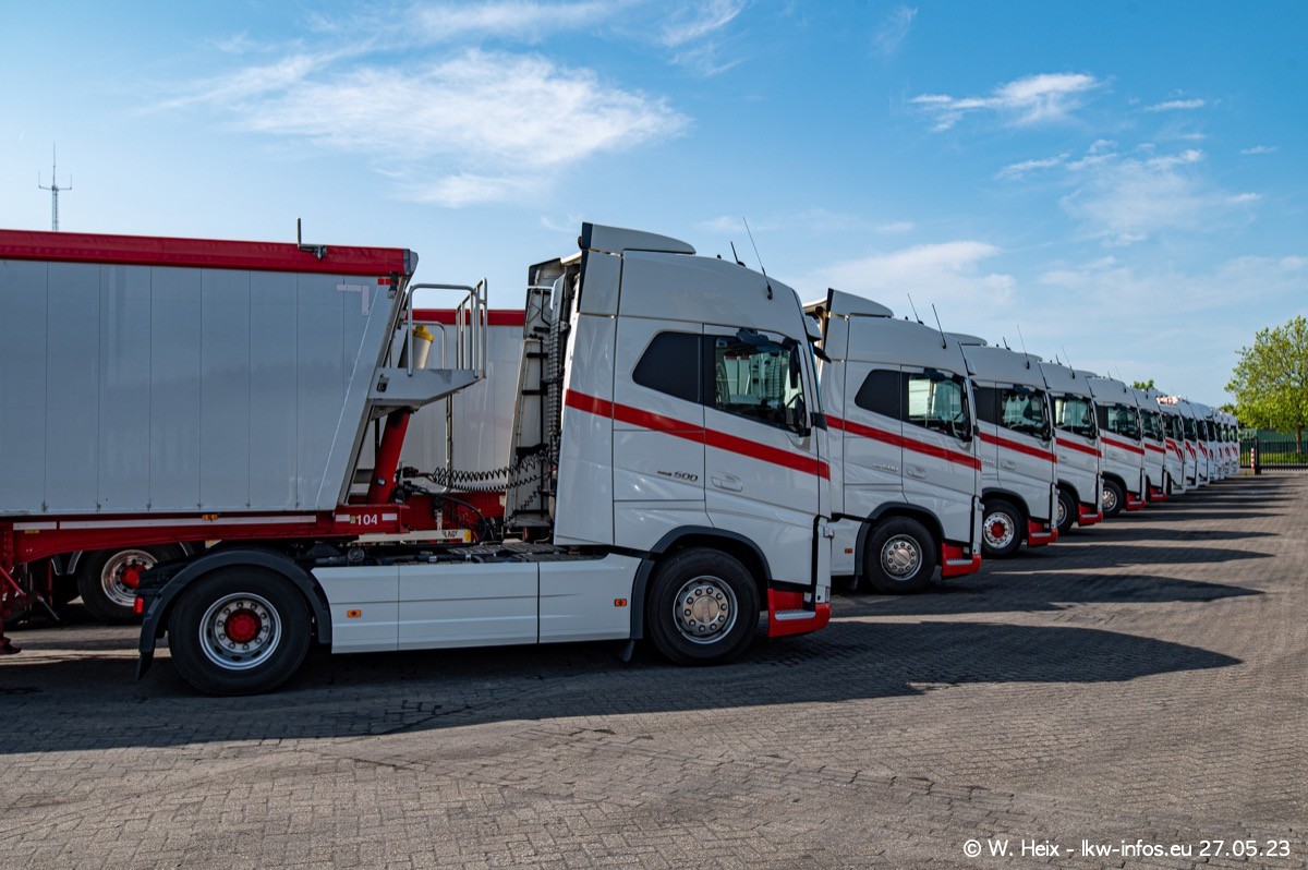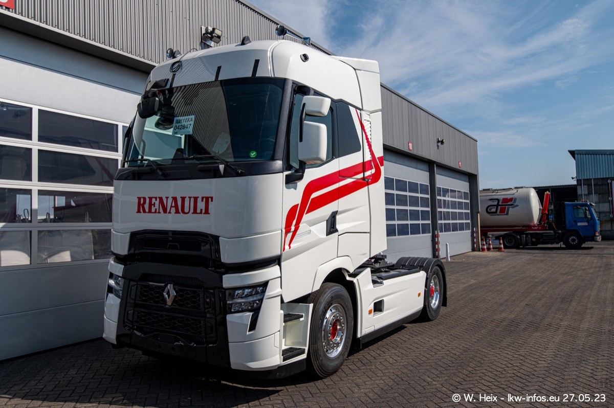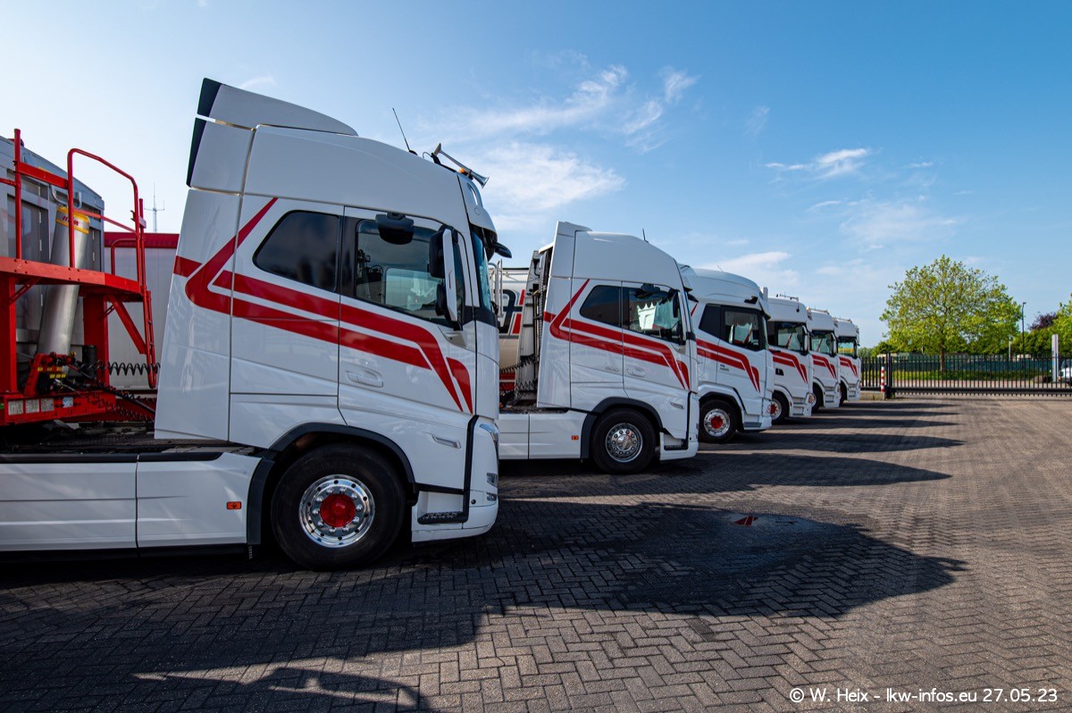 Vor zwei Wochen ist ein besonderer VOLVO FH 5 dazu gekommen. Der ist ohne Hochdach und mit einigem an Zubehör ausgestattet. Ein Fahrer wurde damit zu seinem 25-jährigen Jubiläum überrascht/belohnt. Der erste von drei Renault T Evo ist da, aber noch nicht fertig. Ein paar Bilder habe ich schon gemacht. Der Rest der Fahrzeuge ist bekannt. Es dauert übrigens nicht mehr lange, bis alle VOLVO FH 4 ausgemustert sind. Dann wird der fast komplette Fuhrpark im neuen Design unterwegs sein ....