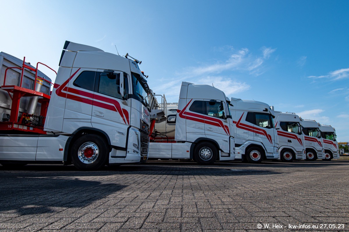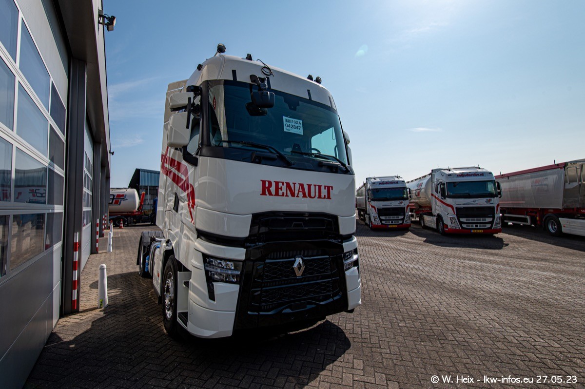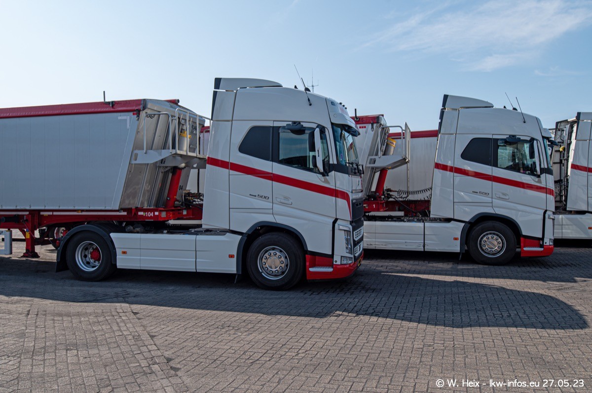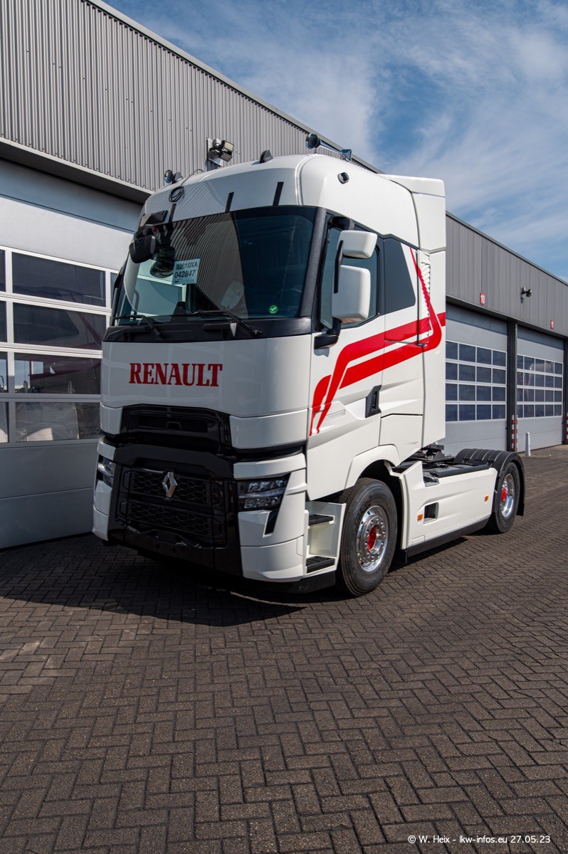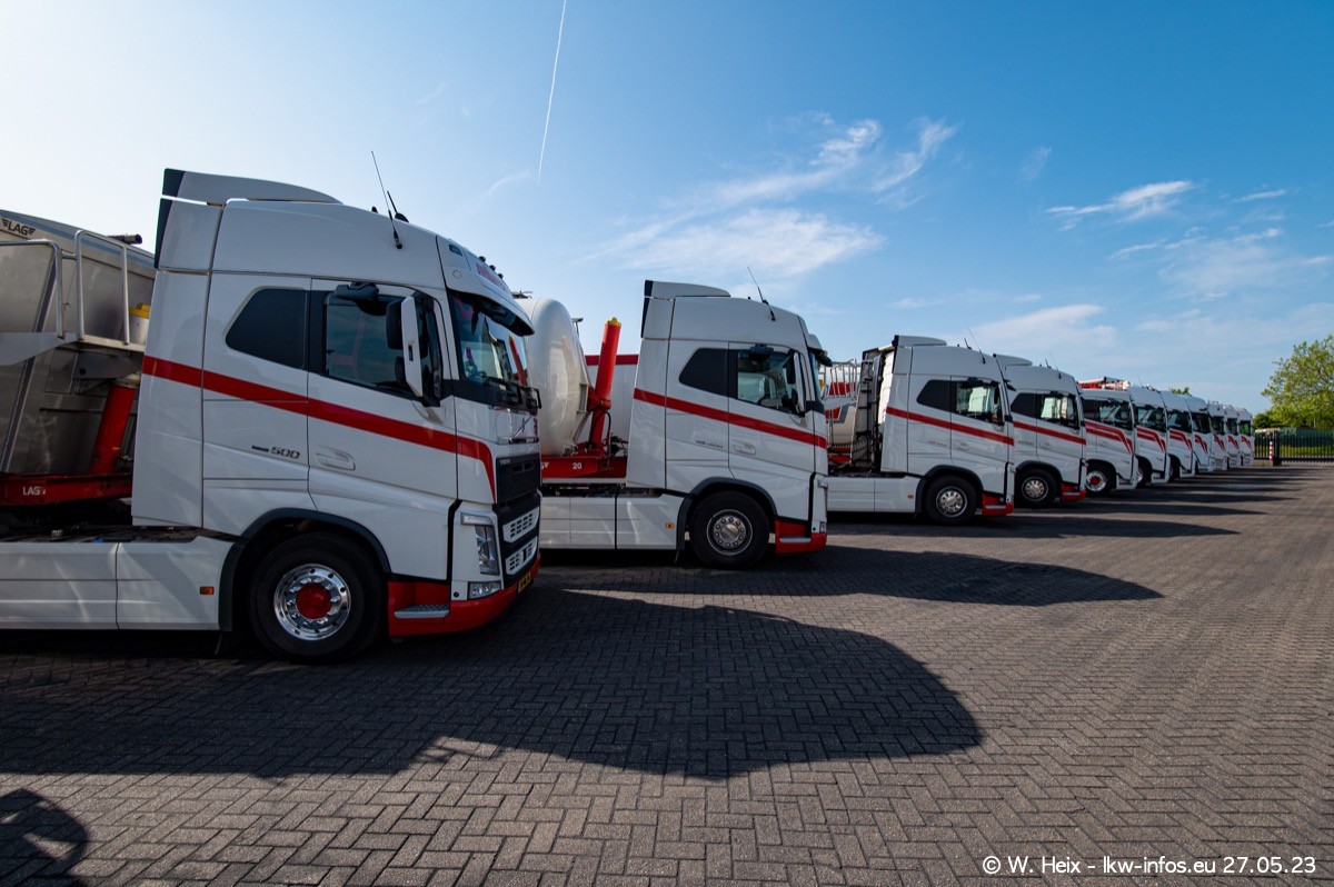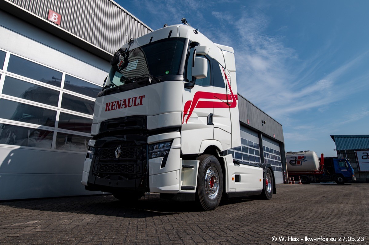 Vor zwei Wochen ist ein besonderer VOLVO FH 5 dazu gekommen. Der ist ohne Hochdach und mit einigem an Zubehör ausgestattet. Ein Fahrer wurde damit zu seinem 25-jährigen Jubiläum überrascht/belohnt. Der erste von drei Renault T Evo ist da, aber noch nicht fertig. Ein paar Bilder habe ich schon gemacht. Der Rest der Fahrzeuge ist bekannt. Es dauert übrigens nicht mehr lange, bis alle VOLVO FH 4 ausgemustert sind. Dann wird der fast komplette Fuhrpark im neuen Design unterwegs sein ....
