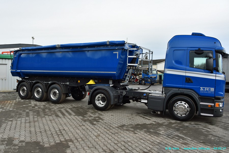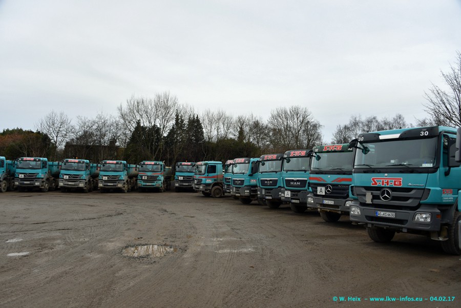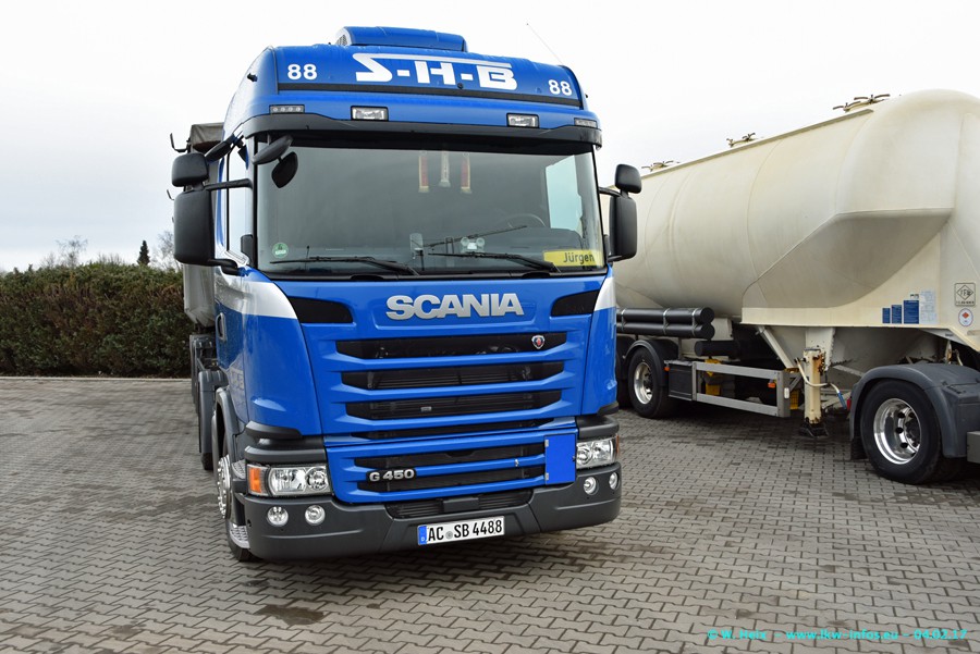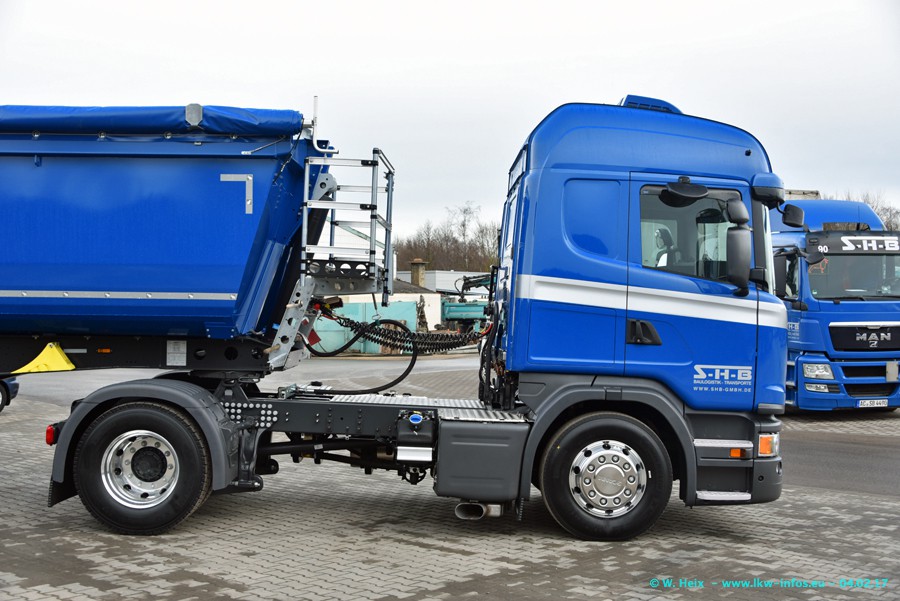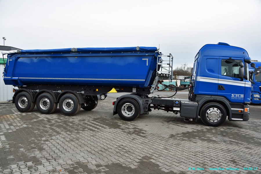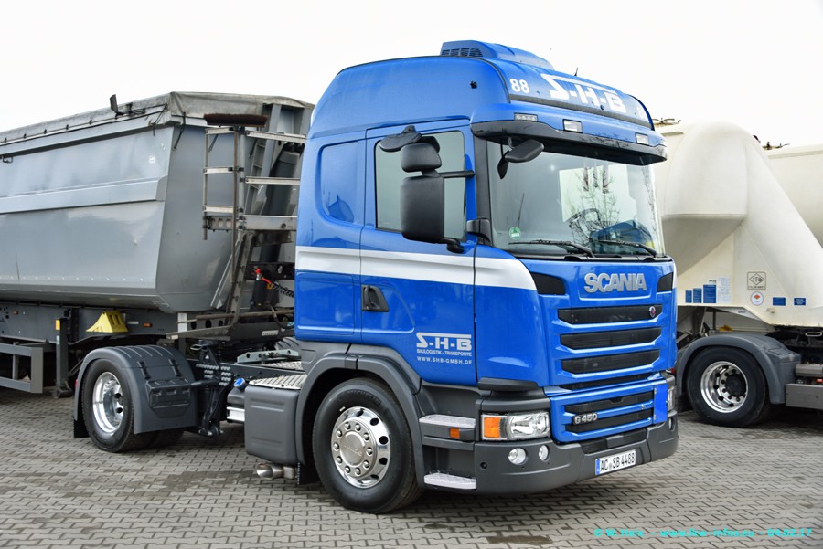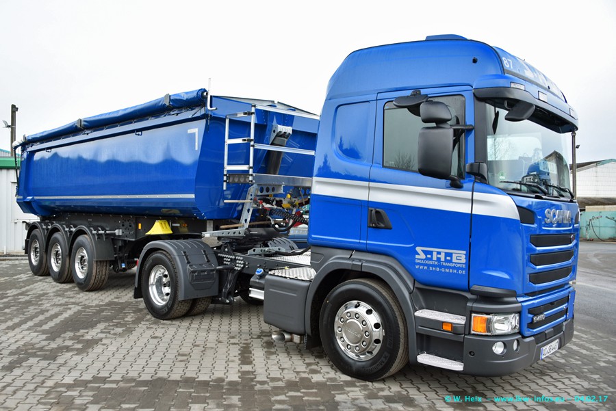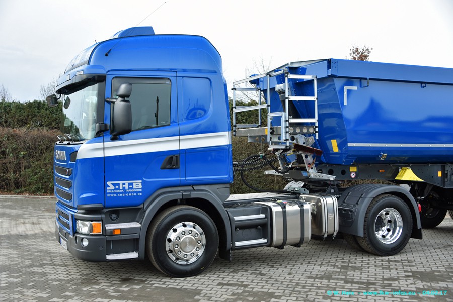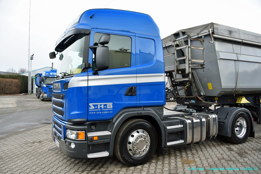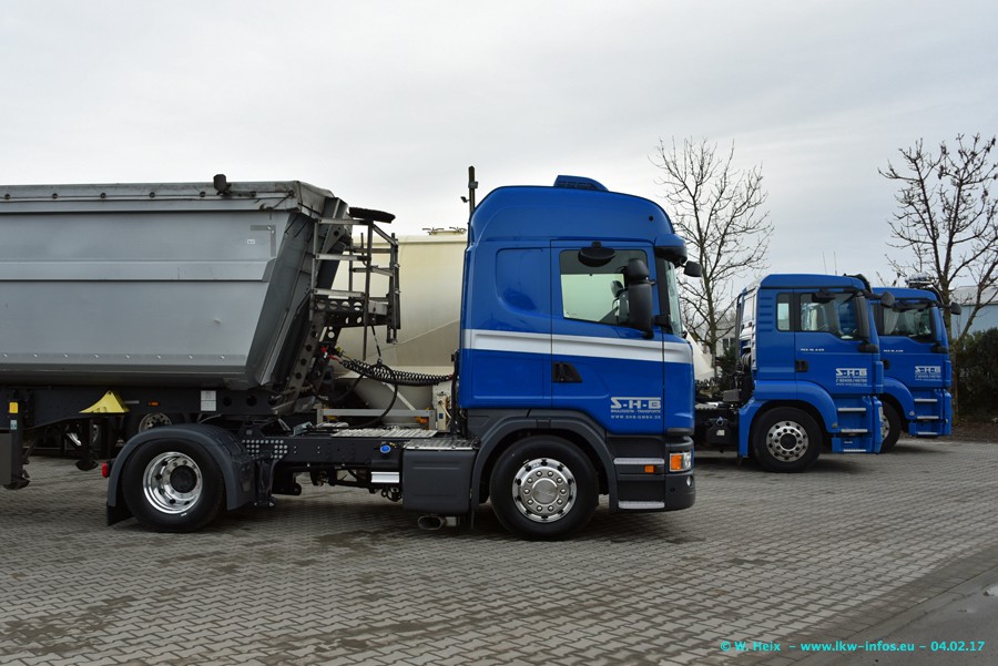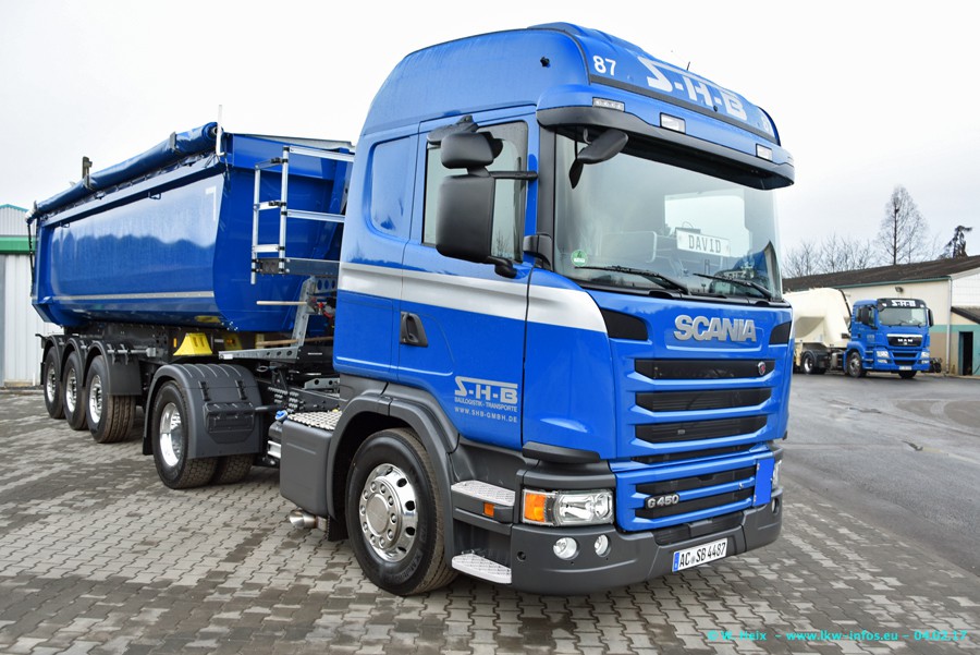Nach 1,5 Jahren Pause habe ich die Firma S-H-B wieder besucht. Im vergangenen Jahr wurde der Fuhrpark mit zwei Mercedes-Benz Arocs-Zugmaschinen modernisiert. Und gestern wurden von Scania die ersten von insegsamt sechs Scania G 450 Streamline ausgeliefert. Diese sind auf den ersten Bildern zu sehen Der Rest des Fuhrparks ist bekannt. Bedingt durch das winterliche Wetter und den Baustelleneinsatz sind viele der Kipper nicht sauber, was bei Baufahrzeugen oft nicht so ist.