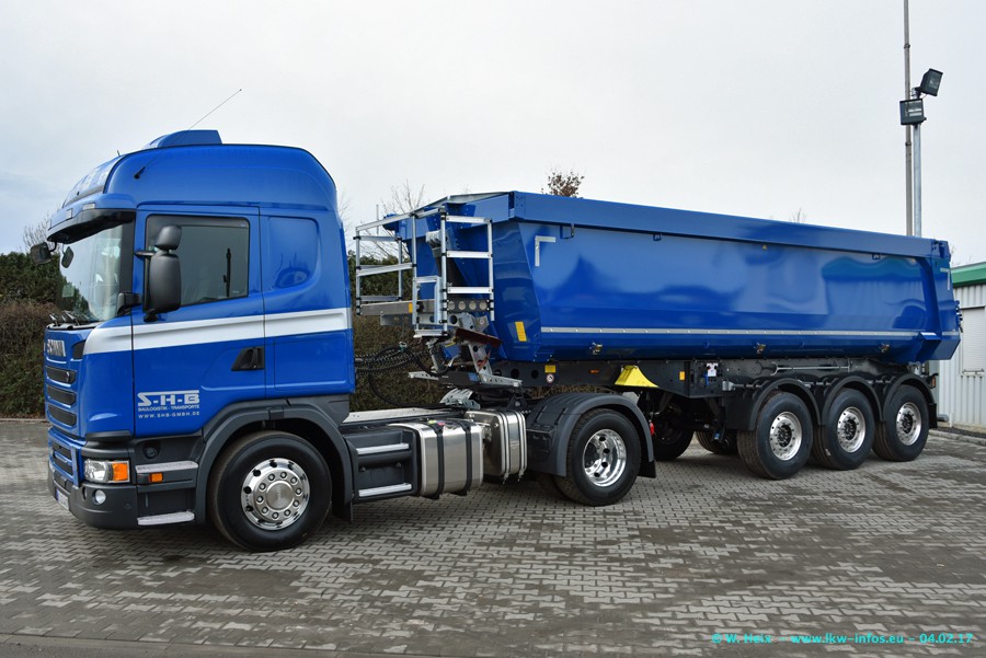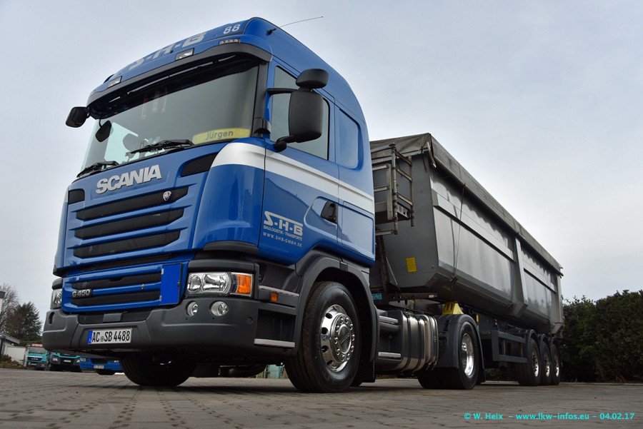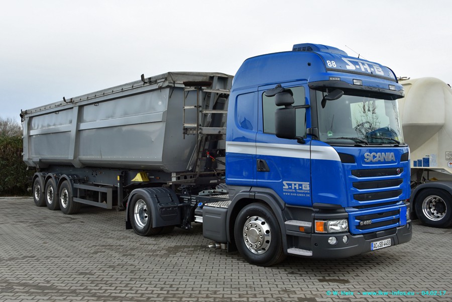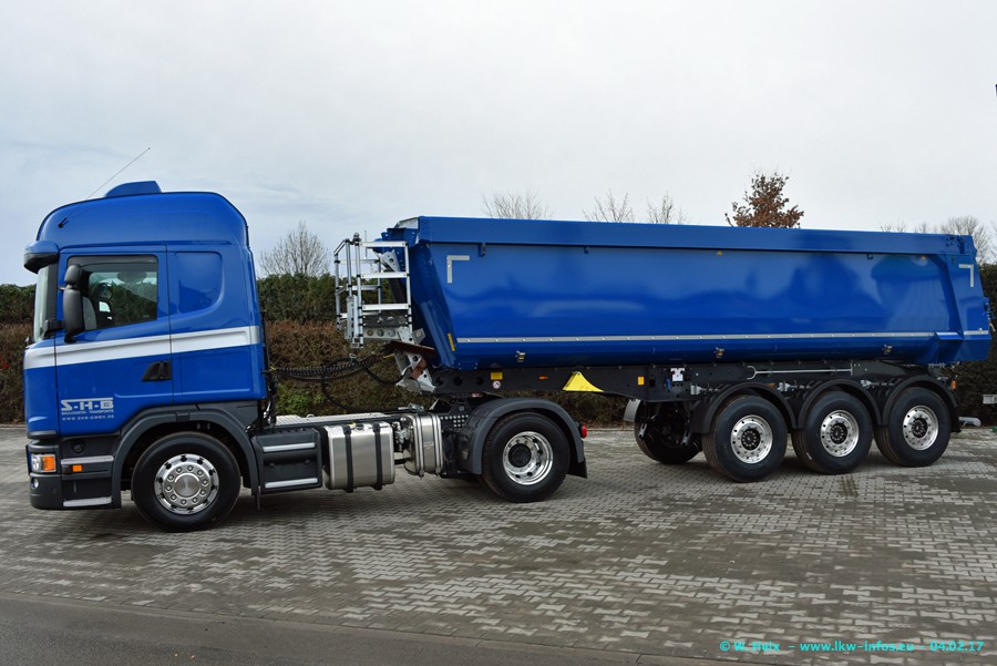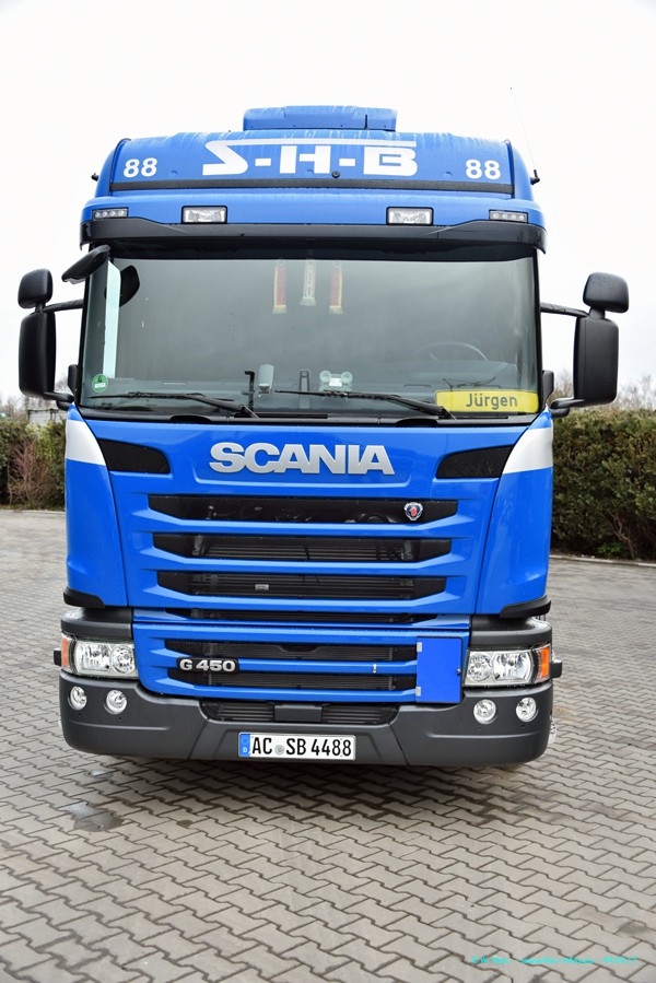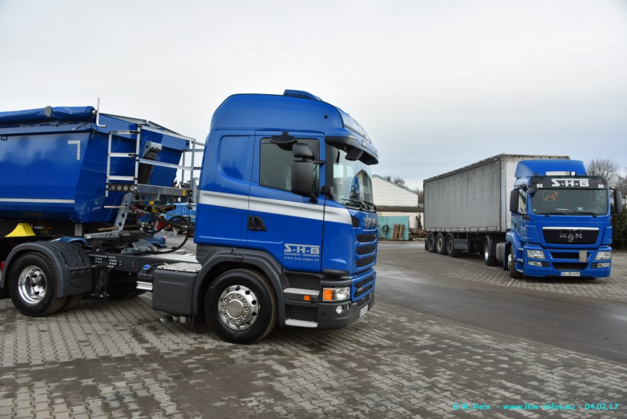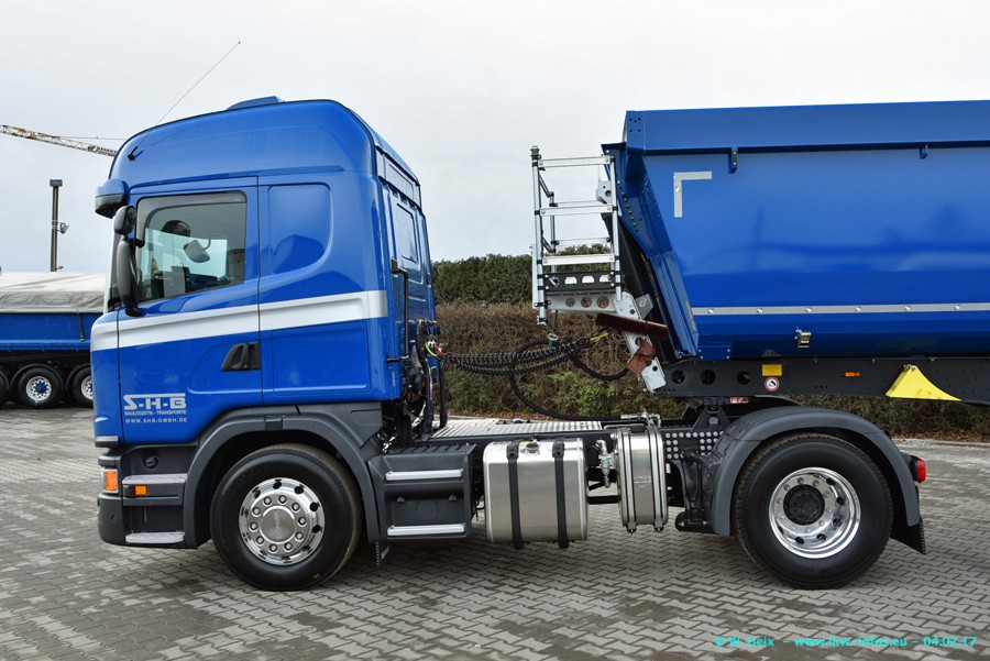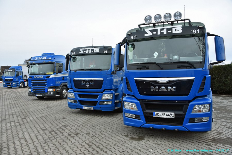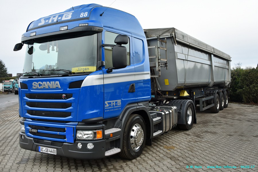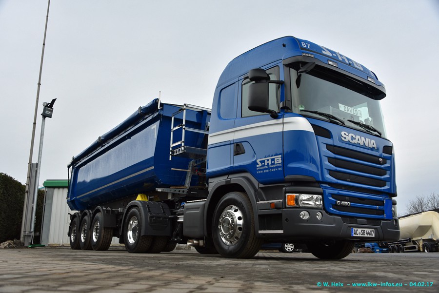 Nach 1,5 Jahren Pause habe ich die Firma S-H-B wieder besucht. Im vergangenen Jahr wurde der Fuhrpark mit zwei Mercedes-Benz Arocs-Zugmaschinen modernisiert. Und gestern wurden von Scania die ersten von insegsamt sechs Scania G 450 Streamline ausgeliefert. Diese sind auf den ersten Bildern zu sehen Der Rest des Fuhrparks ist bekannt. Bedingt durch das winterliche Wetter und den Baustelleneinsatz sind viele der Kipper nicht sauber, was bei Baufahrzeugen oft nicht so ist.