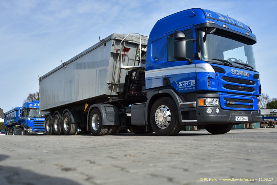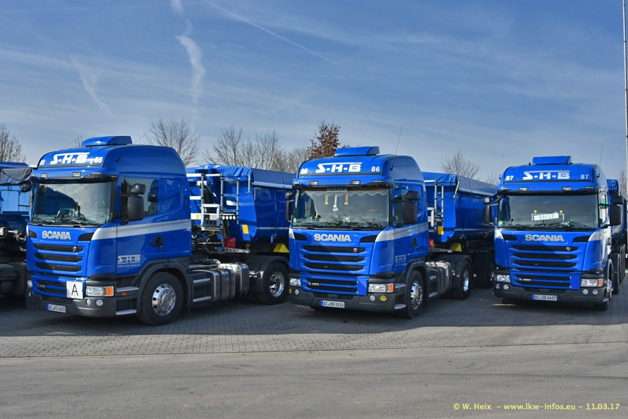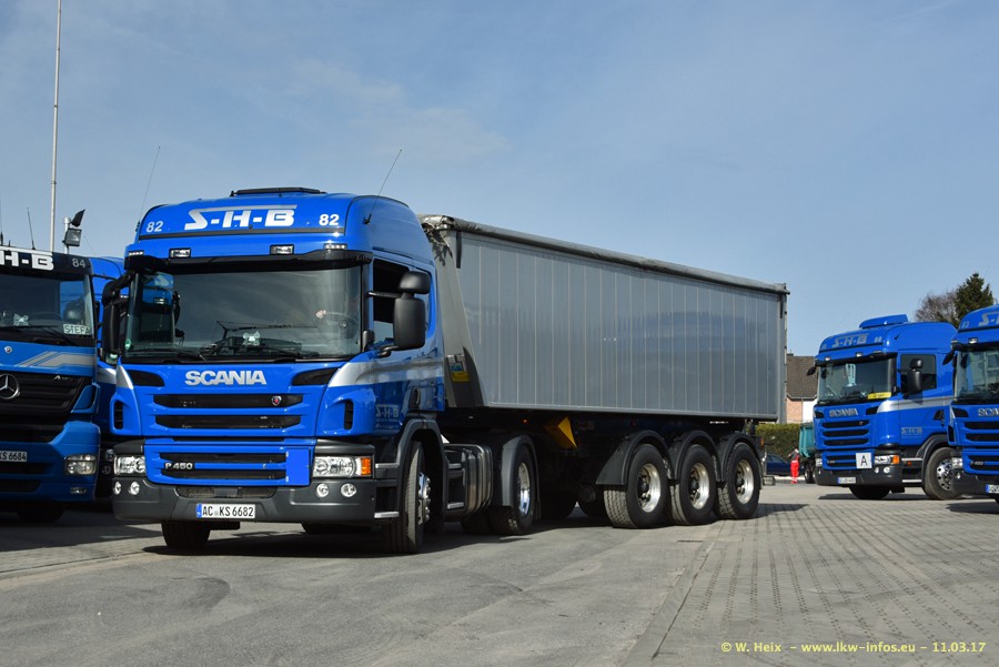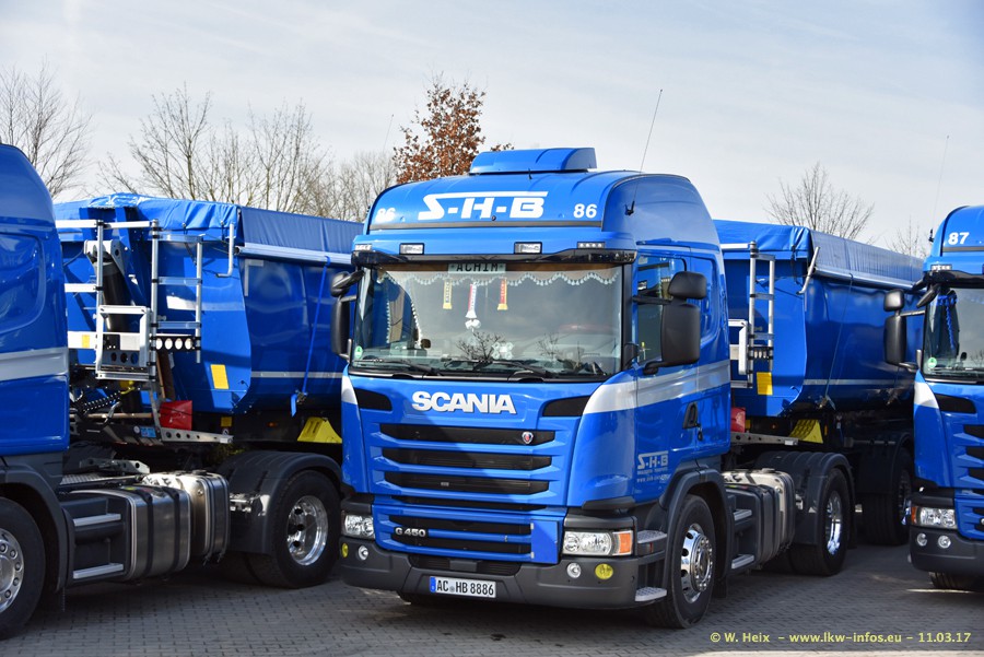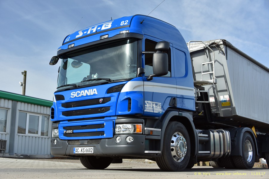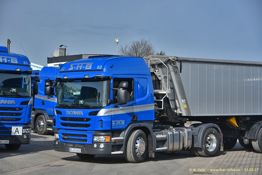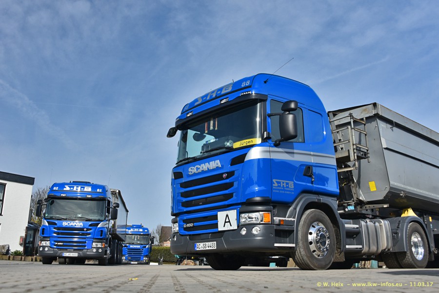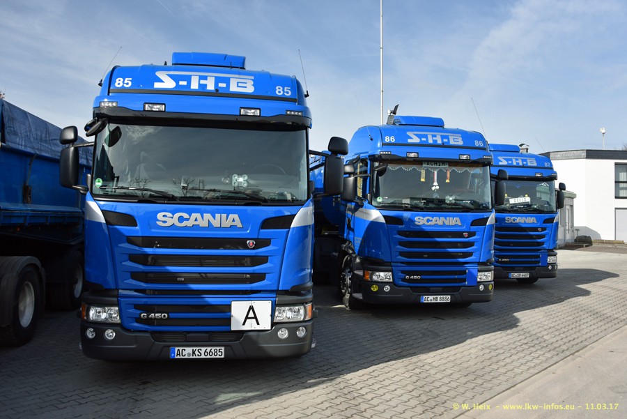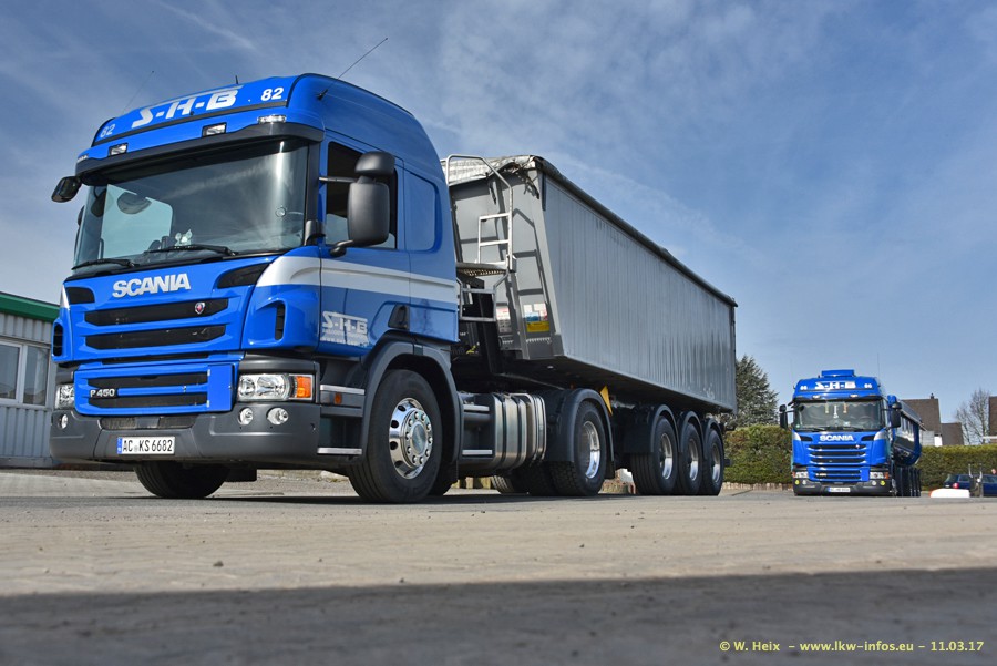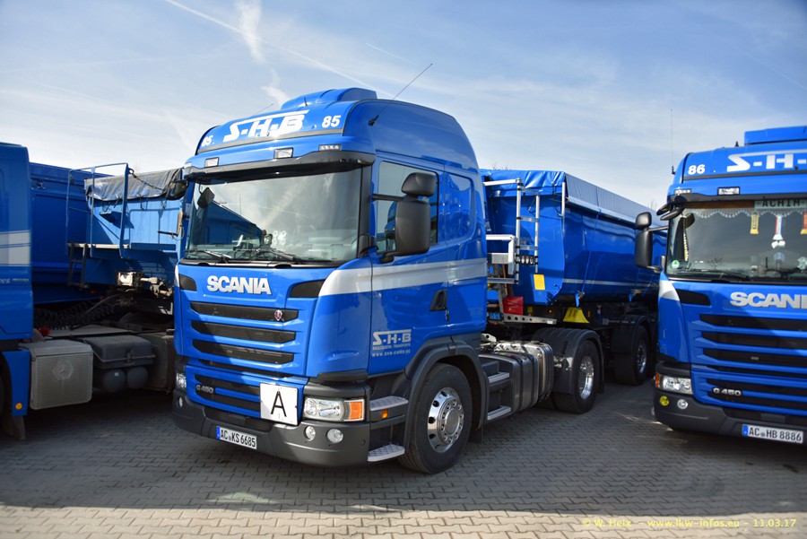In den letzten Wochen hat SHB insgesamt sechs neue Sattelzugmaschinen von Scania bekommen. Die ersten beiden kamen Anfang März (siehe Bilder Teil 2) und am Freitag (10.03) wurde Nummer 6 bei der Scania-Niederlassung in Würselen in Empfang genommen. Somit hat S-H-B jetzt vier neue Scania G 450 Streamline und zwei neue Scania P 450. Die weiteren Bilder zeigen nochmal den großen Rest vom Fuhrpark, diesmal bei vorfrühlingshaft schönem sonnigen Wetter.