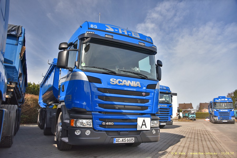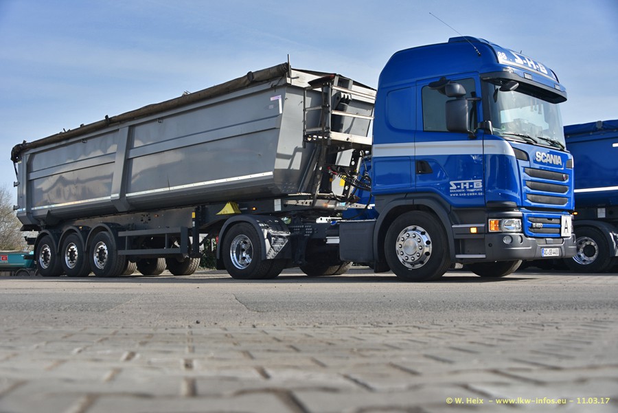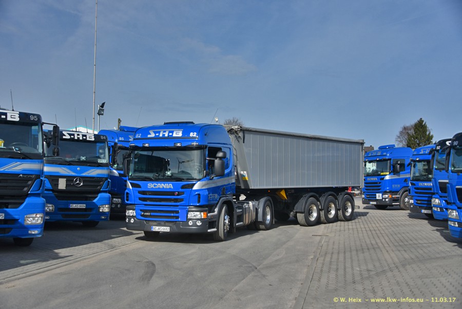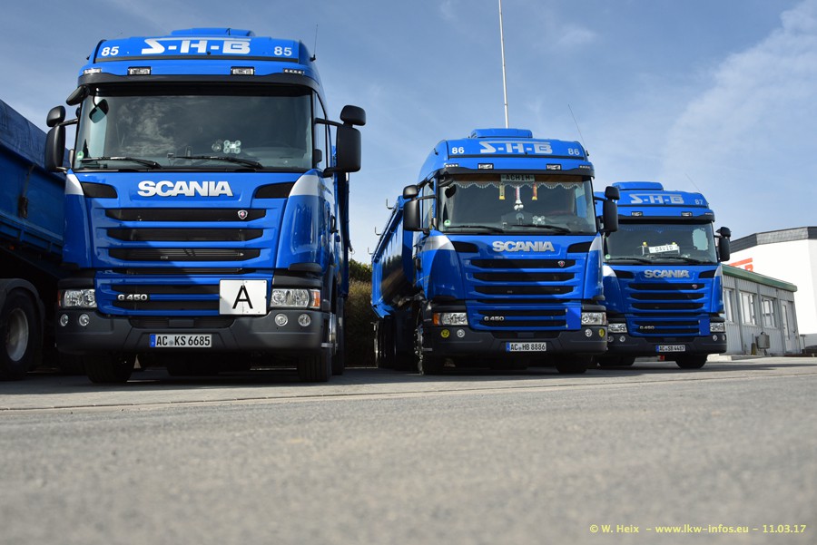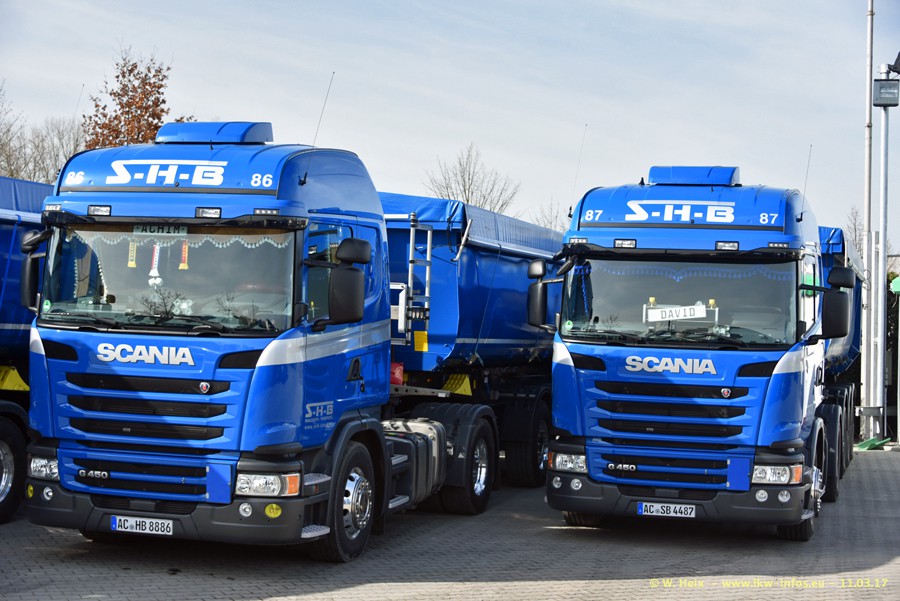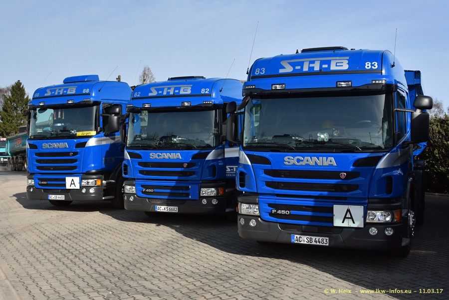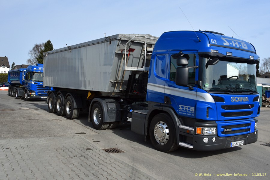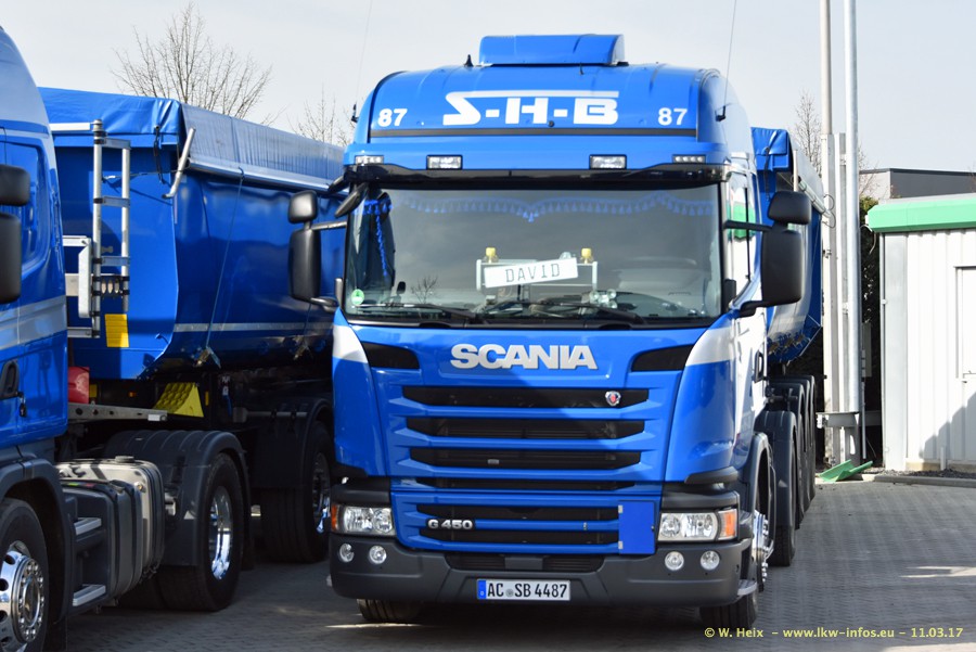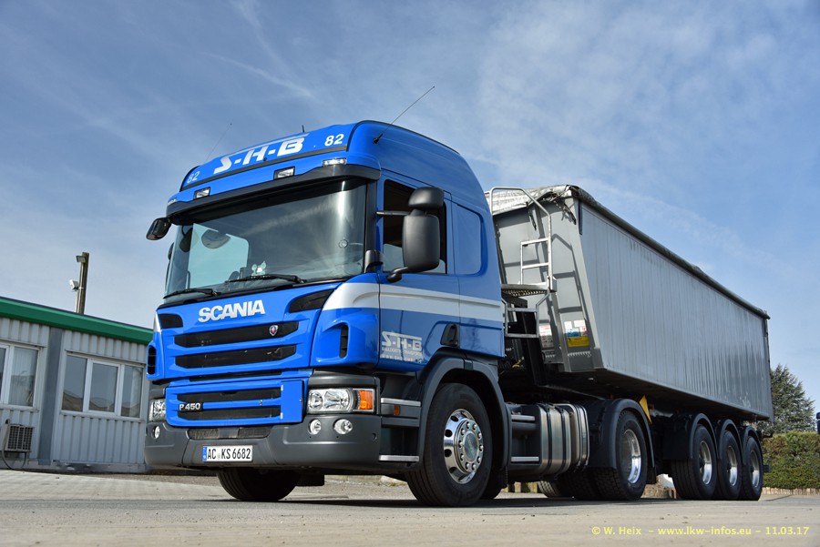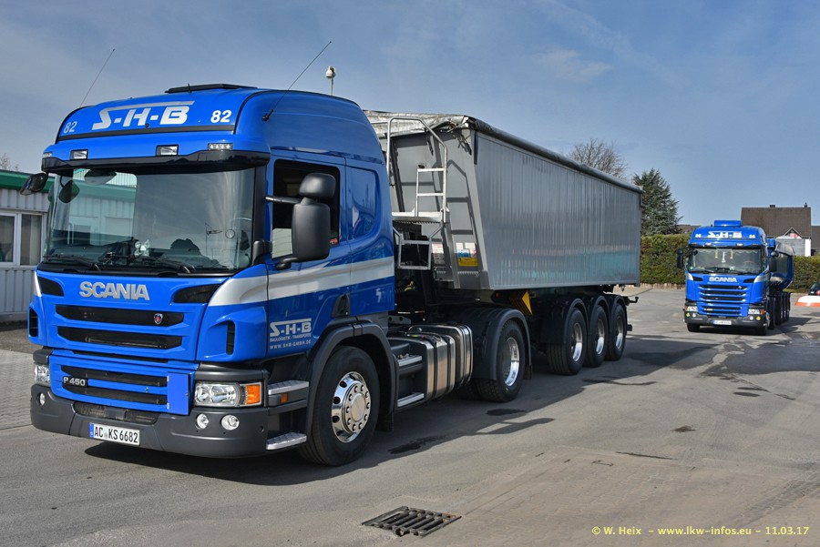In den letzten Wochen hat SHB insgesamt sechs neue Sattelzugmaschinen von Scania bekommen. Die ersten beiden kamen Anfang März (siehe Bilder Teil 2) und am Freitag (10.03) wurde Nummer 6 bei der Scania-Niederlassung in Würselen in Empfang genommen. Somit hat S-H-B jetzt vier neue Scania G 450 Streamline und zwei neue Scania P 450. Die weiteren Bilder zeigen nochmal den großen Rest vom Fuhrpark, diesmal bei vorfrühlingshaft schönem sonnigen Wetter.
