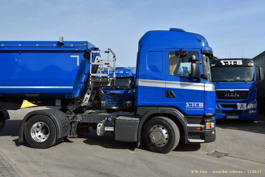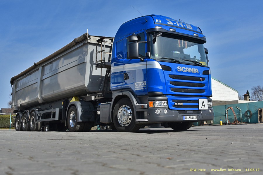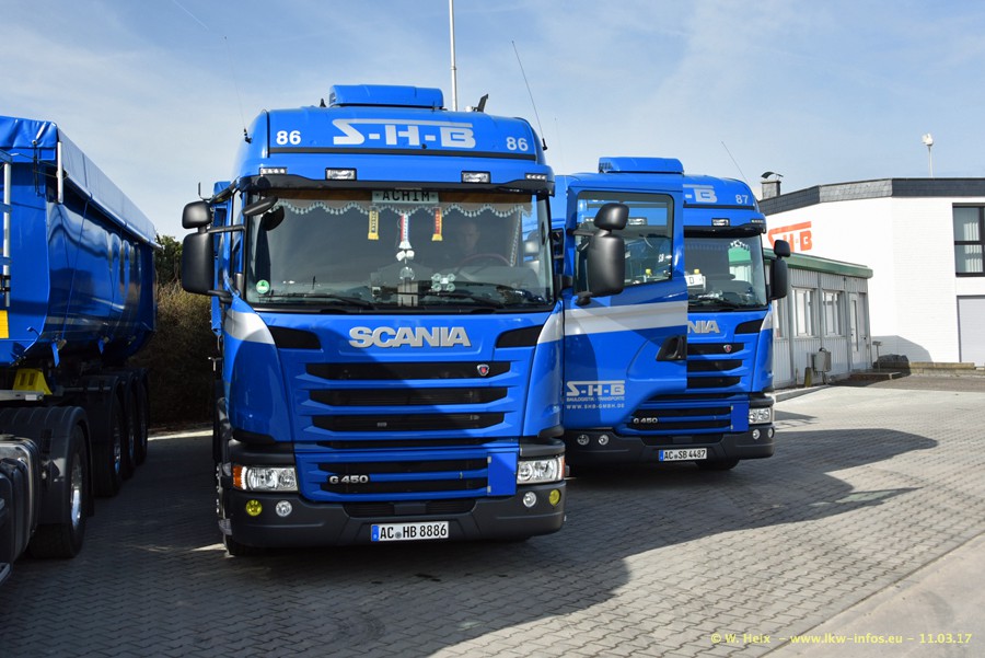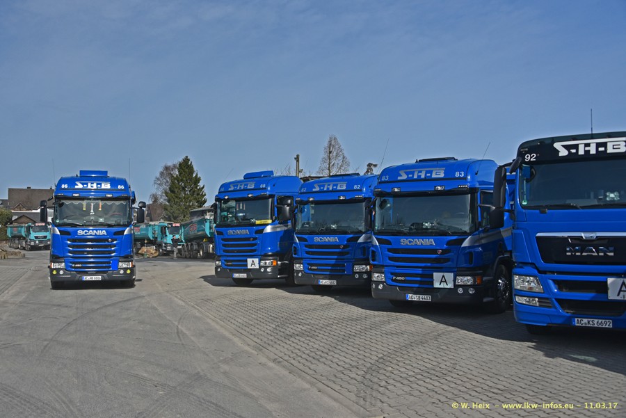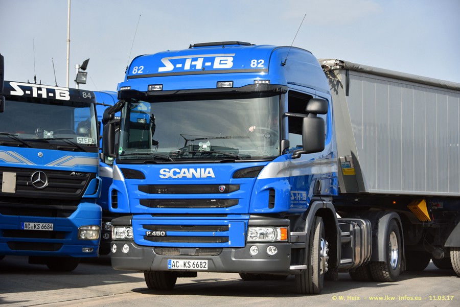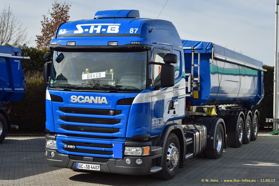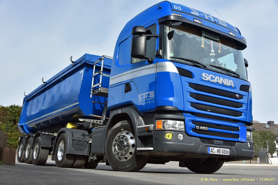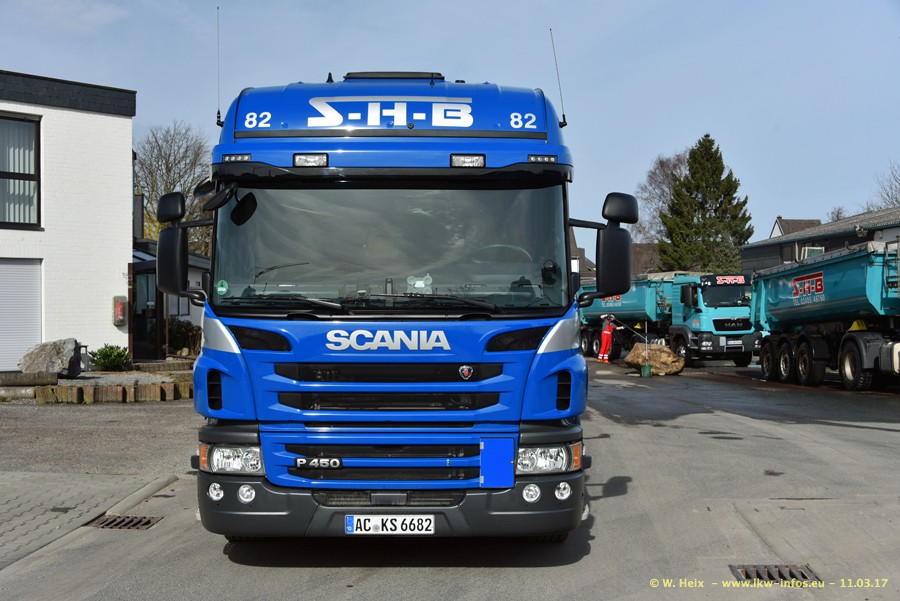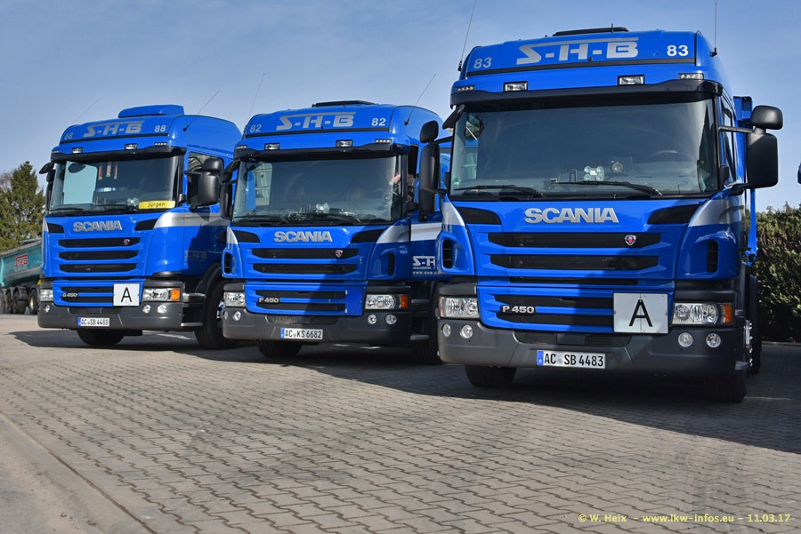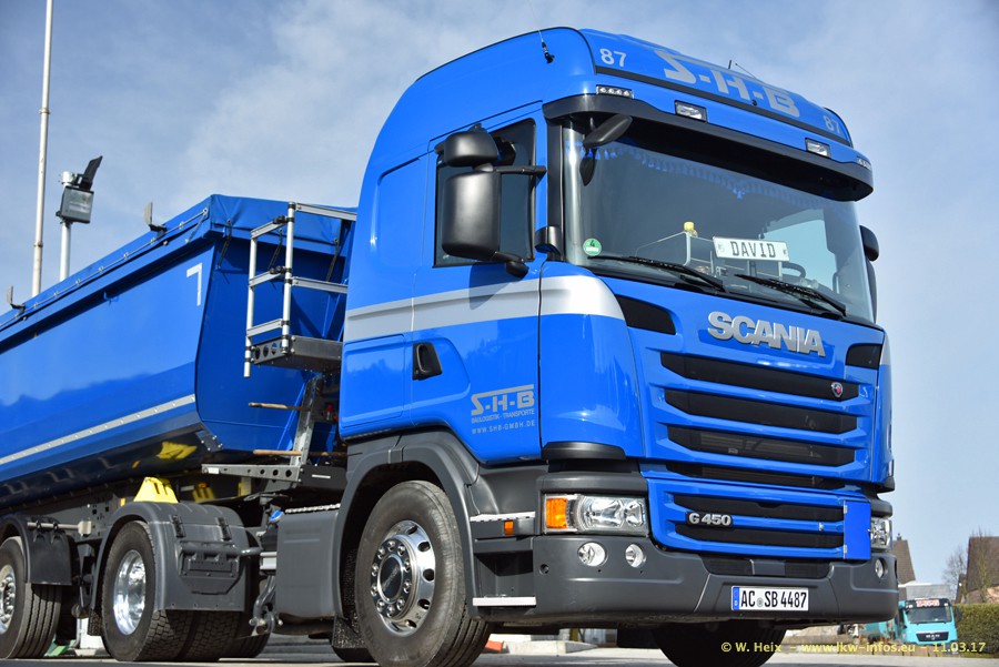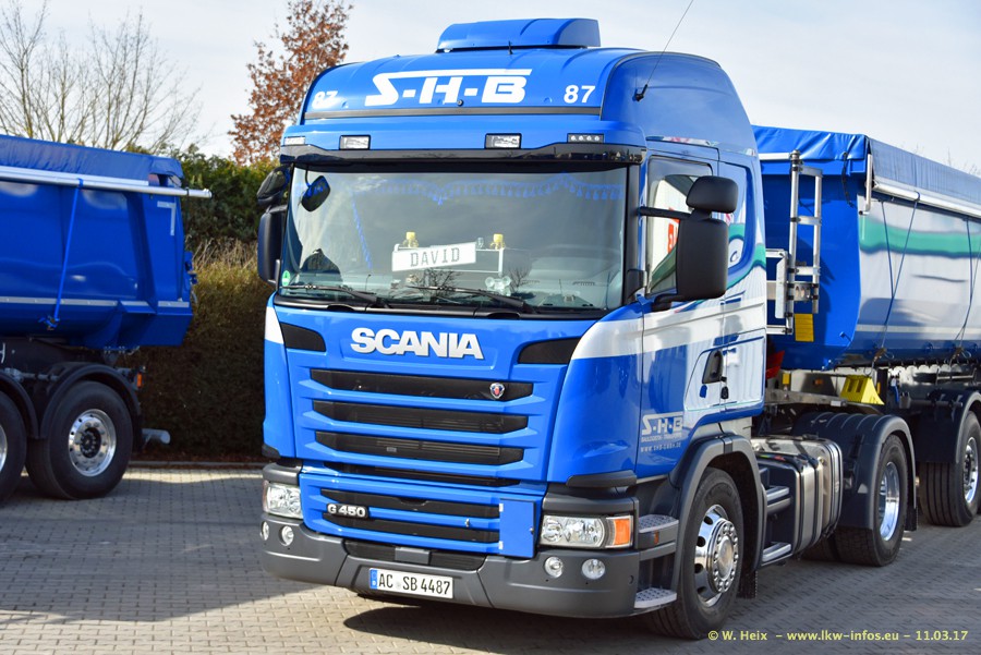 In den letzten Wochen hat SHB insgesamt sechs neue Sattelzugmaschinen von Scania bekommen. Die ersten beiden kamen Anfang März (siehe Bilder Teil 2) und am Freitag (10.03) wurde Nummer 6 bei der Scania-Niederlassung in Würselen in Empfang genommen. Somit hat S-H-B jetzt vier neue Scania G 450 Streamline und zwei neue Scania P 450. Die weiteren Bilder zeigen nochmal den großen Rest vom Fuhrpark, diesmal bei vorfrühlingshaft schönem sonnigen Wetter.