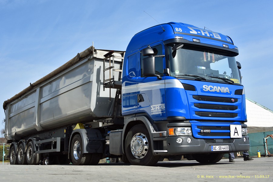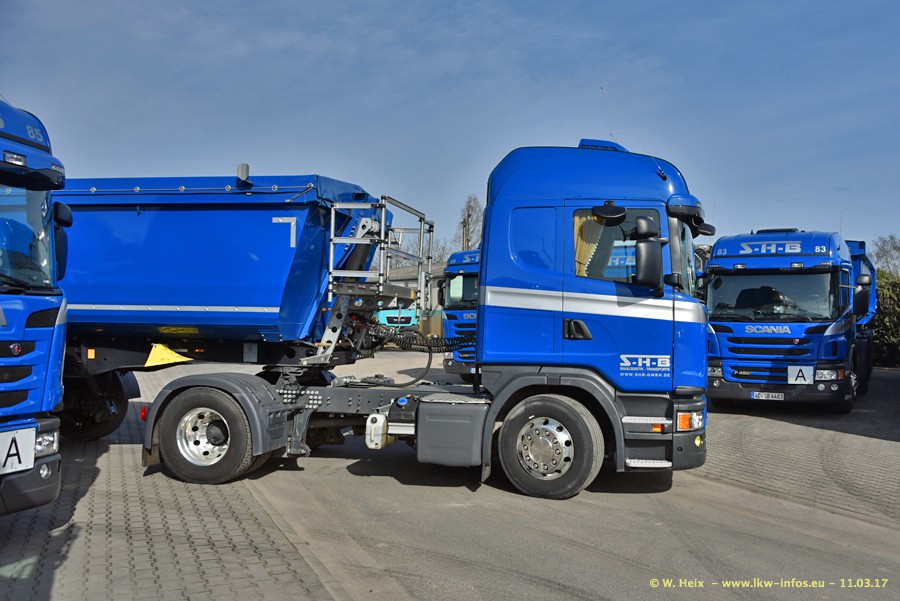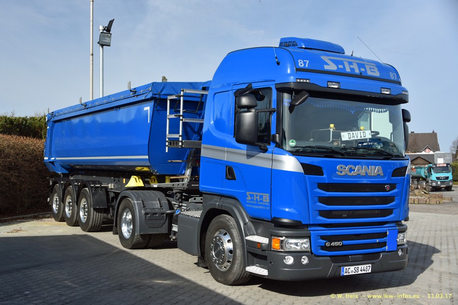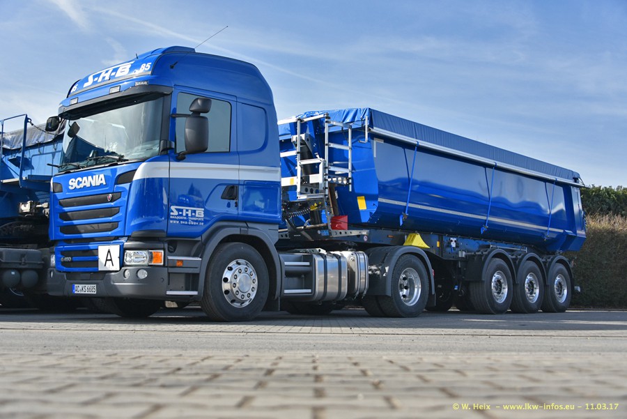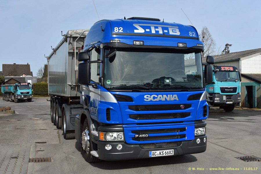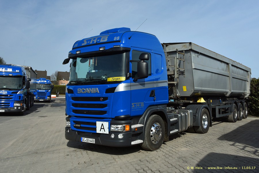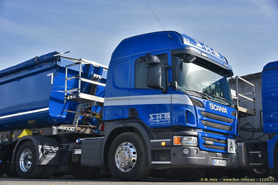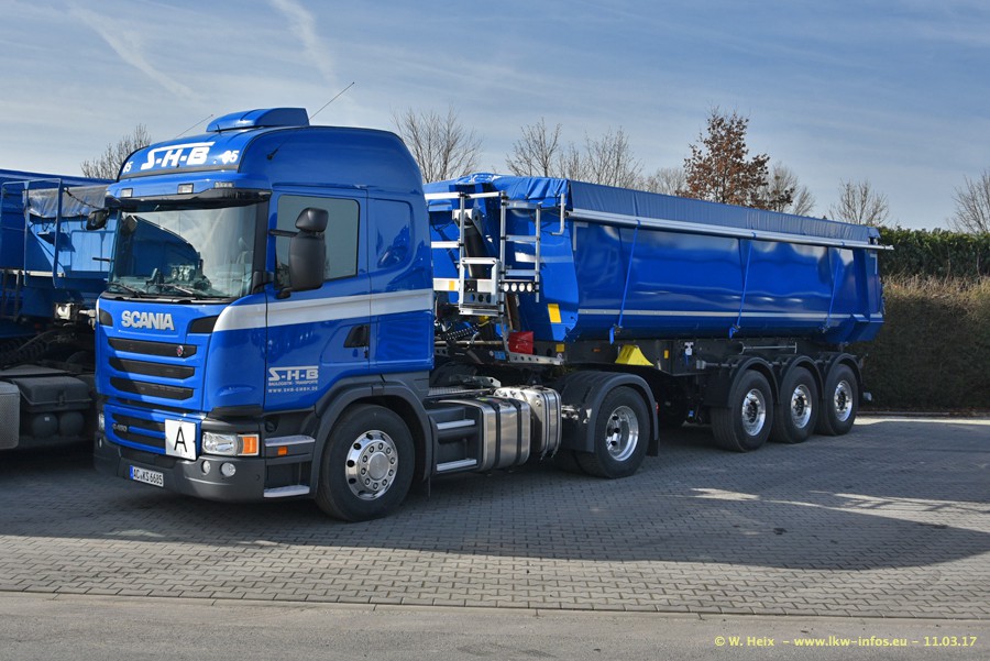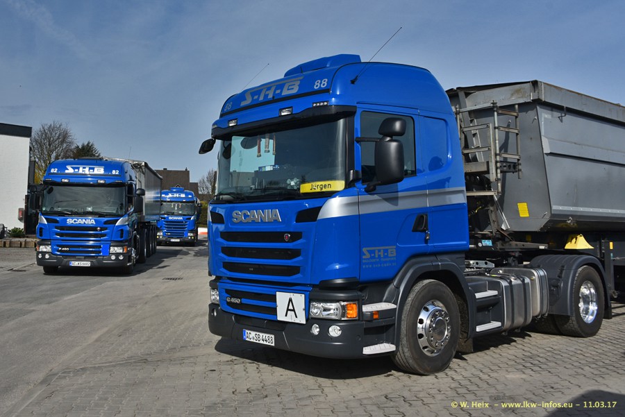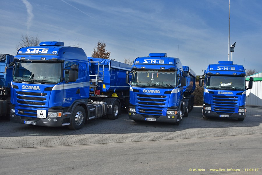 In den letzten Wochen hat SHB insgesamt sechs neue Sattelzugmaschinen von Scania bekommen. Die ersten beiden kamen Anfang März (siehe Bilder Teil 2) und am Freitag (10.03) wurde Nummer 6 bei der Scania-Niederlassung in Würselen in Empfang genommen. Somit hat S-H-B jetzt vier neue Scania G 450 Streamline und zwei neue Scania P 450. Die weiteren Bilder zeigen nochmal den großen Rest vom Fuhrpark, diesmal bei vorfrühlingshaft schönem sonnigen Wetter.