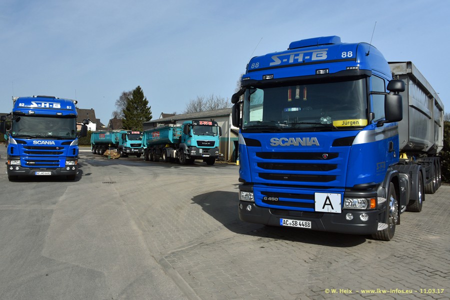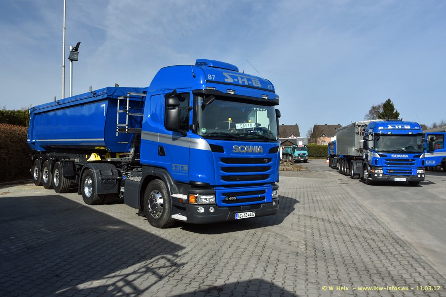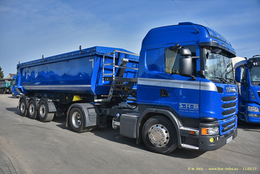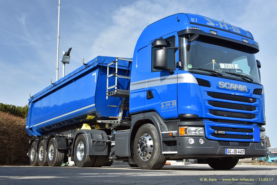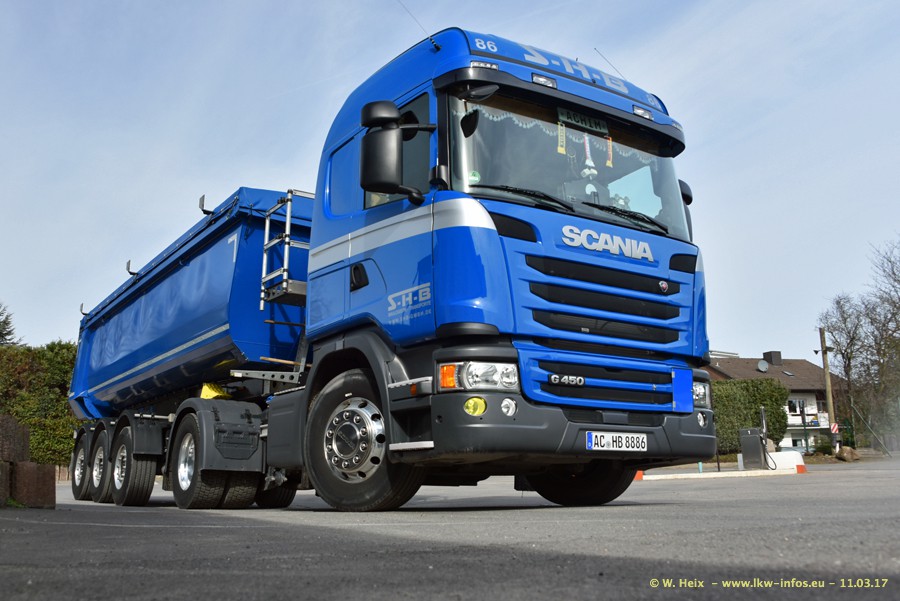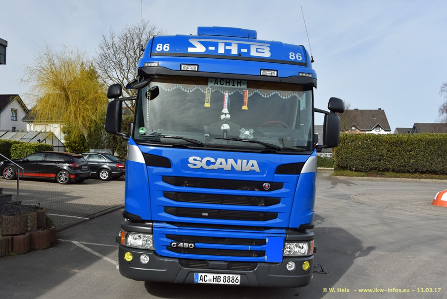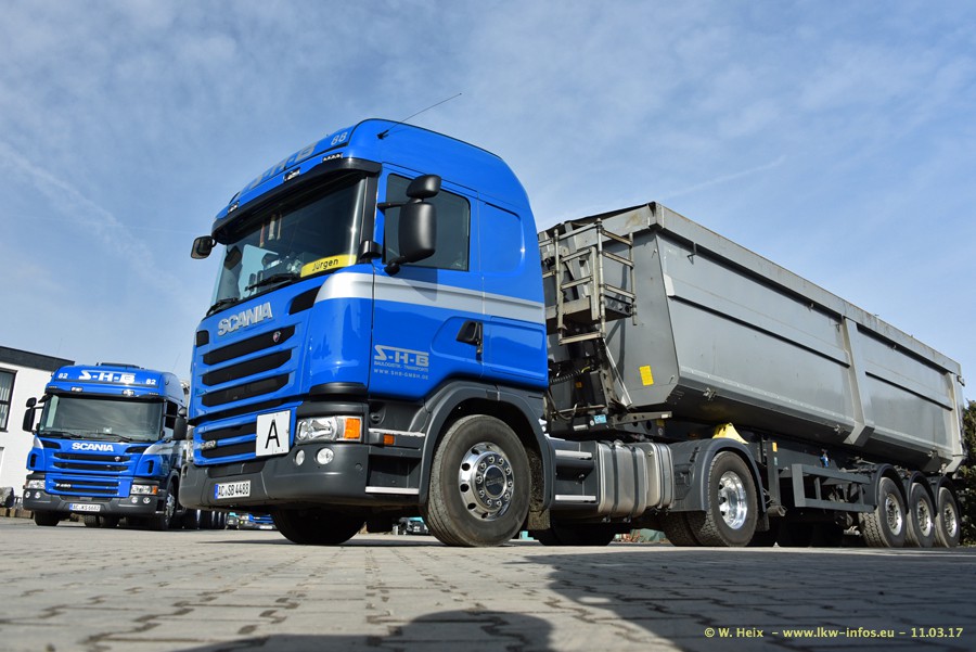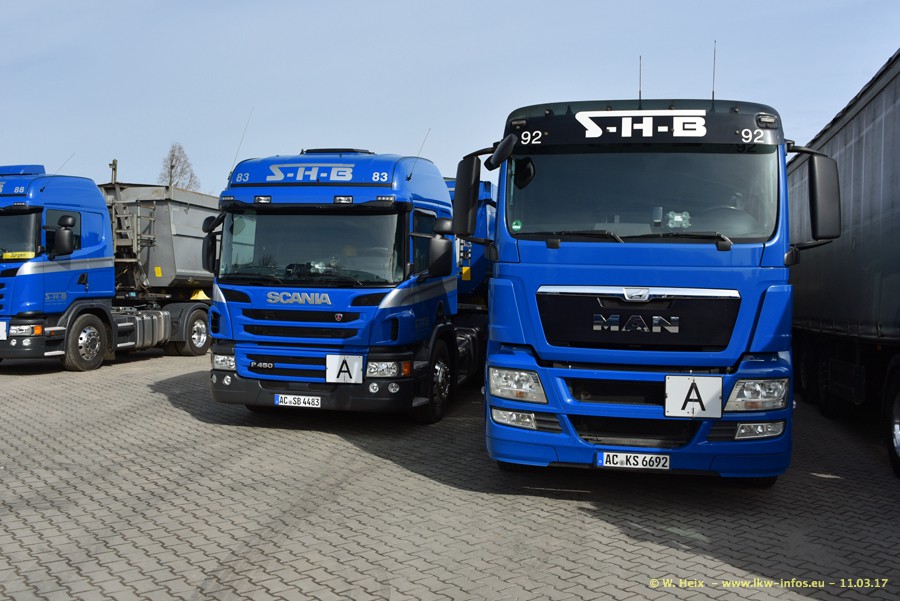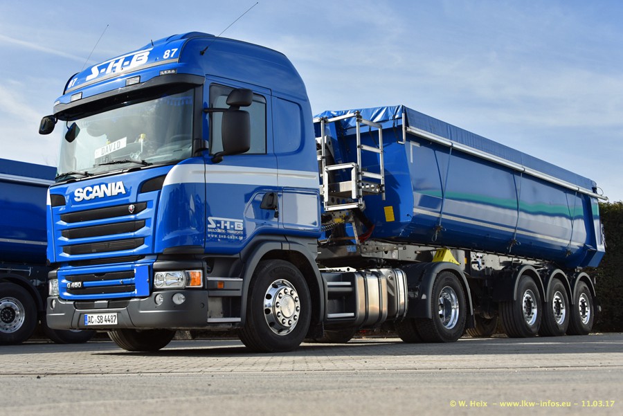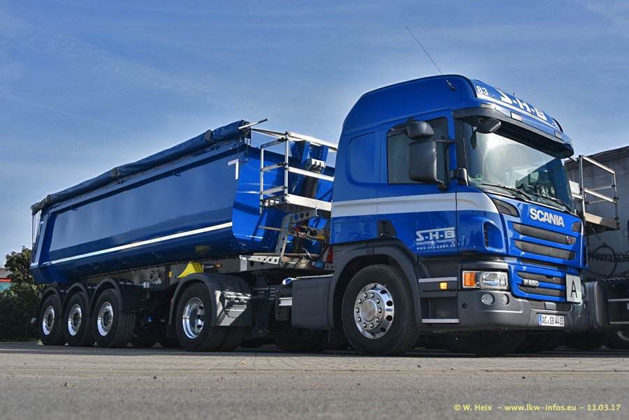 In den letzten Wochen hat SHB insgesamt sechs neue Sattelzugmaschinen von Scania bekommen. Die ersten beiden kamen Anfang März (siehe Bilder Teil 2) und am Freitag (10.03) wurde Nummer 6 bei der Scania-Niederlassung in Würselen in Empfang genommen. Somit hat S-H-B jetzt vier neue Scania G 450 Streamline und zwei neue Scania P 450. Die weiteren Bilder zeigen nochmal den großen Rest vom Fuhrpark, diesmal bei vorfrühlingshaft schönem sonnigen Wetter.