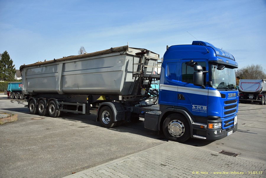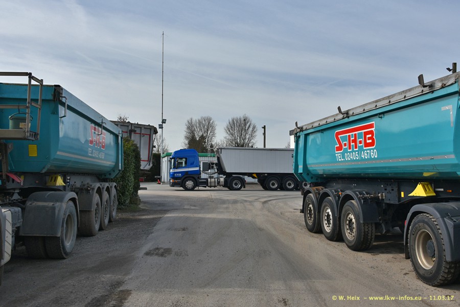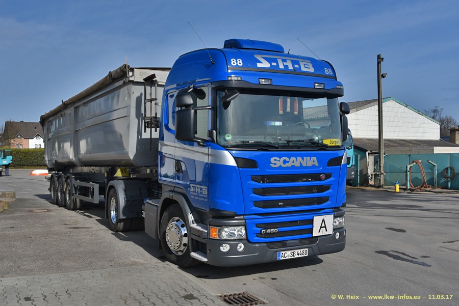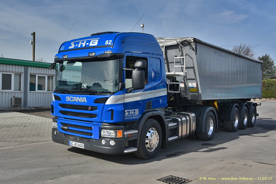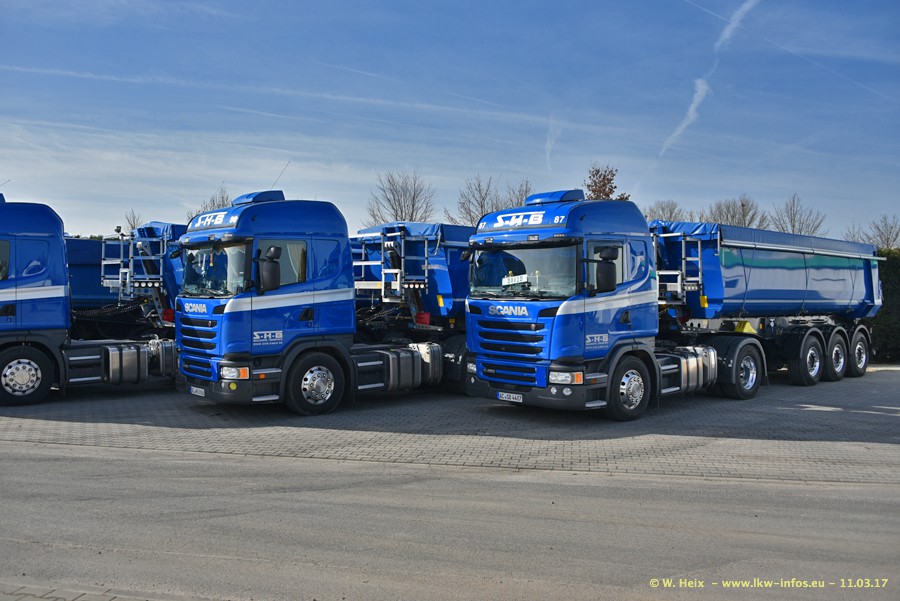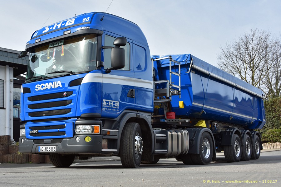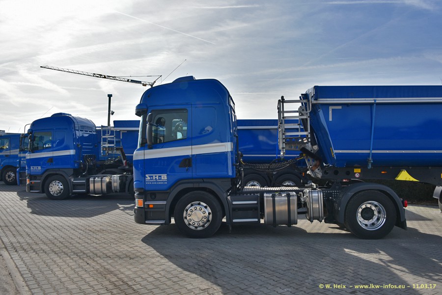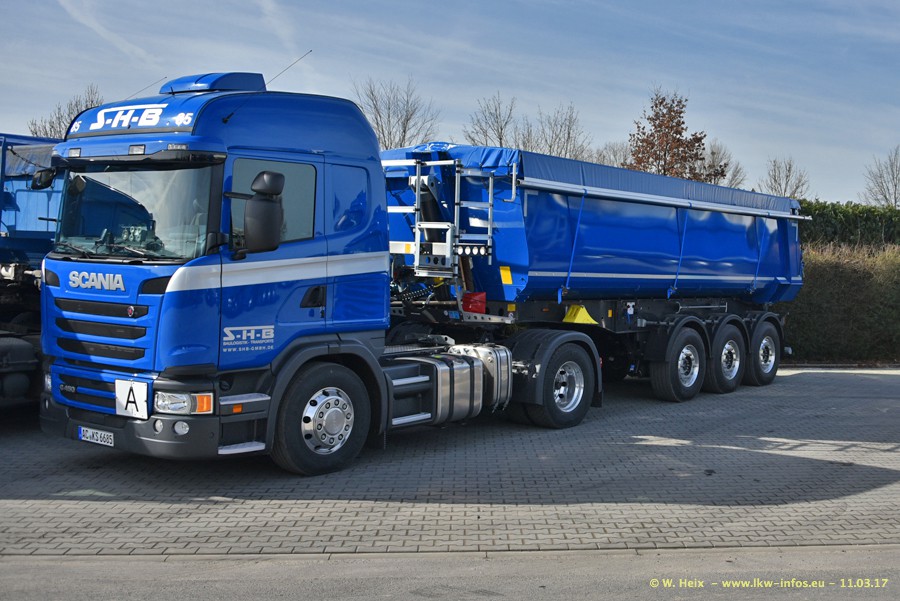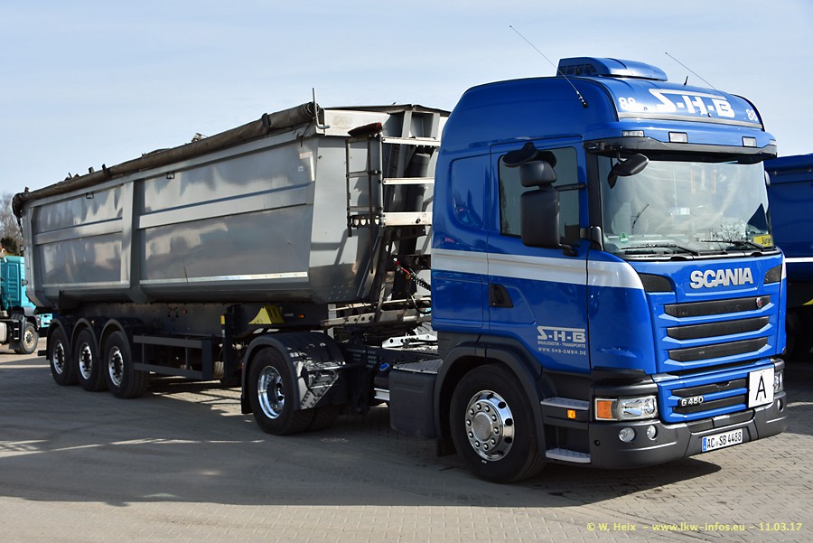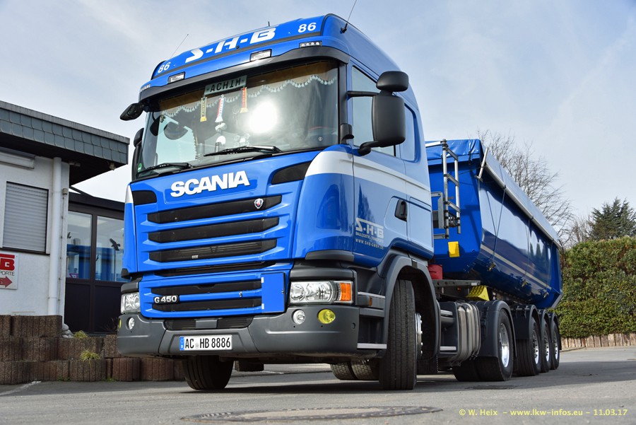 In den letzten Wochen hat SHB insgesamt sechs neue Sattelzugmaschinen von Scania bekommen. Die ersten beiden kamen Anfang März (siehe Bilder Teil 2) und am Freitag (10.03) wurde Nummer 6 bei der Scania-Niederlassung in Würselen in Empfang genommen. Somit hat S-H-B jetzt vier neue Scania G 450 Streamline und zwei neue Scania P 450. Die weiteren Bilder zeigen nochmal den großen Rest vom Fuhrpark, diesmal bei vorfrühlingshaft schönem sonnigen Wetter.