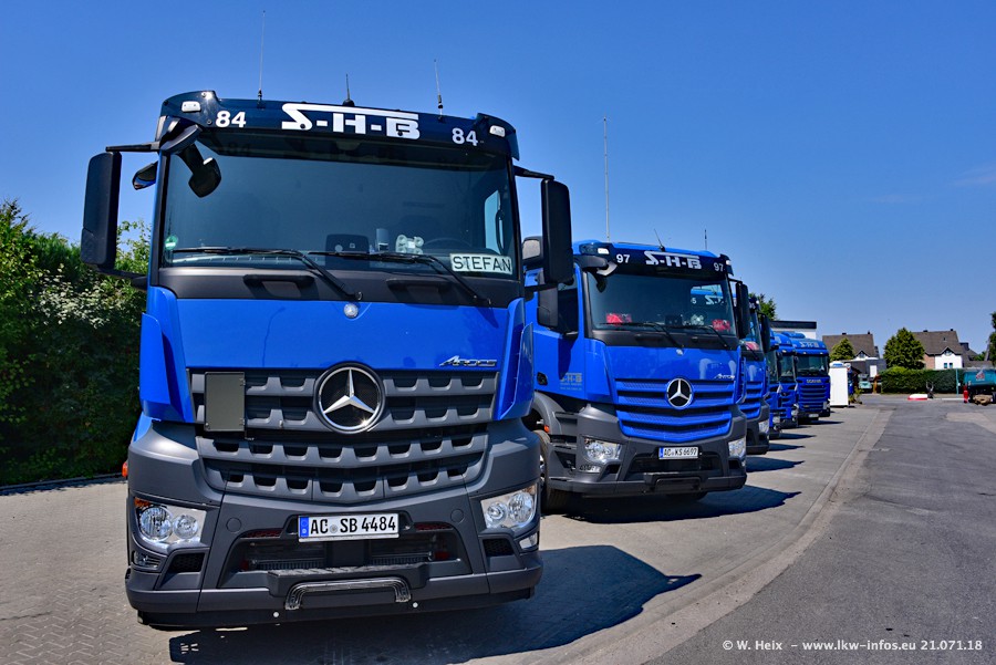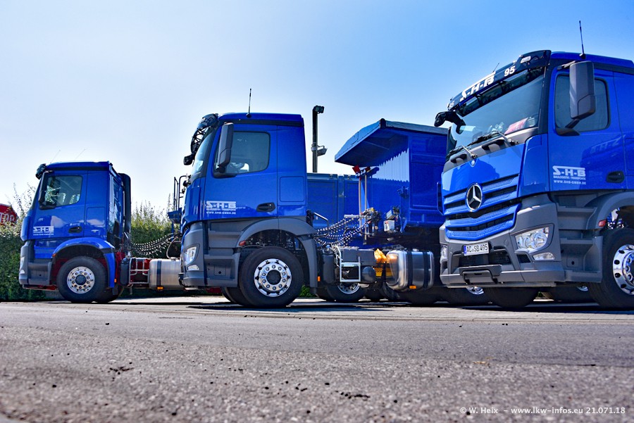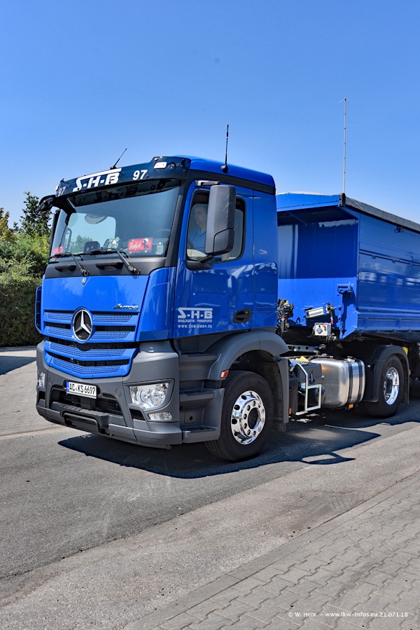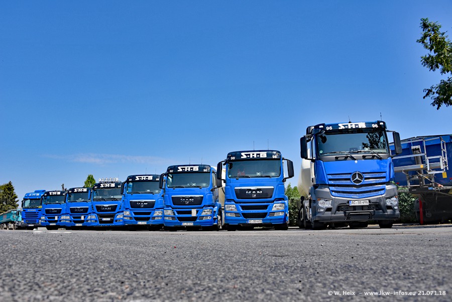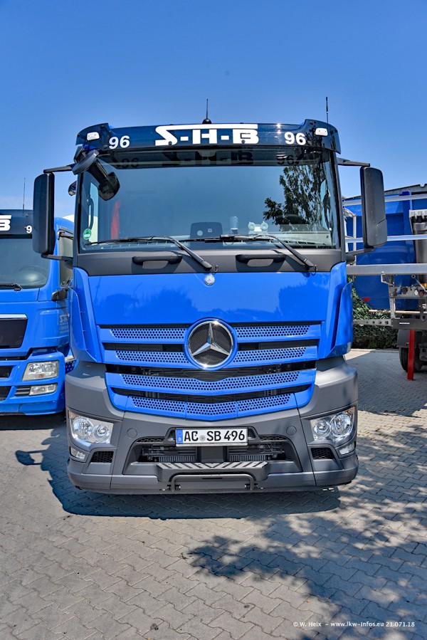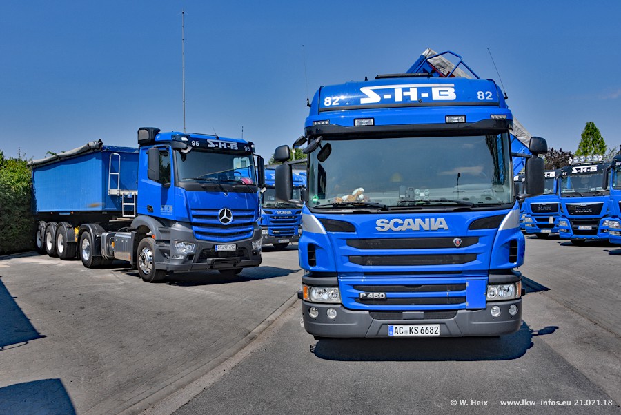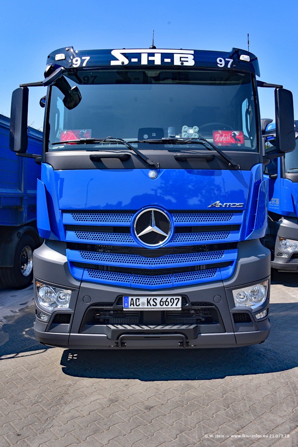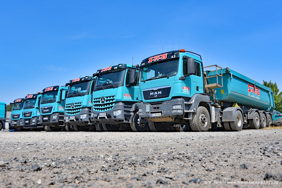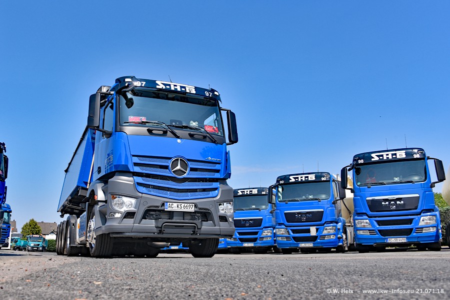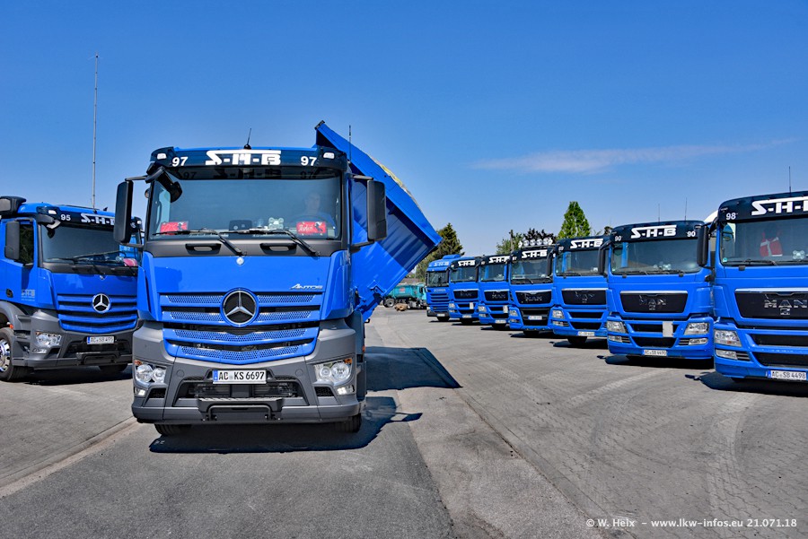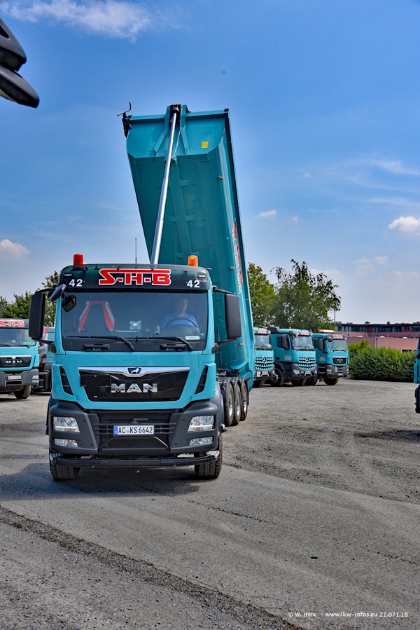 Seit meinem letzten Besuch bei SHB im März 2017 sind so einige neue LKW gekommen, die den Furhpark modernisieren bzw. alte Fahrzeuge ersetzt haben. Das sind bei den dunkelblauen LKW alle Mercedes-Benz Arocs/Antos/Actros. Passend dazu gibt es auch mehrere neue Kippauflieger. Bei den hellblauen LKW gibt es einige neue MAN TGX Euro 6 der aktuellen Generation und ab Montag (23.07.) wird ein Mercedes-Benz Arocs 8x4 auf der Straße sein. Der Fuhrpark war fast komplett zuhause.