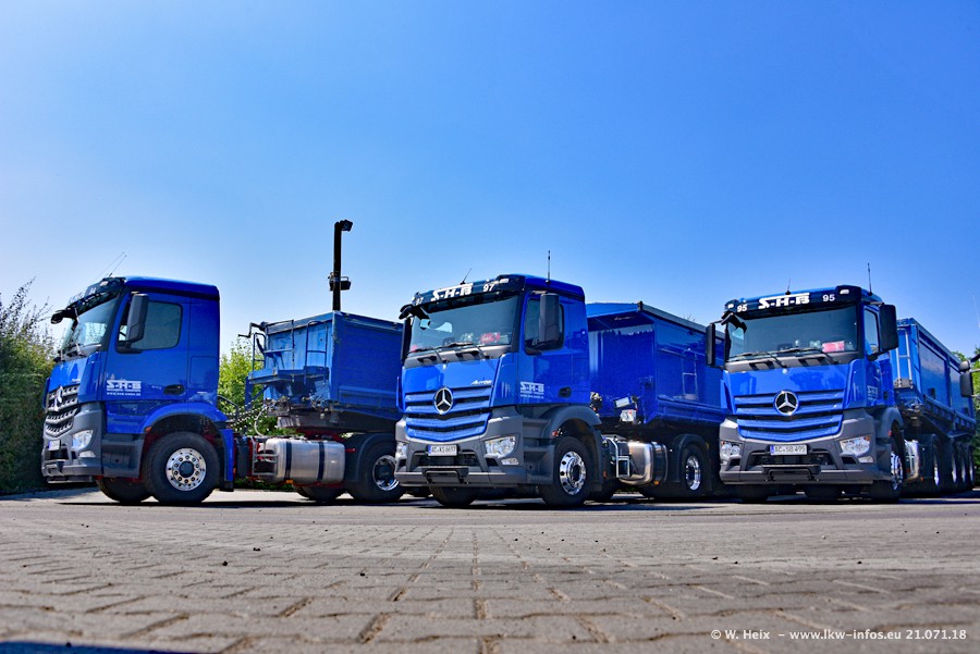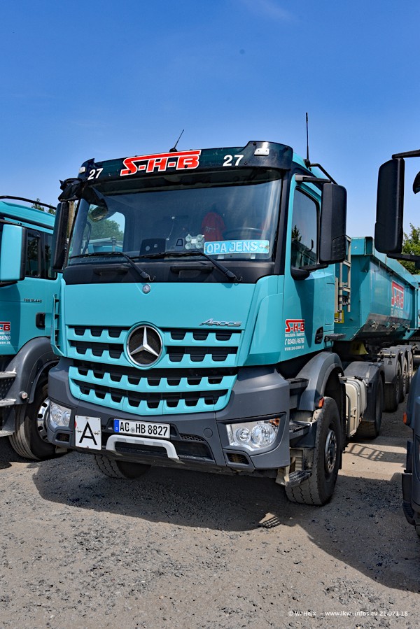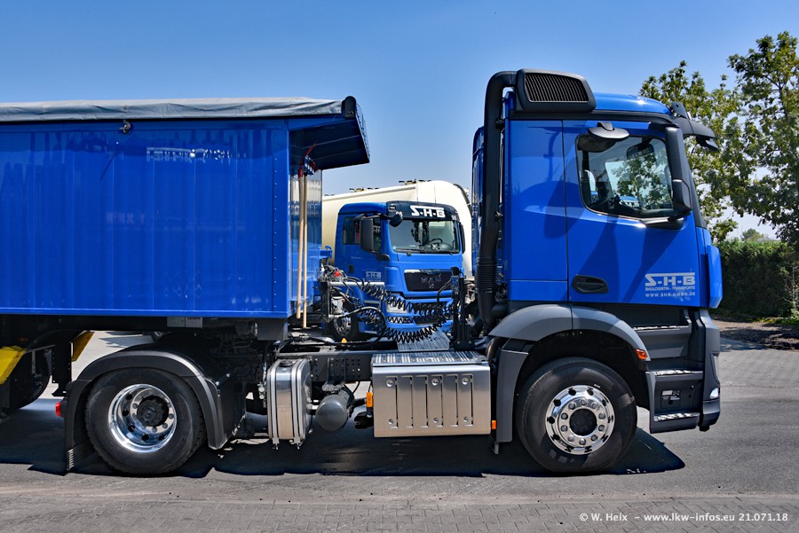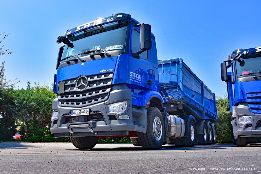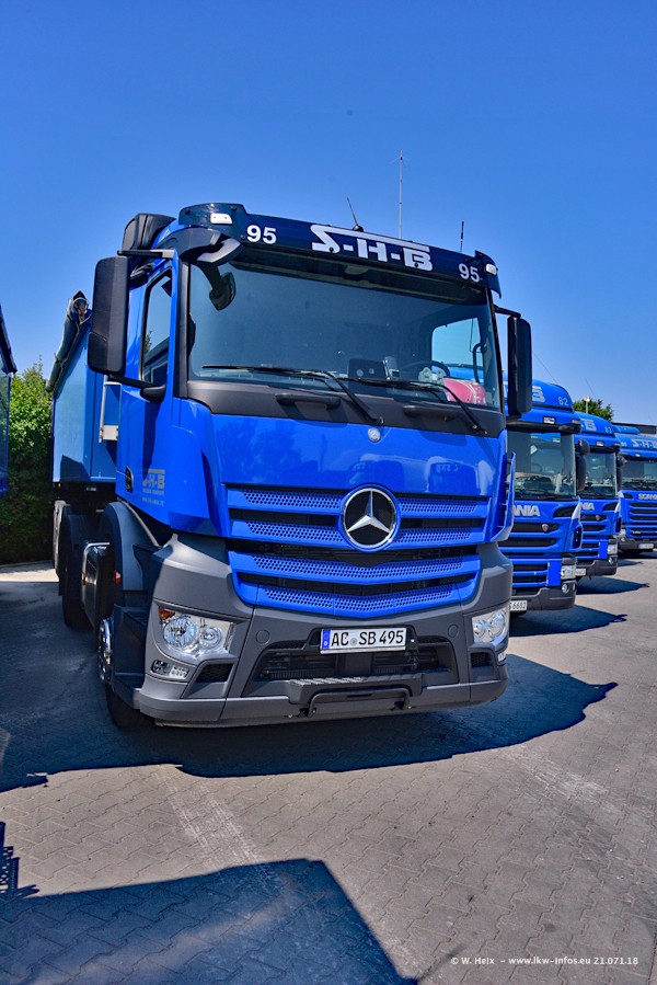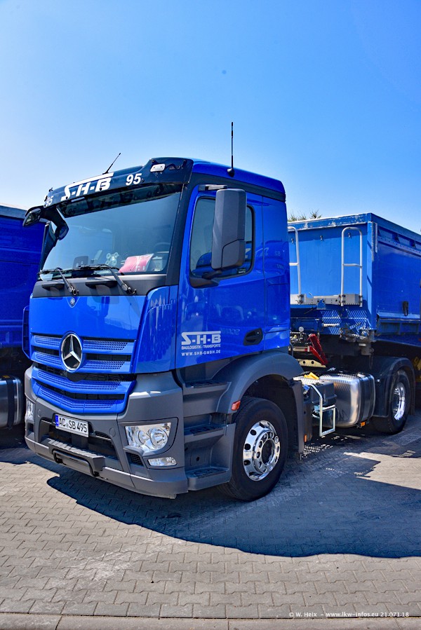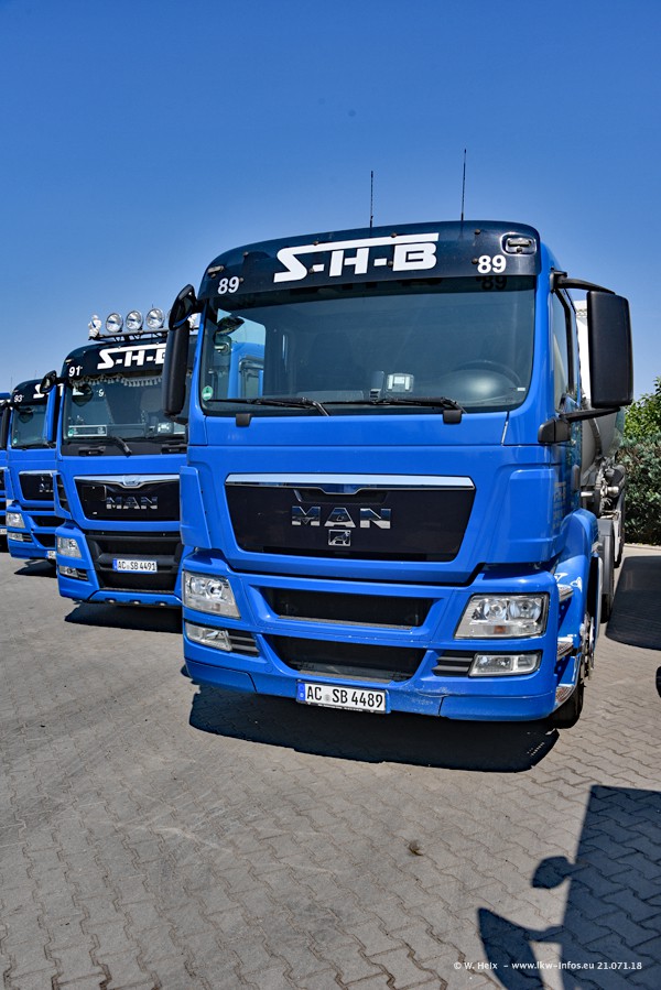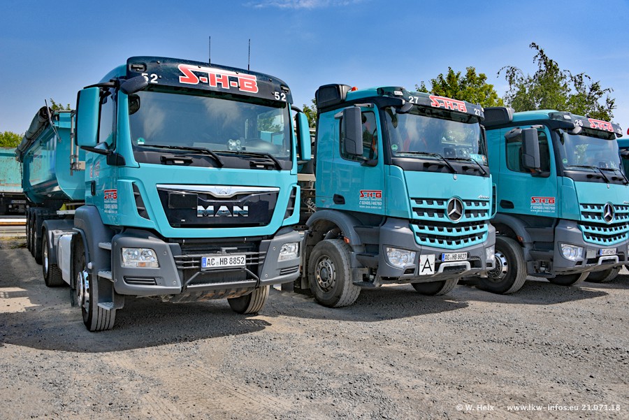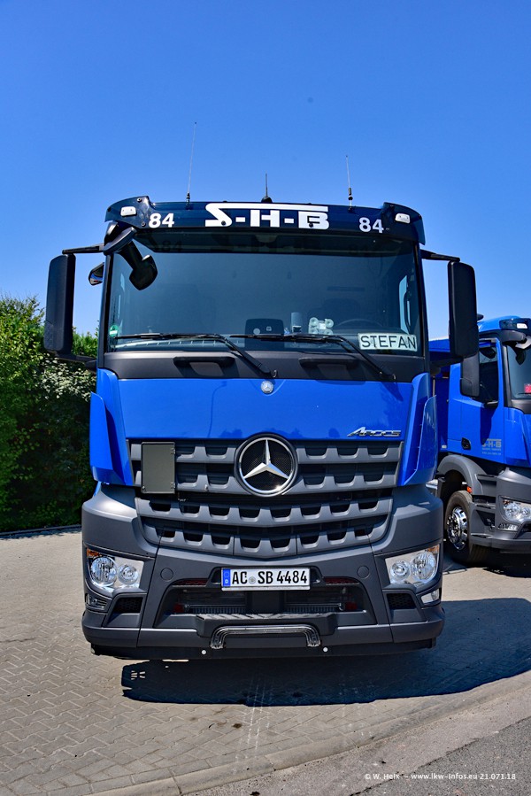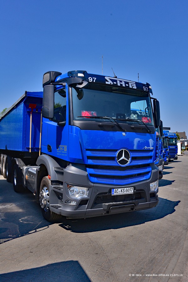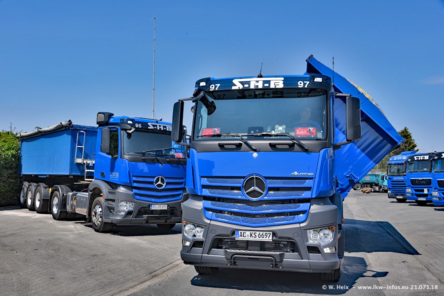 Seit meinem letzten Besuch bei SHB im März 2017 sind so einige neue LKW gekommen, die den Furhpark modernisieren bzw. alte Fahrzeuge ersetzt haben. Das sind bei den dunkelblauen LKW alle Mercedes-Benz Arocs/Antos/Actros. Passend dazu gibt es auch mehrere neue Kippauflieger. Bei den hellblauen LKW gibt es einige neue MAN TGX Euro 6 der aktuellen Generation und ab Montag (23.07.) wird ein Mercedes-Benz Arocs 8x4 auf der Straße sein. Der Fuhrpark war fast komplett zuhause.
