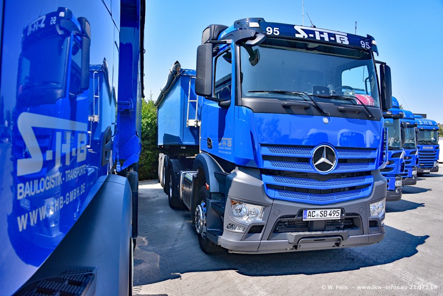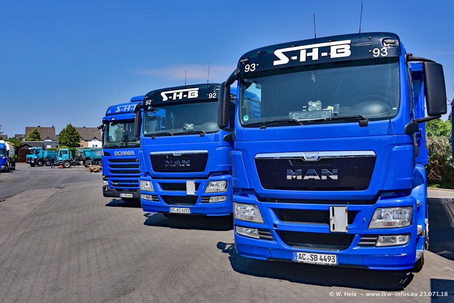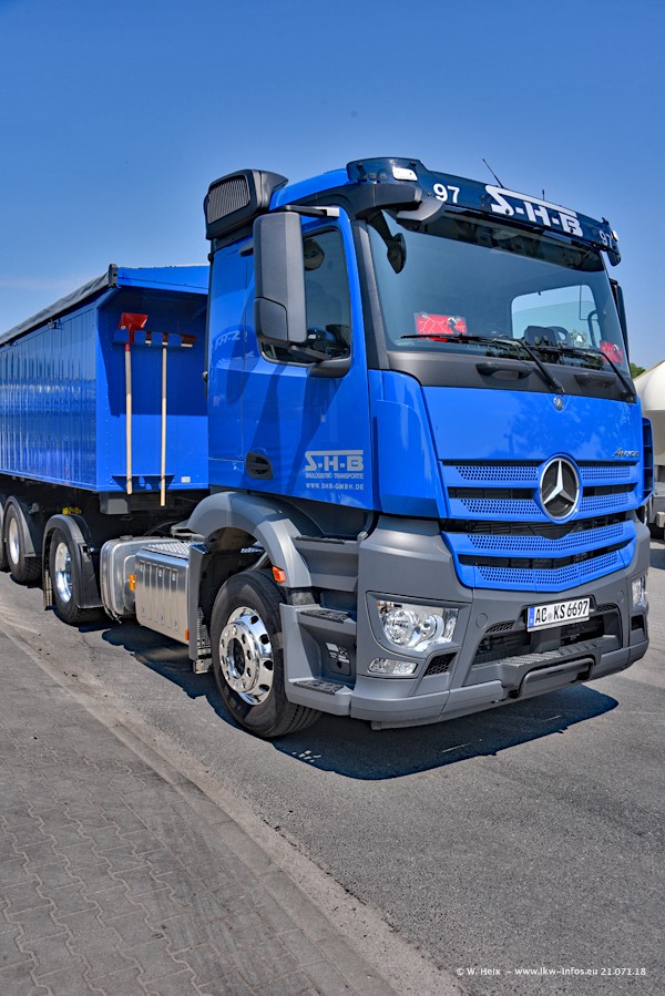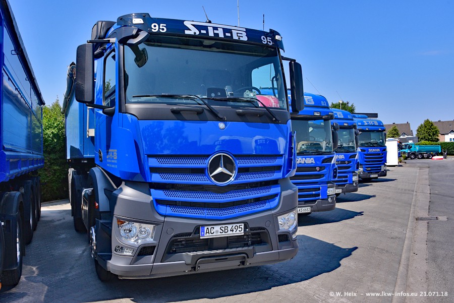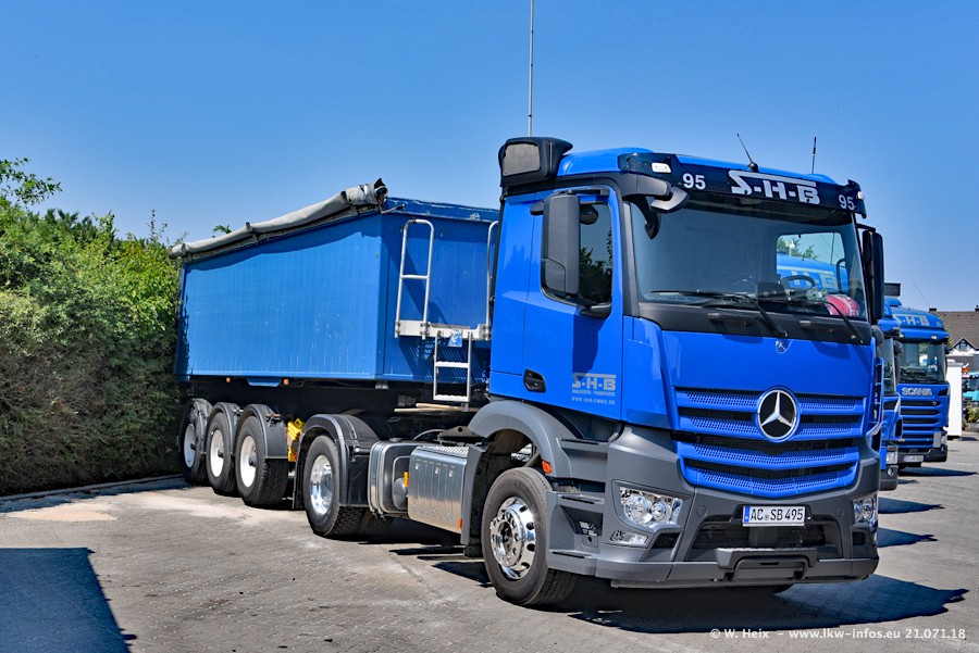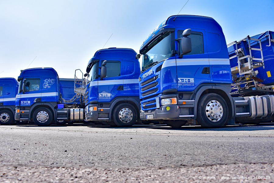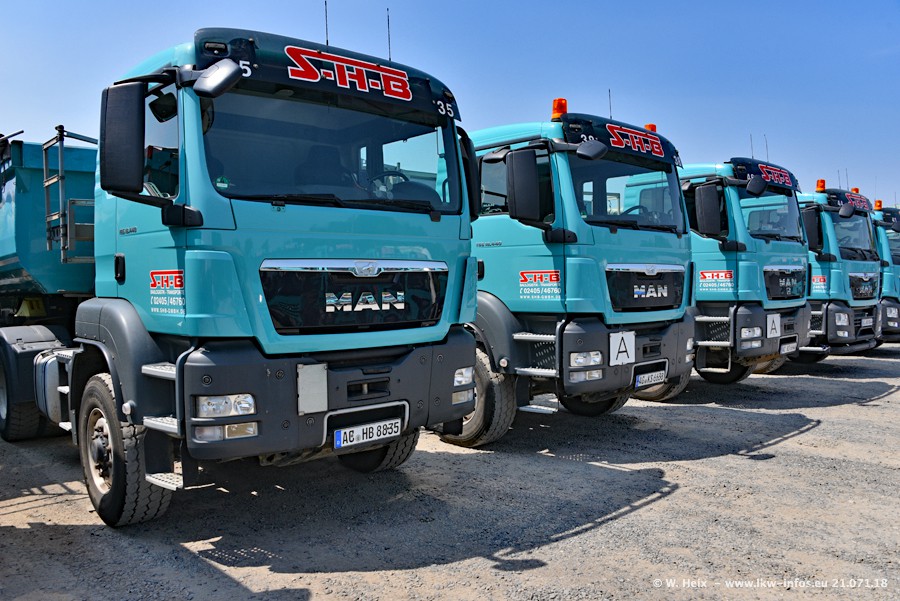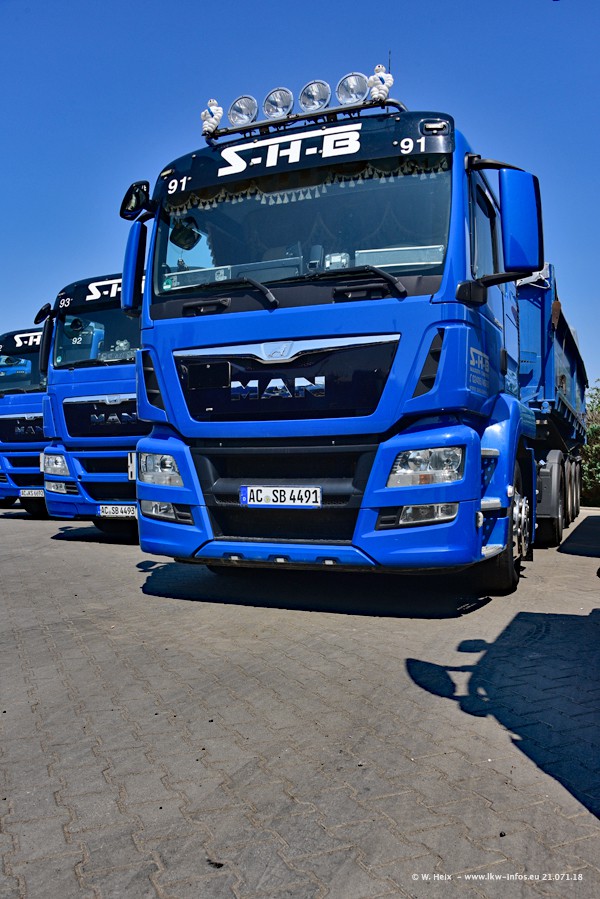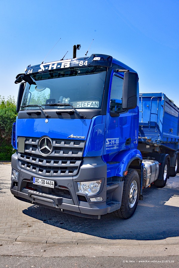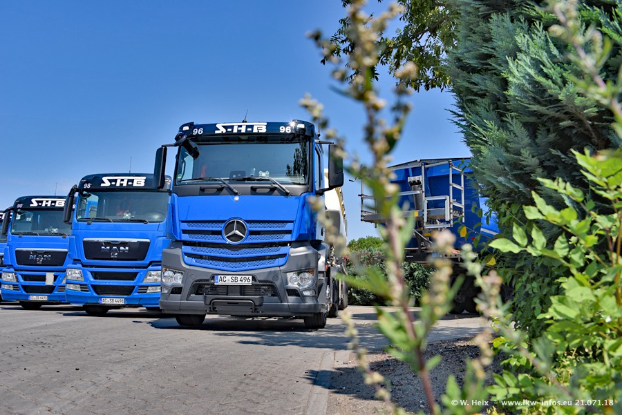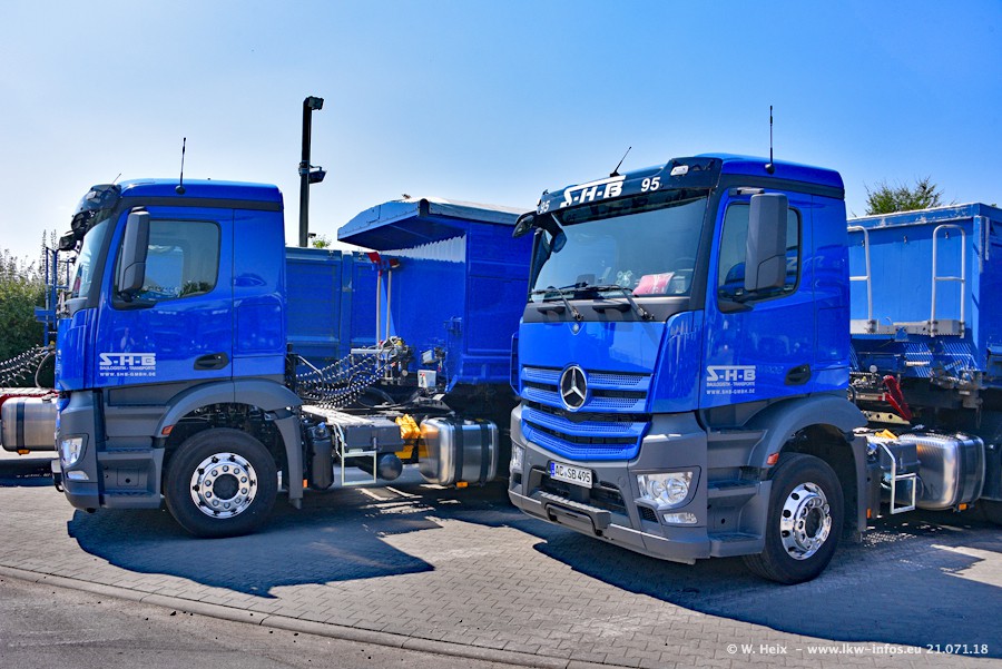 Seit meinem letzten Besuch bei SHB im März 2017 sind so einige neue LKW gekommen, die den Furhpark modernisieren bzw. alte Fahrzeuge ersetzt haben. Das sind bei den dunkelblauen LKW alle Mercedes-Benz Arocs/Antos/Actros. Passend dazu gibt es auch mehrere neue Kippauflieger. Bei den hellblauen LKW gibt es einige neue MAN TGX Euro 6 der aktuellen Generation und ab Montag (23.07.) wird ein Mercedes-Benz Arocs 8x4 auf der Straße sein. Der Fuhrpark war fast komplett zuhause.