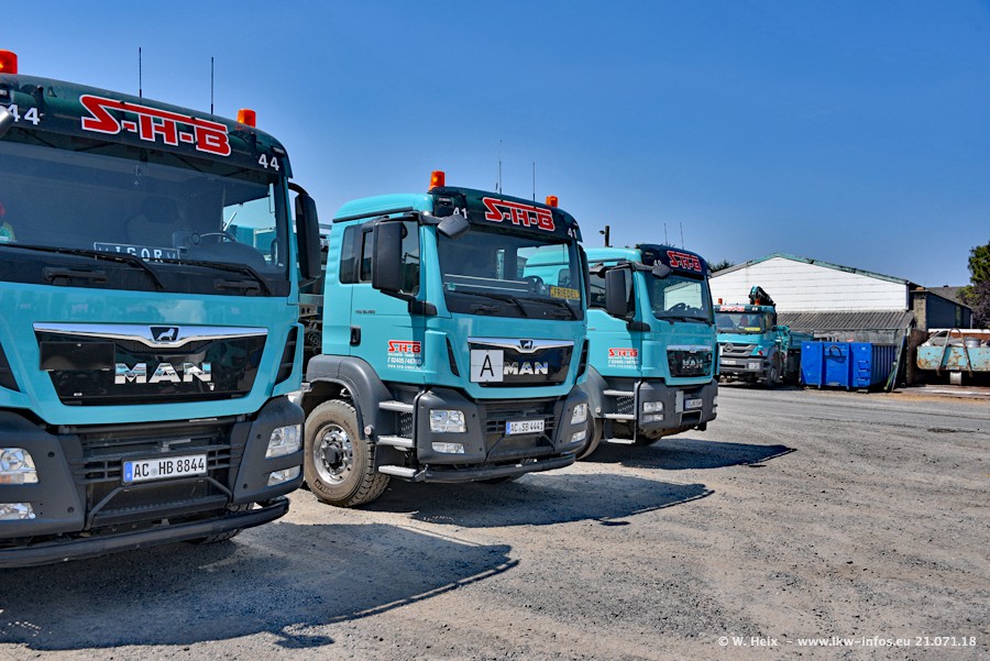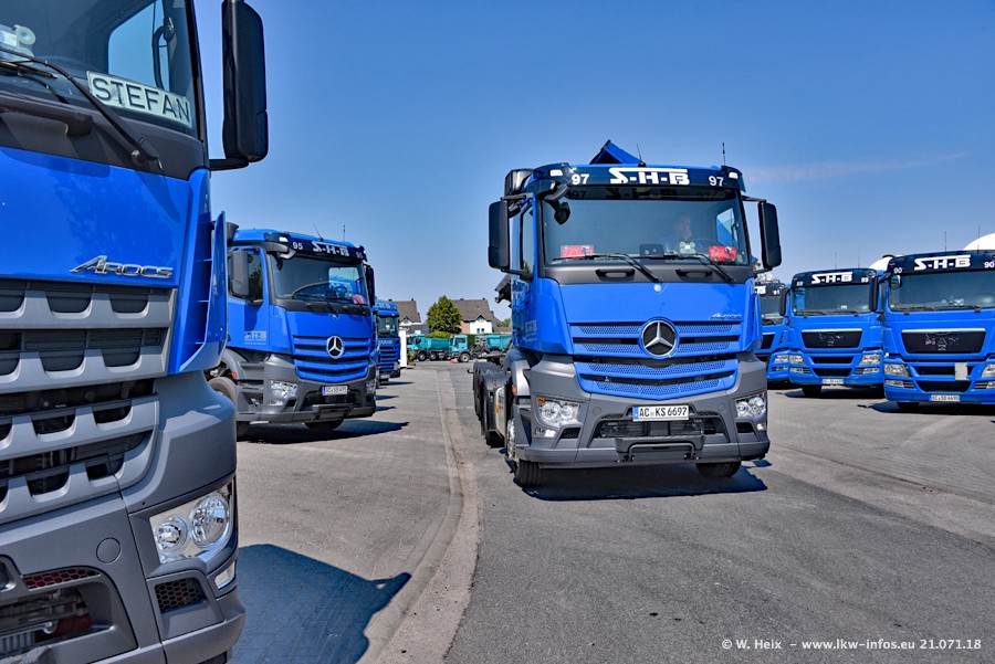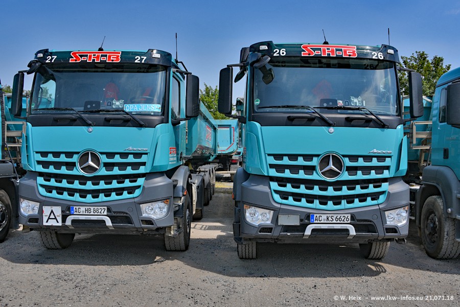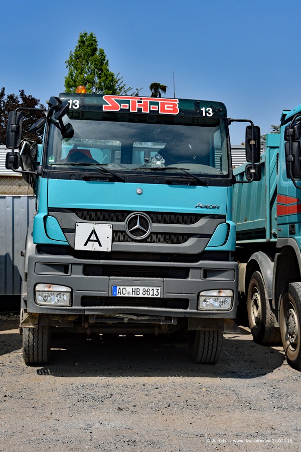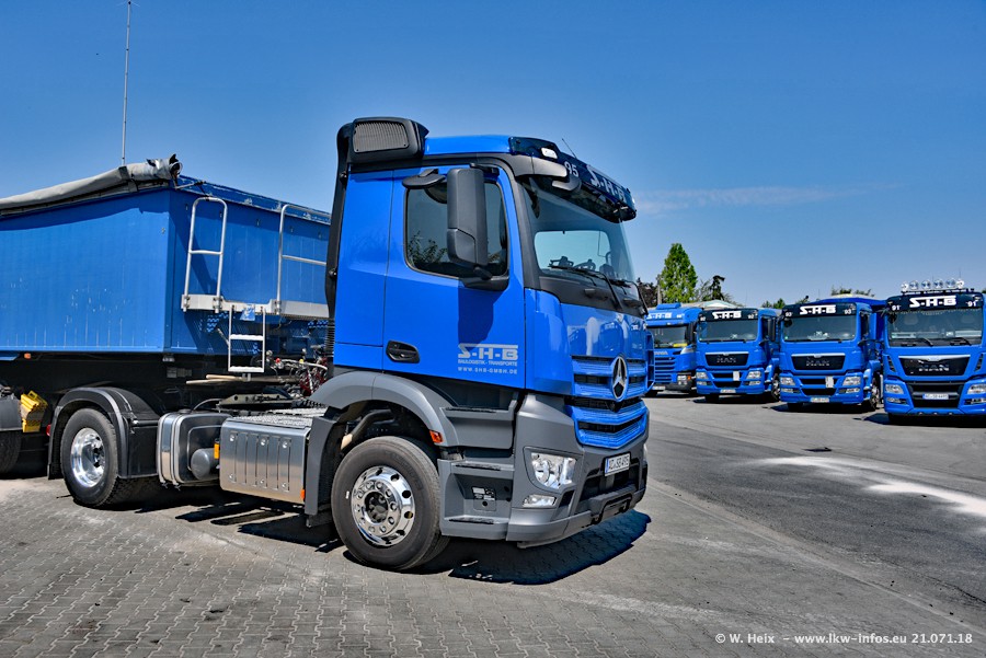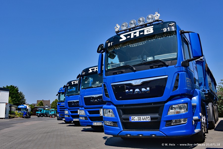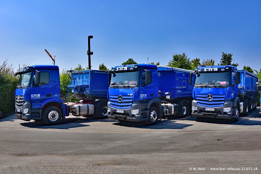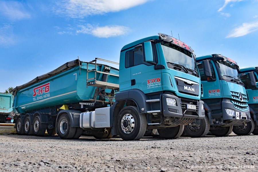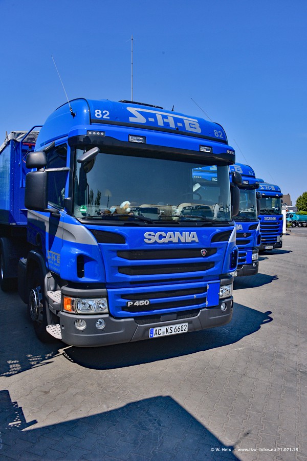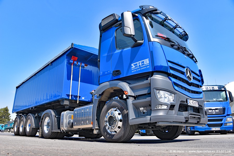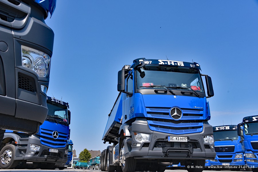 Seit meinem letzten Besuch bei SHB im März 2017 sind so einige neue LKW gekommen, die den Furhpark modernisieren bzw. alte Fahrzeuge ersetzt haben. Das sind bei den dunkelblauen LKW alle Mercedes-Benz Arocs/Antos/Actros. Passend dazu gibt es auch mehrere neue Kippauflieger. Bei den hellblauen LKW gibt es einige neue MAN TGX Euro 6 der aktuellen Generation und ab Montag (23.07.) wird ein Mercedes-Benz Arocs 8x4 auf der Straße sein. Der Fuhrpark war fast komplett zuhause.