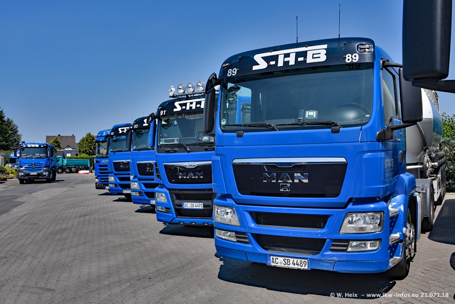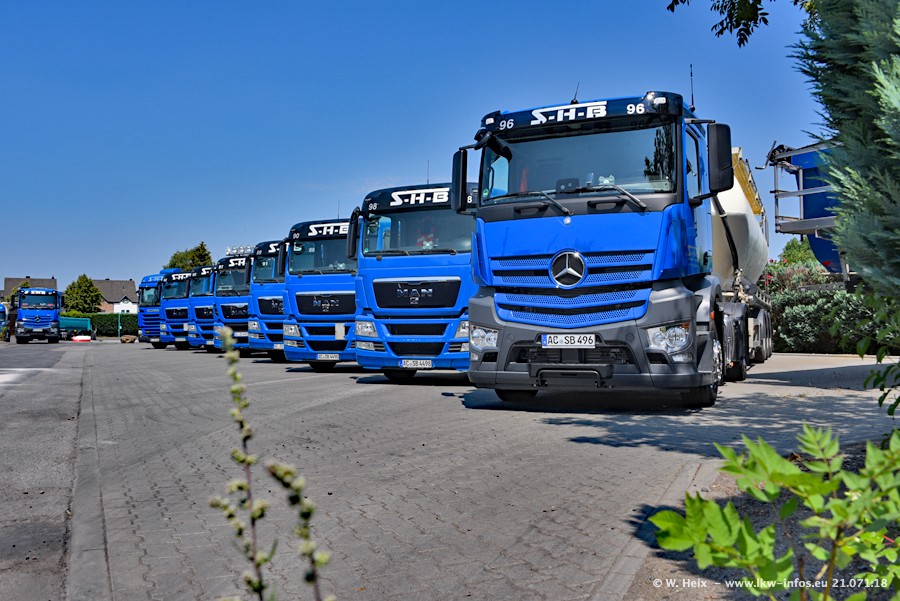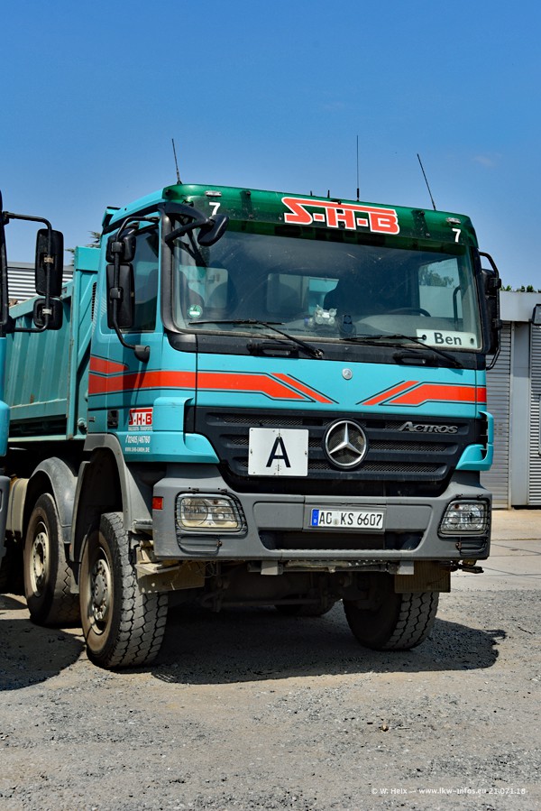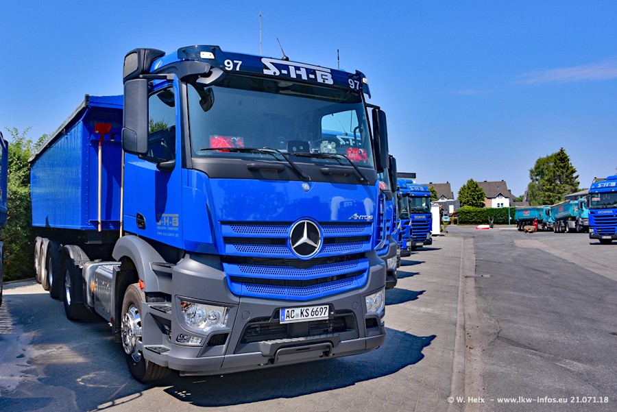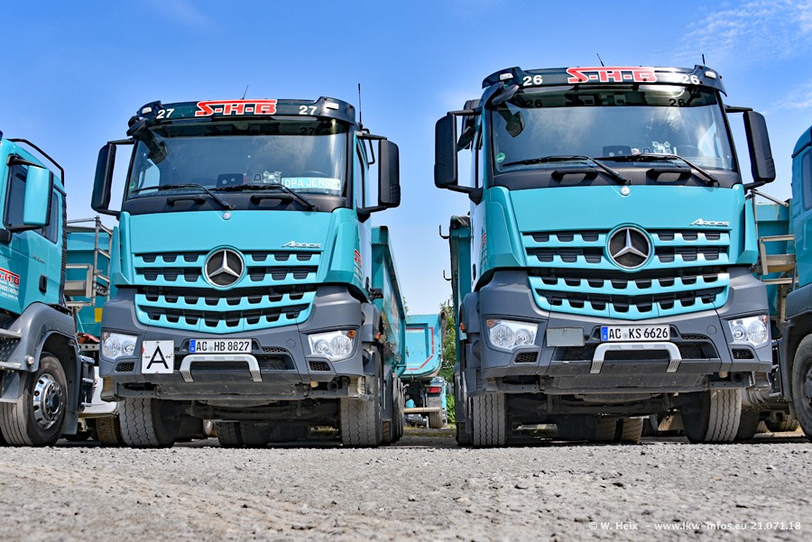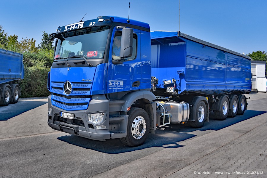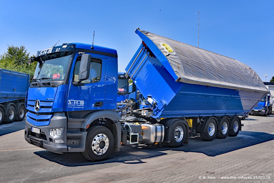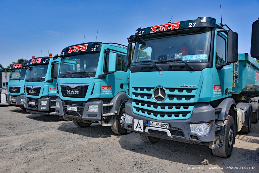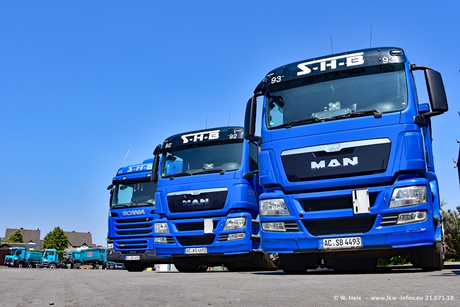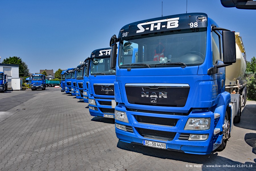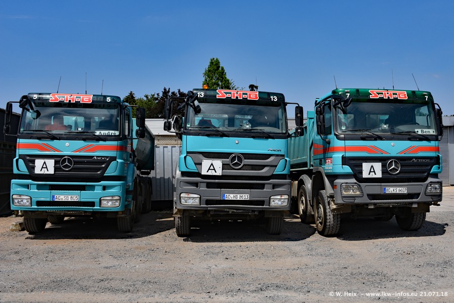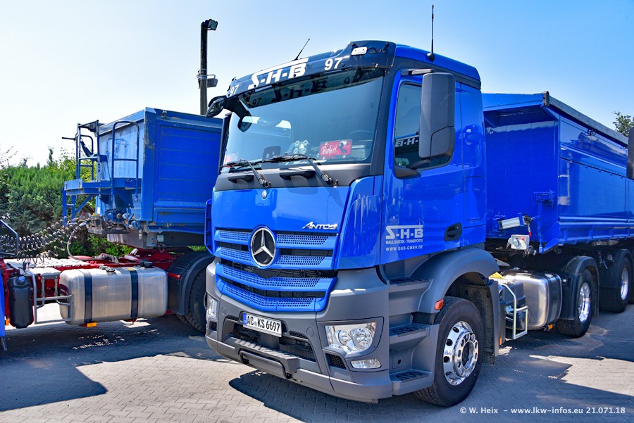 Seit meinem letzten Besuch bei SHB im März 2017 sind so einige neue LKW gekommen, die den Furhpark modernisieren bzw. alte Fahrzeuge ersetzt haben. Das sind bei den dunkelblauen LKW alle Mercedes-Benz Arocs/Antos/Actros. Passend dazu gibt es auch mehrere neue Kippauflieger. Bei den hellblauen LKW gibt es einige neue MAN TGX Euro 6 der aktuellen Generation und ab Montag (23.07.) wird ein Mercedes-Benz Arocs 8x4 auf der Straße sein. Der Fuhrpark war fast komplett zuhause.