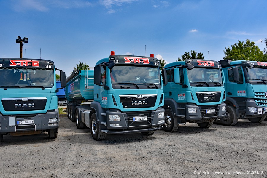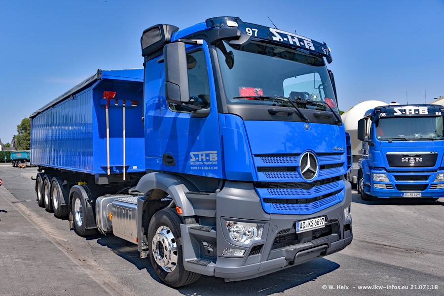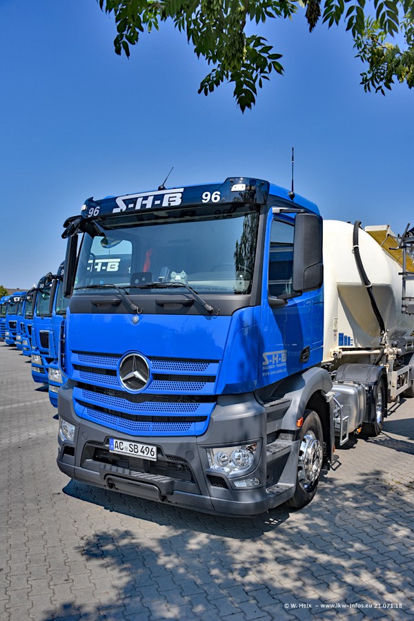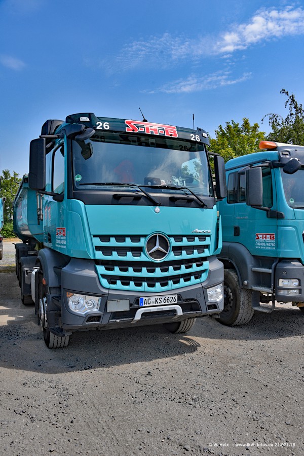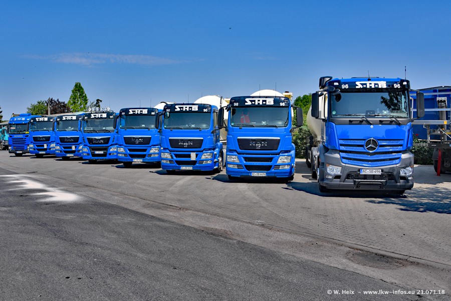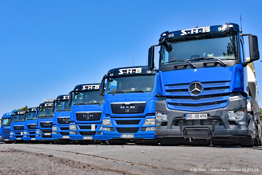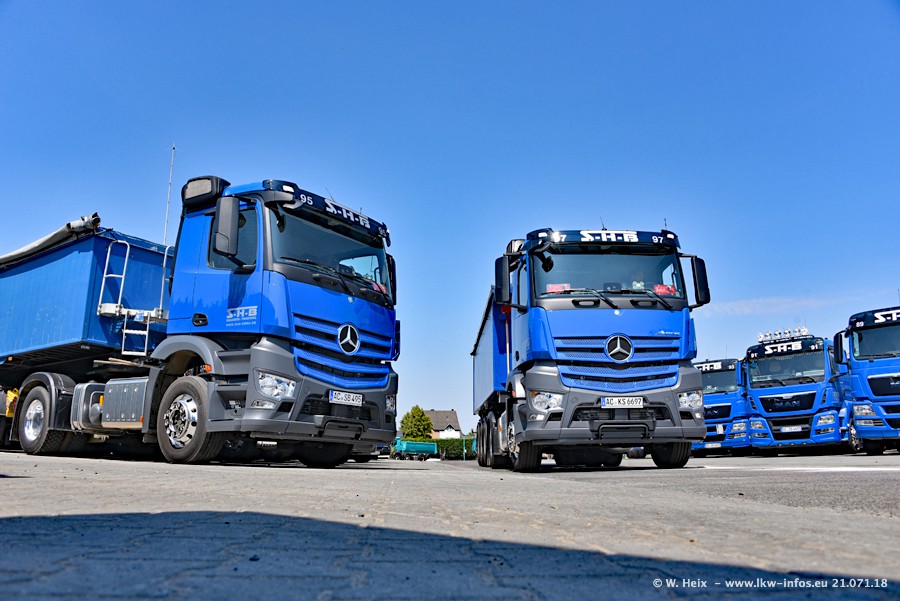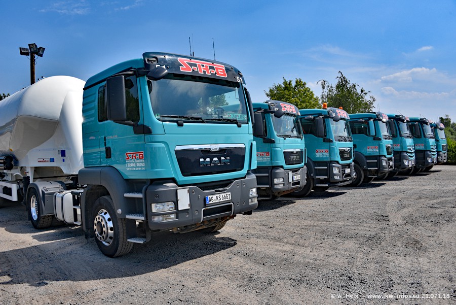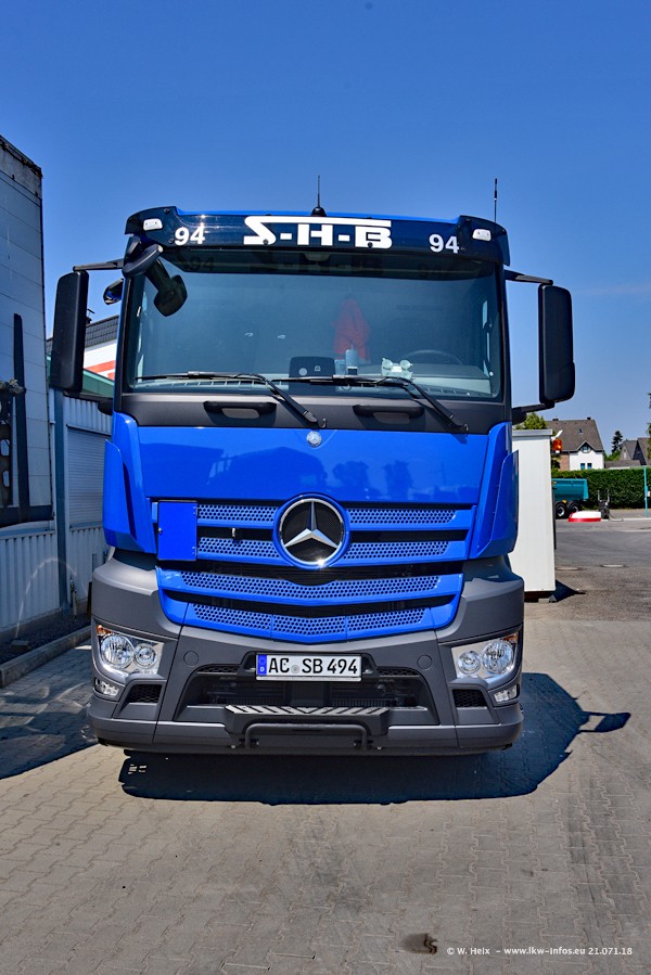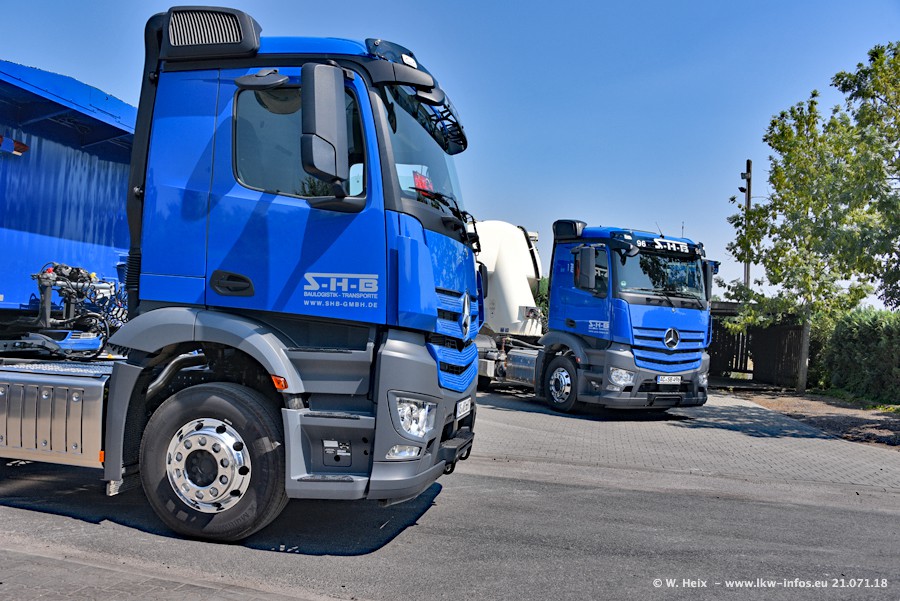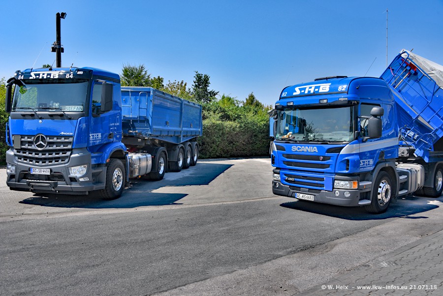 Seit meinem letzten Besuch bei SHB im März 2017 sind so einige neue LKW gekommen, die den Furhpark modernisieren bzw. alte Fahrzeuge ersetzt haben. Das sind bei den dunkelblauen LKW alle Mercedes-Benz Arocs/Antos/Actros. Passend dazu gibt es auch mehrere neue Kippauflieger. Bei den hellblauen LKW gibt es einige neue MAN TGX Euro 6 der aktuellen Generation und ab Montag (23.07.) wird ein Mercedes-Benz Arocs 8x4 auf der Straße sein. Der Fuhrpark war fast komplett zuhause.