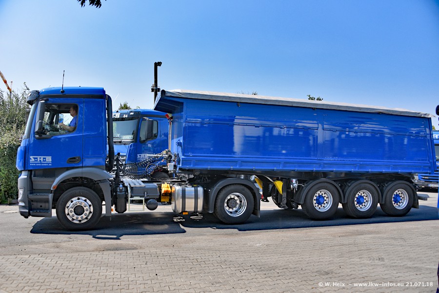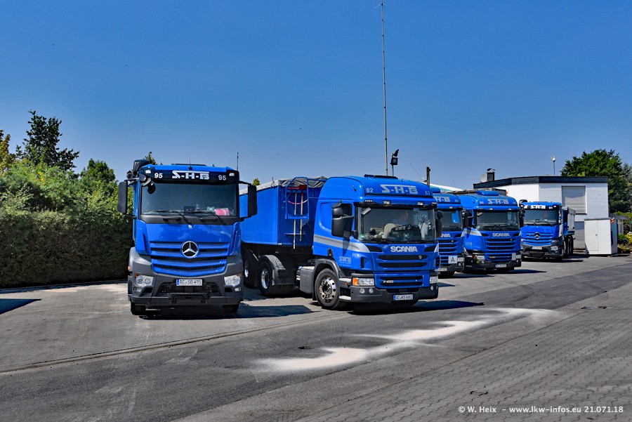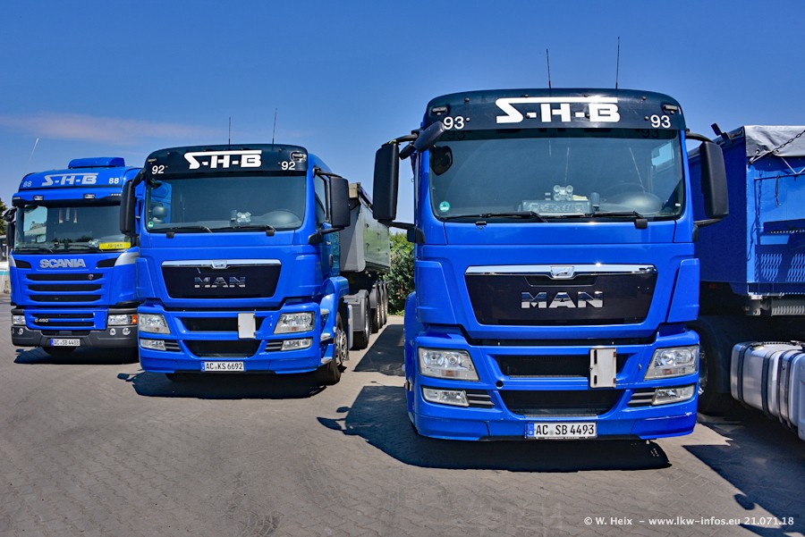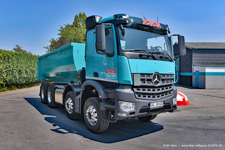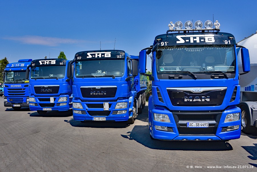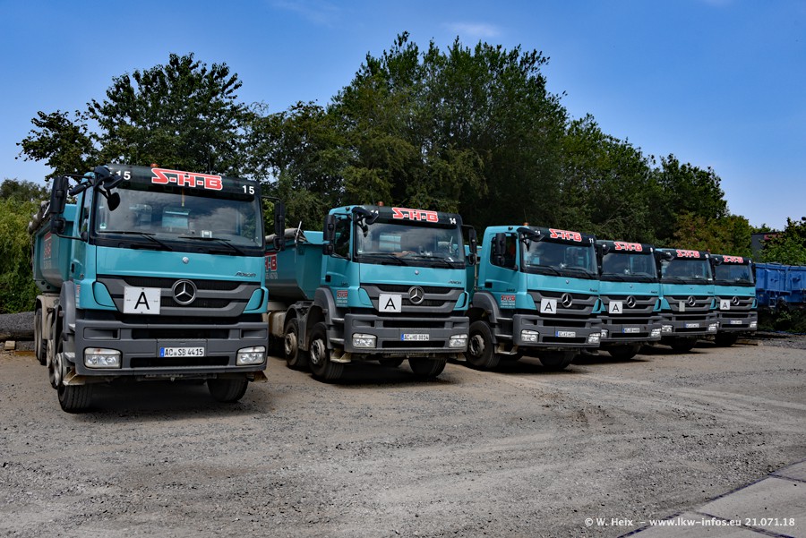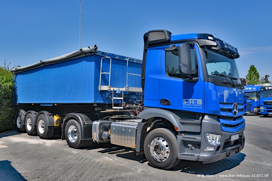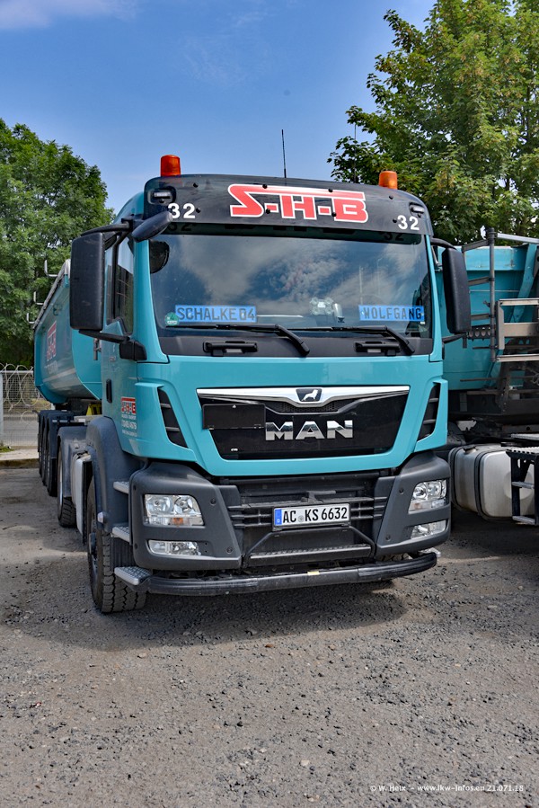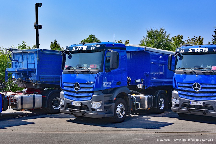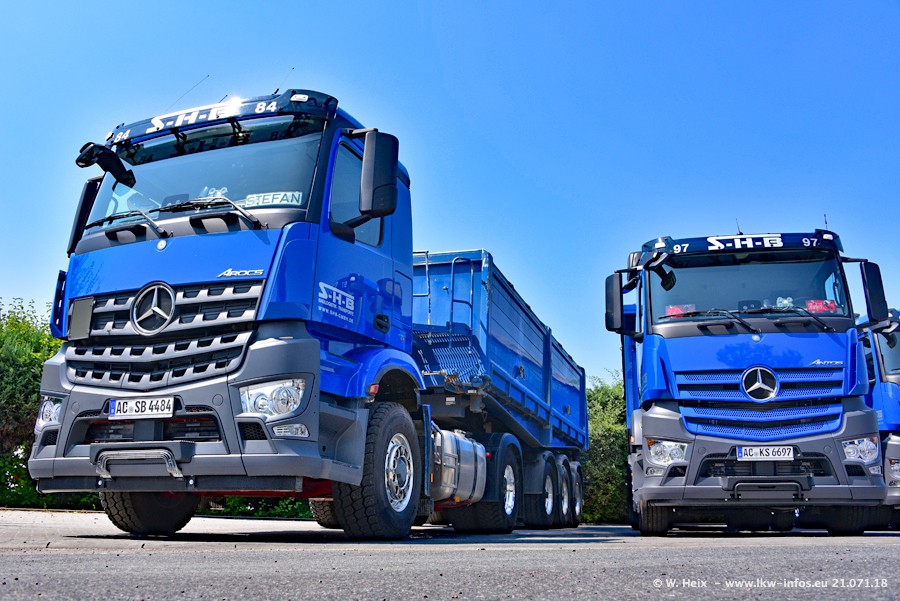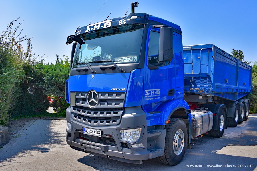 Seit meinem letzten Besuch bei SHB im März 2017 sind so einige neue LKW gekommen, die den Furhpark modernisieren bzw. alte Fahrzeuge ersetzt haben. Das sind bei den dunkelblauen LKW alle Mercedes-Benz Arocs/Antos/Actros. Passend dazu gibt es auch mehrere neue Kippauflieger. Bei den hellblauen LKW gibt es einige neue MAN TGX Euro 6 der aktuellen Generation und ab Montag (23.07.) wird ein Mercedes-Benz Arocs 8x4 auf der Straße sein. Der Fuhrpark war fast komplett zuhause.
