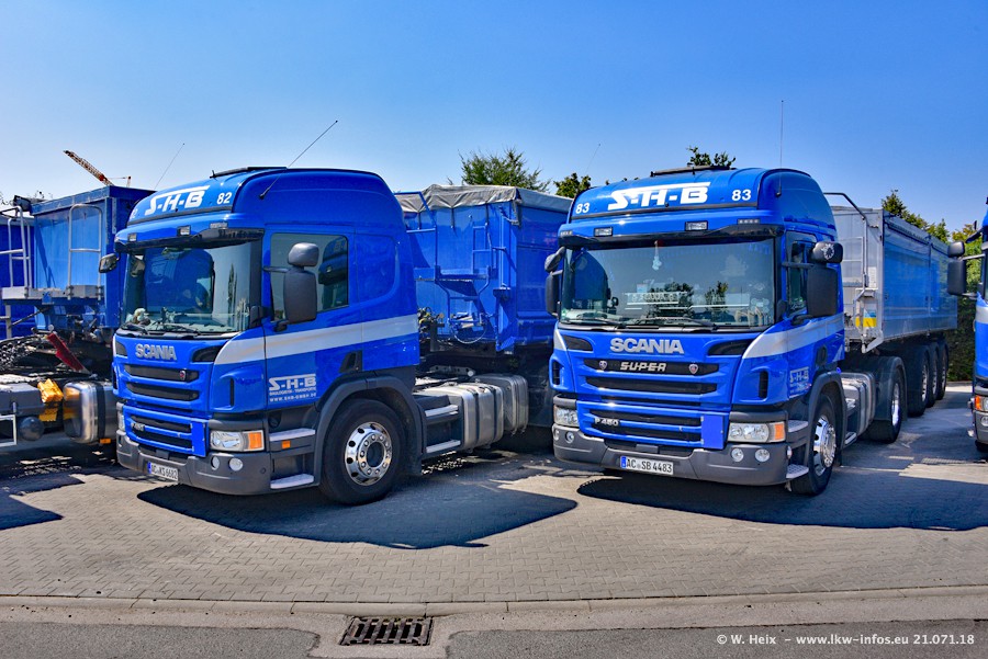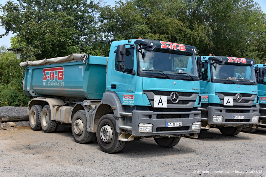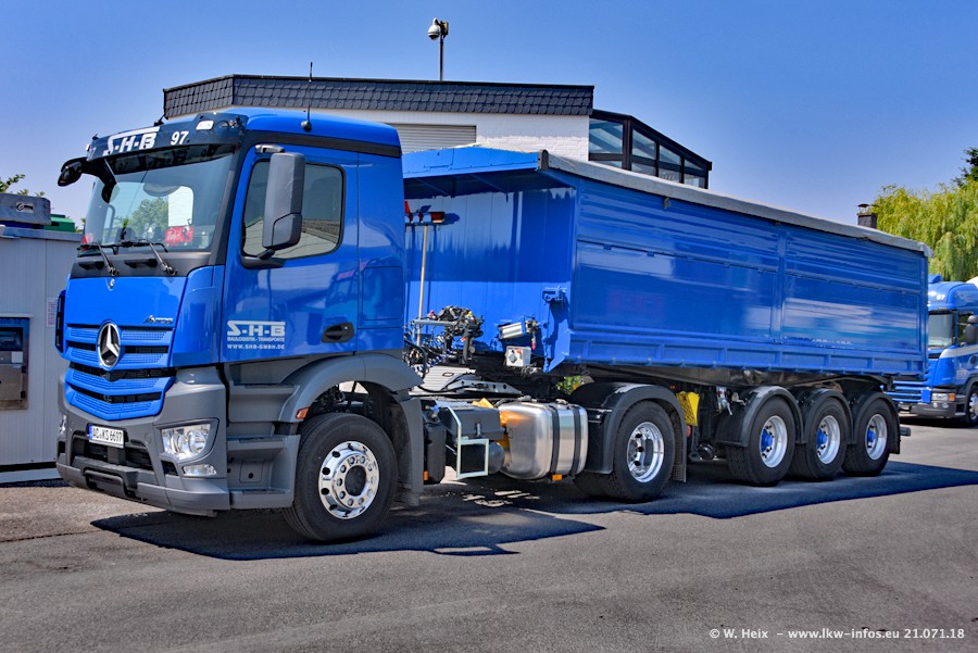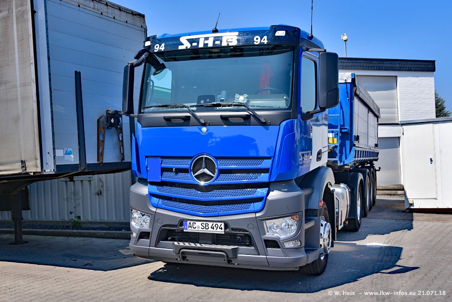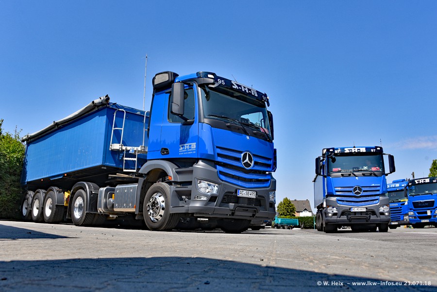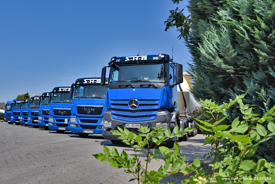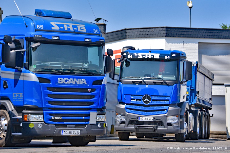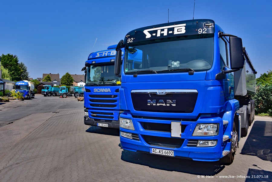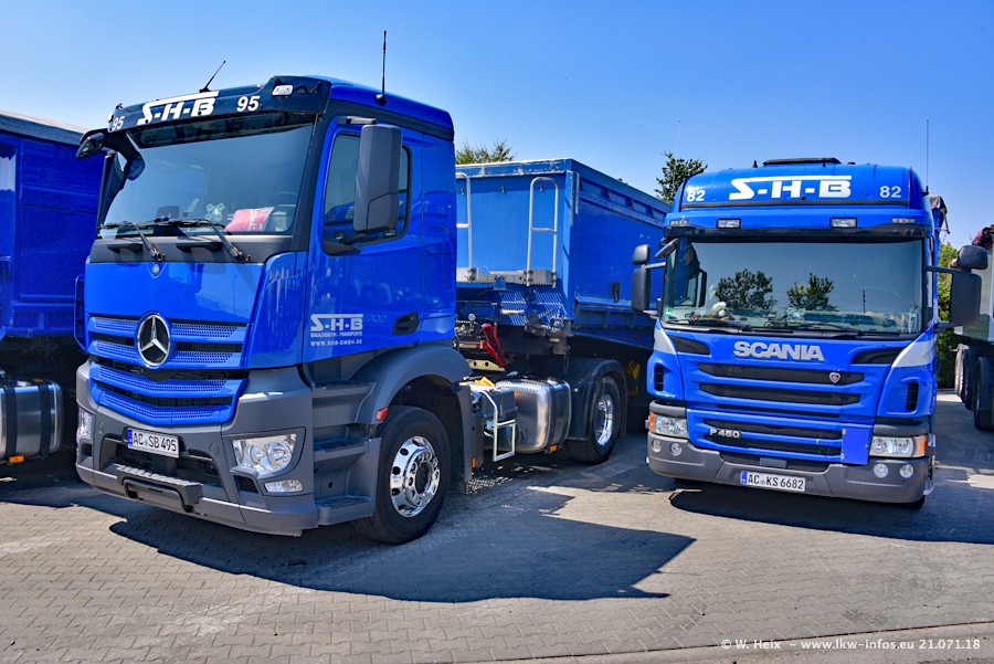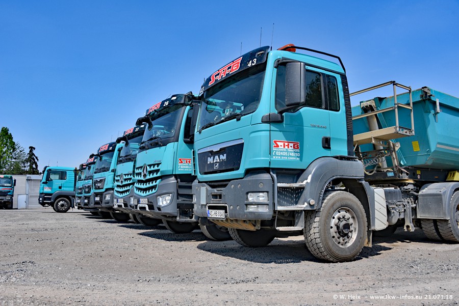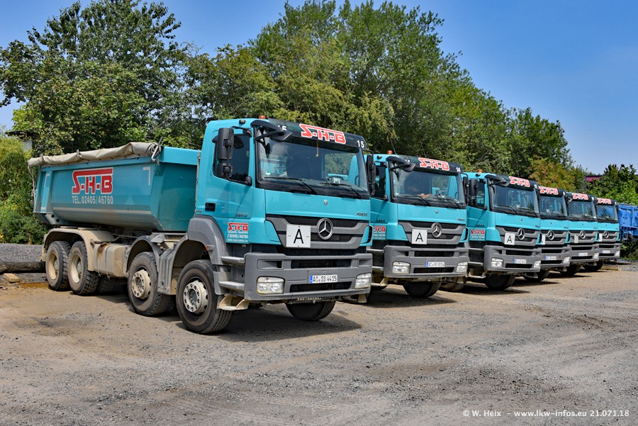 Seit meinem letzten Besuch bei SHB im März 2017 sind so einige neue LKW gekommen, die den Furhpark modernisieren bzw. alte Fahrzeuge ersetzt haben. Das sind bei den dunkelblauen LKW alle Mercedes-Benz Arocs/Antos/Actros. Passend dazu gibt es auch mehrere neue Kippauflieger. Bei den hellblauen LKW gibt es einige neue MAN TGX Euro 6 der aktuellen Generation und ab Montag (23.07.) wird ein Mercedes-Benz Arocs 8x4 auf der Straße sein. Der Fuhrpark war fast komplett zuhause.