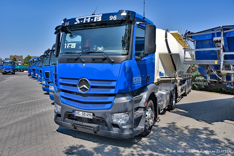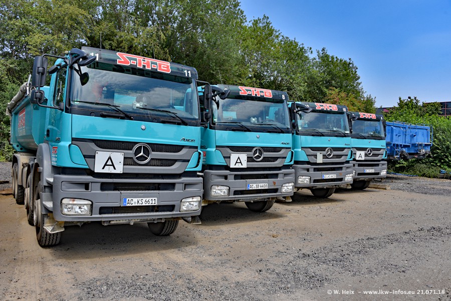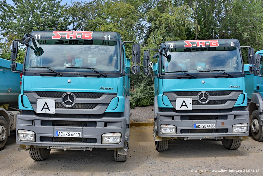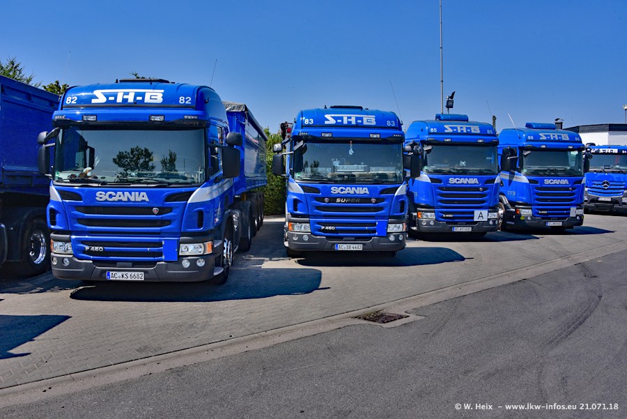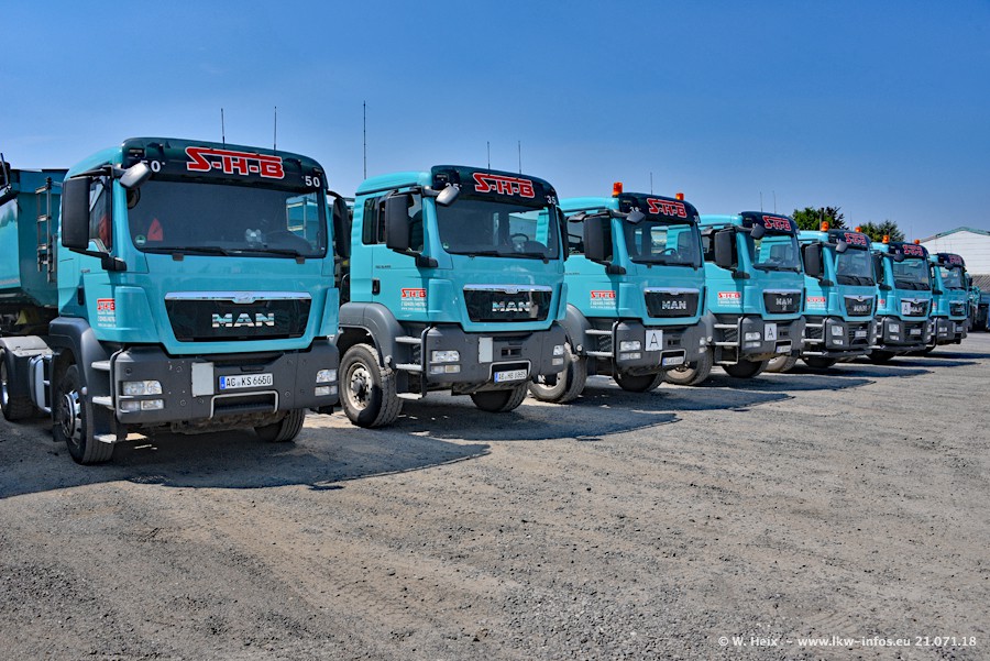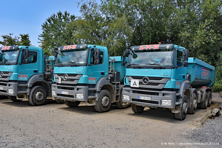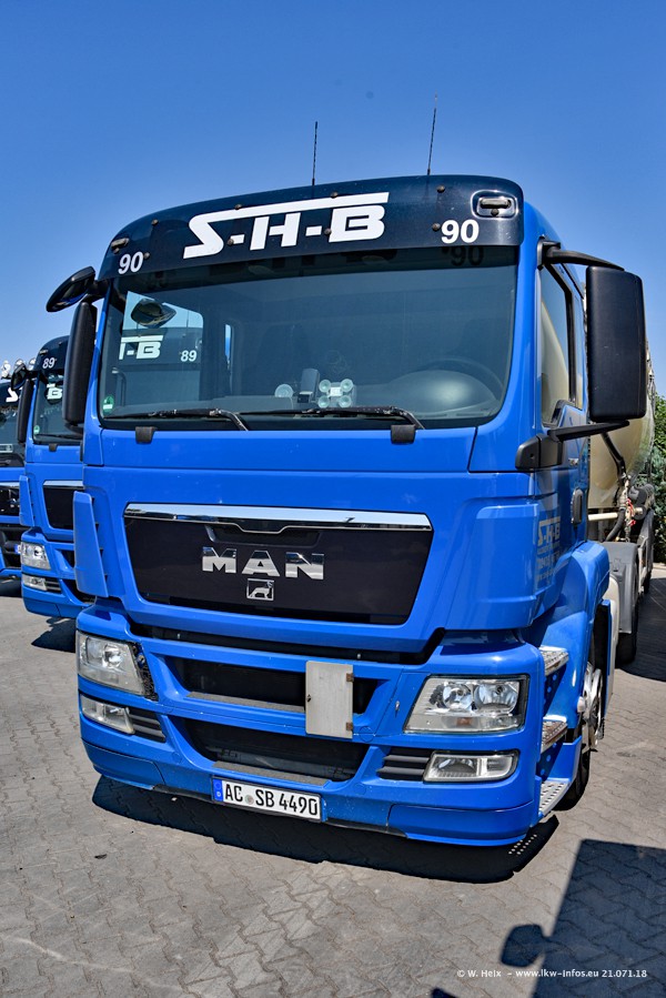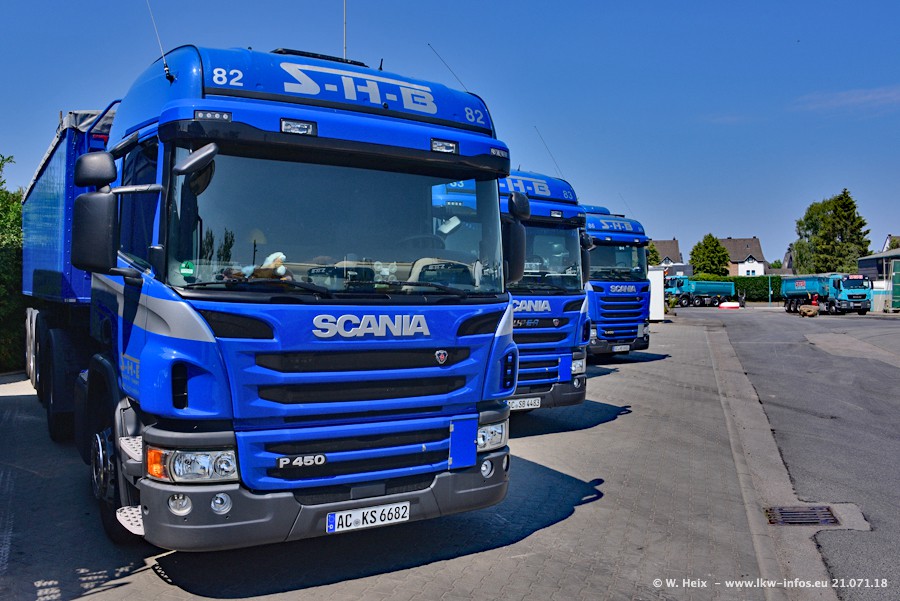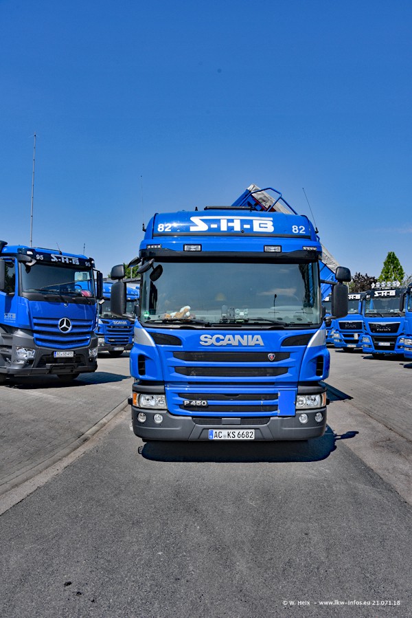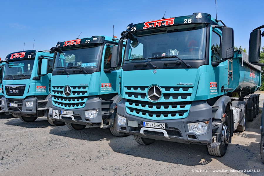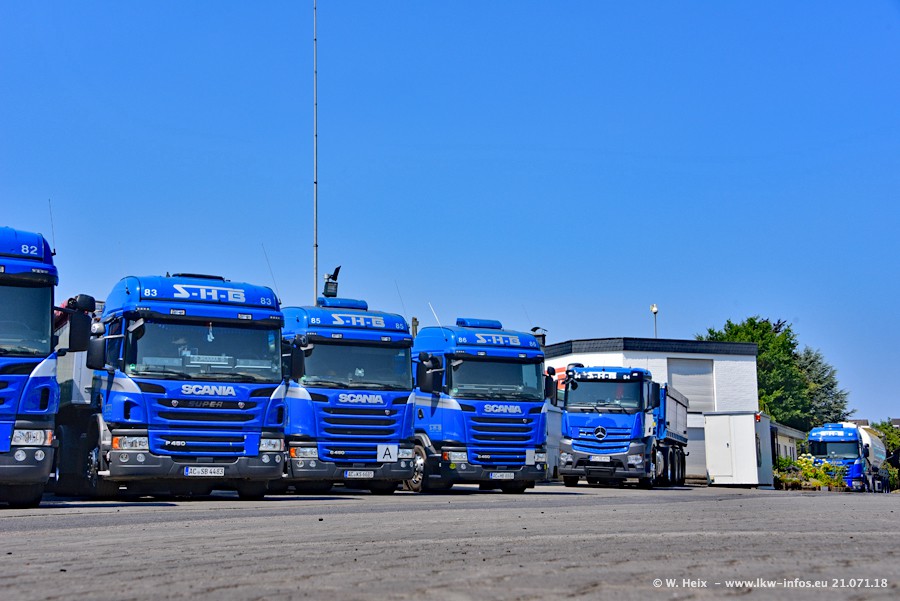 Seit meinem letzten Besuch bei SHB im März 2017 sind so einige neue LKW gekommen, die den Furhpark modernisieren bzw. alte Fahrzeuge ersetzt haben. Das sind bei den dunkelblauen LKW alle Mercedes-Benz Arocs/Antos/Actros. Passend dazu gibt es auch mehrere neue Kippauflieger. Bei den hellblauen LKW gibt es einige neue MAN TGX Euro 6 der aktuellen Generation und ab Montag (23.07.) wird ein Mercedes-Benz Arocs 8x4 auf der Straße sein. Der Fuhrpark war fast komplett zuhause.