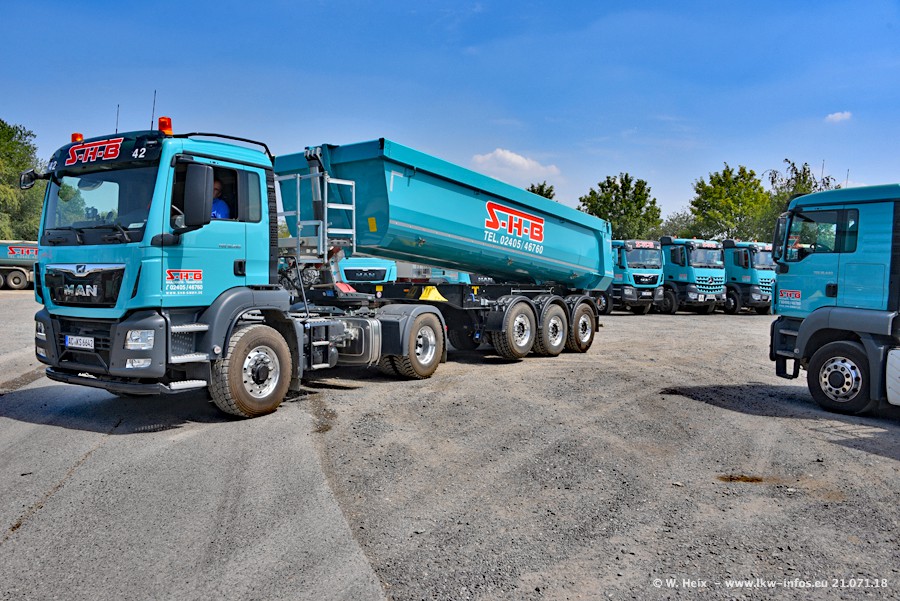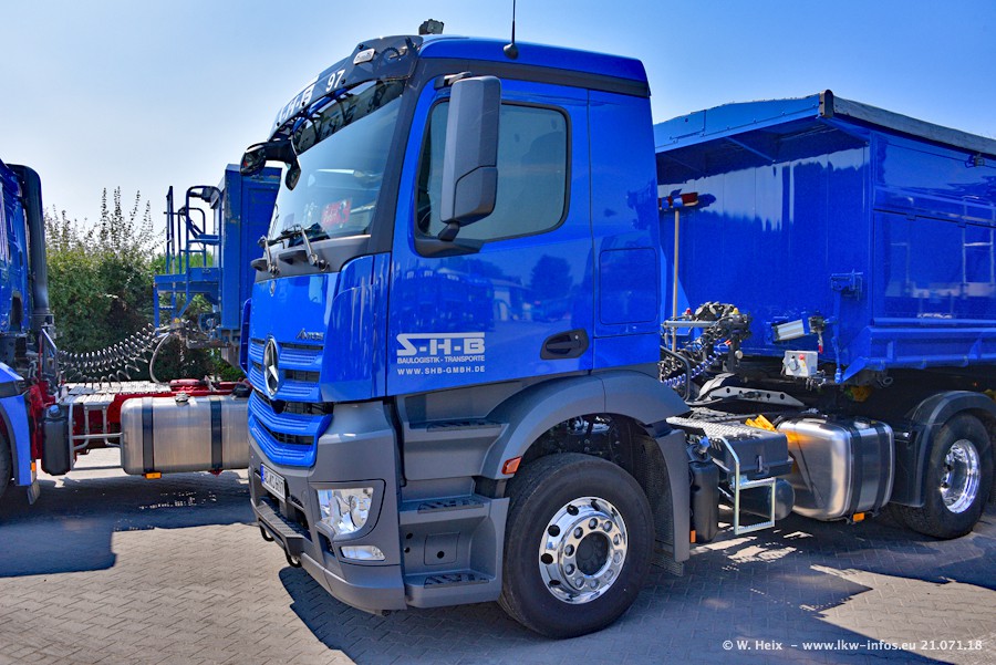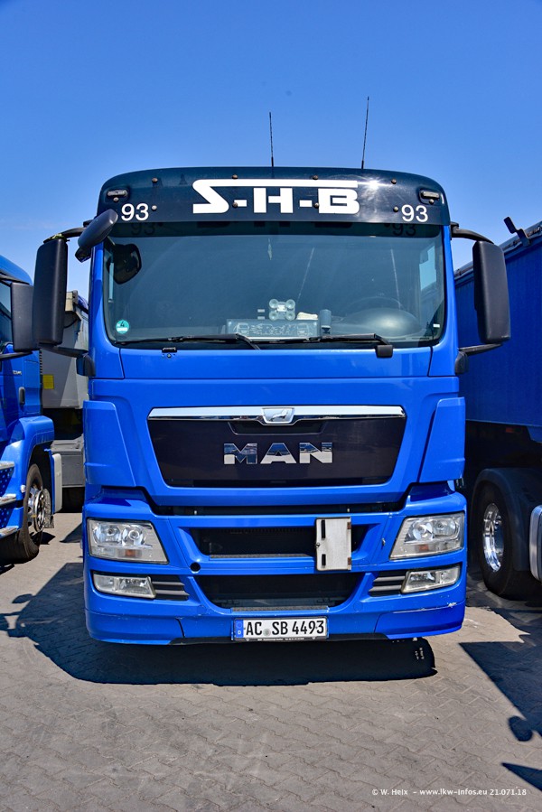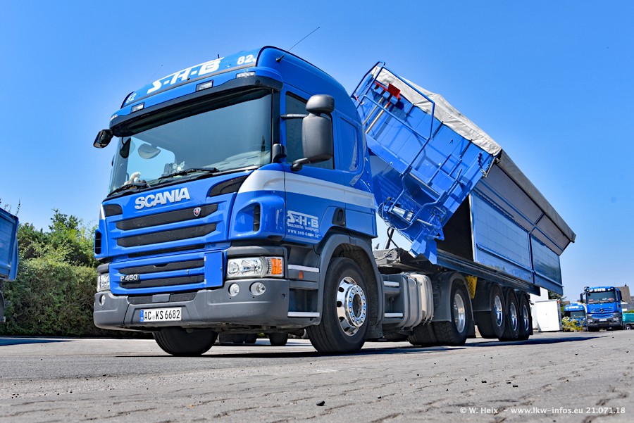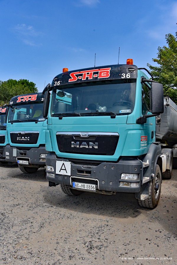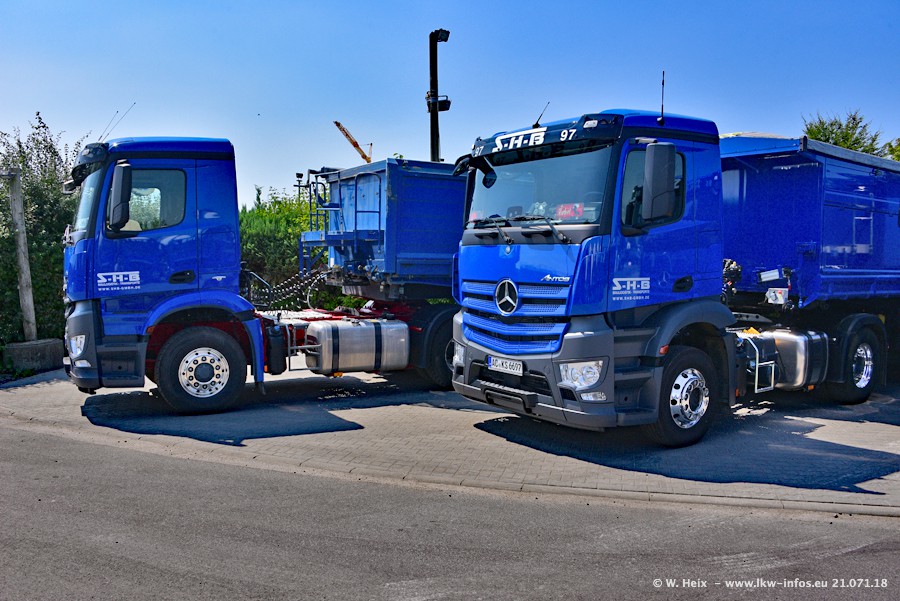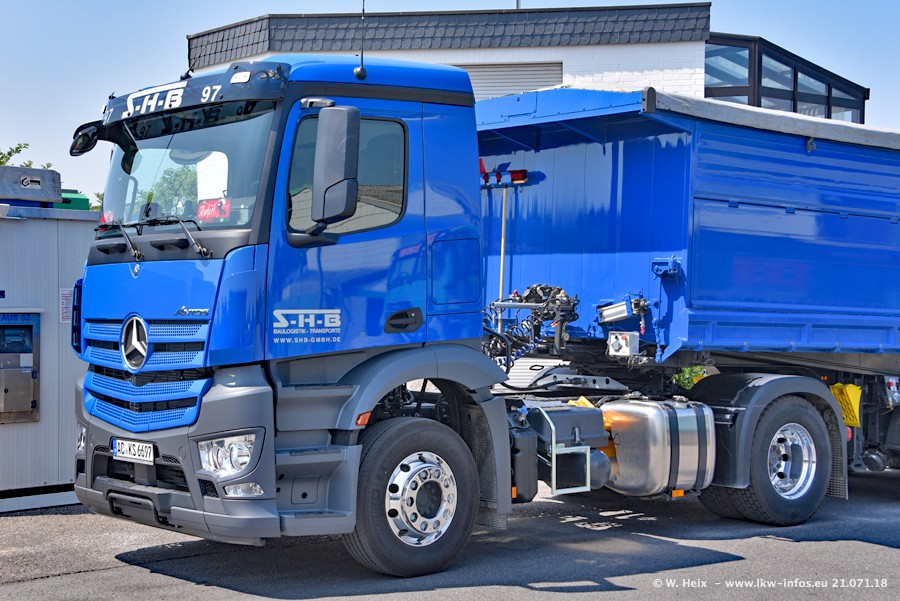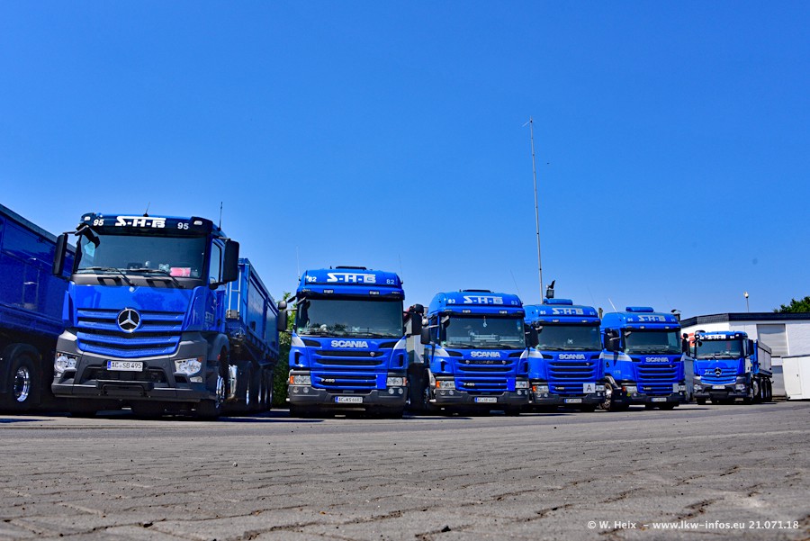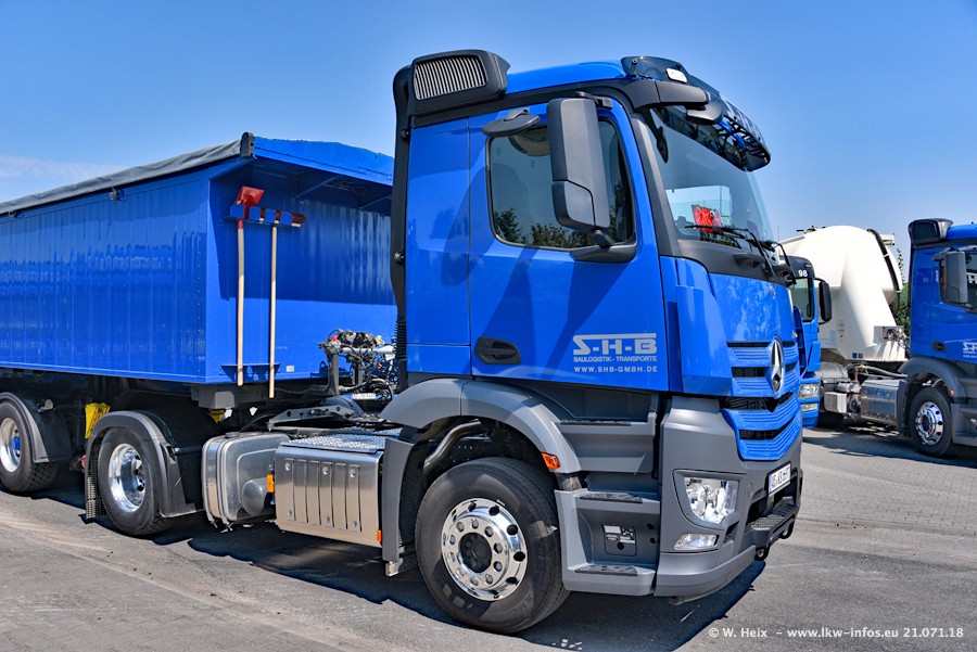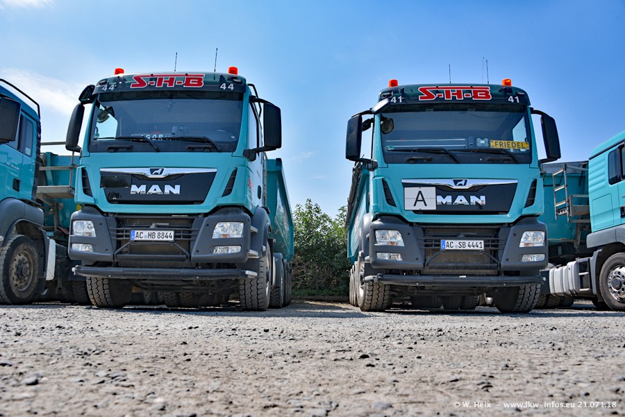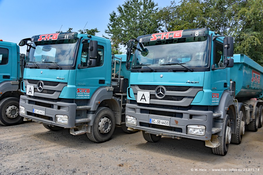 Seit meinem letzten Besuch bei SHB im März 2017 sind so einige neue LKW gekommen, die den Furhpark modernisieren bzw. alte Fahrzeuge ersetzt haben. Das sind bei den dunkelblauen LKW alle Mercedes-Benz Arocs/Antos/Actros. Passend dazu gibt es auch mehrere neue Kippauflieger. Bei den hellblauen LKW gibt es einige neue MAN TGX Euro 6 der aktuellen Generation und ab Montag (23.07.) wird ein Mercedes-Benz Arocs 8x4 auf der Straße sein. Der Fuhrpark war fast komplett zuhause.