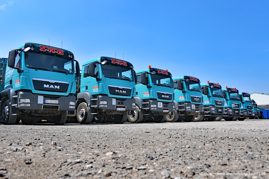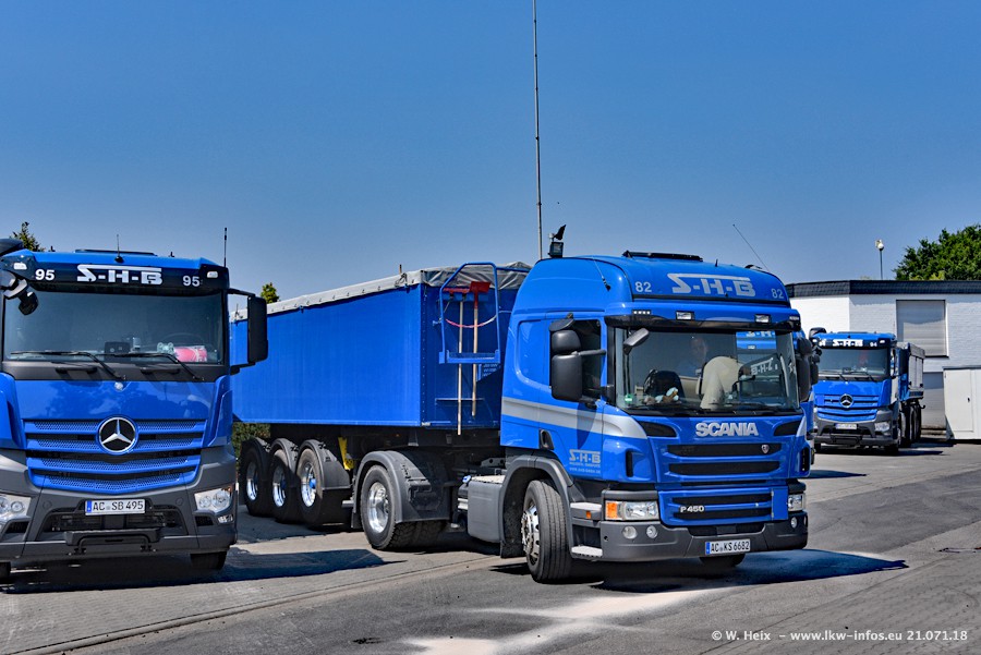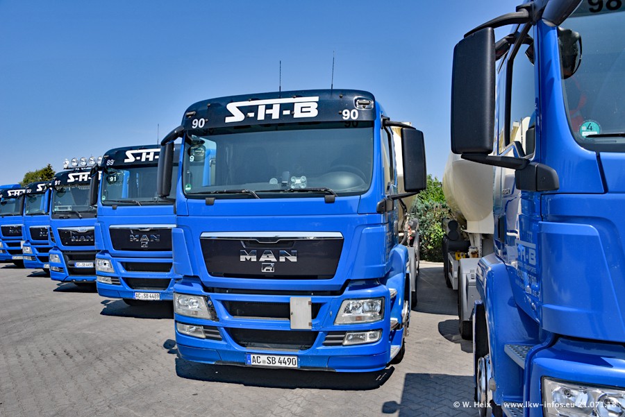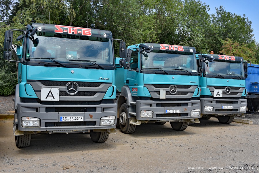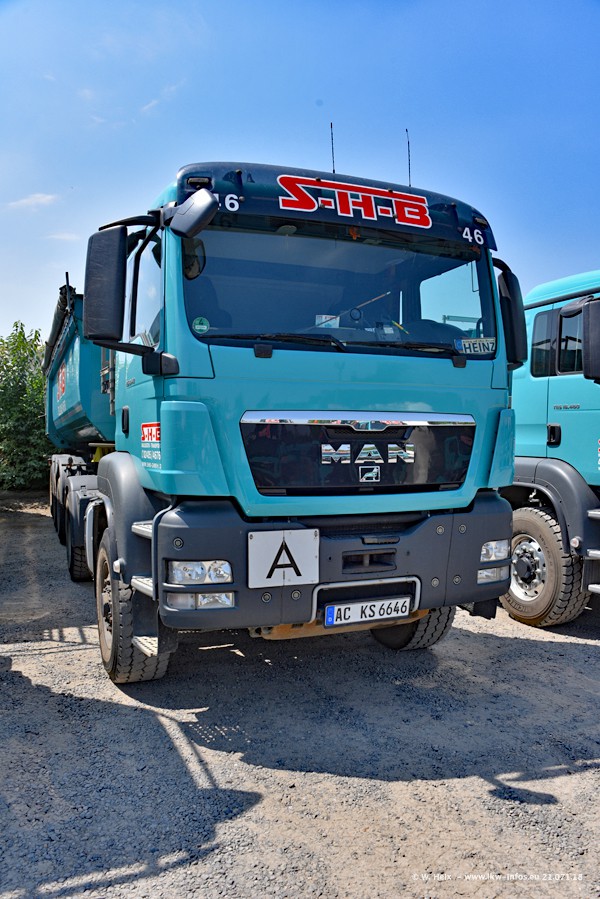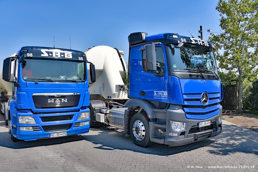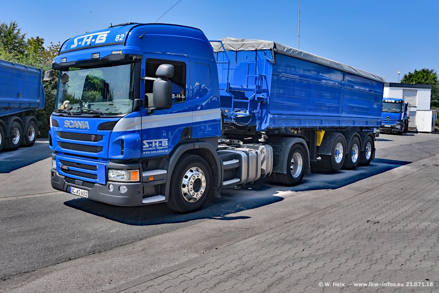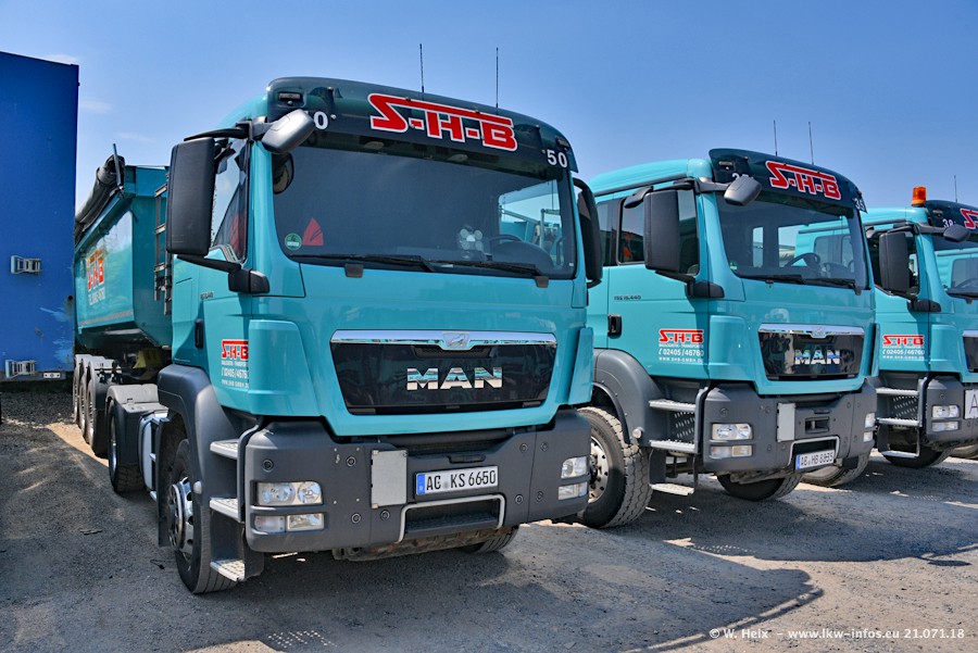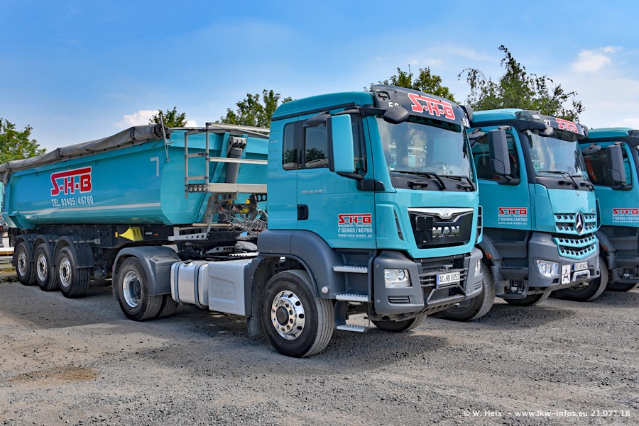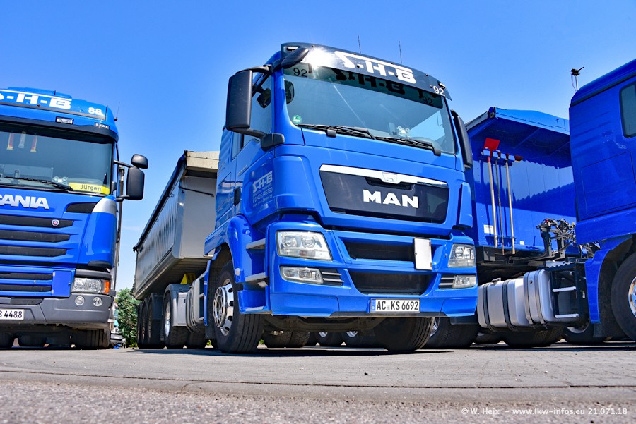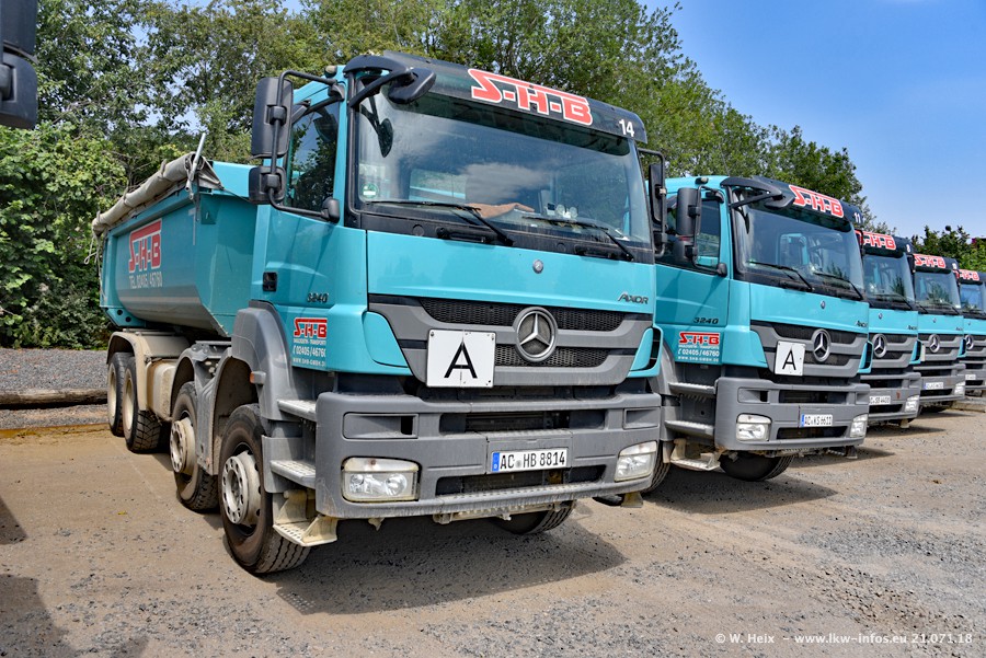 Seit meinem letzten Besuch bei SHB im März 2017 sind so einige neue LKW gekommen, die den Furhpark modernisieren bzw. alte Fahrzeuge ersetzt haben. Das sind bei den dunkelblauen LKW alle Mercedes-Benz Arocs/Antos/Actros. Passend dazu gibt es auch mehrere neue Kippauflieger. Bei den hellblauen LKW gibt es einige neue MAN TGX Euro 6 der aktuellen Generation und ab Montag (23.07.) wird ein Mercedes-Benz Arocs 8x4 auf der Straße sein. Der Fuhrpark war fast komplett zuhause.