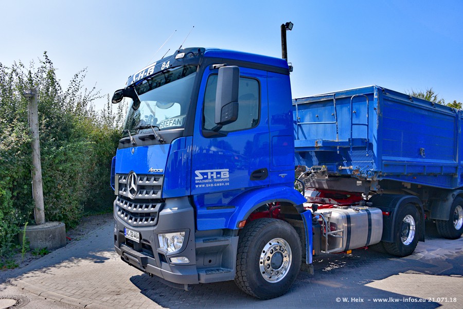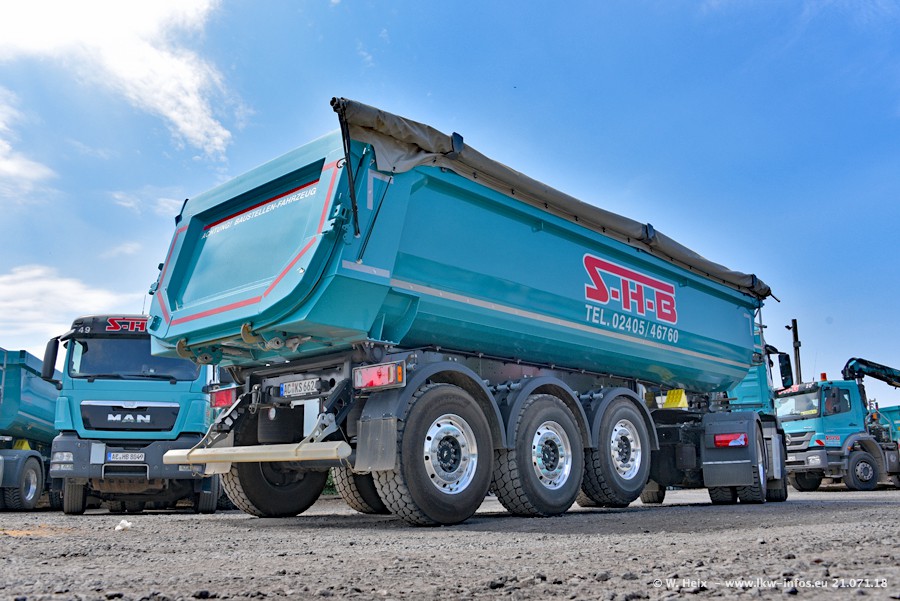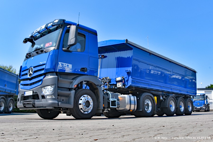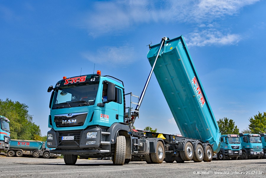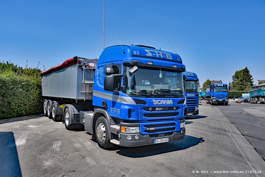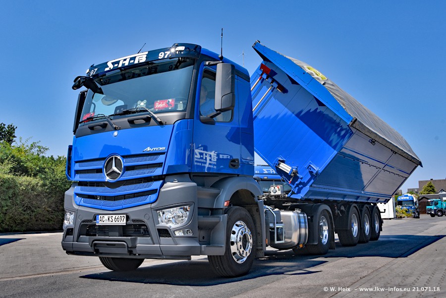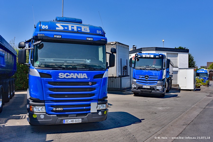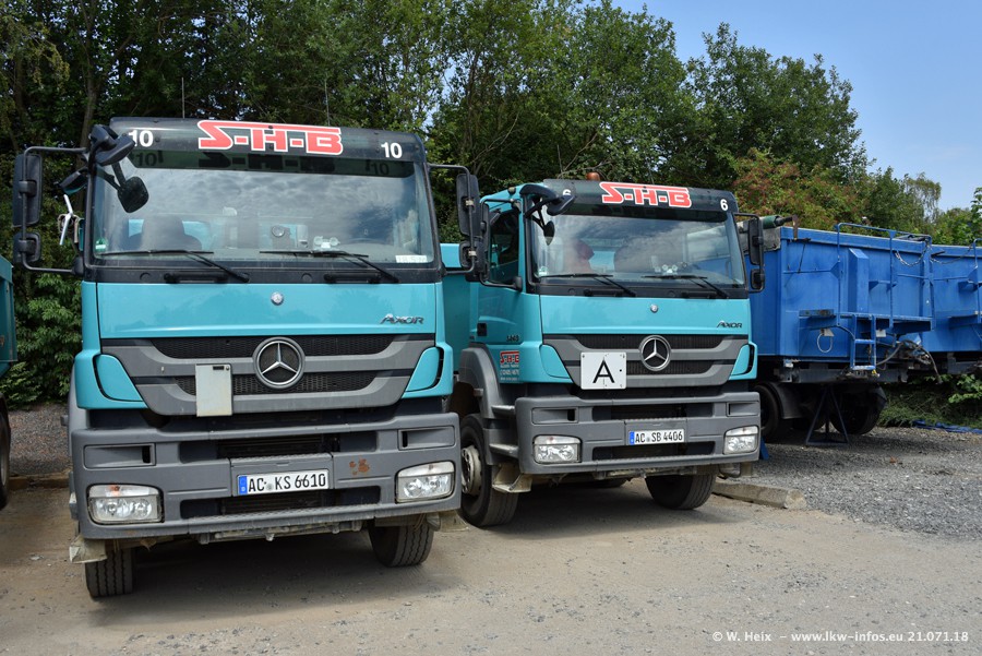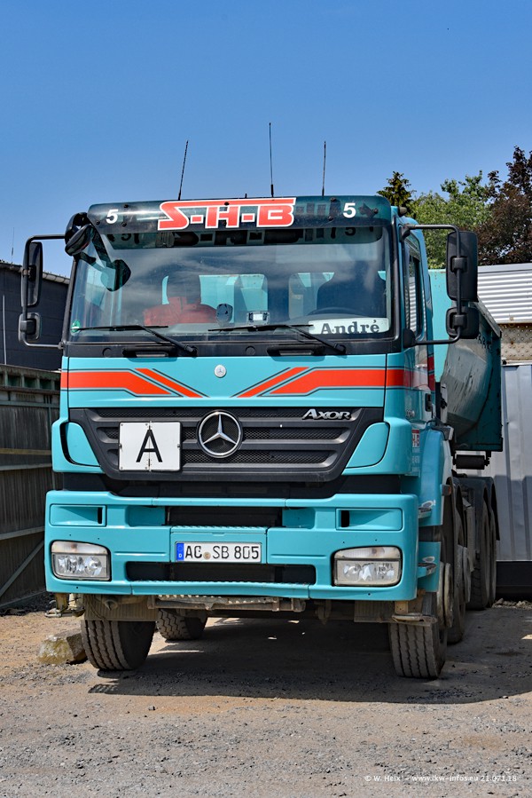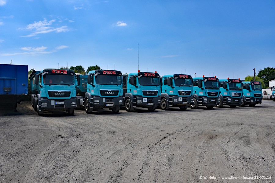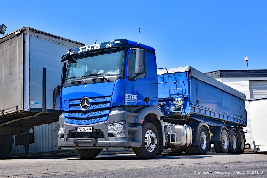 Seit meinem letzten Besuch bei SHB im März 2017 sind so einige neue LKW gekommen, die den Furhpark modernisieren bzw. alte Fahrzeuge ersetzt haben. Das sind bei den dunkelblauen LKW alle Mercedes-Benz Arocs/Antos/Actros. Passend dazu gibt es auch mehrere neue Kippauflieger. Bei den hellblauen LKW gibt es einige neue MAN TGX Euro 6 der aktuellen Generation und ab Montag (23.07.) wird ein Mercedes-Benz Arocs 8x4 auf der Straße sein. Der Fuhrpark war fast komplett zuhause.
