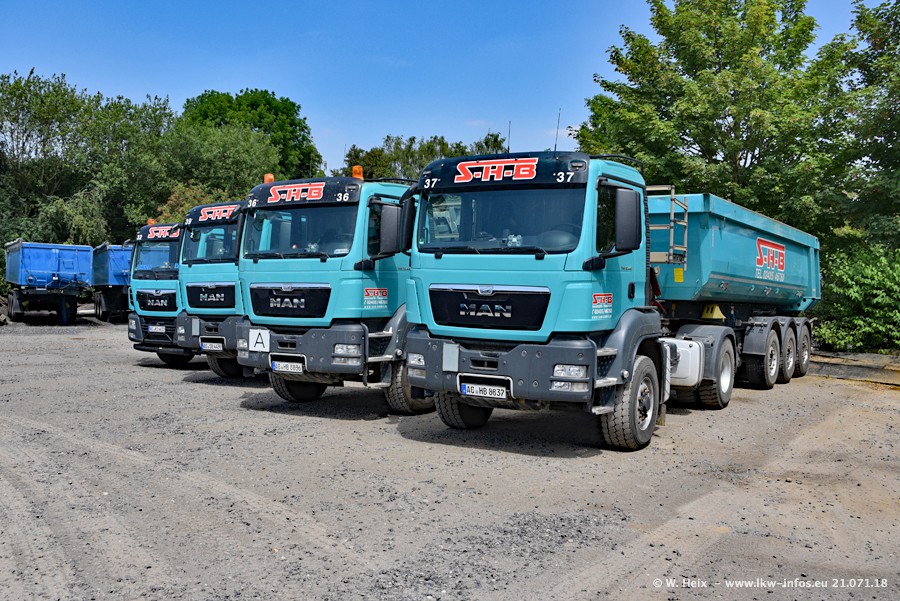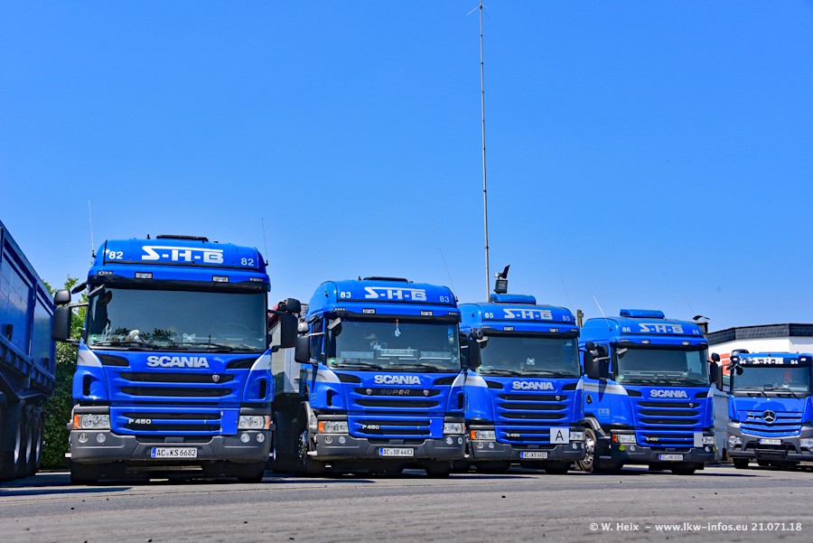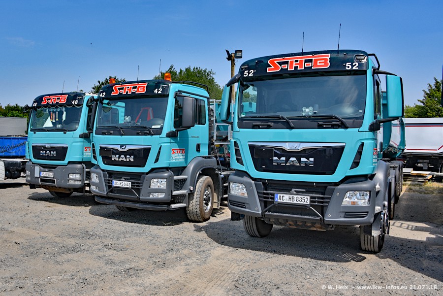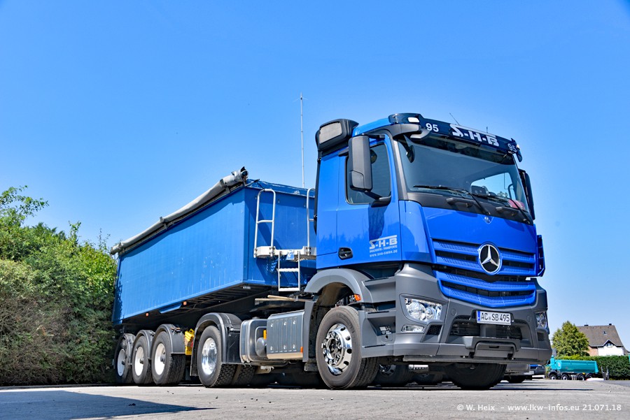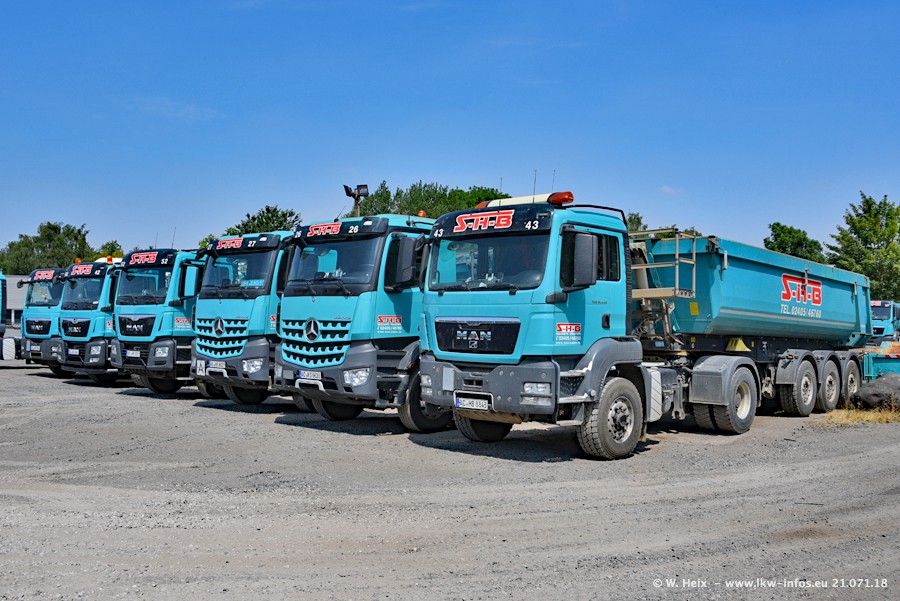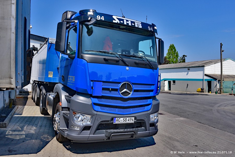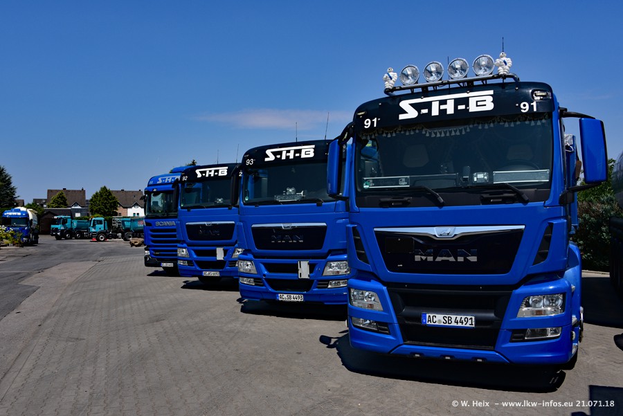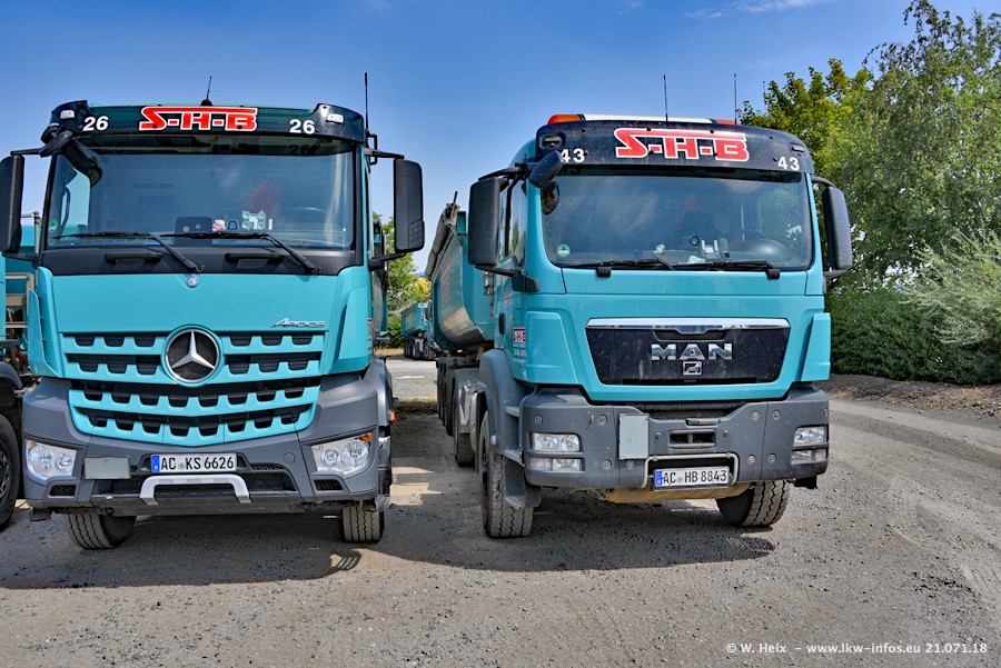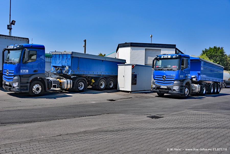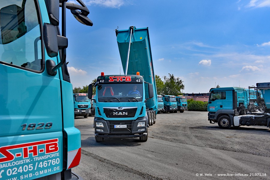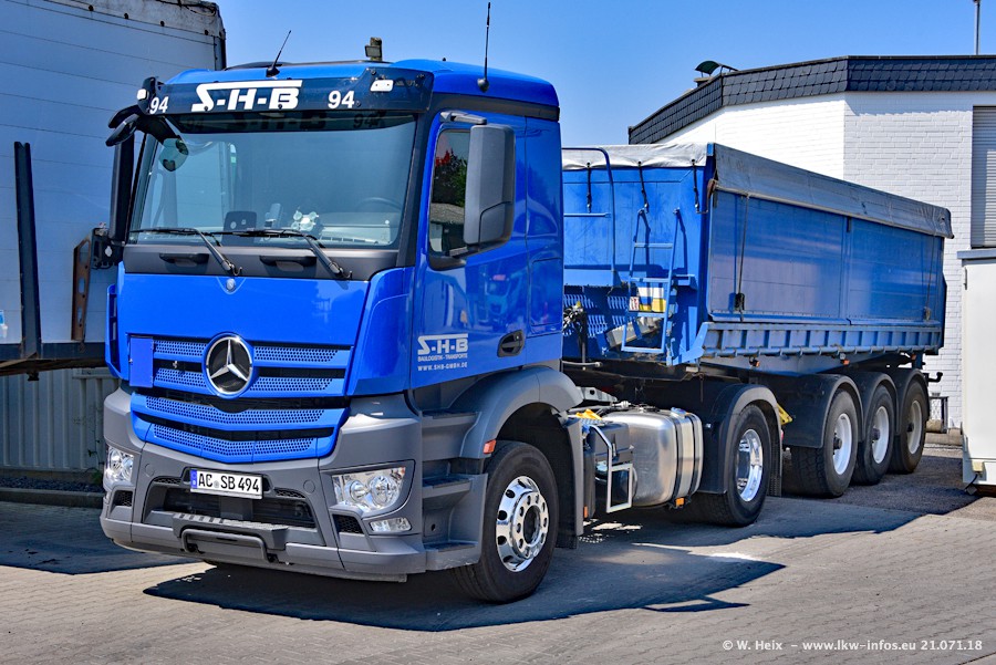 Seit meinem letzten Besuch bei SHB im März 2017 sind so einige neue LKW gekommen, die den Furhpark modernisieren bzw. alte Fahrzeuge ersetzt haben. Das sind bei den dunkelblauen LKW alle Mercedes-Benz Arocs/Antos/Actros. Passend dazu gibt es auch mehrere neue Kippauflieger. Bei den hellblauen LKW gibt es einige neue MAN TGX Euro 6 der aktuellen Generation und ab Montag (23.07.) wird ein Mercedes-Benz Arocs 8x4 auf der Straße sein. Der Fuhrpark war fast komplett zuhause.