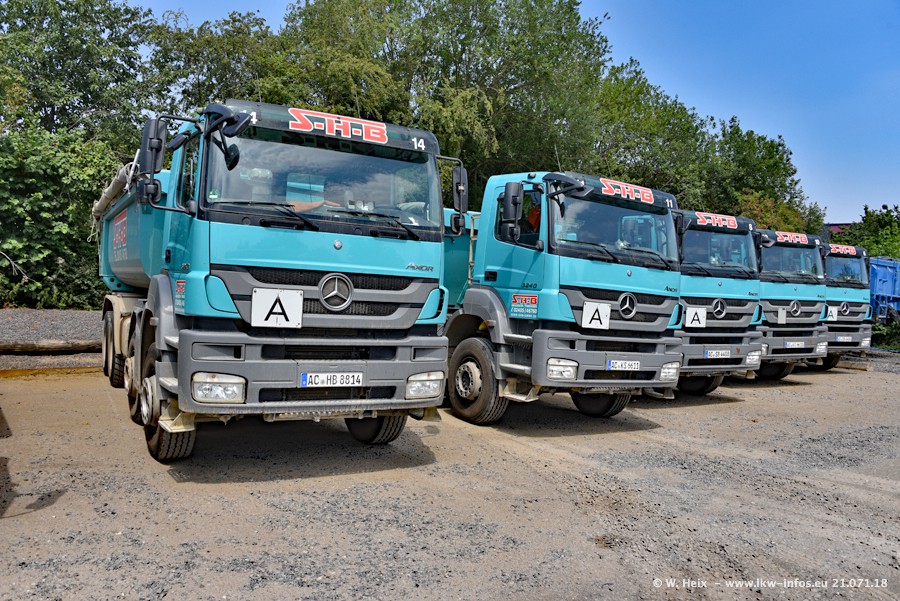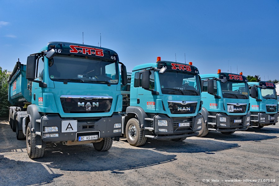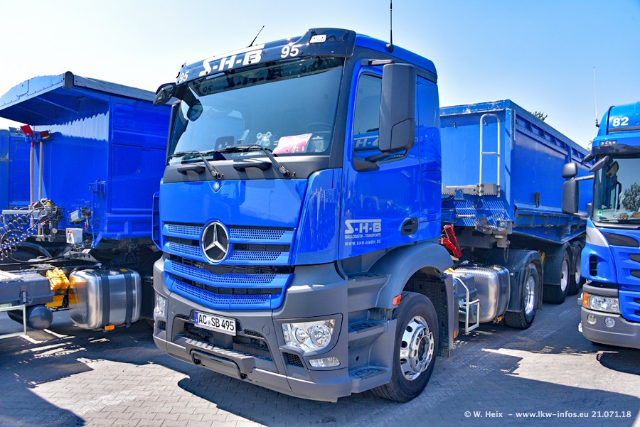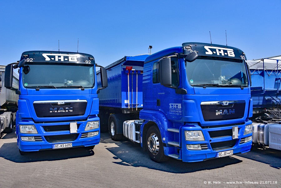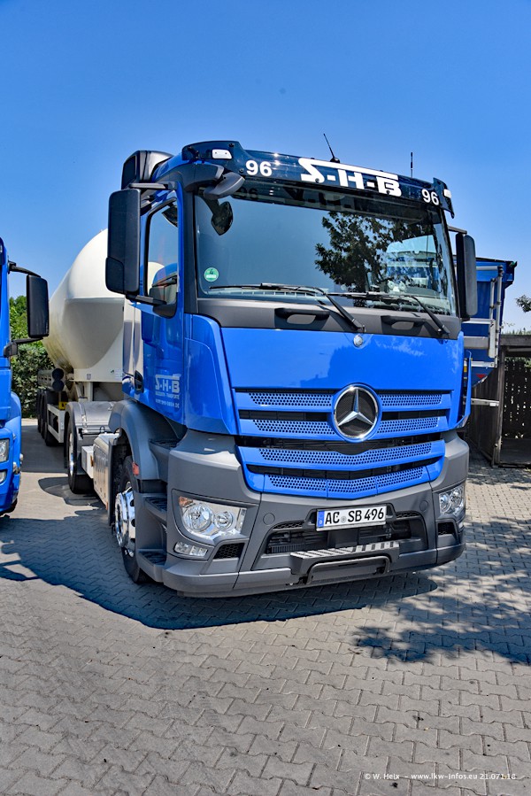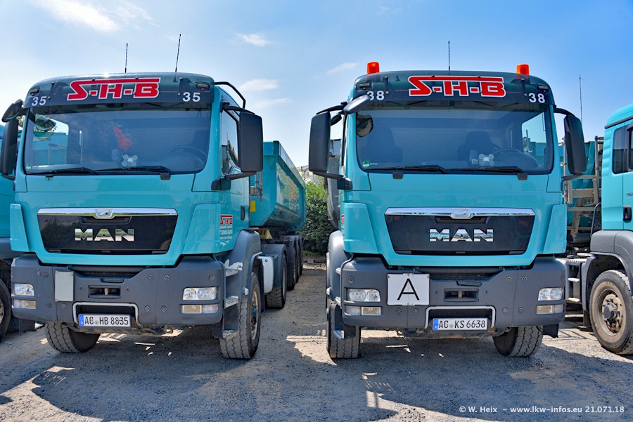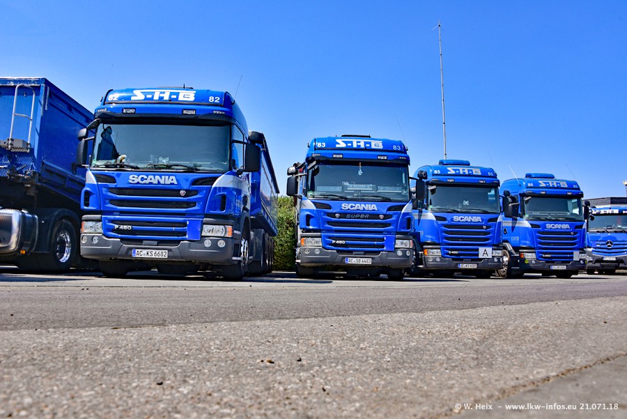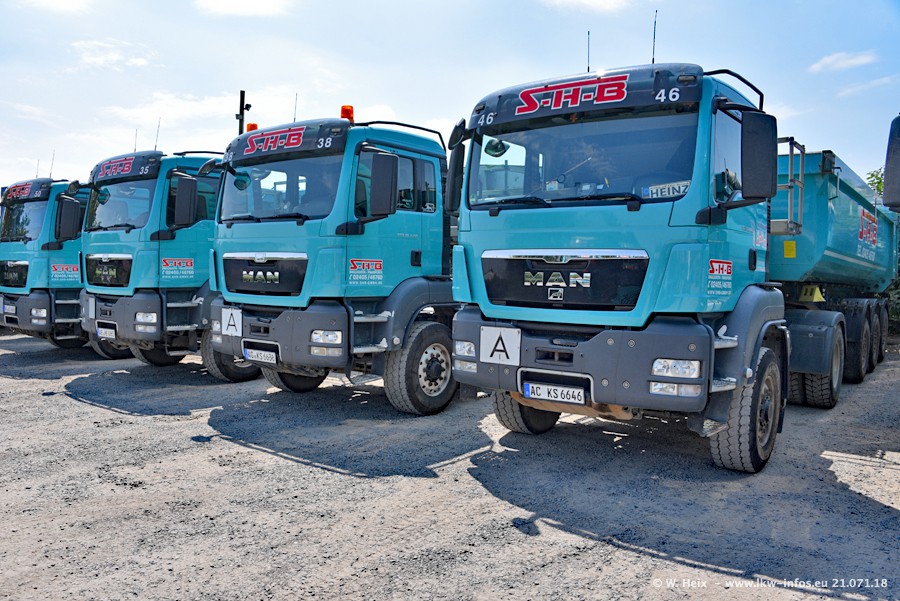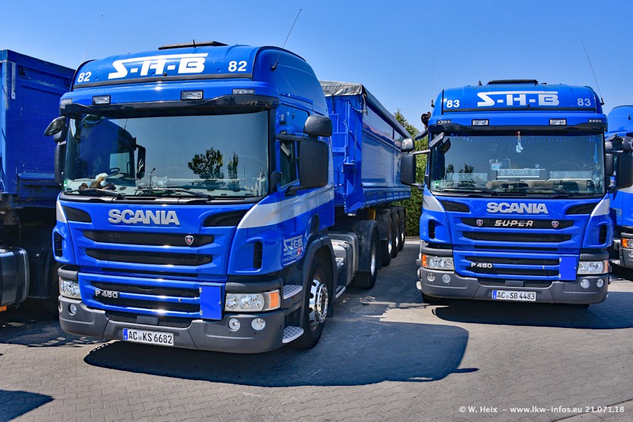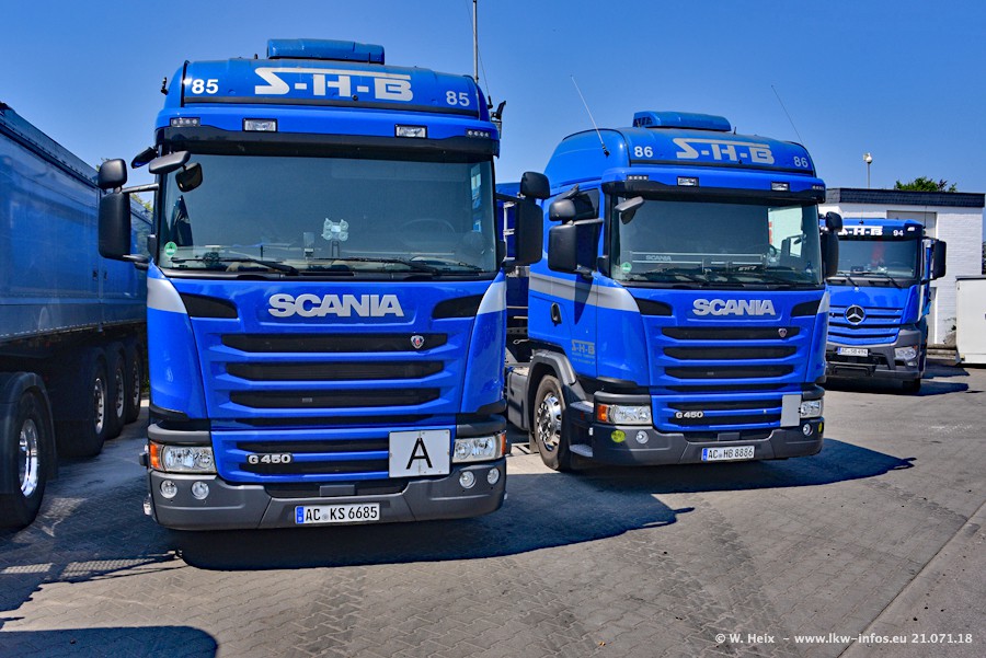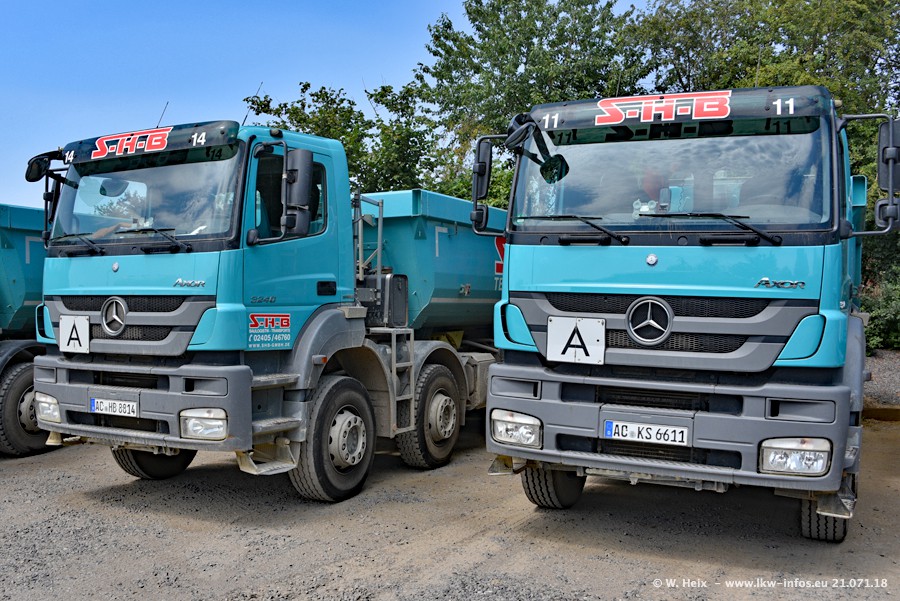 Seit meinem letzten Besuch bei SHB im März 2017 sind so einige neue LKW gekommen, die den Furhpark modernisieren bzw. alte Fahrzeuge ersetzt haben. Das sind bei den dunkelblauen LKW alle Mercedes-Benz Arocs/Antos/Actros. Passend dazu gibt es auch mehrere neue Kippauflieger. Bei den hellblauen LKW gibt es einige neue MAN TGX Euro 6 der aktuellen Generation und ab Montag (23.07.) wird ein Mercedes-Benz Arocs 8x4 auf der Straße sein. Der Fuhrpark war fast komplett zuhause.