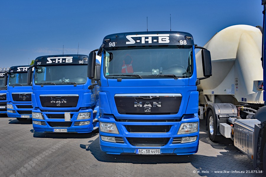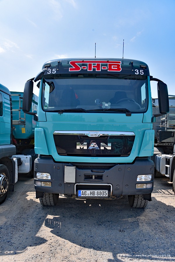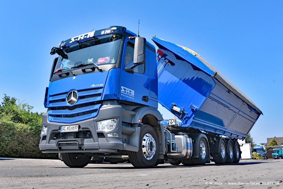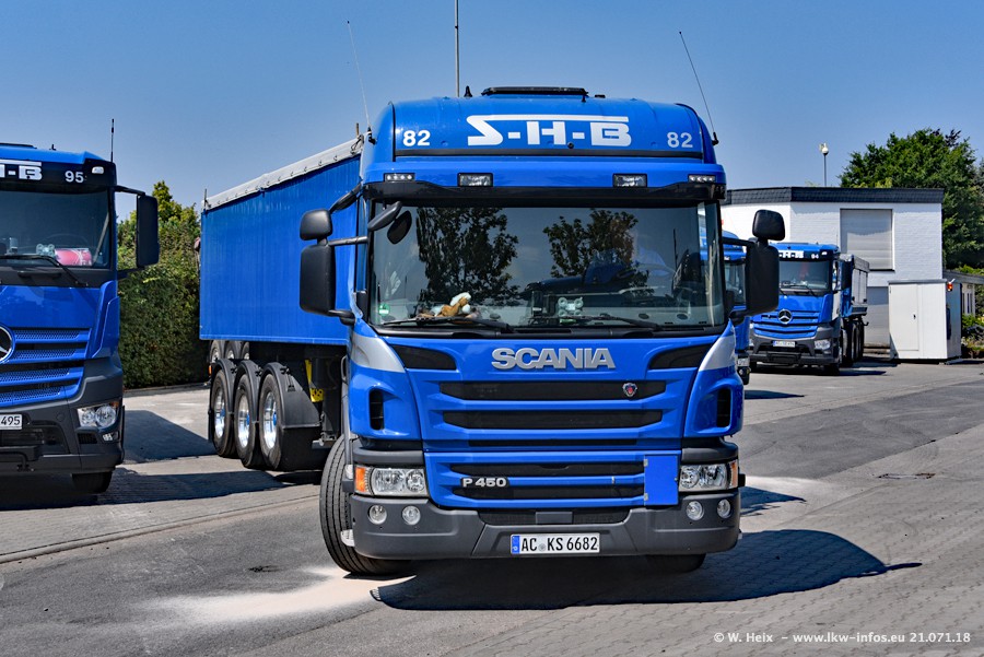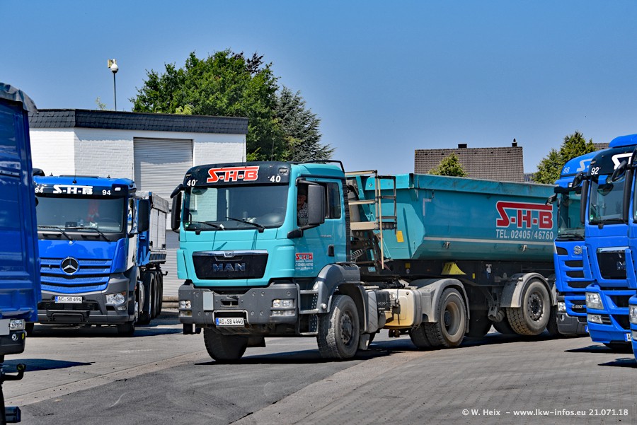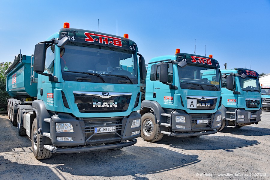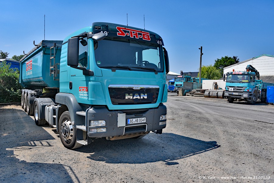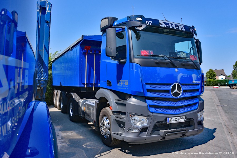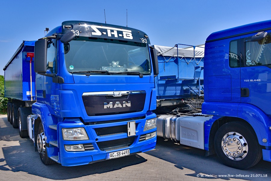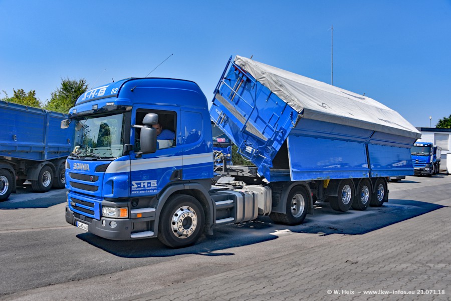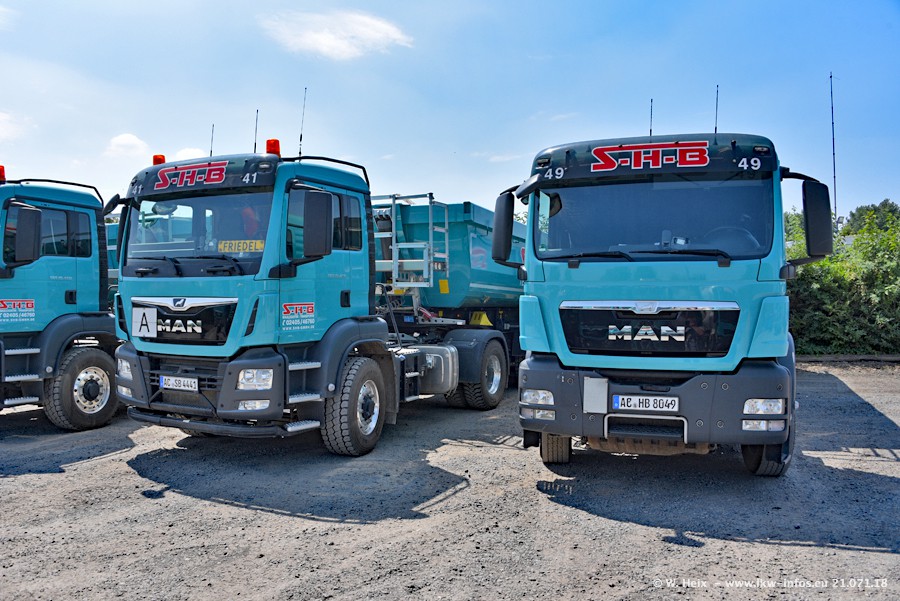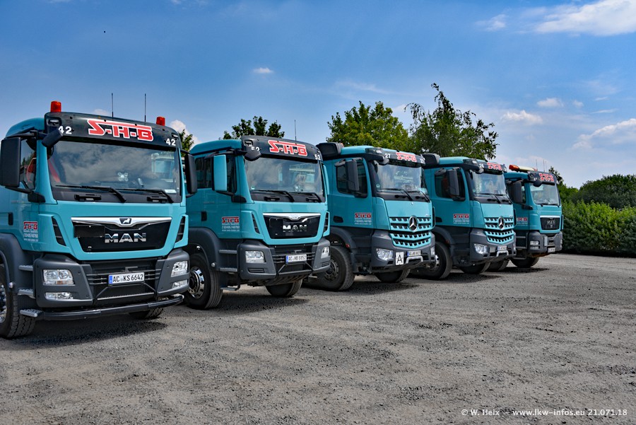 Seit meinem letzten Besuch bei SHB im März 2017 sind so einige neue LKW gekommen, die den Furhpark modernisieren bzw. alte Fahrzeuge ersetzt haben. Das sind bei den dunkelblauen LKW alle Mercedes-Benz Arocs/Antos/Actros. Passend dazu gibt es auch mehrere neue Kippauflieger. Bei den hellblauen LKW gibt es einige neue MAN TGX Euro 6 der aktuellen Generation und ab Montag (23.07.) wird ein Mercedes-Benz Arocs 8x4 auf der Straße sein. Der Fuhrpark war fast komplett zuhause.