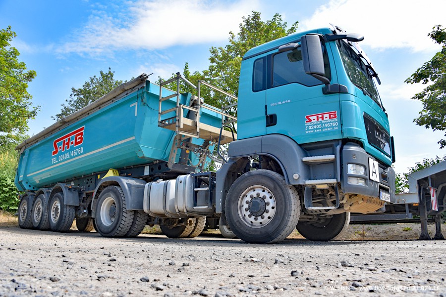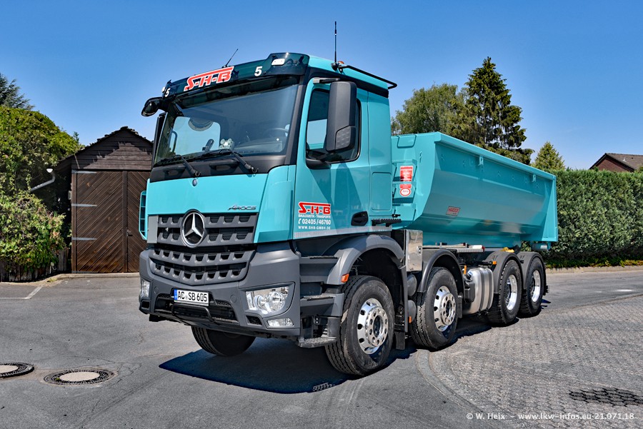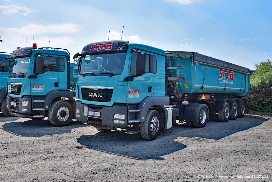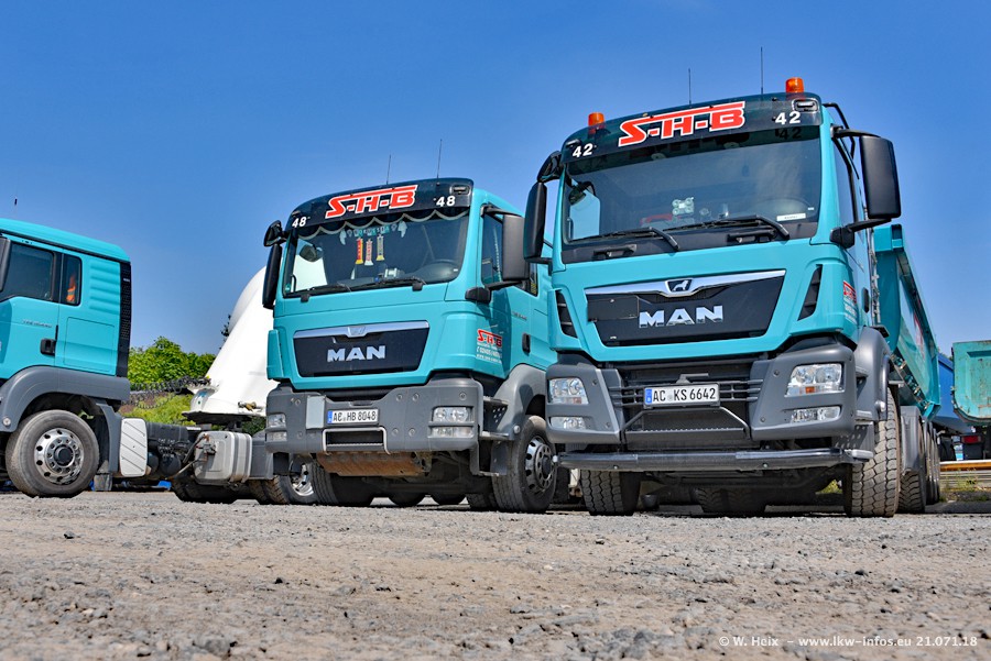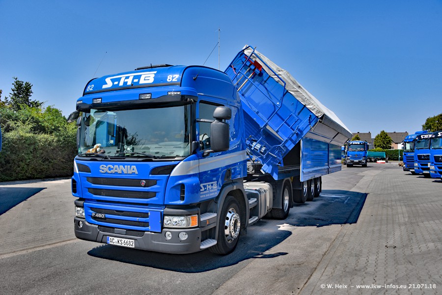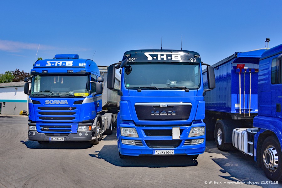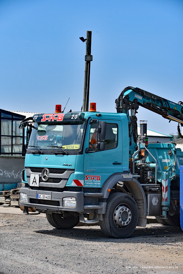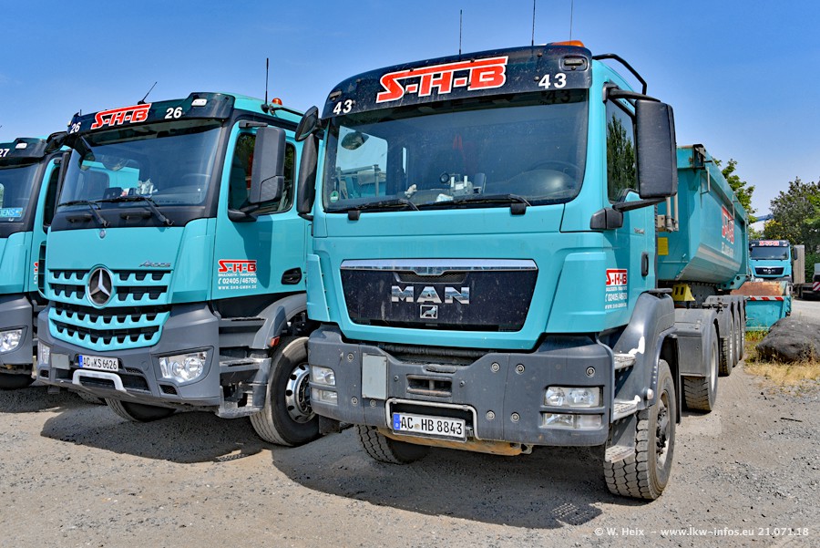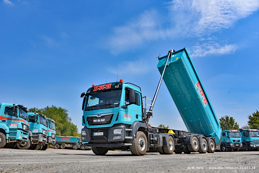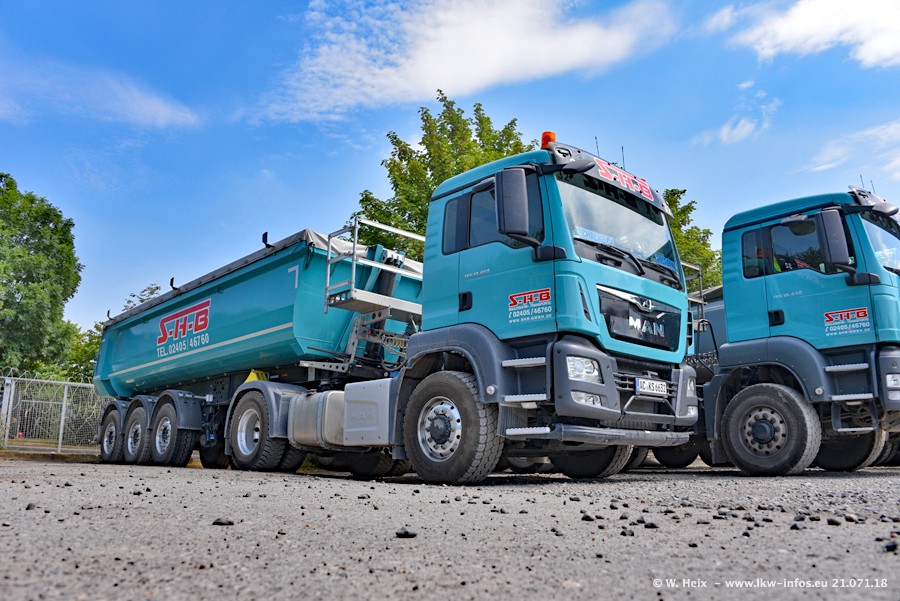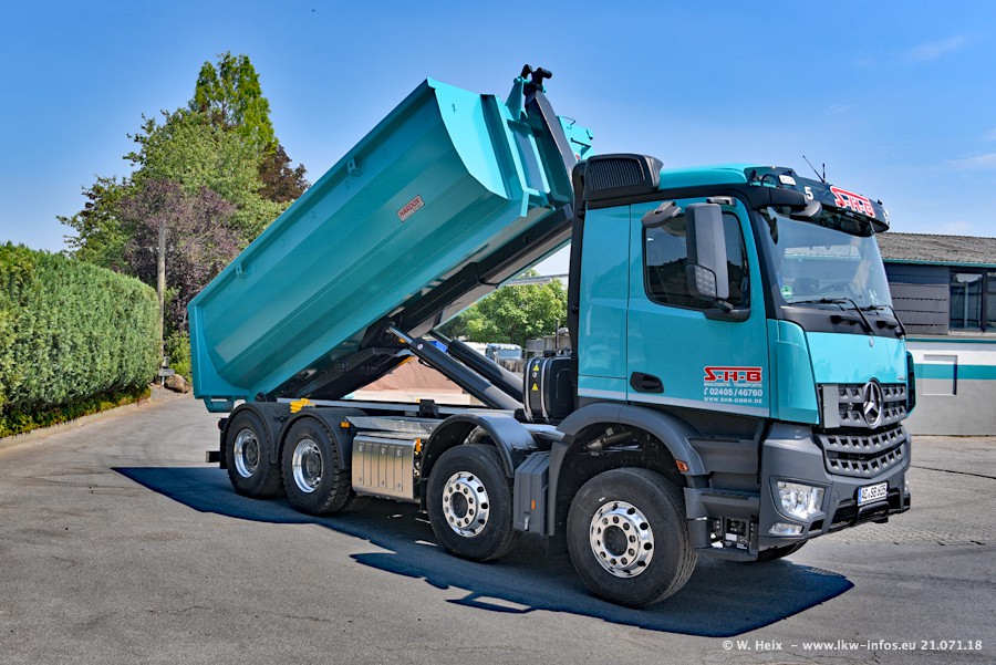 Seit meinem letzten Besuch bei SHB im März 2017 sind so einige neue LKW gekommen, die den Furhpark modernisieren bzw. alte Fahrzeuge ersetzt haben. Das sind bei den dunkelblauen LKW alle Mercedes-Benz Arocs/Antos/Actros. Passend dazu gibt es auch mehrere neue Kippauflieger. Bei den hellblauen LKW gibt es einige neue MAN TGX Euro 6 der aktuellen Generation und ab Montag (23.07.) wird ein Mercedes-Benz Arocs 8x4 auf der Straße sein. Der Fuhrpark war fast komplett zuhause.