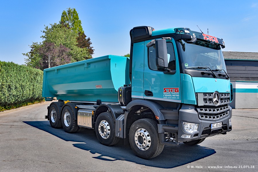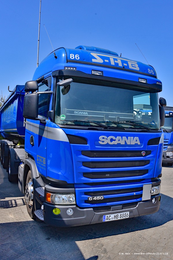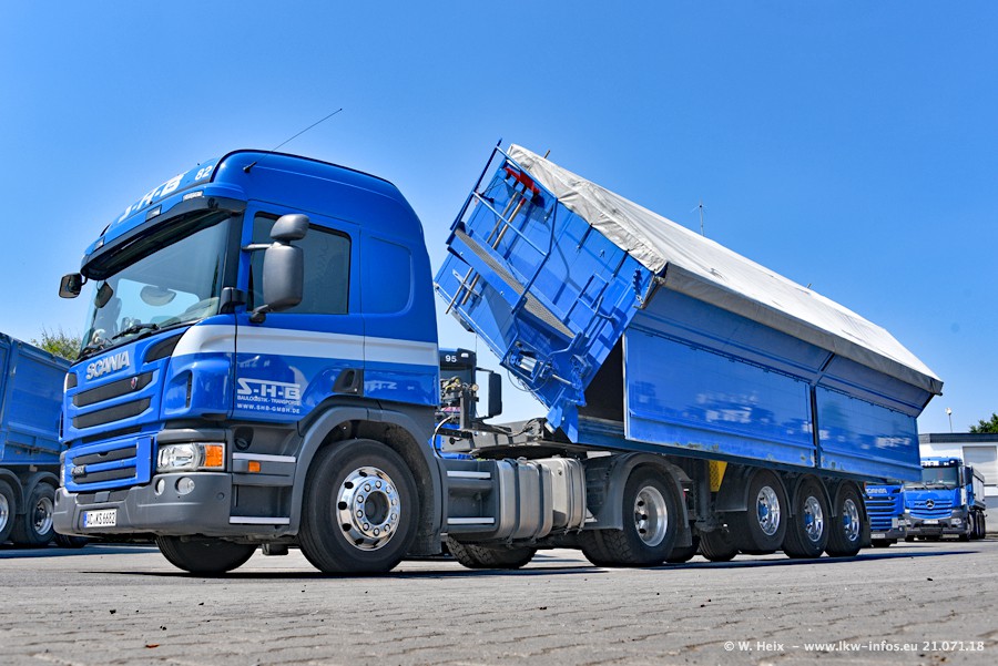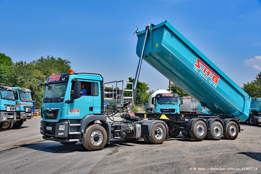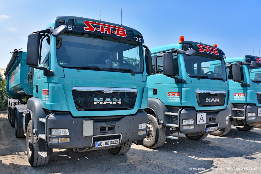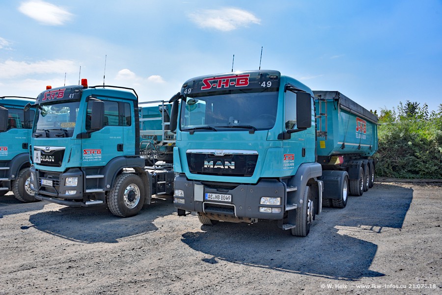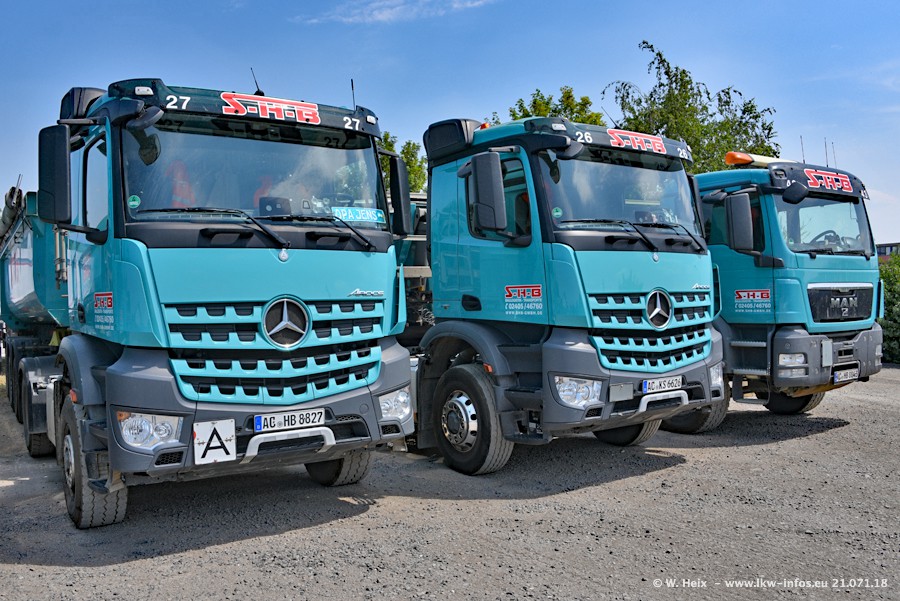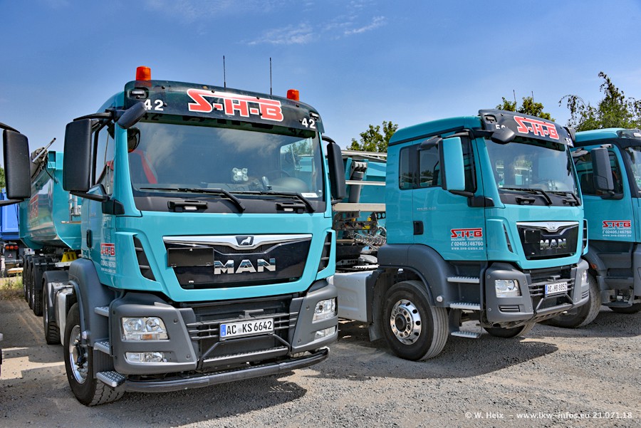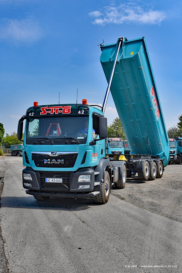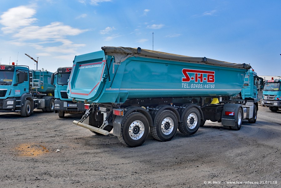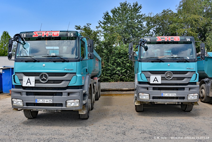 Seit meinem letzten Besuch bei SHB im März 2017 sind so einige neue LKW gekommen, die den Furhpark modernisieren bzw. alte Fahrzeuge ersetzt haben. Das sind bei den dunkelblauen LKW alle Mercedes-Benz Arocs/Antos/Actros. Passend dazu gibt es auch mehrere neue Kippauflieger. Bei den hellblauen LKW gibt es einige neue MAN TGX Euro 6 der aktuellen Generation und ab Montag (23.07.) wird ein Mercedes-Benz Arocs 8x4 auf der Straße sein. Der Fuhrpark war fast komplett zuhause.