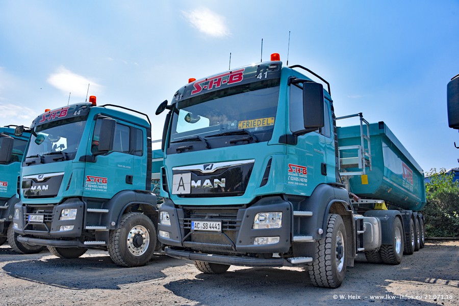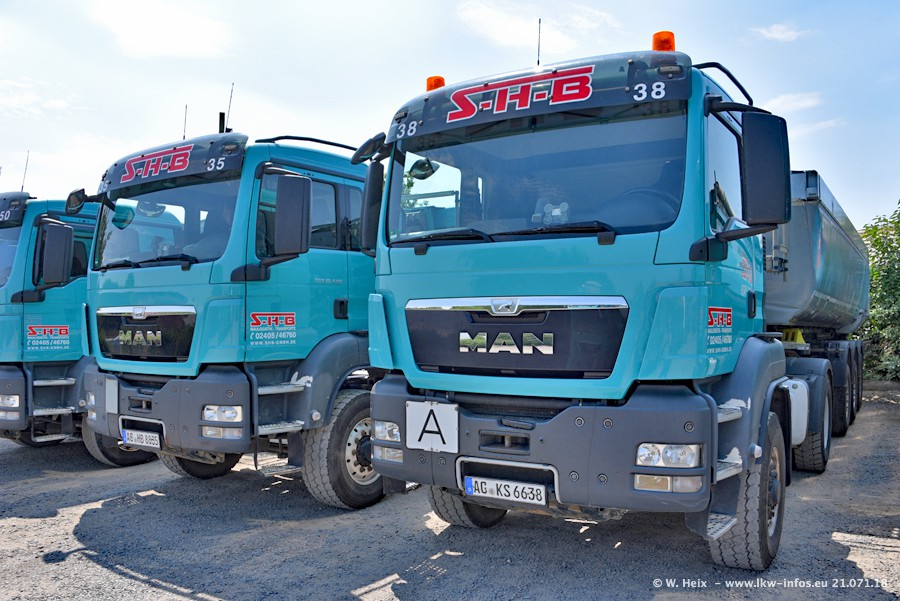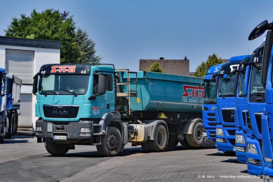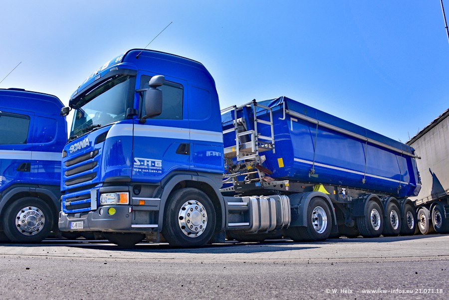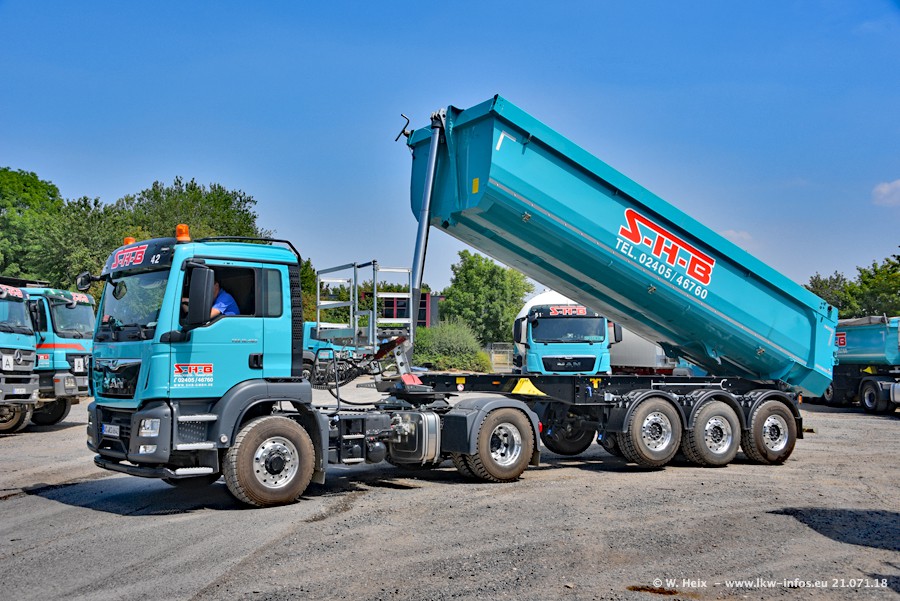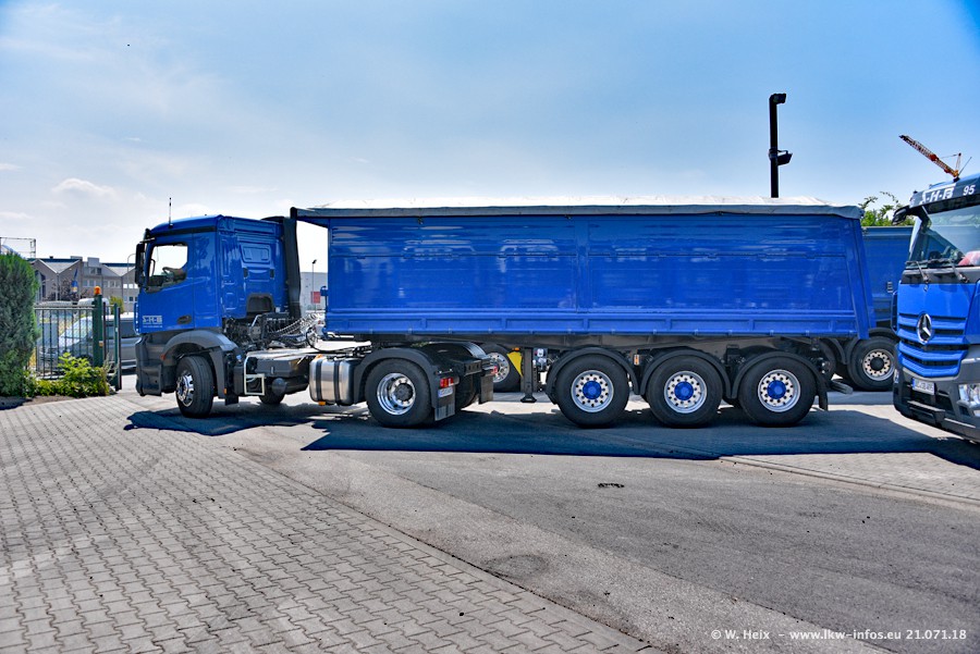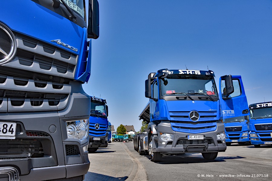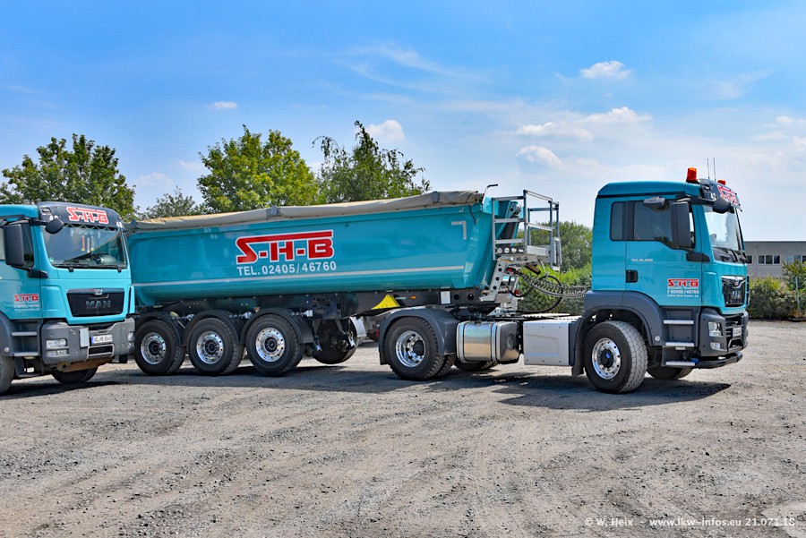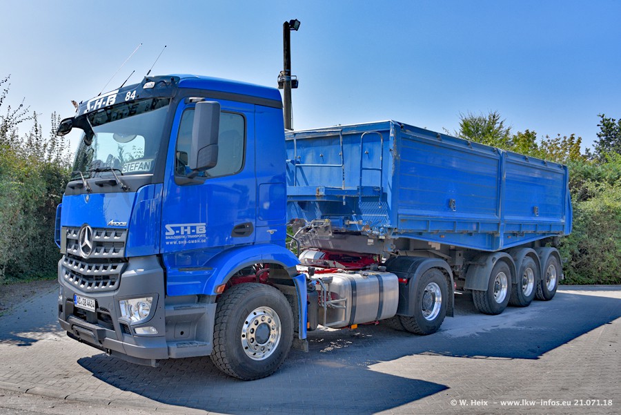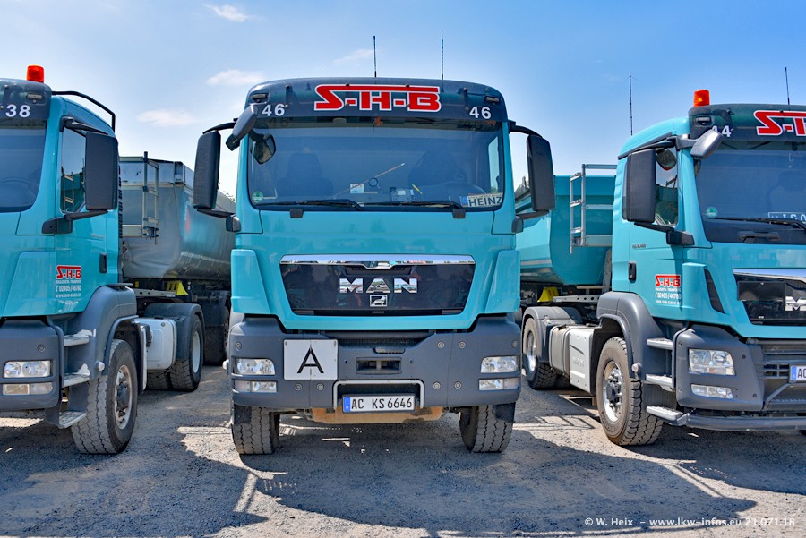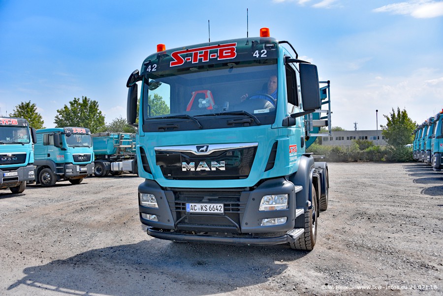 Seit meinem letzten Besuch bei SHB im März 2017 sind so einige neue LKW gekommen, die den Furhpark modernisieren bzw. alte Fahrzeuge ersetzt haben. Das sind bei den dunkelblauen LKW alle Mercedes-Benz Arocs/Antos/Actros. Passend dazu gibt es auch mehrere neue Kippauflieger. Bei den hellblauen LKW gibt es einige neue MAN TGX Euro 6 der aktuellen Generation und ab Montag (23.07.) wird ein Mercedes-Benz Arocs 8x4 auf der Straße sein. Der Fuhrpark war fast komplett zuhause.