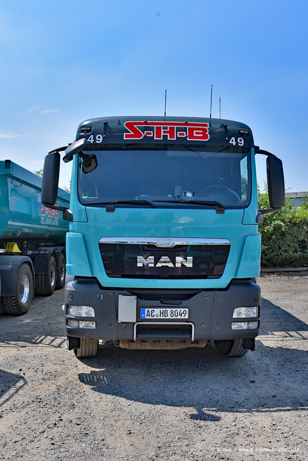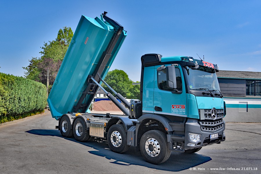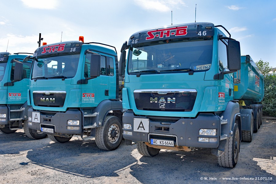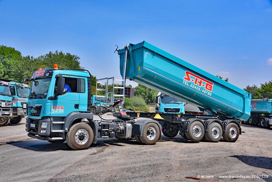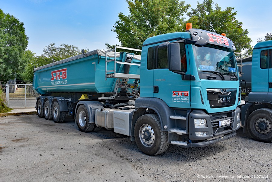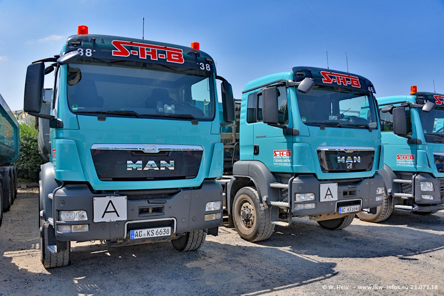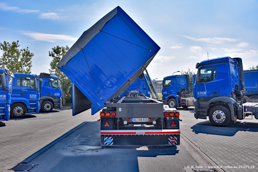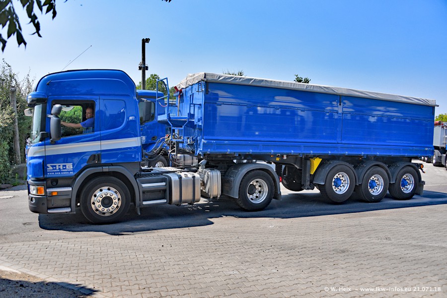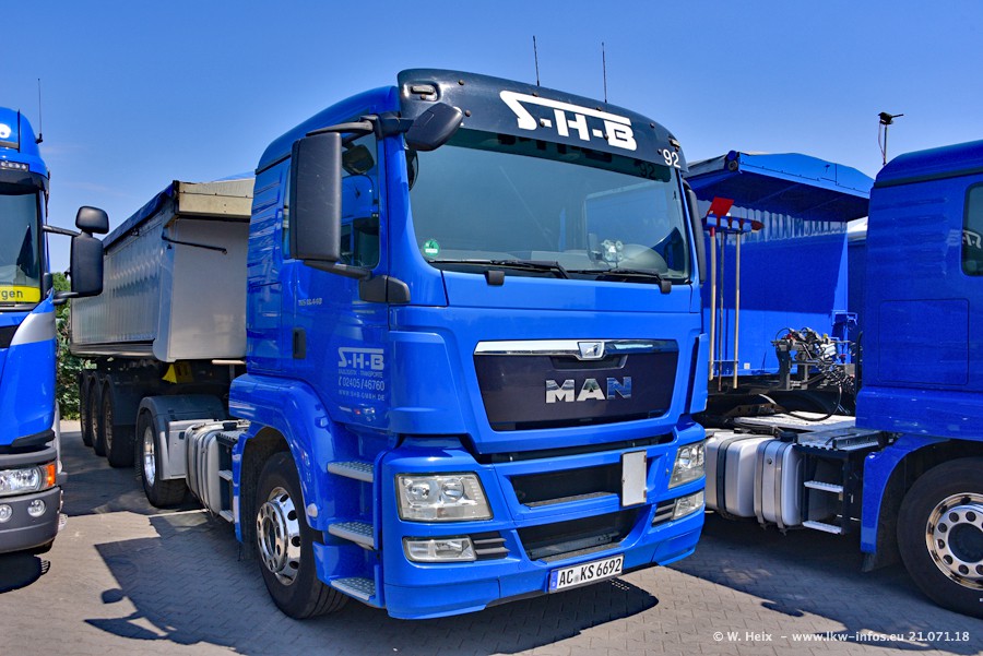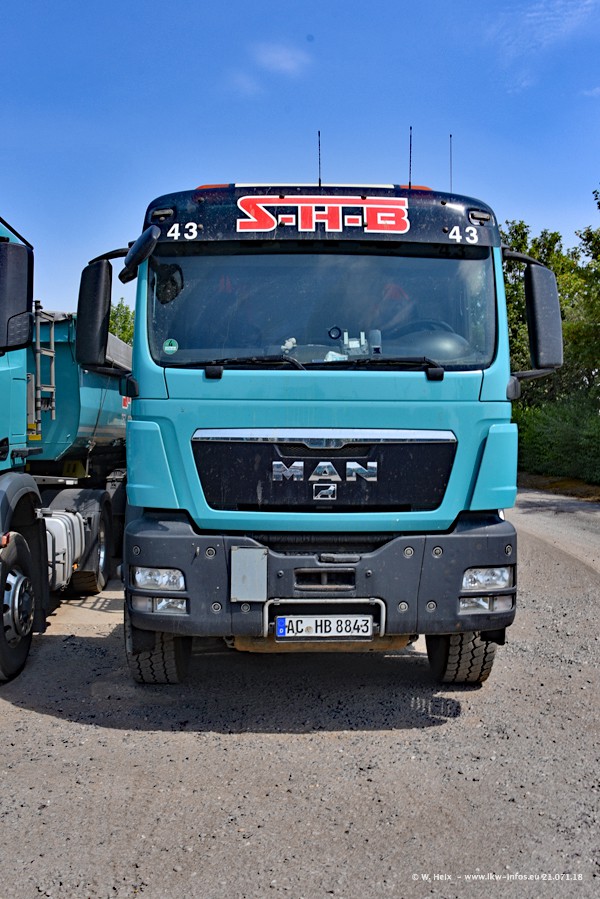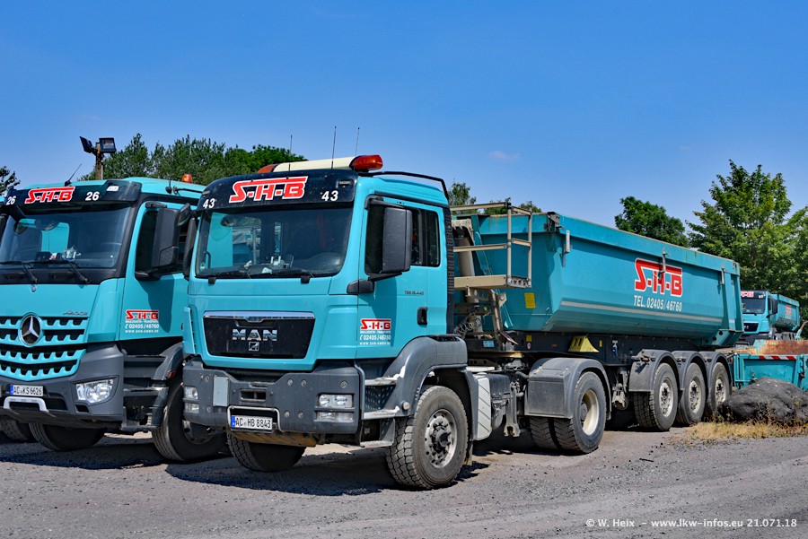 Seit meinem letzten Besuch bei SHB im März 2017 sind so einige neue LKW gekommen, die den Furhpark modernisieren bzw. alte Fahrzeuge ersetzt haben. Das sind bei den dunkelblauen LKW alle Mercedes-Benz Arocs/Antos/Actros. Passend dazu gibt es auch mehrere neue Kippauflieger. Bei den hellblauen LKW gibt es einige neue MAN TGX Euro 6 der aktuellen Generation und ab Montag (23.07.) wird ein Mercedes-Benz Arocs 8x4 auf der Straße sein. Der Fuhrpark war fast komplett zuhause.