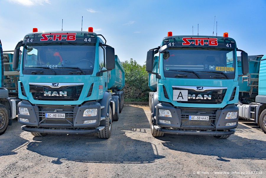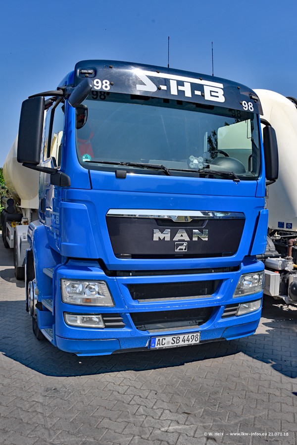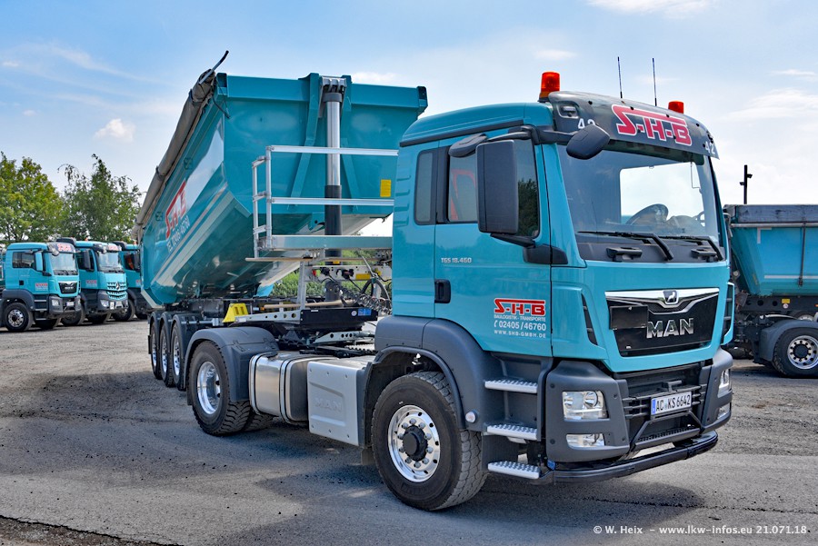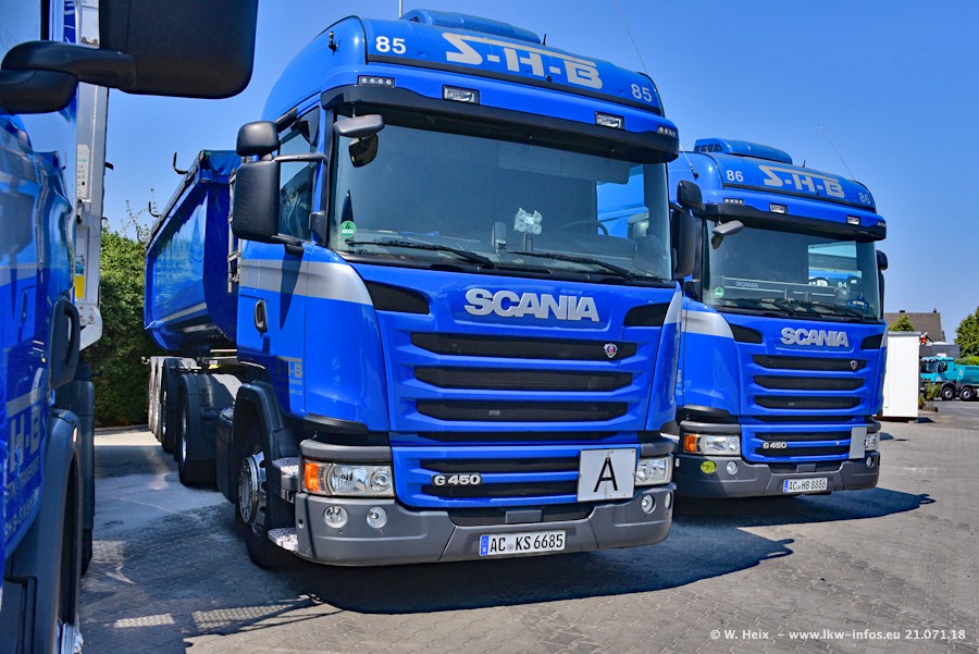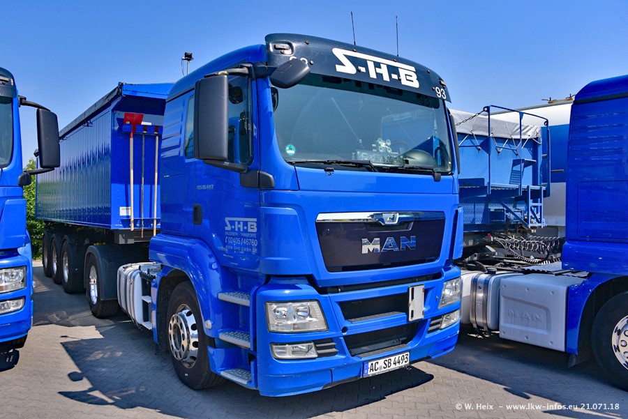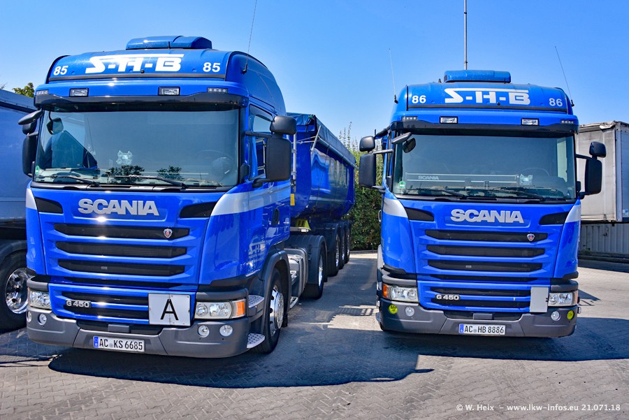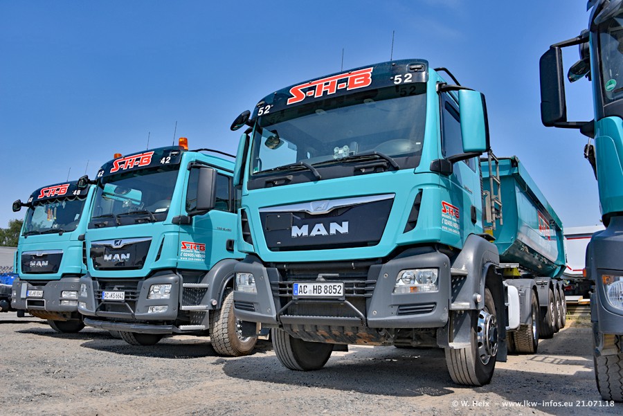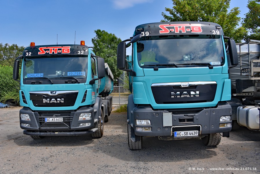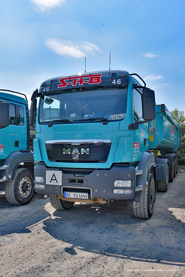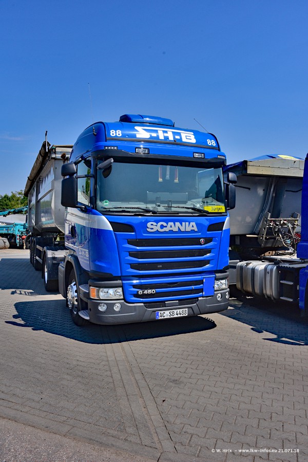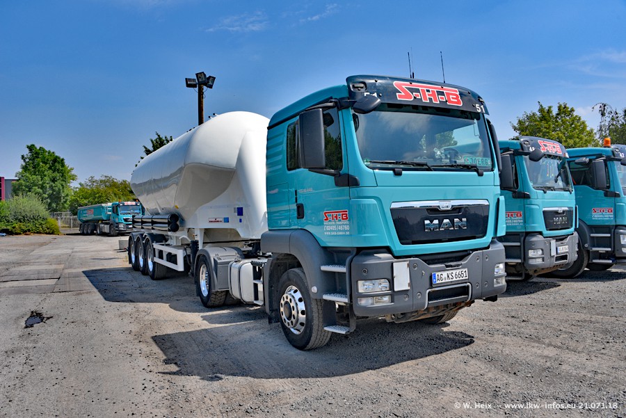 Seit meinem letzten Besuch bei SHB im März 2017 sind so einige neue LKW gekommen, die den Furhpark modernisieren bzw. alte Fahrzeuge ersetzt haben. Das sind bei den dunkelblauen LKW alle Mercedes-Benz Arocs/Antos/Actros. Passend dazu gibt es auch mehrere neue Kippauflieger. Bei den hellblauen LKW gibt es einige neue MAN TGX Euro 6 der aktuellen Generation und ab Montag (23.07.) wird ein Mercedes-Benz Arocs 8x4 auf der Straße sein. Der Fuhrpark war fast komplett zuhause.