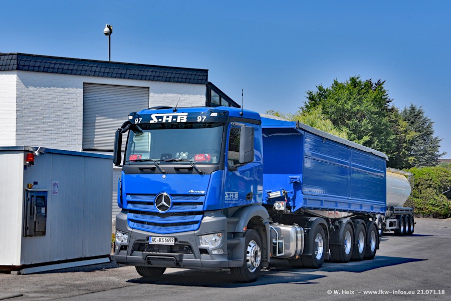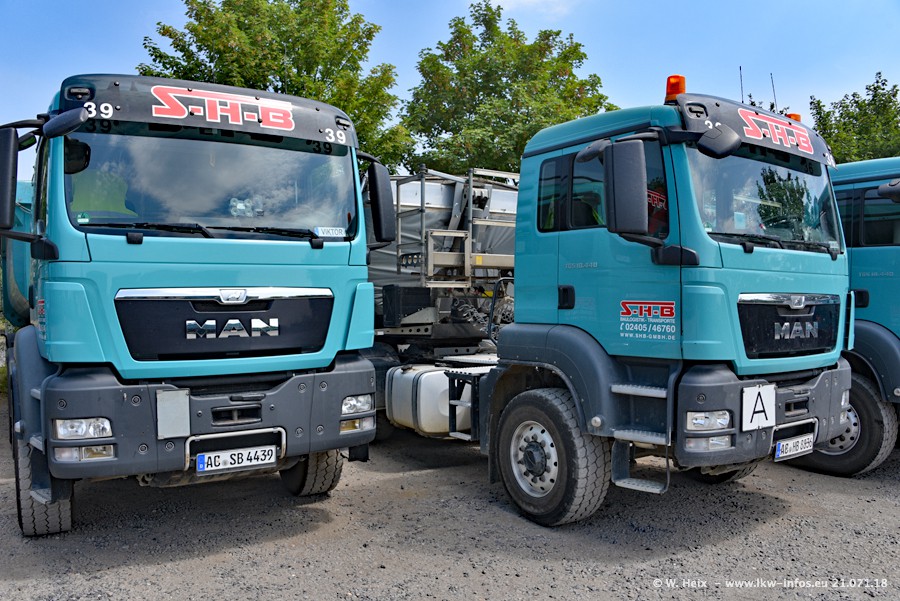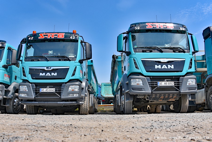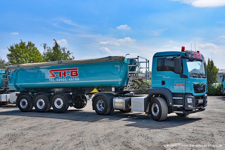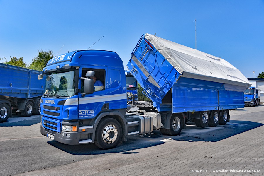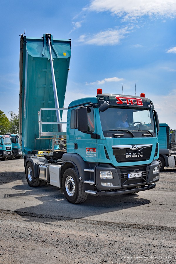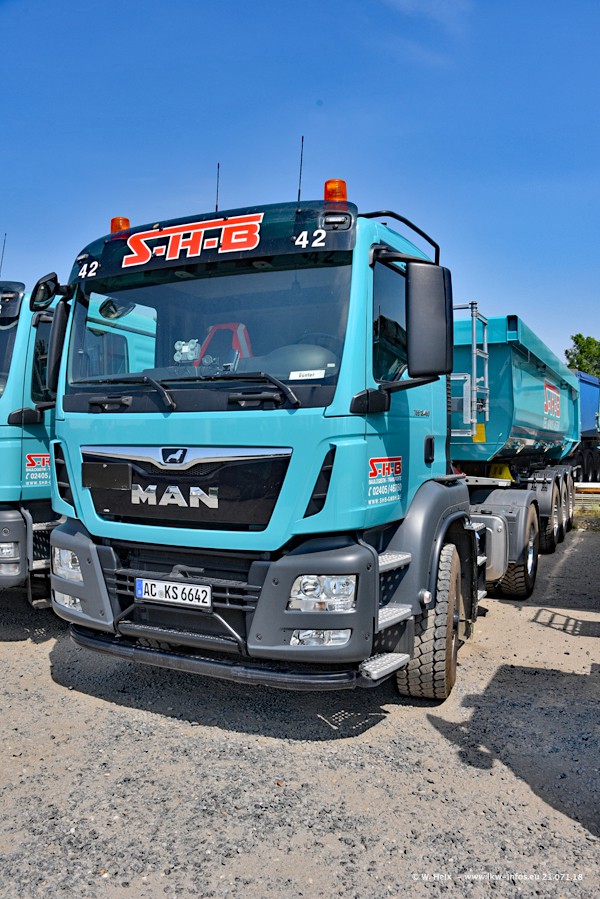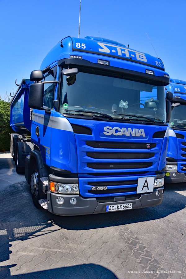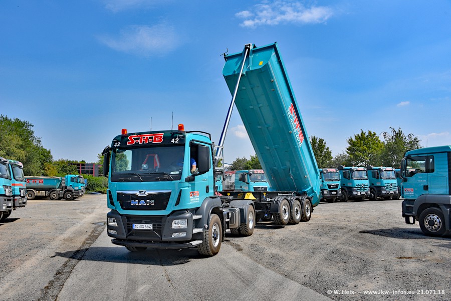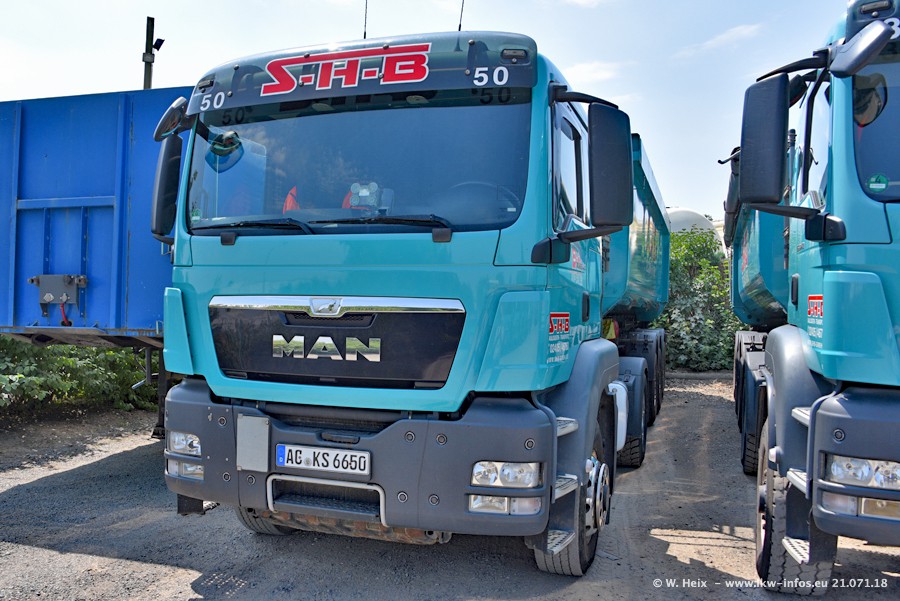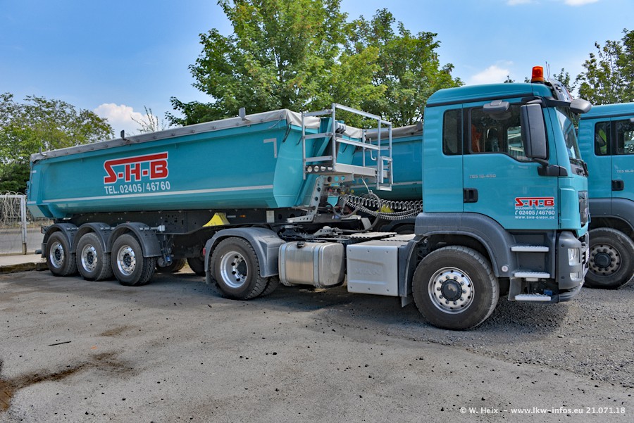 Seit meinem letzten Besuch bei SHB im März 2017 sind so einige neue LKW gekommen, die den Furhpark modernisieren bzw. alte Fahrzeuge ersetzt haben. Das sind bei den dunkelblauen LKW alle Mercedes-Benz Arocs/Antos/Actros. Passend dazu gibt es auch mehrere neue Kippauflieger. Bei den hellblauen LKW gibt es einige neue MAN TGX Euro 6 der aktuellen Generation und ab Montag (23.07.) wird ein Mercedes-Benz Arocs 8x4 auf der Straße sein. Der Fuhrpark war fast komplett zuhause.