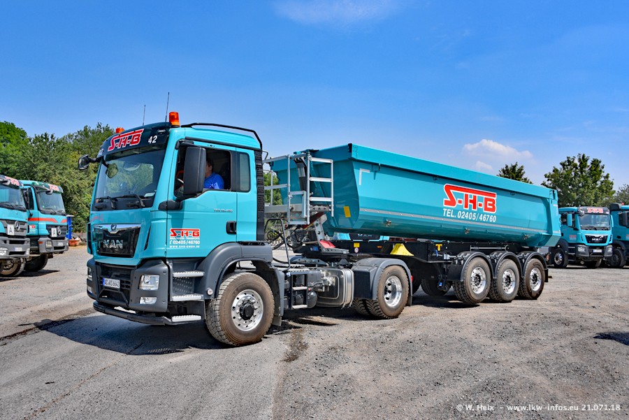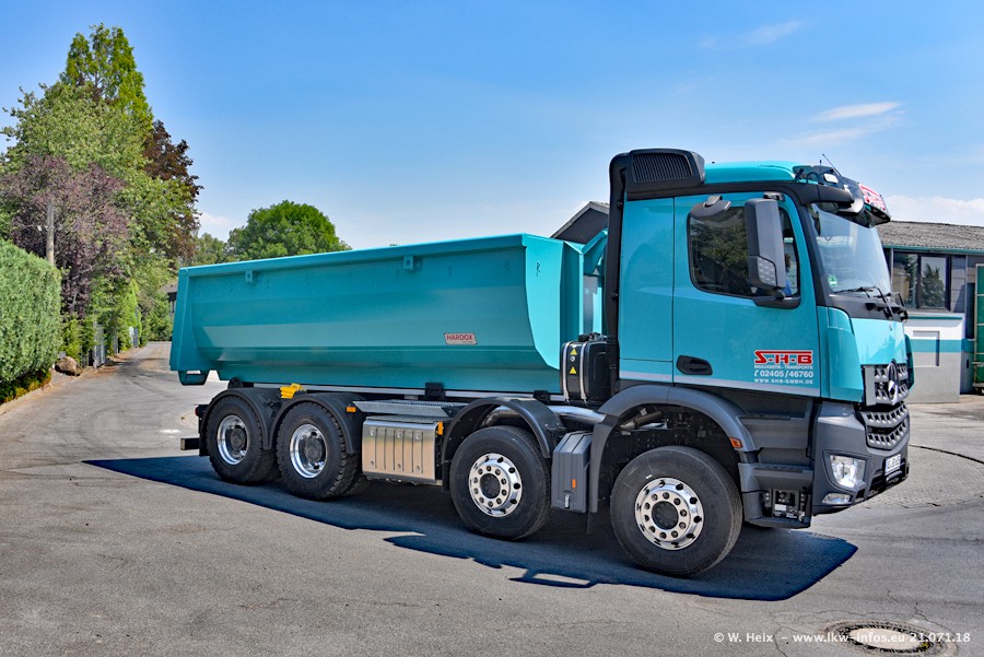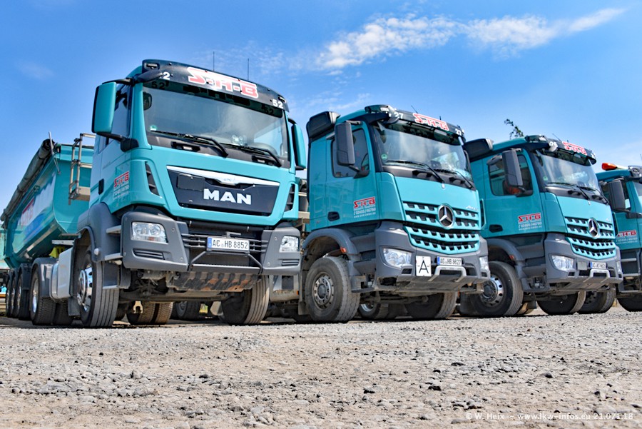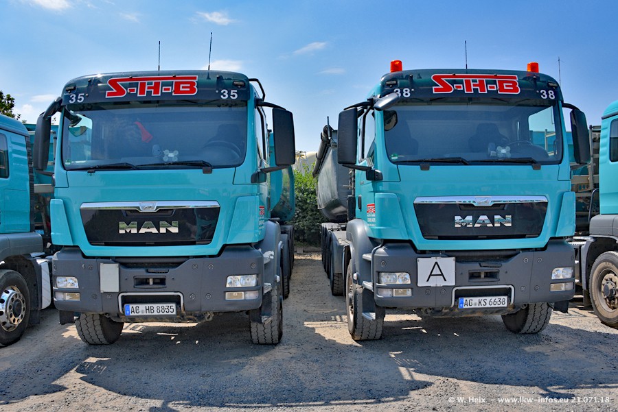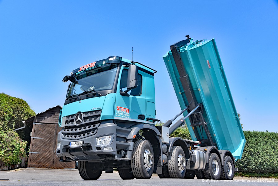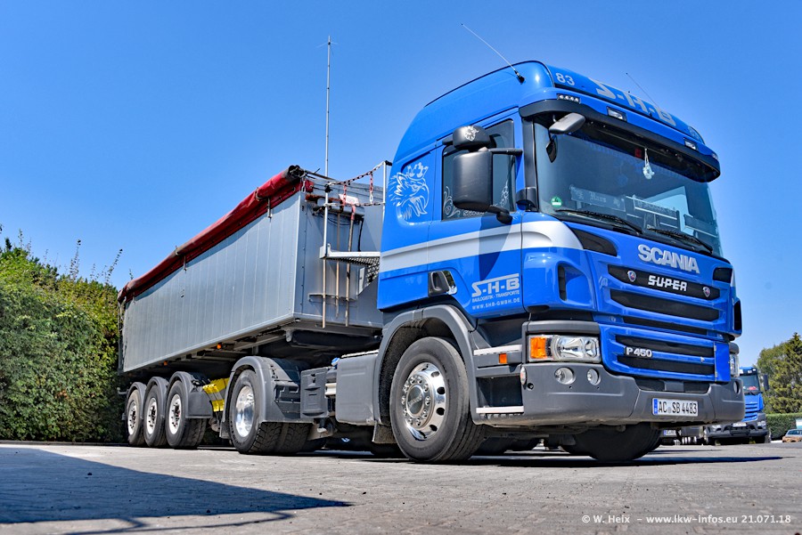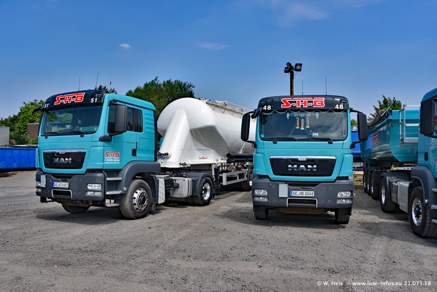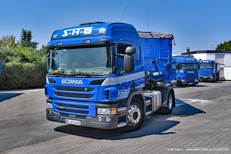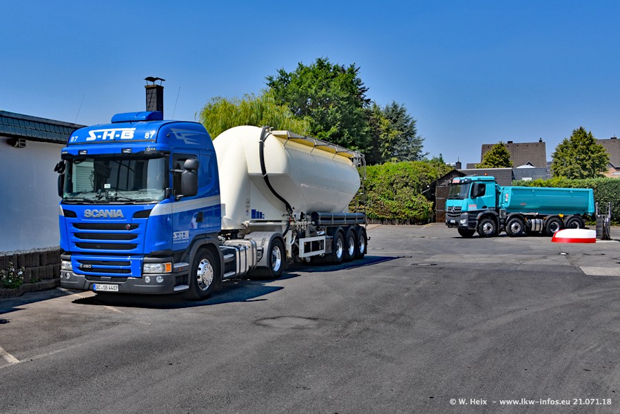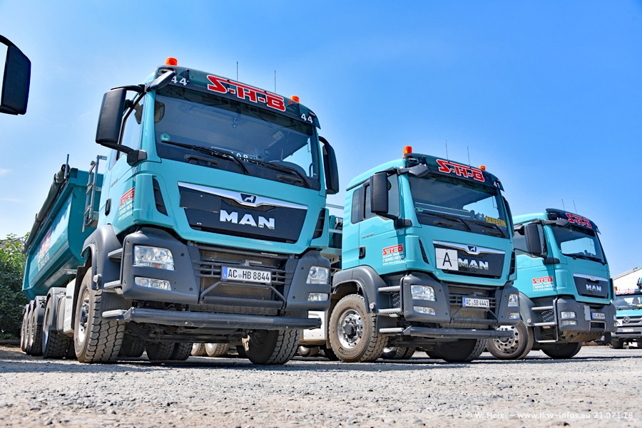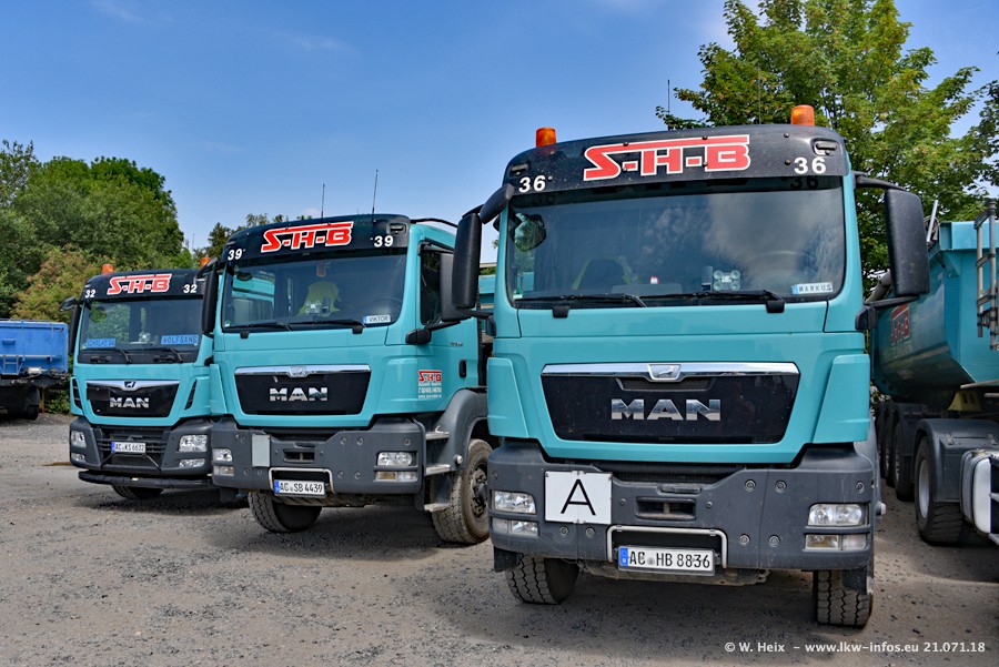 Seit meinem letzten Besuch bei SHB im März 2017 sind so einige neue LKW gekommen, die den Furhpark modernisieren bzw. alte Fahrzeuge ersetzt haben. Das sind bei den dunkelblauen LKW alle Mercedes-Benz Arocs/Antos/Actros. Passend dazu gibt es auch mehrere neue Kippauflieger. Bei den hellblauen LKW gibt es einige neue MAN TGX Euro 6 der aktuellen Generation und ab Montag (23.07.) wird ein Mercedes-Benz Arocs 8x4 auf der Straße sein. Der Fuhrpark war fast komplett zuhause.