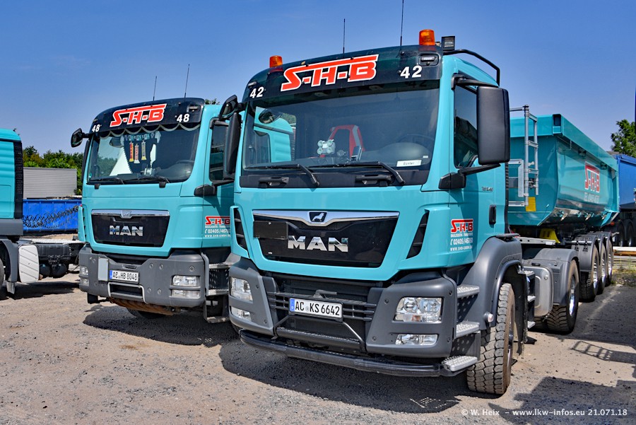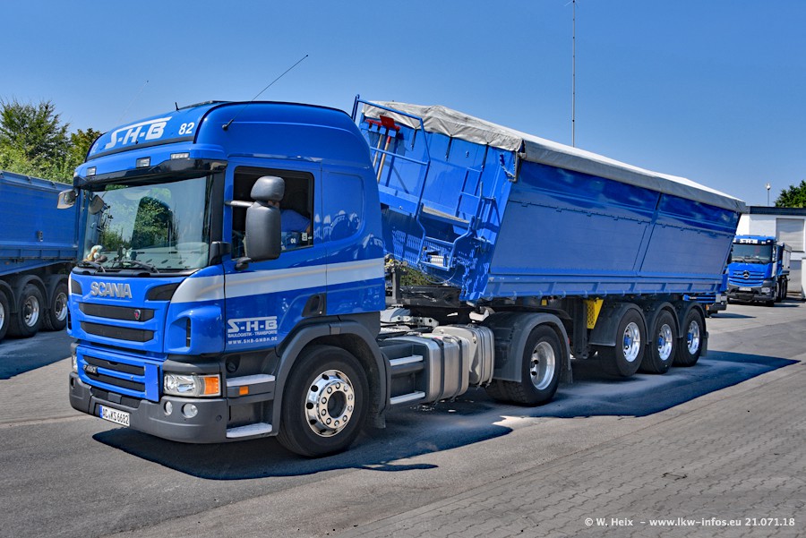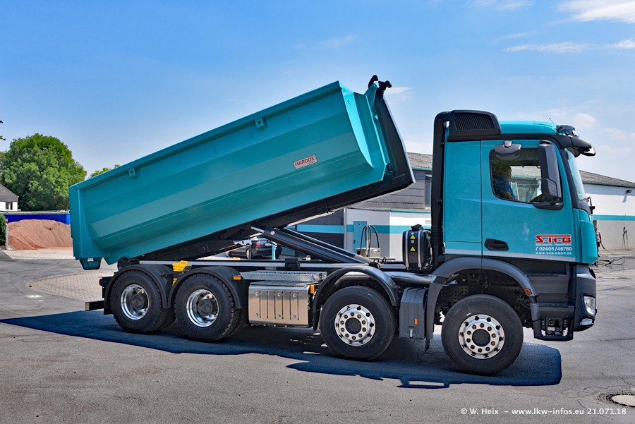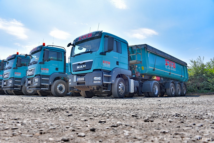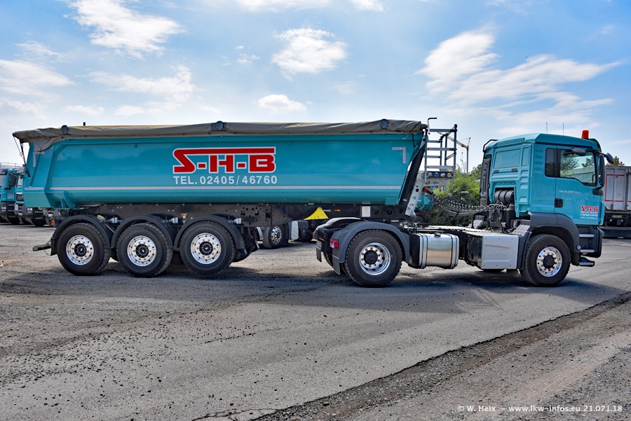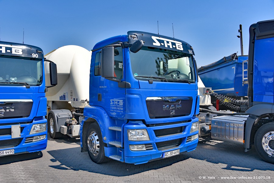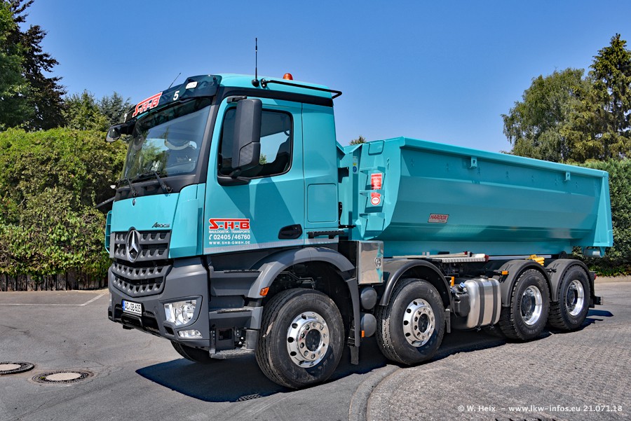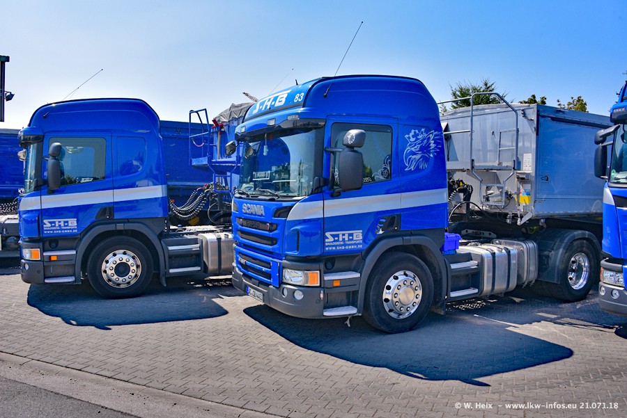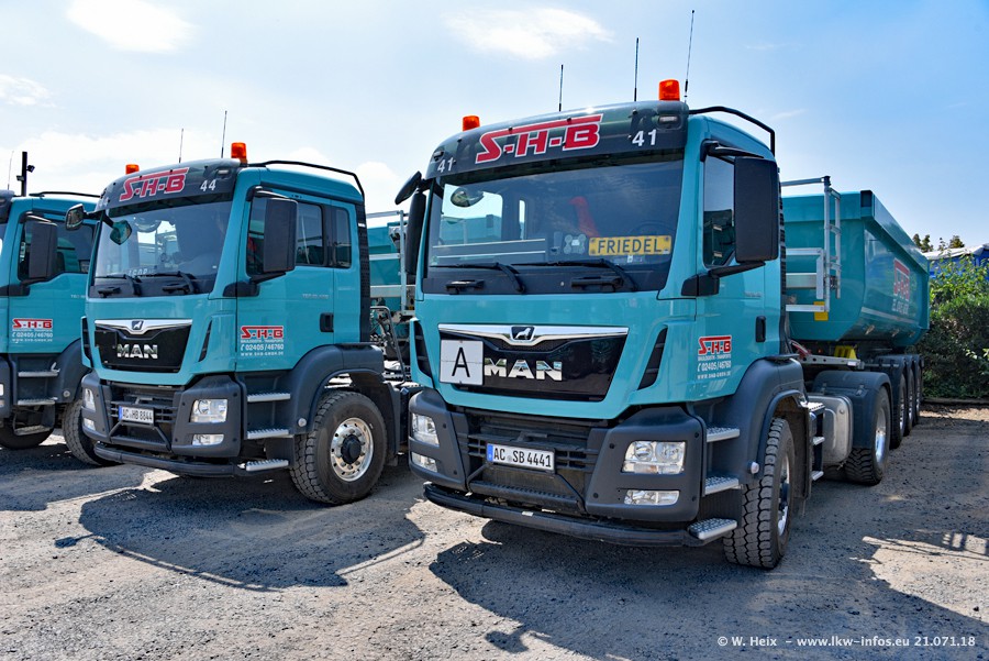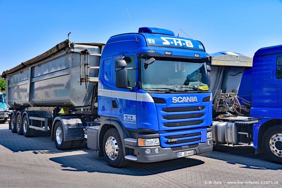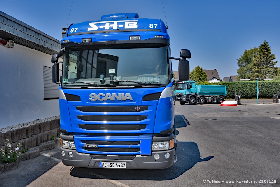 Seit meinem letzten Besuch bei SHB im März 2017 sind so einige neue LKW gekommen, die den Furhpark modernisieren bzw. alte Fahrzeuge ersetzt haben. Das sind bei den dunkelblauen LKW alle Mercedes-Benz Arocs/Antos/Actros. Passend dazu gibt es auch mehrere neue Kippauflieger. Bei den hellblauen LKW gibt es einige neue MAN TGX Euro 6 der aktuellen Generation und ab Montag (23.07.) wird ein Mercedes-Benz Arocs 8x4 auf der Straße sein. Der Fuhrpark war fast komplett zuhause.