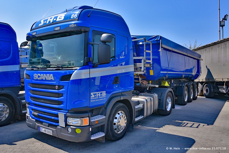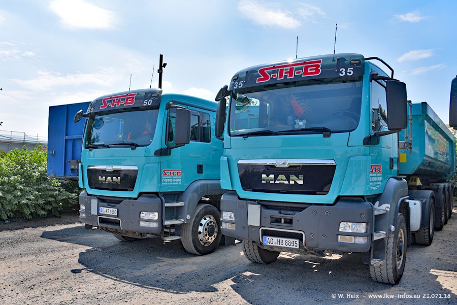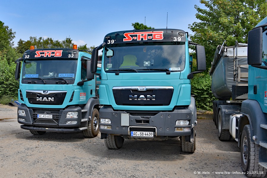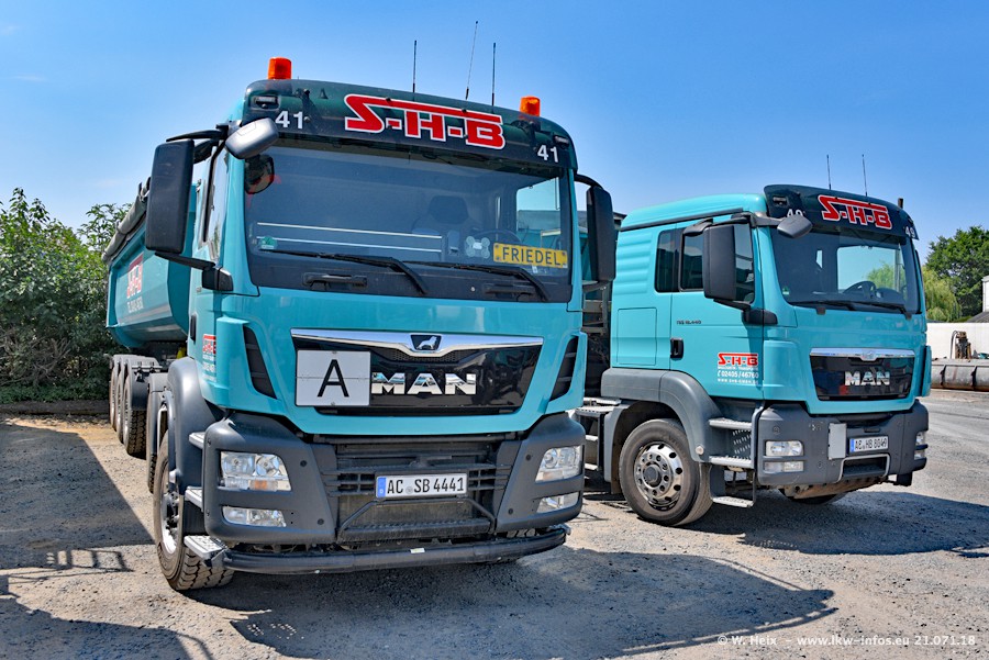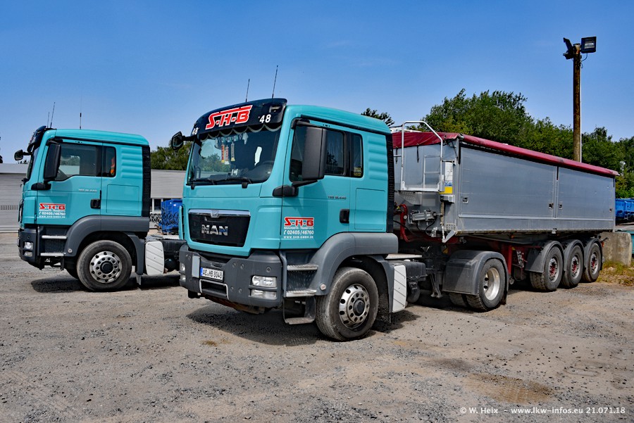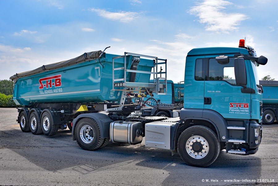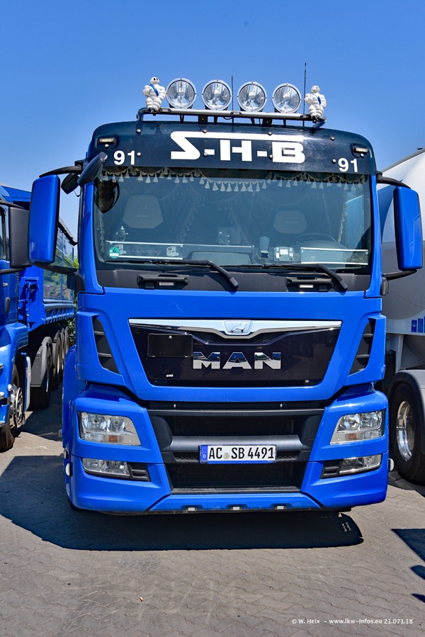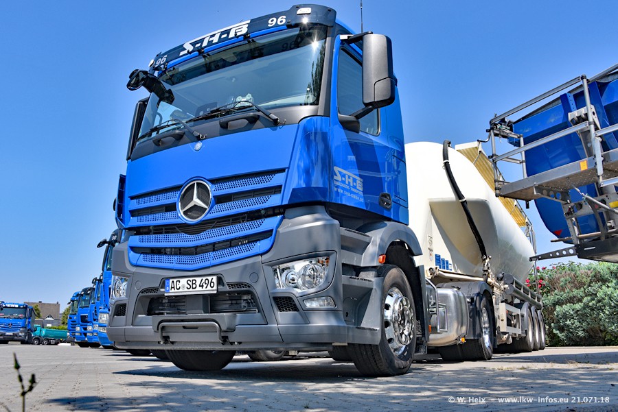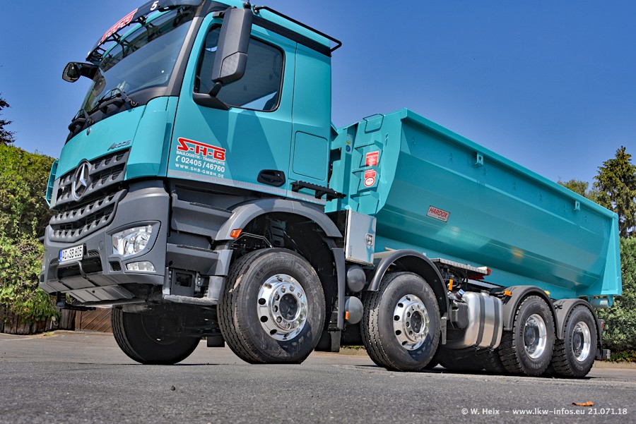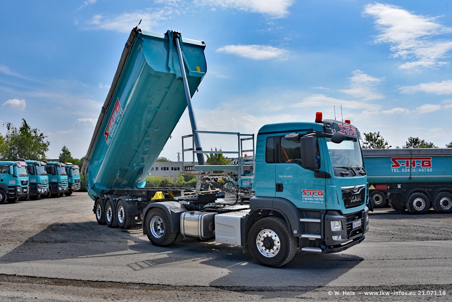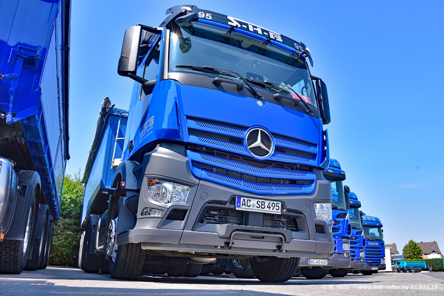 Seit meinem letzten Besuch bei SHB im März 2017 sind so einige neue LKW gekommen, die den Furhpark modernisieren bzw. alte Fahrzeuge ersetzt haben. Das sind bei den dunkelblauen LKW alle Mercedes-Benz Arocs/Antos/Actros. Passend dazu gibt es auch mehrere neue Kippauflieger. Bei den hellblauen LKW gibt es einige neue MAN TGX Euro 6 der aktuellen Generation und ab Montag (23.07.) wird ein Mercedes-Benz Arocs 8x4 auf der Straße sein. Der Fuhrpark war fast komplett zuhause.