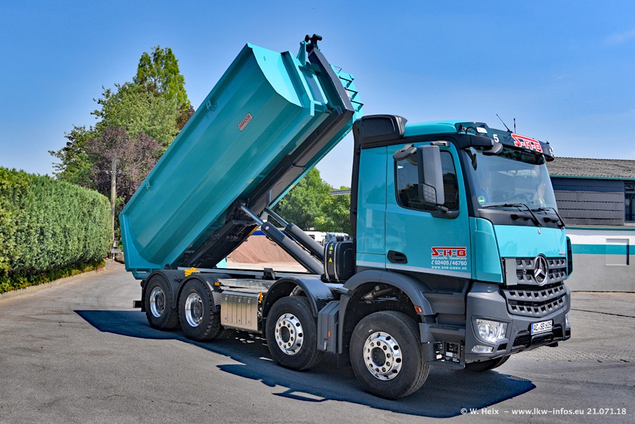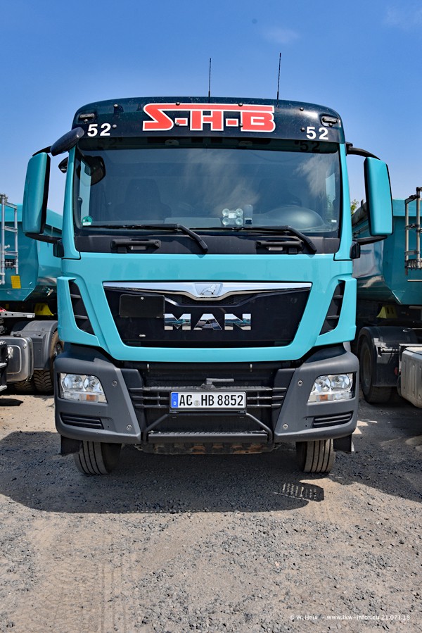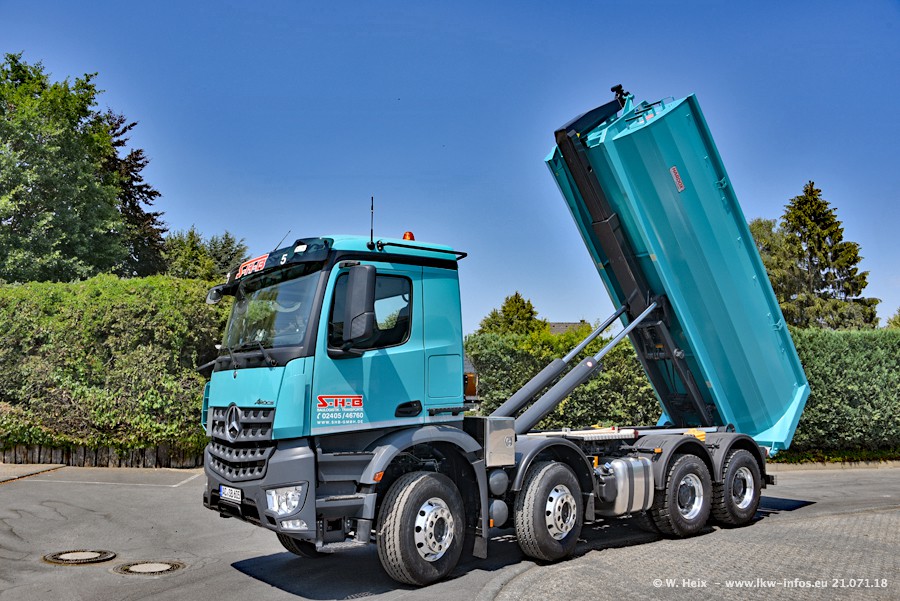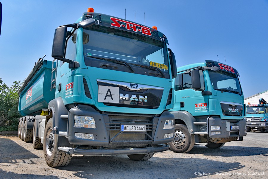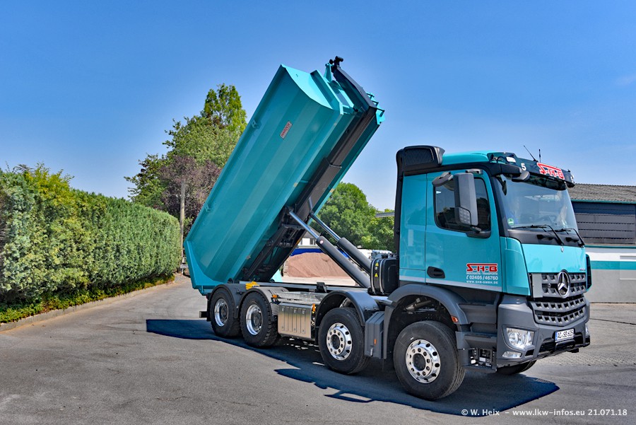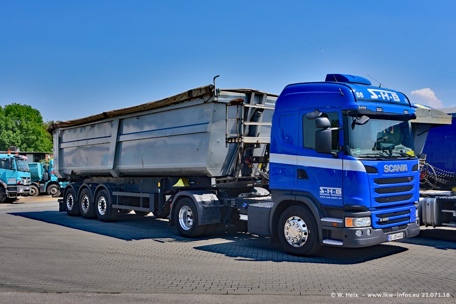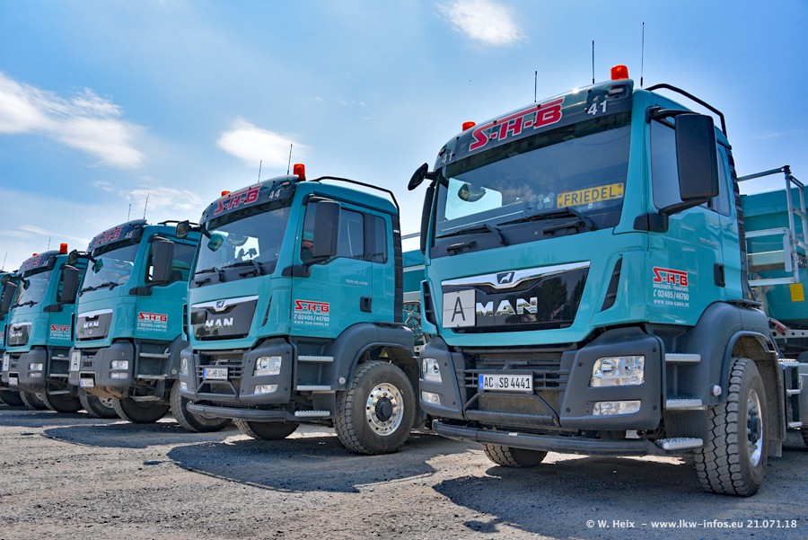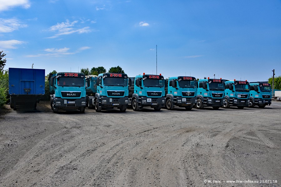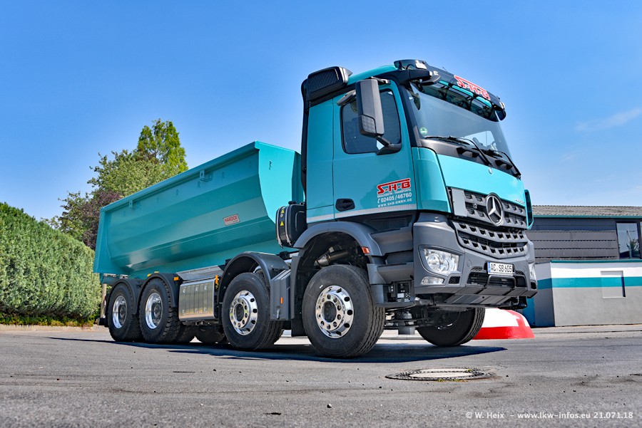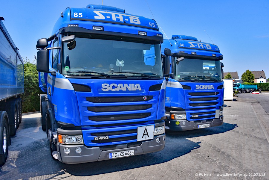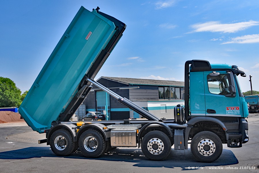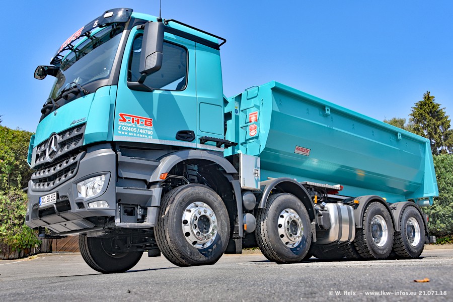 Seit meinem letzten Besuch bei SHB im März 2017 sind so einige neue LKW gekommen, die den Furhpark modernisieren bzw. alte Fahrzeuge ersetzt haben. Das sind bei den dunkelblauen LKW alle Mercedes-Benz Arocs/Antos/Actros. Passend dazu gibt es auch mehrere neue Kippauflieger. Bei den hellblauen LKW gibt es einige neue MAN TGX Euro 6 der aktuellen Generation und ab Montag (23.07.) wird ein Mercedes-Benz Arocs 8x4 auf der Straße sein. Der Fuhrpark war fast komplett zuhause.