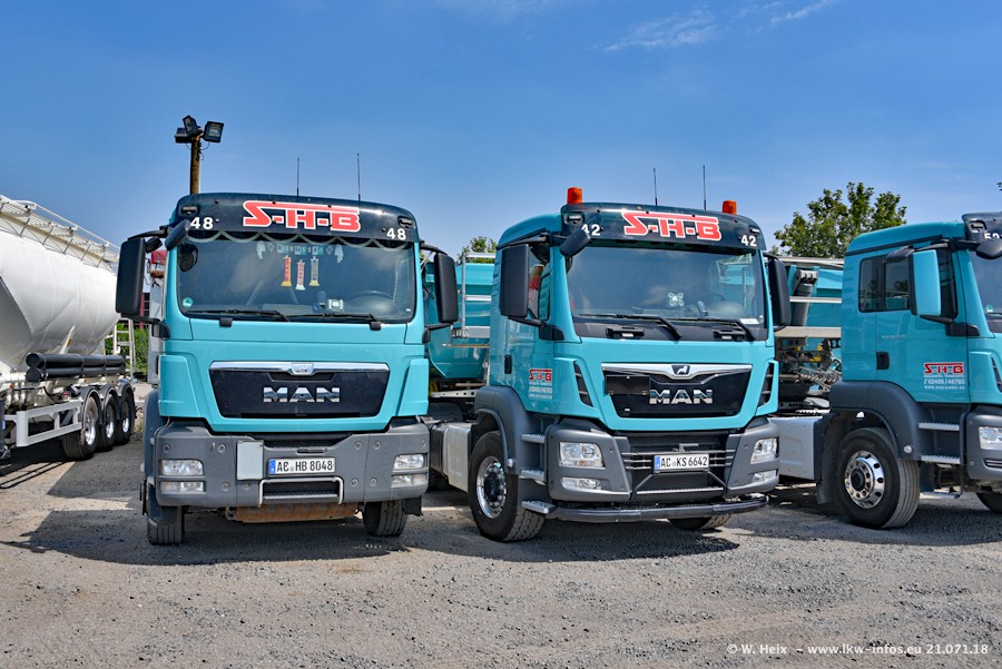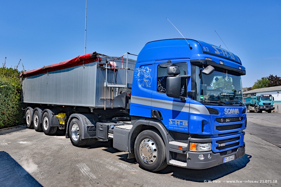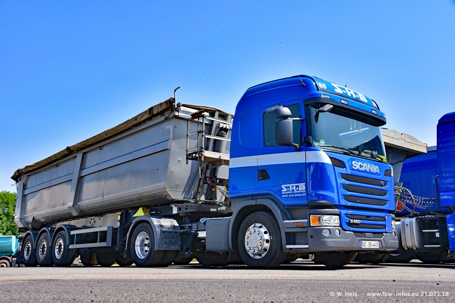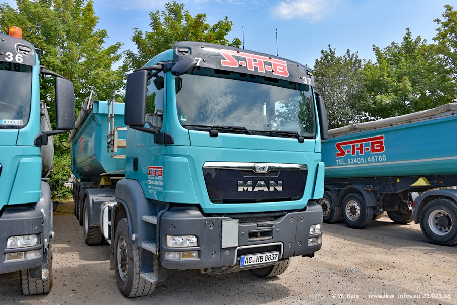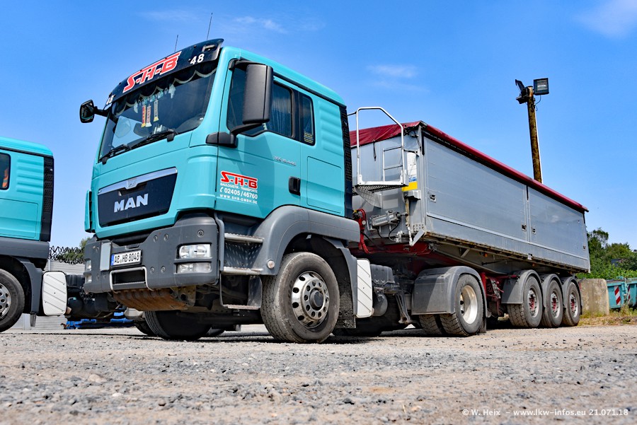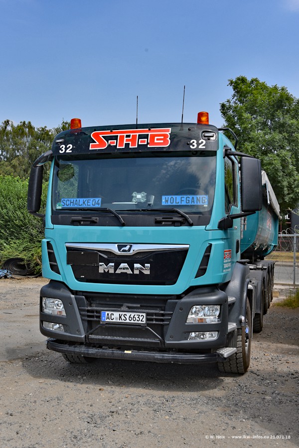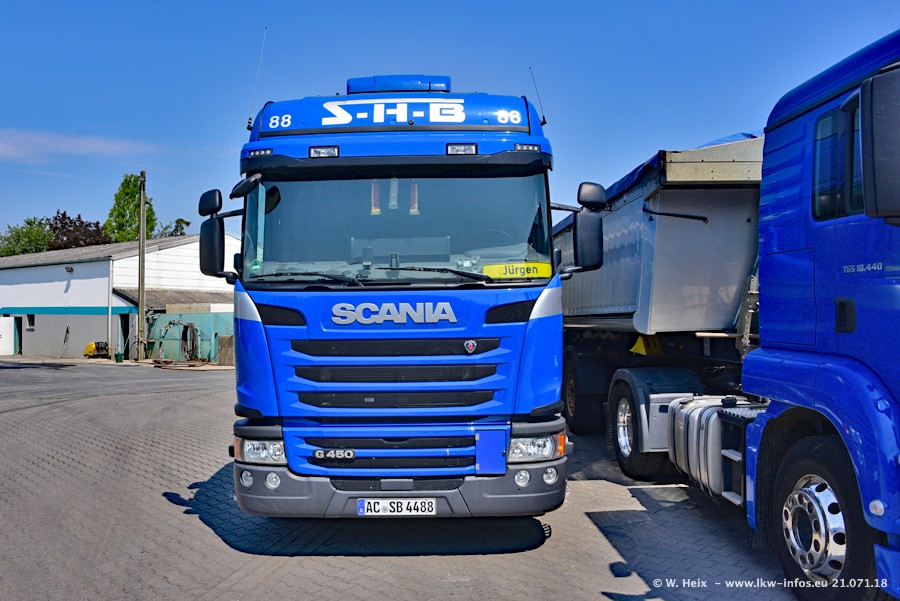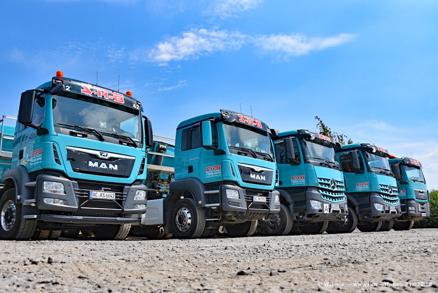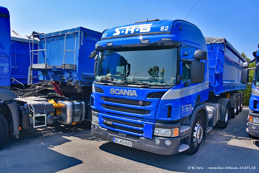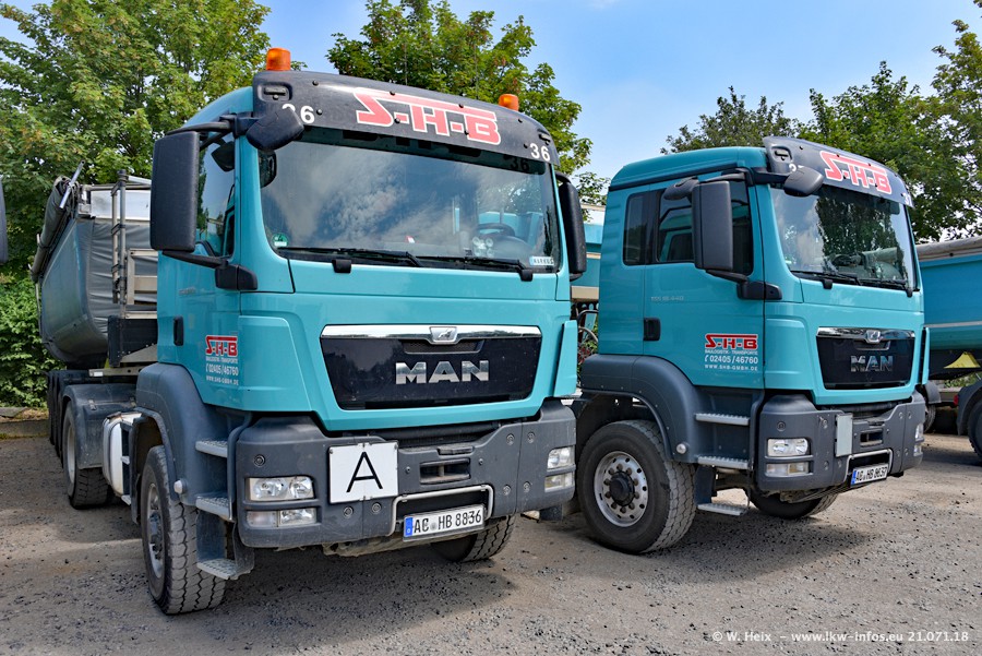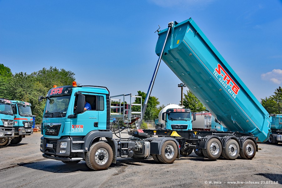 Seit meinem letzten Besuch bei SHB im März 2017 sind so einige neue LKW gekommen, die den Furhpark modernisieren bzw. alte Fahrzeuge ersetzt haben. Das sind bei den dunkelblauen LKW alle Mercedes-Benz Arocs/Antos/Actros. Passend dazu gibt es auch mehrere neue Kippauflieger. Bei den hellblauen LKW gibt es einige neue MAN TGX Euro 6 der aktuellen Generation und ab Montag (23.07.) wird ein Mercedes-Benz Arocs 8x4 auf der Straße sein. Der Fuhrpark war fast komplett zuhause.