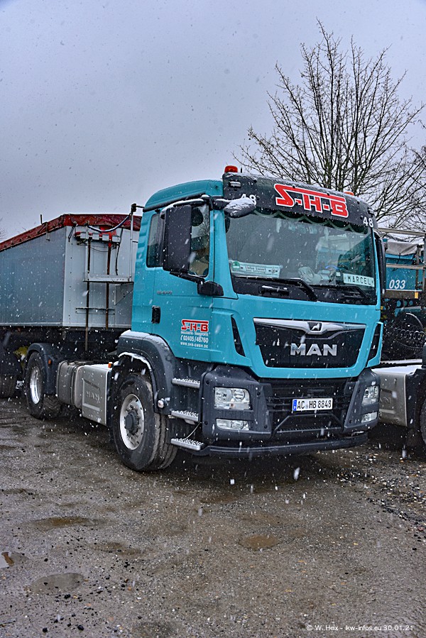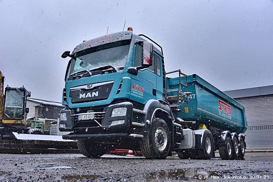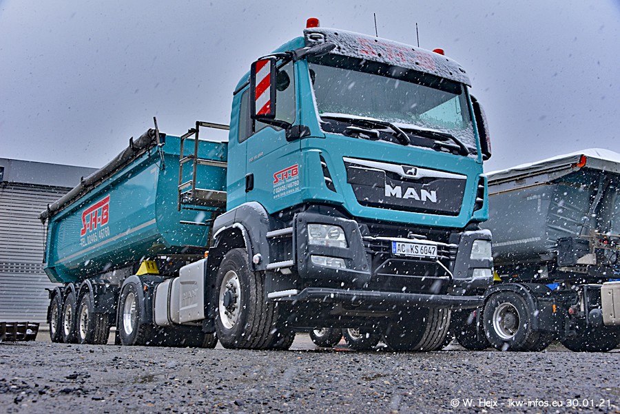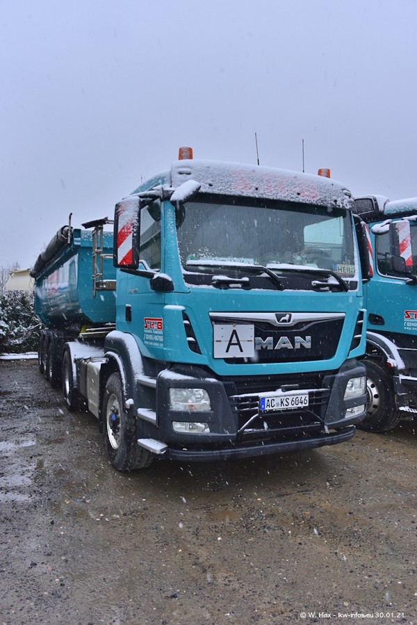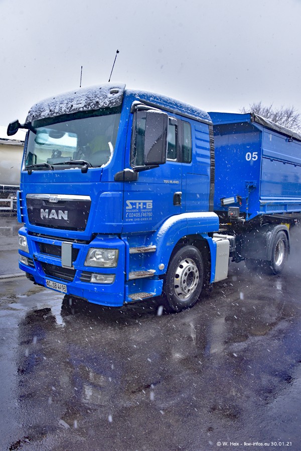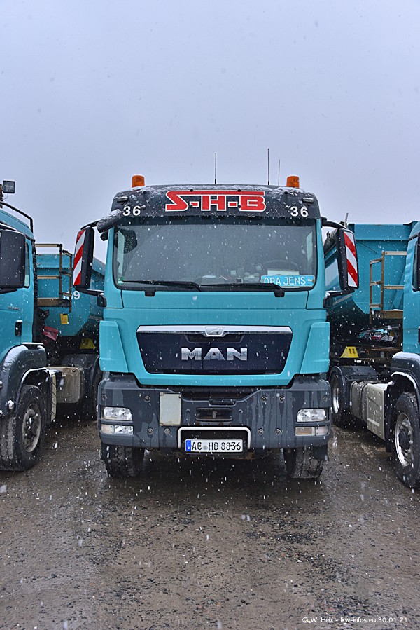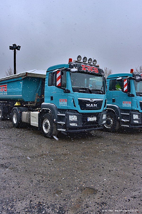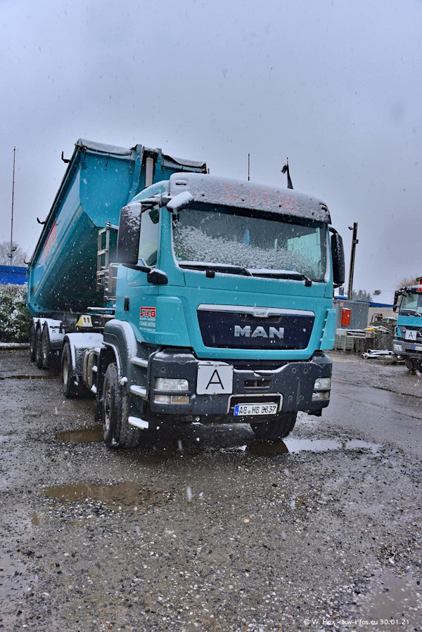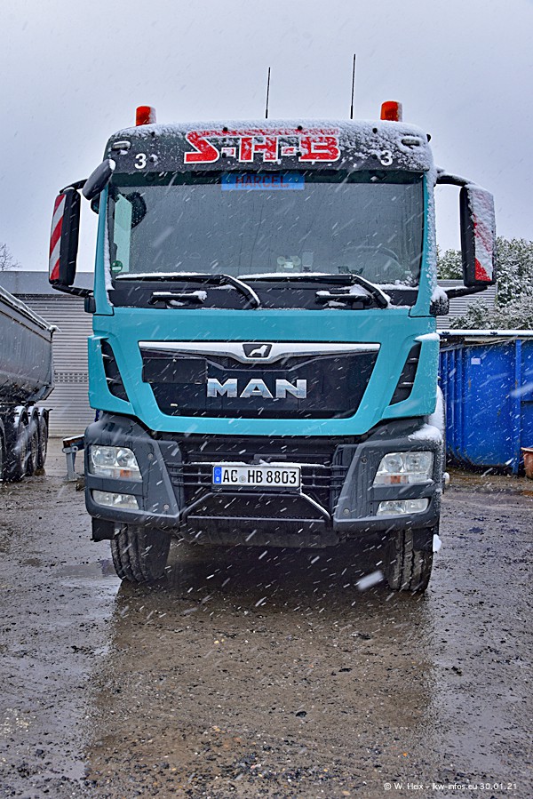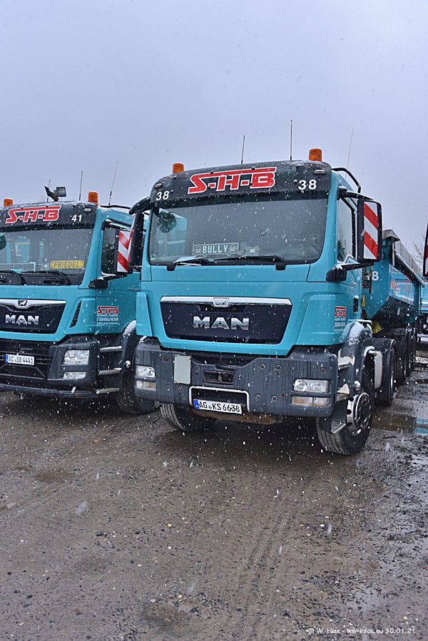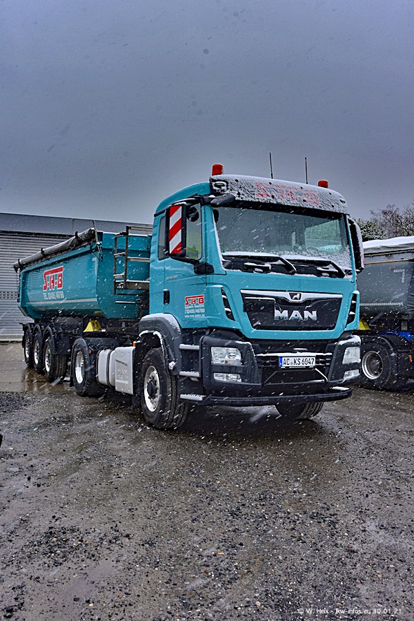 Auf dieser Fototour bin ich vom Winterwetter mit Schneefall überrascht worden. Aber trotzdem sind viele schöne Bilder entstanden, auch wenn es nass und dunkel war. Die ersten beiden von insgesamt sieben MAN TGS (alte Baureihe) standen auf dem Hof. In den nächsten Tagen kommen dann die "restlichen". Dazu gibt es auch sieben neue Kippauflieger. Alle neuen Fahrzeuge ersten alte. Wenn alle neuen LKW da sind, werde ich die Firma SHB bei besserem Wetter nochmal besuchen.