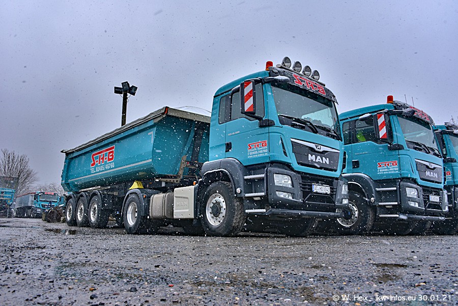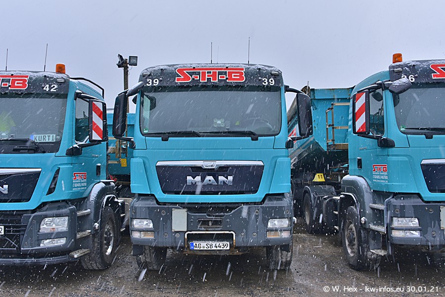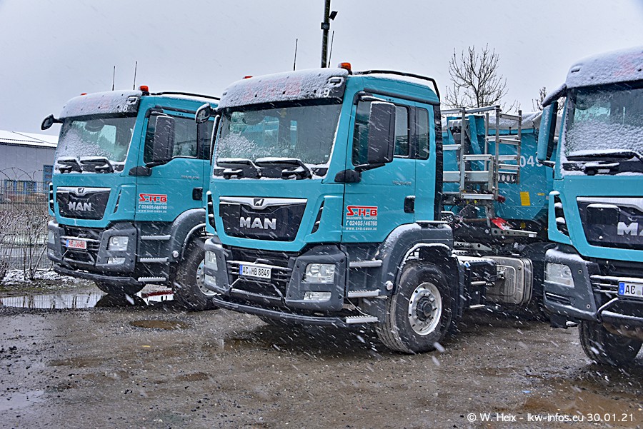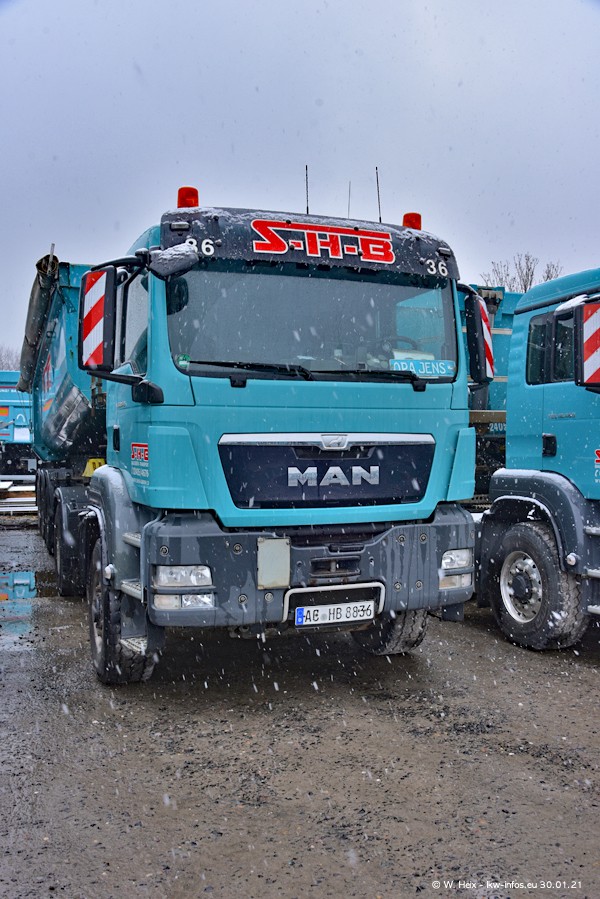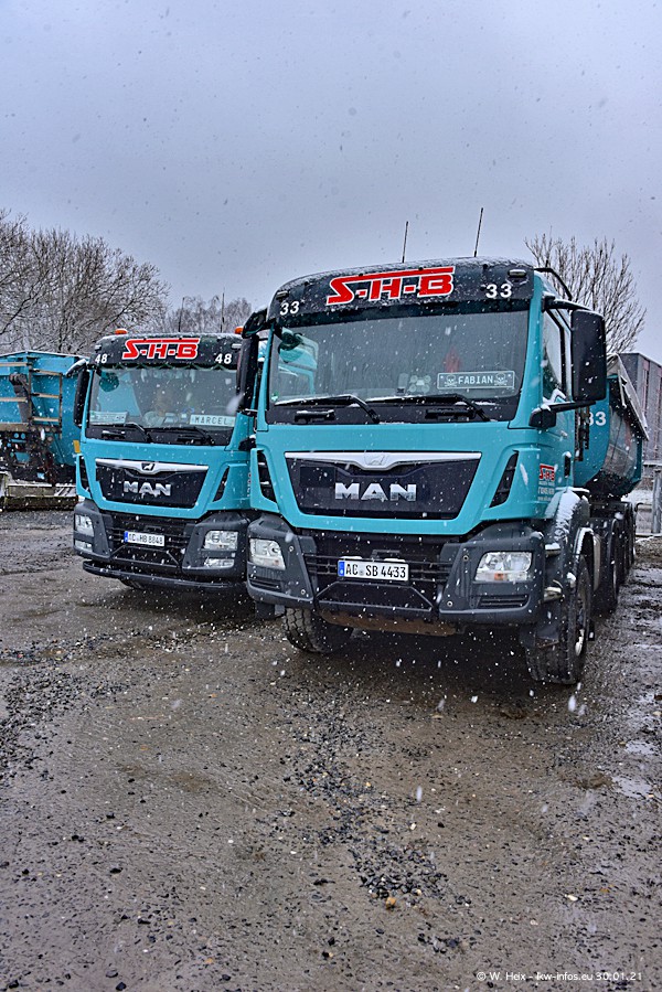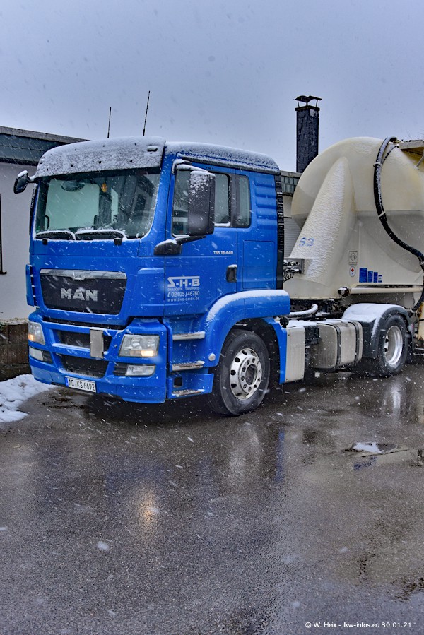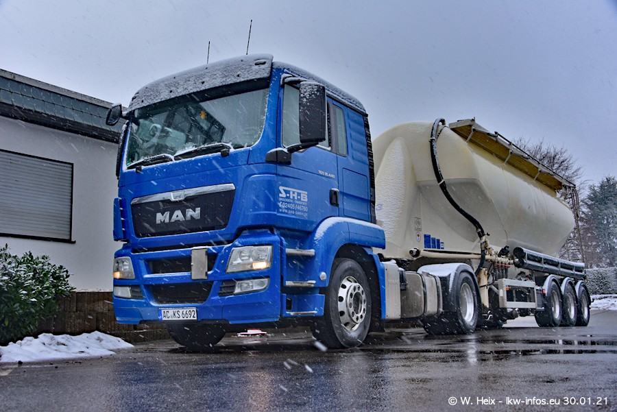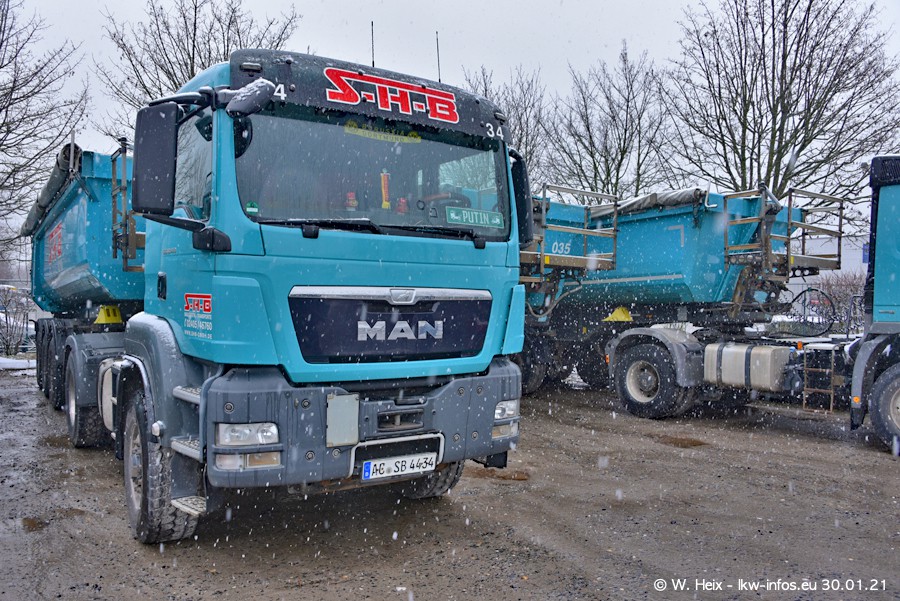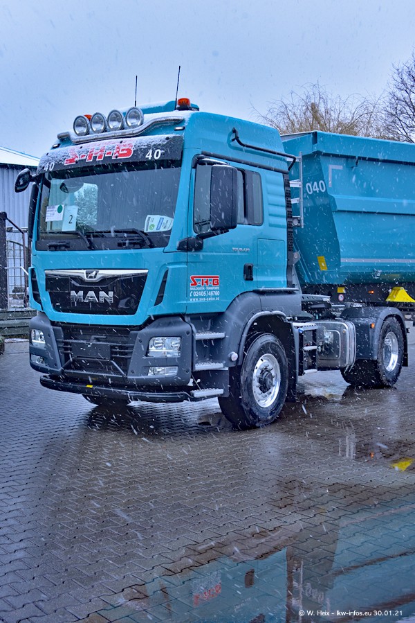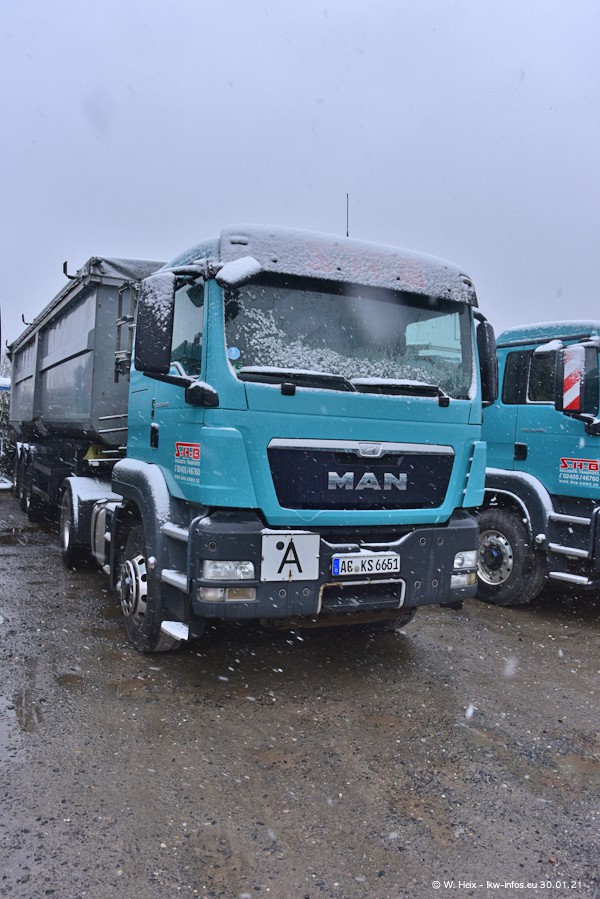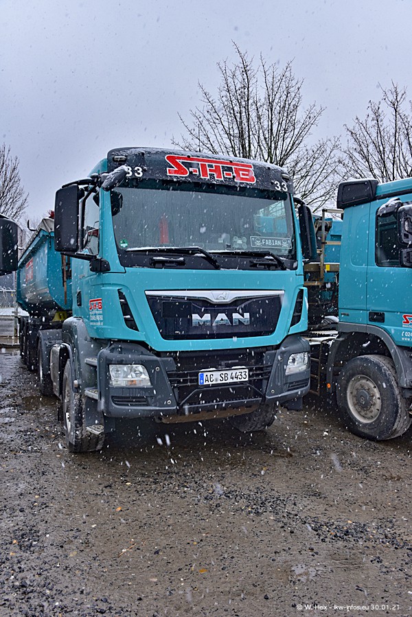 Auf dieser Fototour bin ich vom Winterwetter mit Schneefall überrascht worden. Aber trotzdem sind viele schöne Bilder entstanden, auch wenn es nass und dunkel war. Die ersten beiden von insgesamt sieben MAN TGS (alte Baureihe) standen auf dem Hof. In den nächsten Tagen kommen dann die "restlichen". Dazu gibt es auch sieben neue Kippauflieger. Alle neuen Fahrzeuge ersten alte. Wenn alle neuen LKW da sind, werde ich die Firma SHB bei besserem Wetter nochmal besuchen.