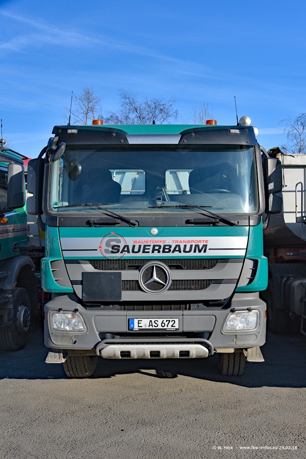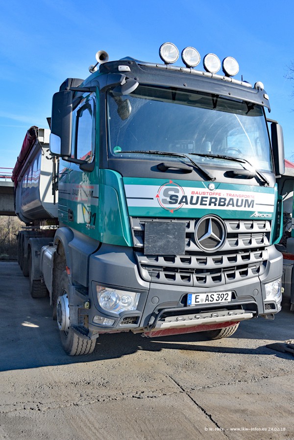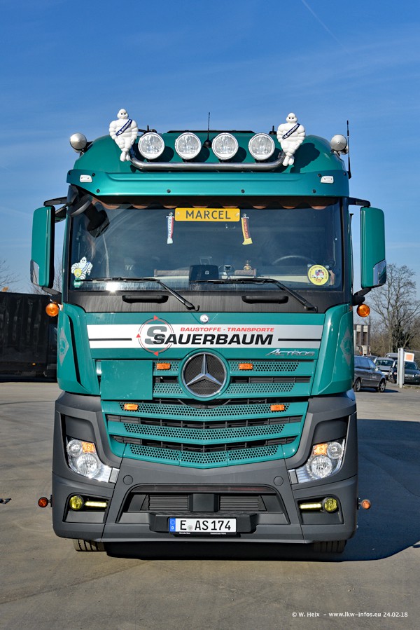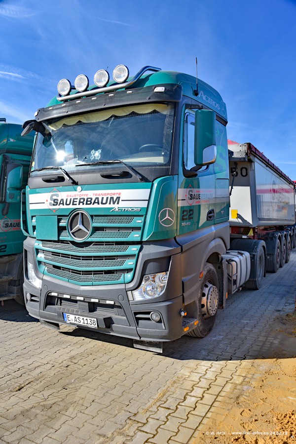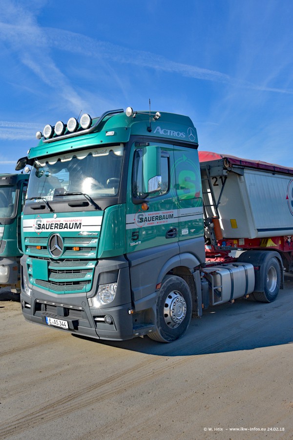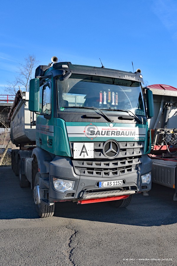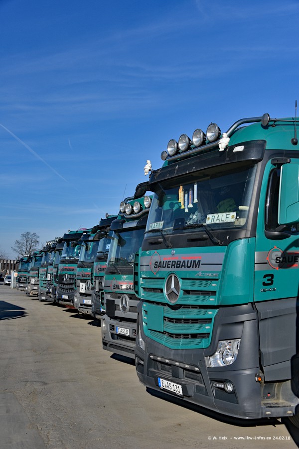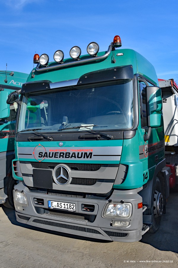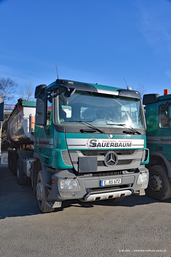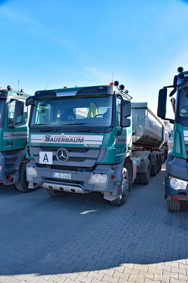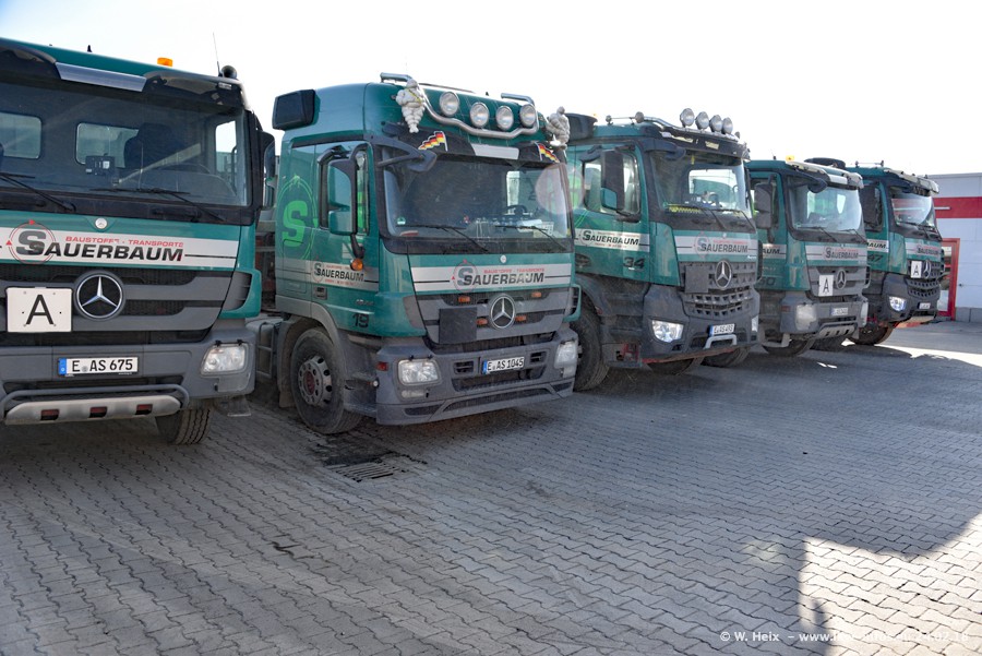 Der Fuhrpark von Sauerbaum besteht aus rund 50 LKW. Das sind 2 MAN TGS Euro 6 und alle anderen Fahrzeuge sind von Mercedes-Benz: Actros 3 und 4 sowie Arocs bei den Allrad-Zugmaschinen.