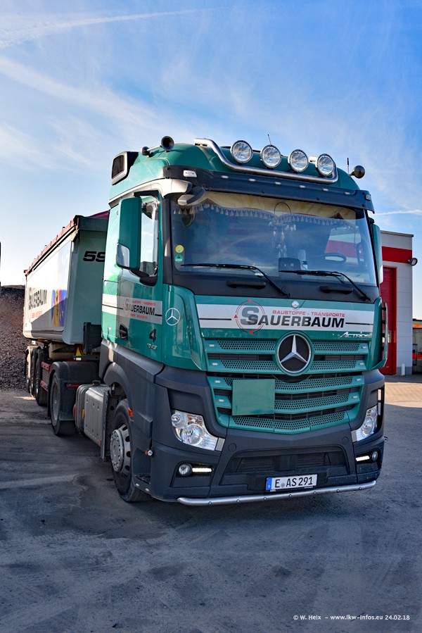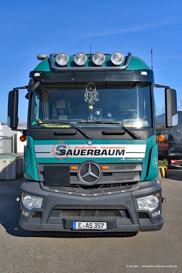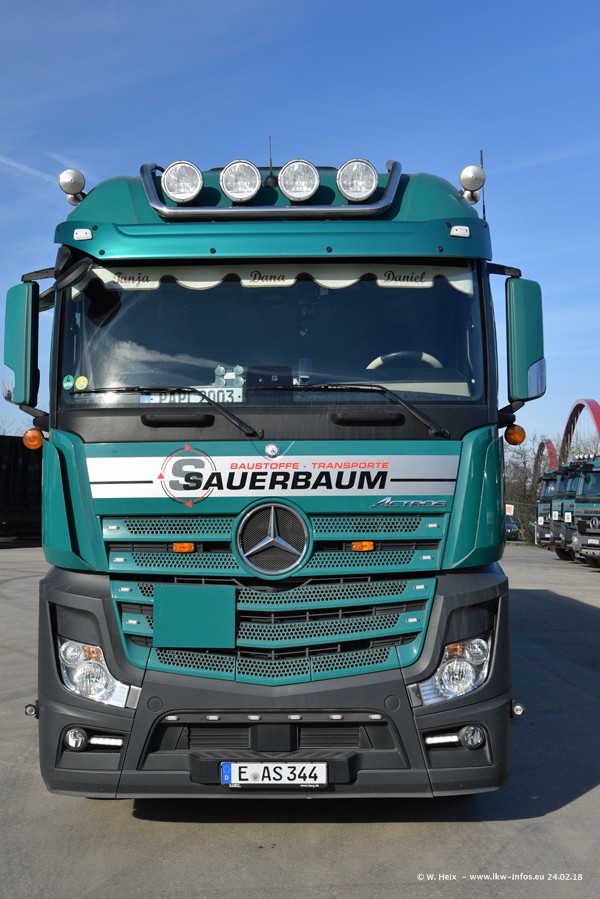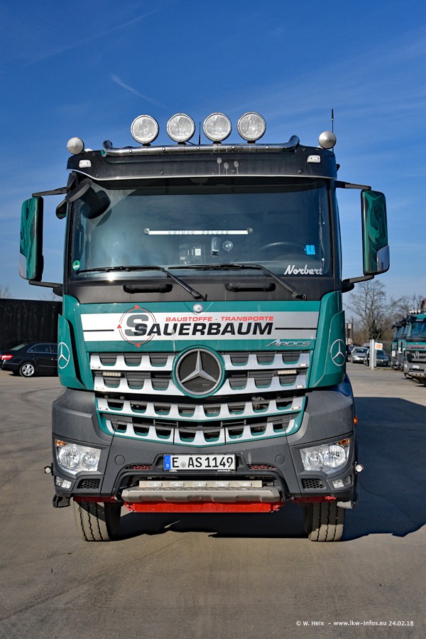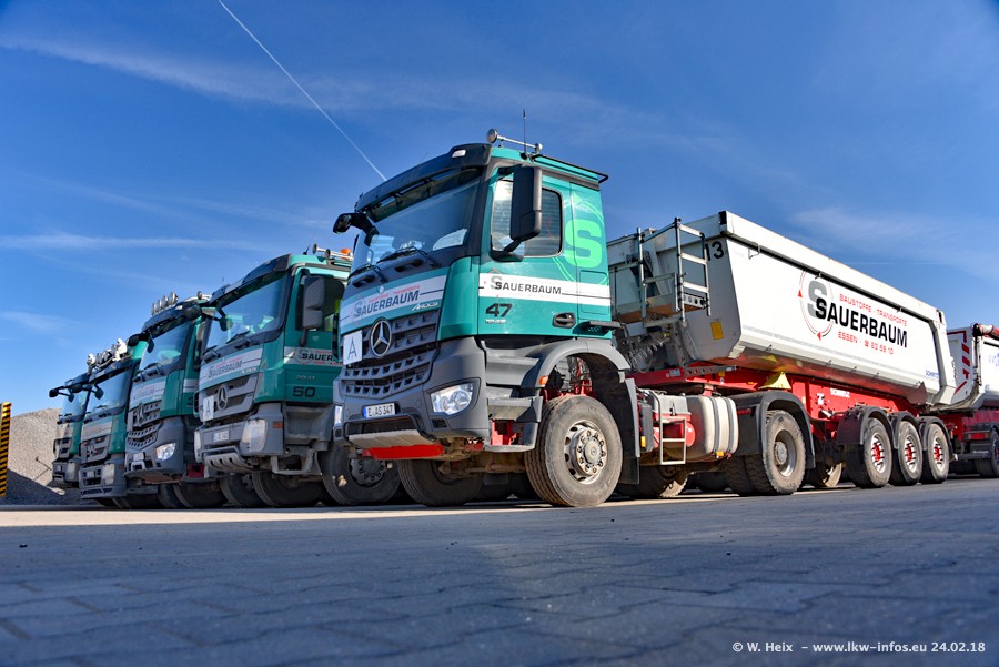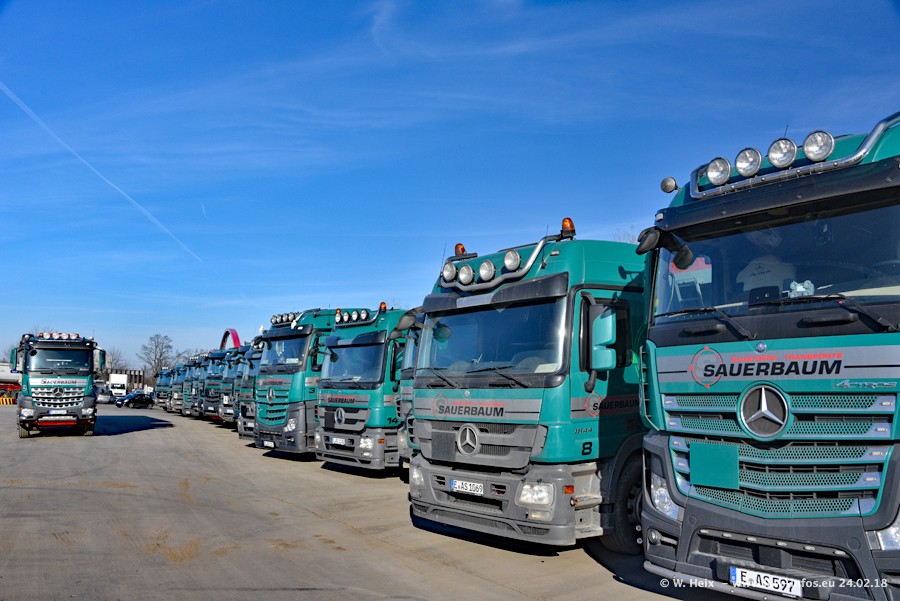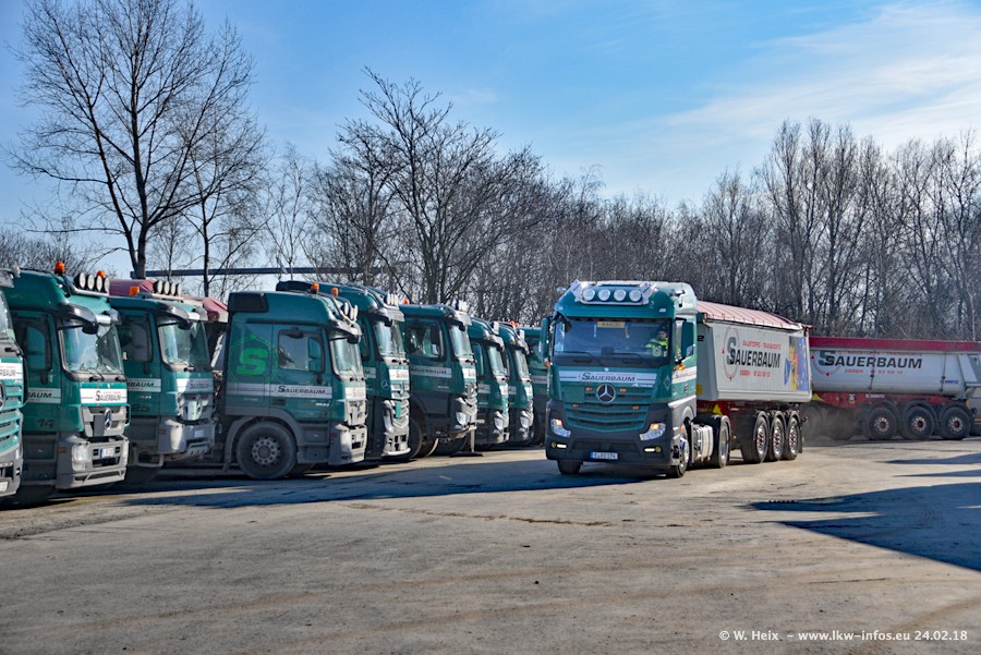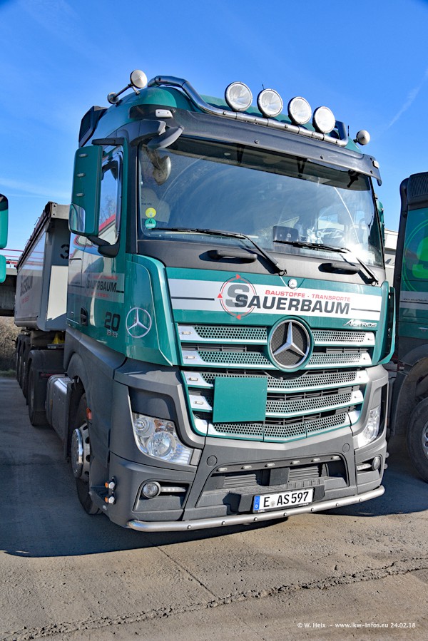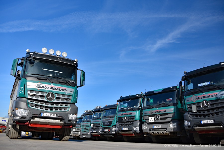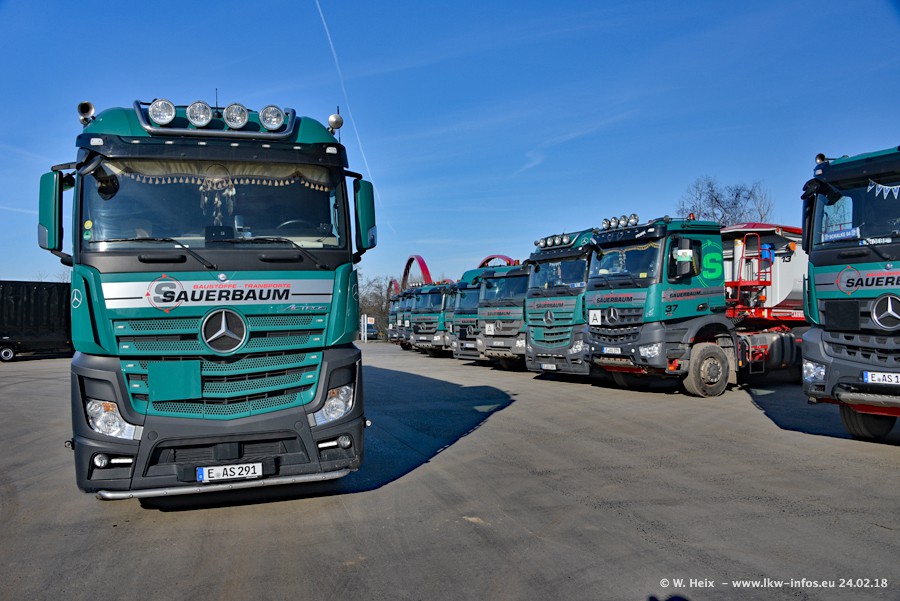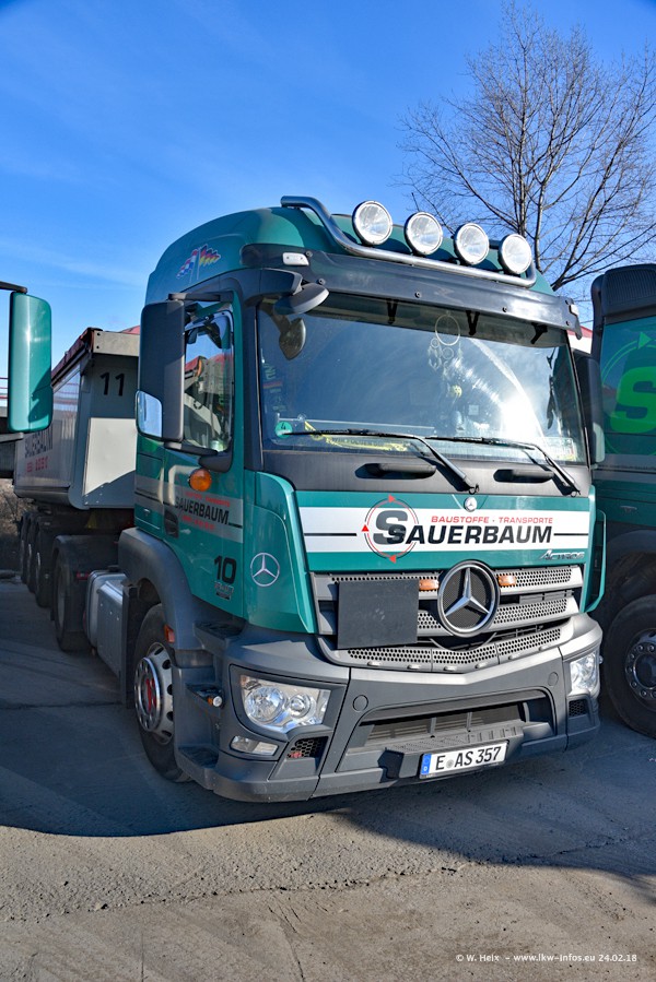 Der Fuhrpark von Sauerbaum besteht aus rund 50 LKW. Das sind 2 MAN TGS Euro 6 und alle anderen Fahrzeuge sind von Mercedes-Benz: Actros 3 und 4 sowie Arocs bei den Allrad-Zugmaschinen.