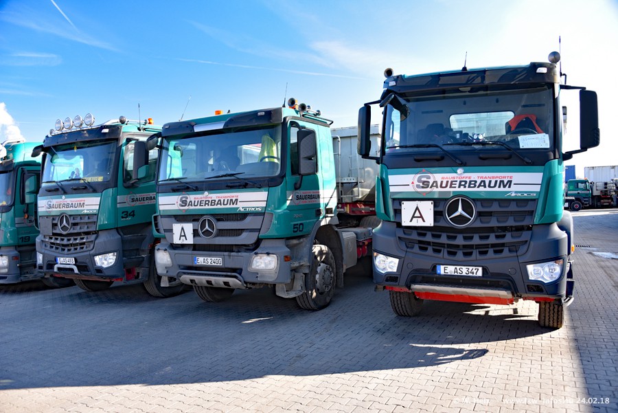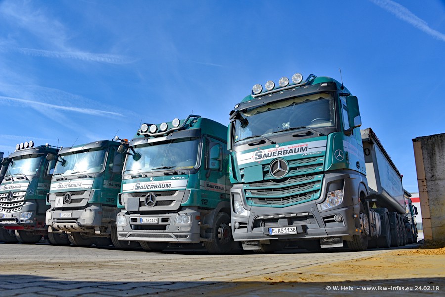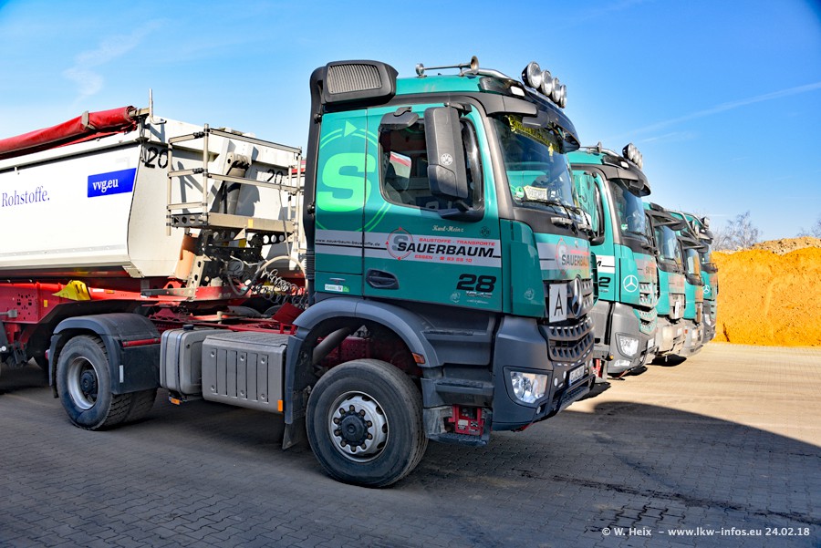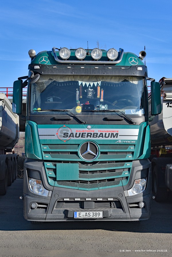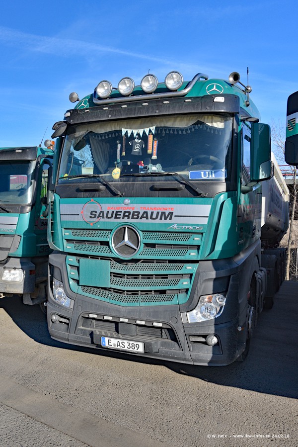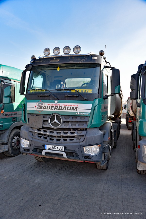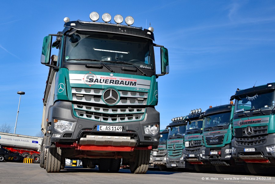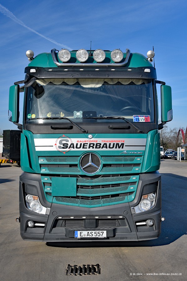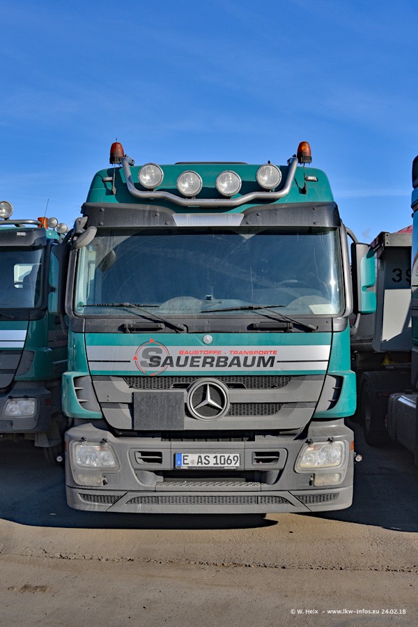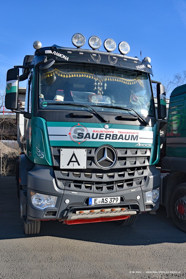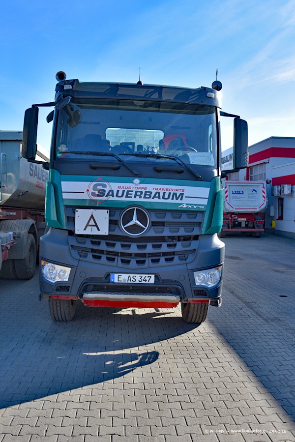 Der Fuhrpark von Sauerbaum besteht aus rund 50 LKW. Das sind 2 MAN TGS Euro 6 und alle anderen Fahrzeuge sind von Mercedes-Benz: Actros 3 und 4 sowie Arocs bei den Allrad-Zugmaschinen.