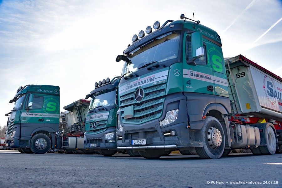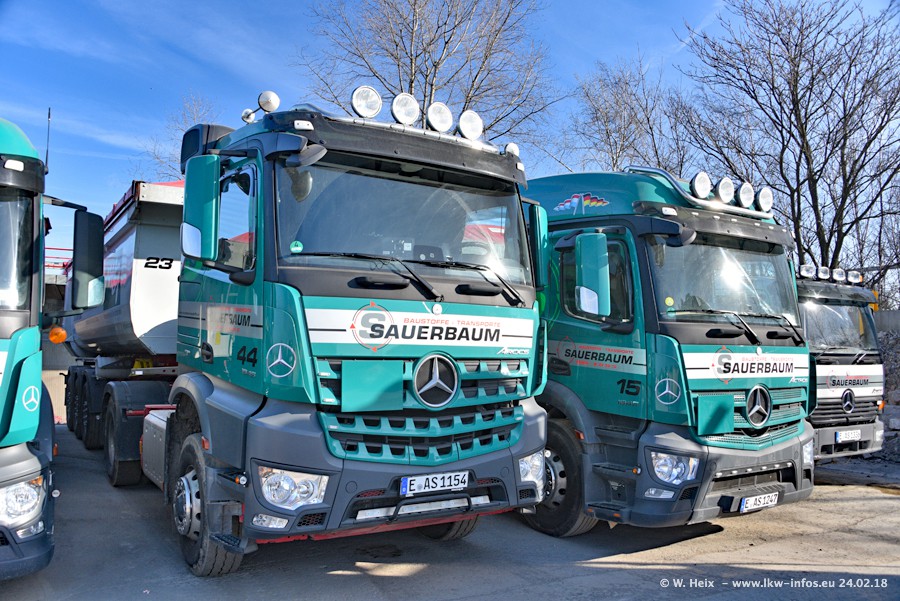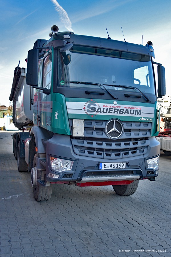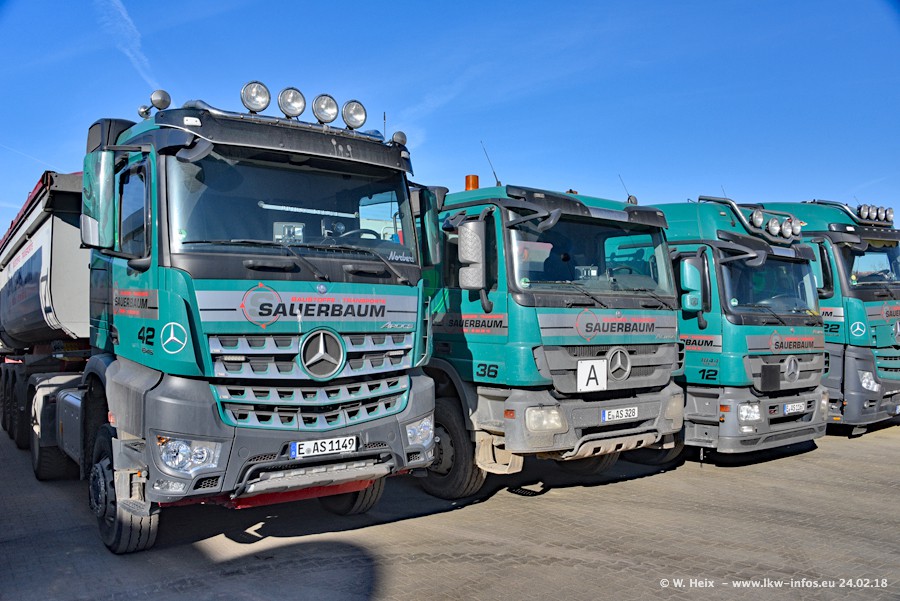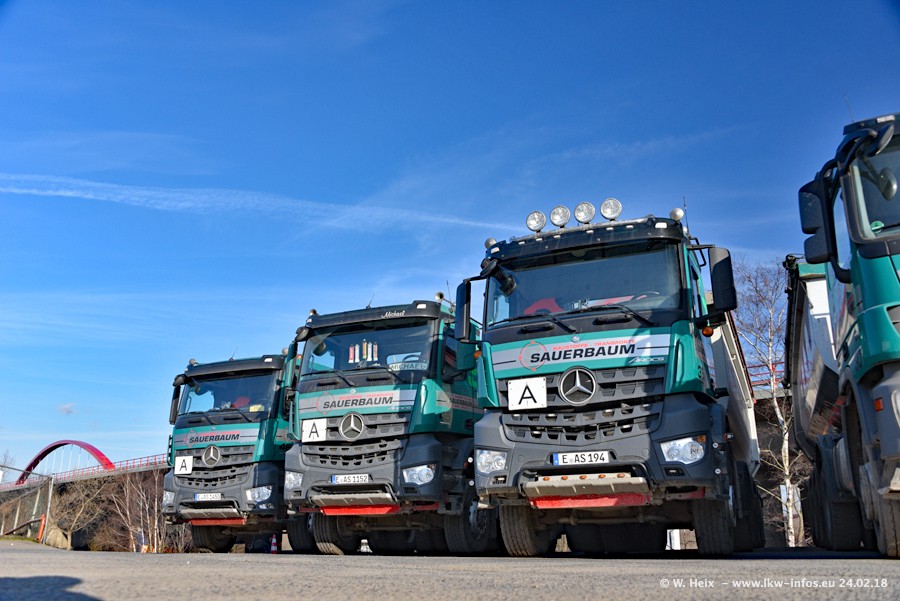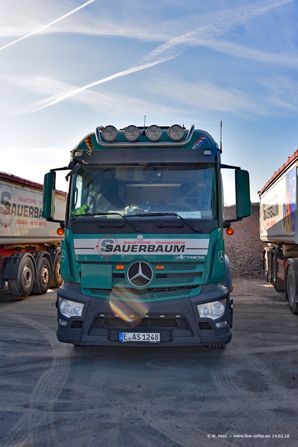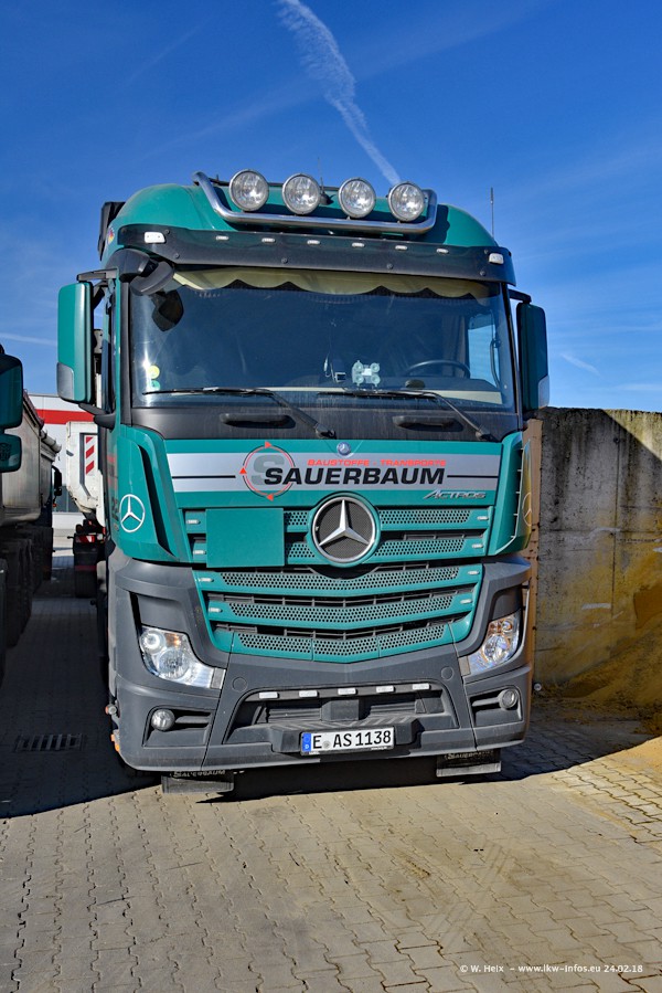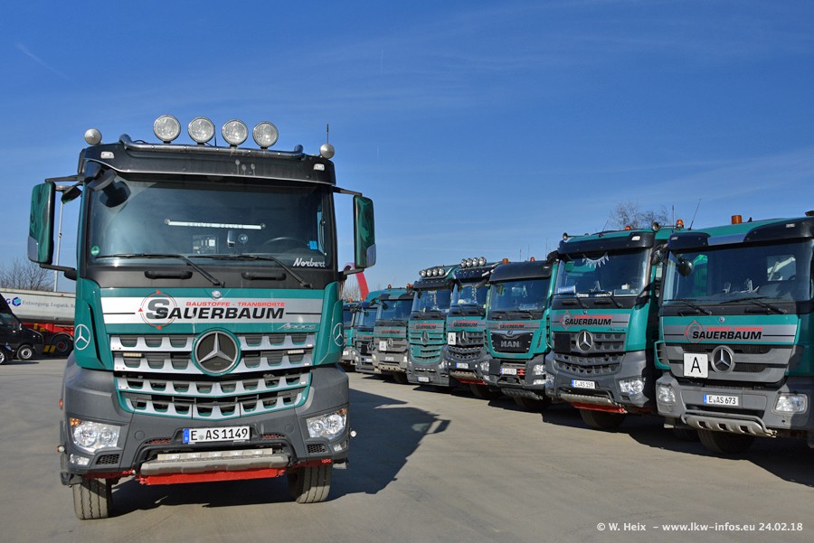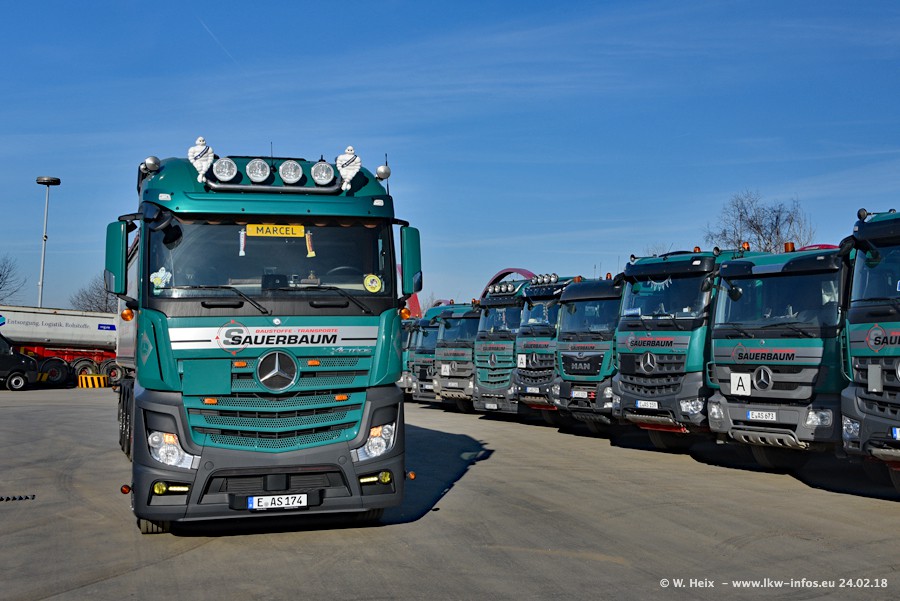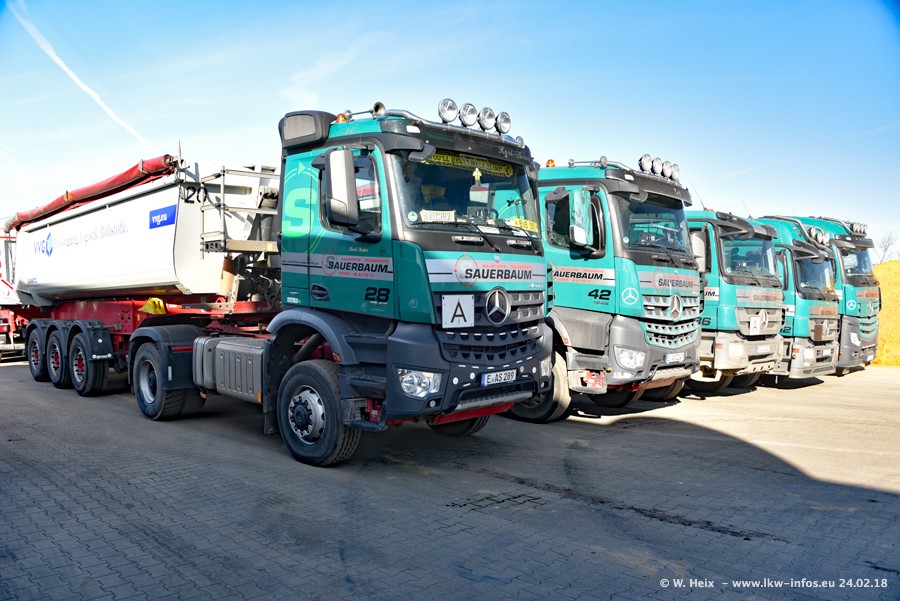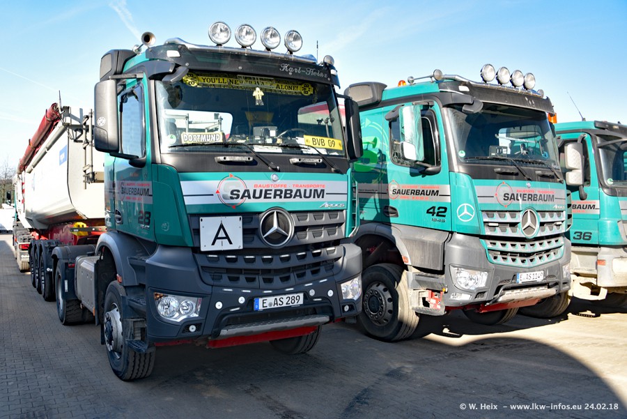 Der Fuhrpark von Sauerbaum besteht aus rund 50 LKW. Das sind 2 MAN TGS Euro 6 und alle anderen Fahrzeuge sind von Mercedes-Benz: Actros 3 und 4 sowie Arocs bei den Allrad-Zugmaschinen.