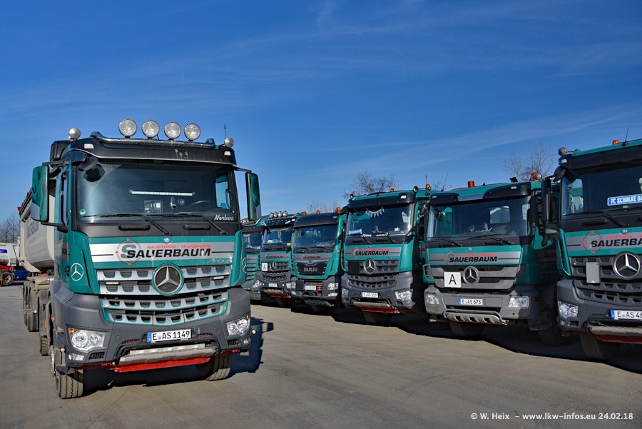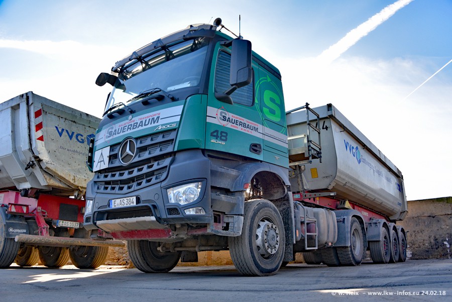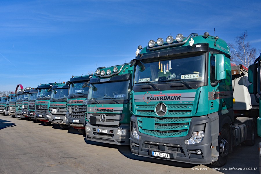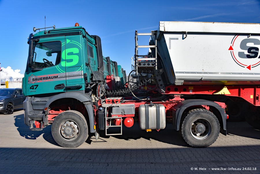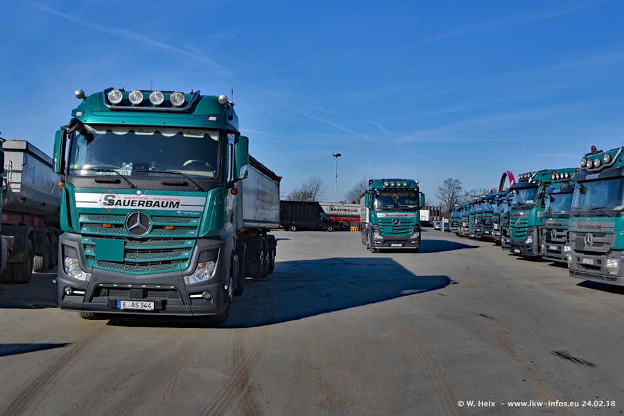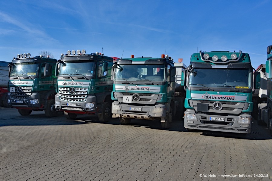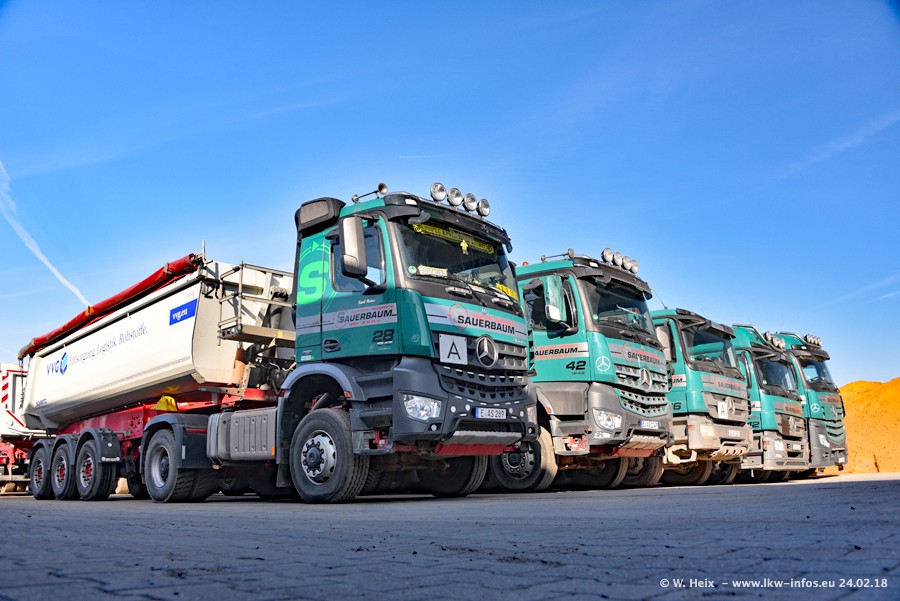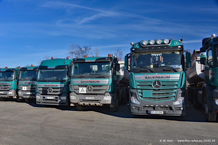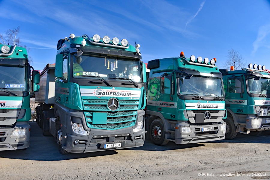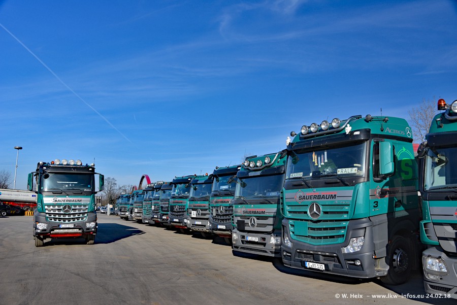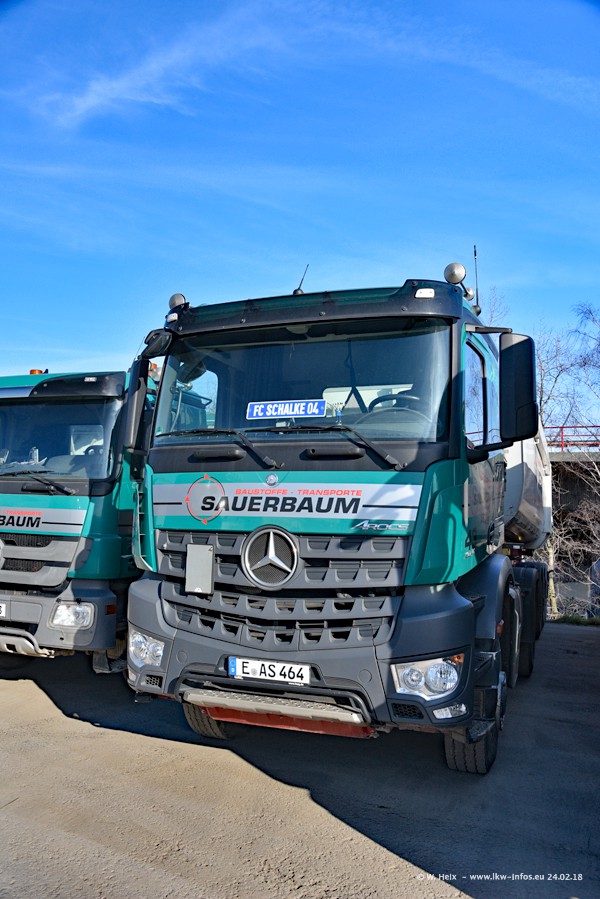 Der Fuhrpark von Sauerbaum besteht aus rund 50 LKW. Das sind 2 MAN TGS Euro 6 und alle anderen Fahrzeuge sind von Mercedes-Benz: Actros 3 und 4 sowie Arocs bei den Allrad-Zugmaschinen.